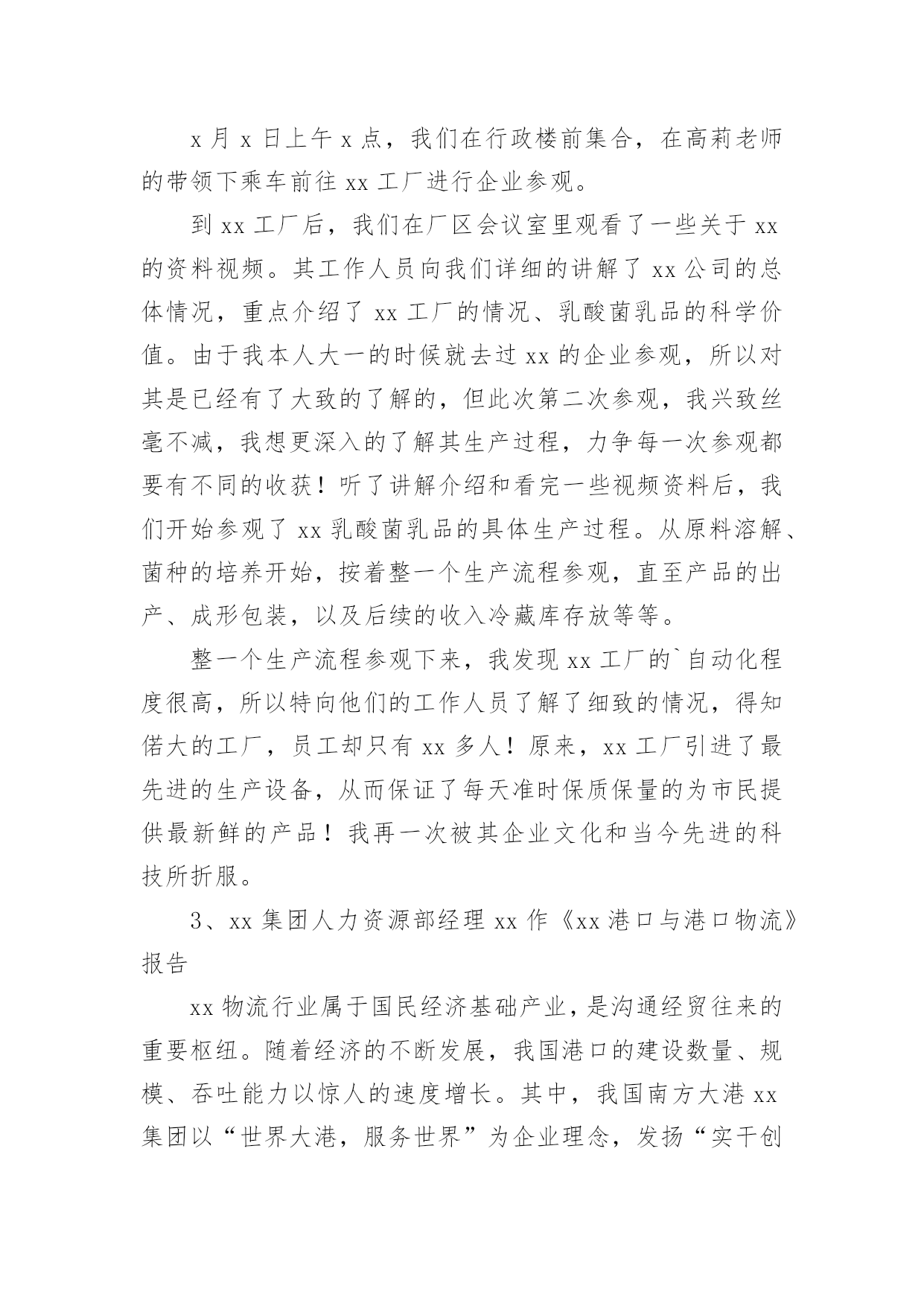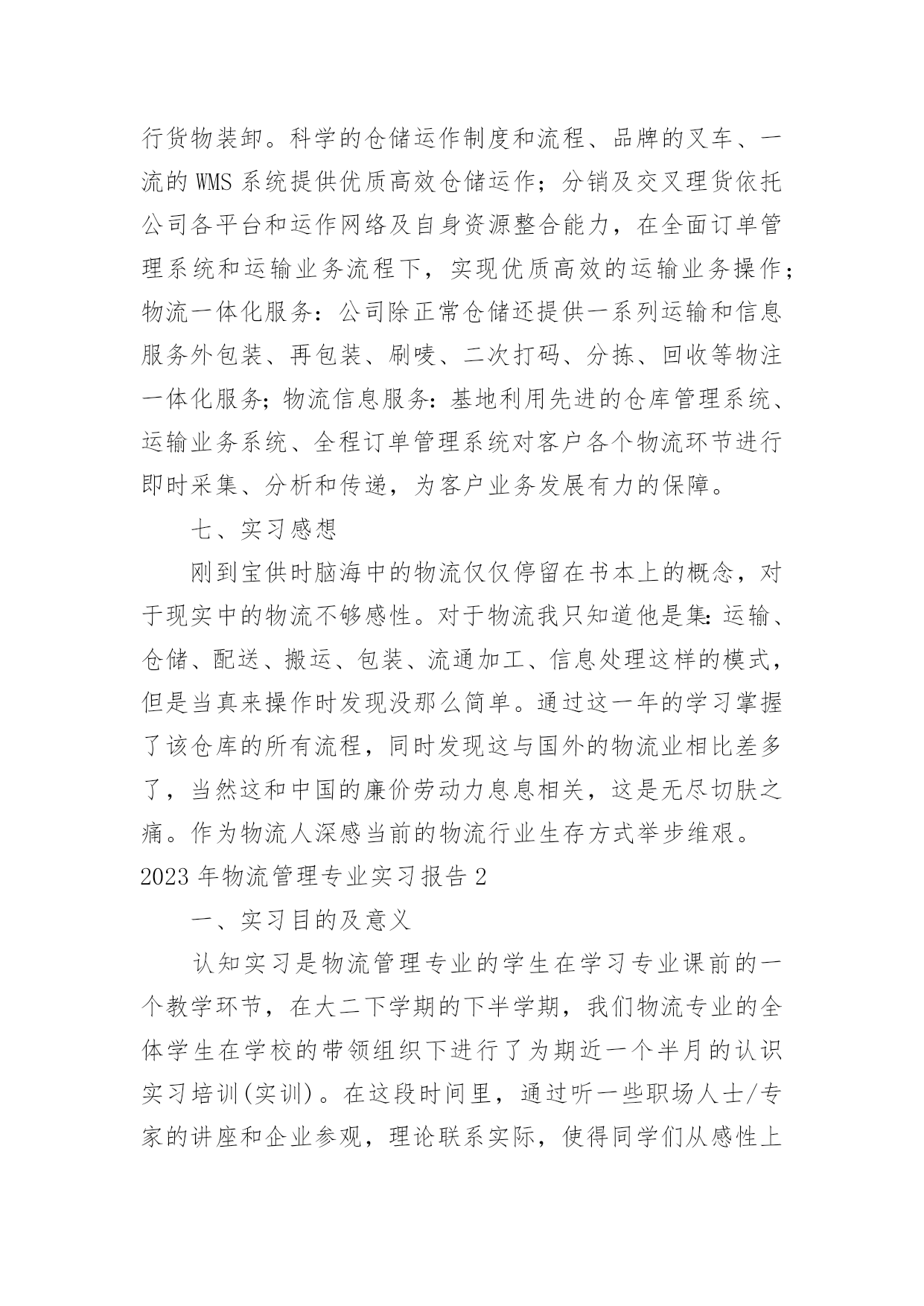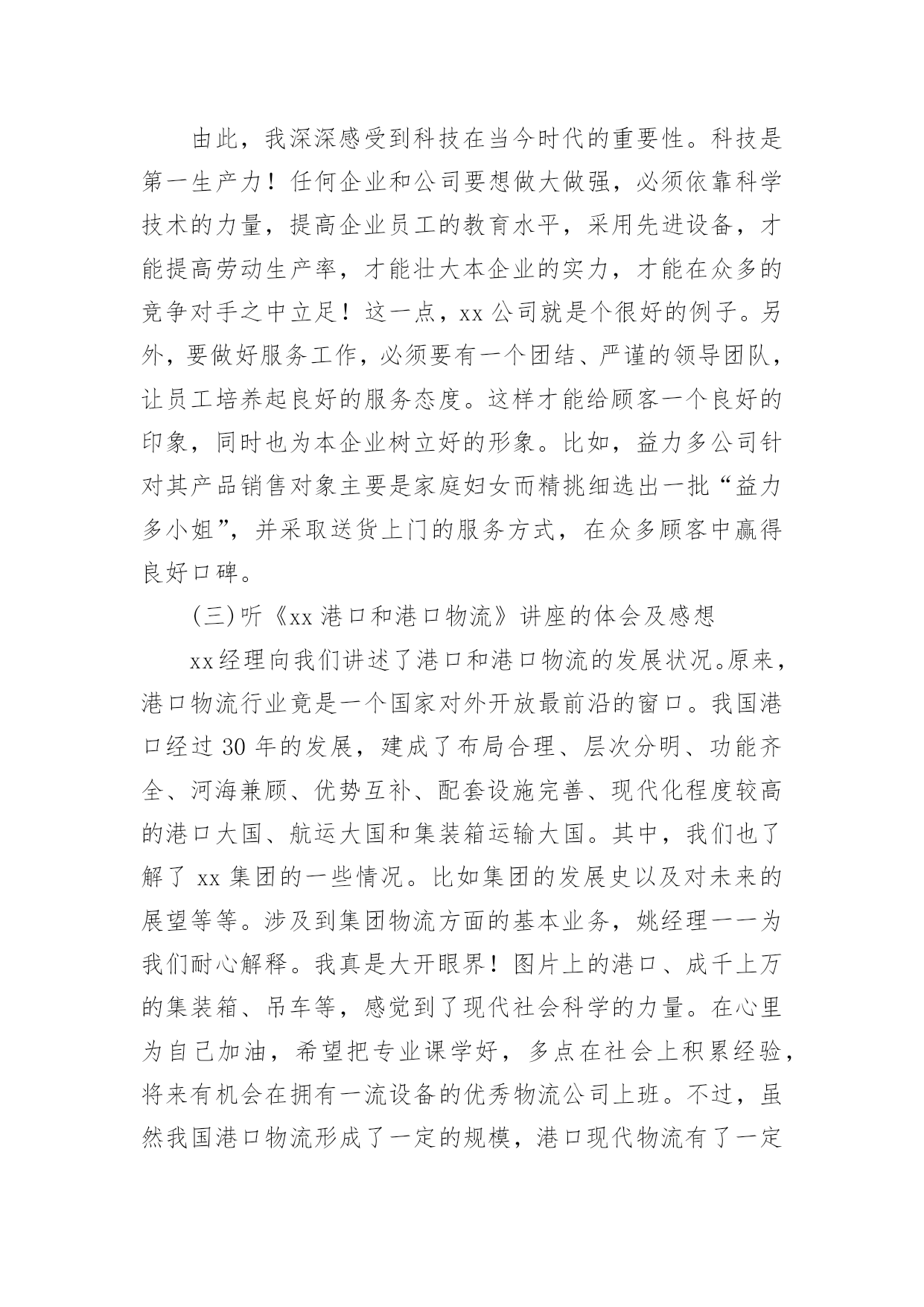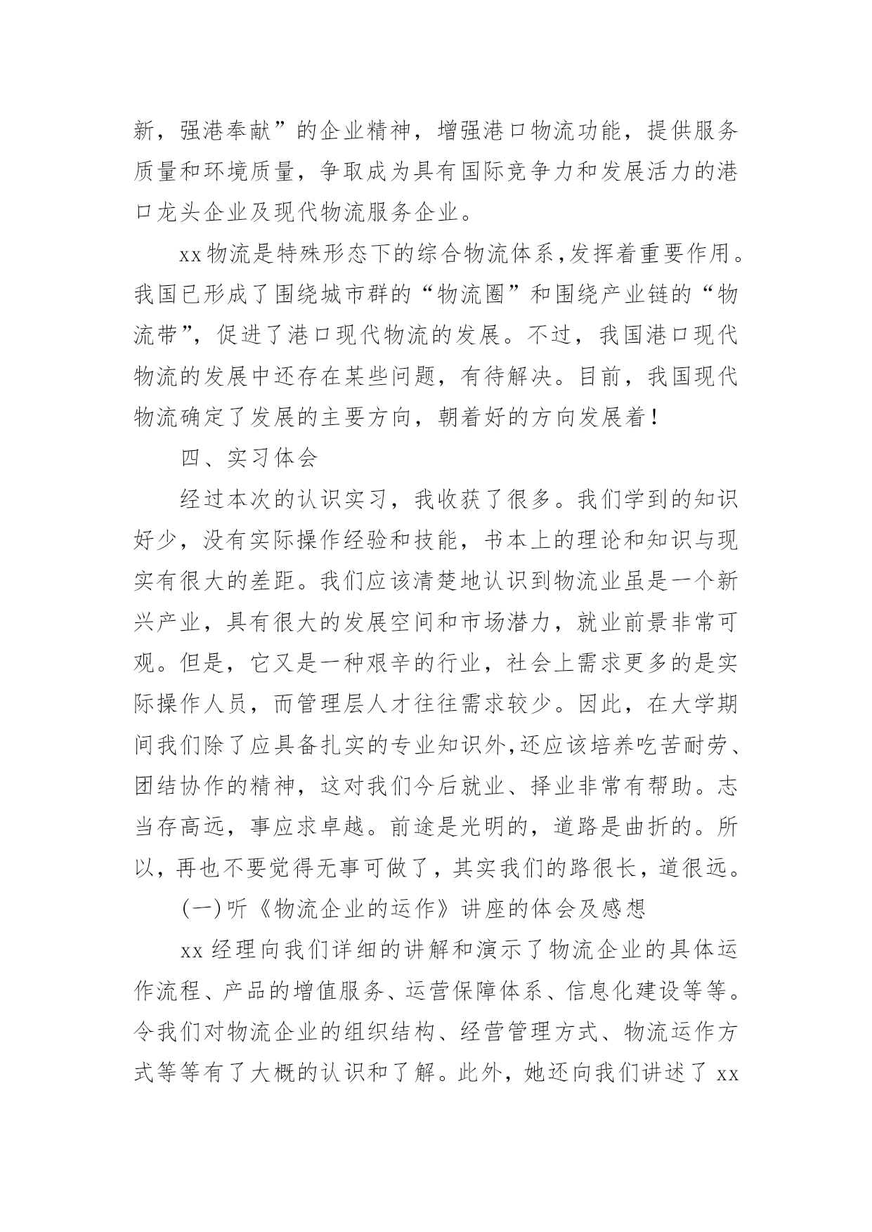 物流管理专业实习报告2023年物流管理专业实习报告在生活中,我们使用报告的情况越来越多,其在写作上具有一定的窍门。你所见过的报告是什么样的呢?下面是小编帮大家整理的2023年物流管理专业实习报告,欢迎阅读,希望大家能够喜欢。2023年物流管理专业实习报告1一、实习地点:xxxxx二、实习时间:20xx年xx月xx日至今三、实习班级:物流管理0801班四、实习目的为了更好的了解和认知物流,在为期一年的时间里我选择了当前物流行业中的佼佼者宝供物流去实习,从宏观和微观上去感受主要的物流流程,为以后的工作和学习打下坚实基础,也同时对物流行业有了全新的认识。五、实习要求为了了解物流在现代经济行业中的作用,了解物流在现在工商企业中的'运作模式,增强对专业的认知感。实习分为四个阶段:第一阶段:入库管理第二阶段:在库管理第三阶段:出库管理第三阶段:信息管理通过这四个阶段的实习掌握了仓库的整个运作流程,了解了物流的基本特点、主要设备的使用方法及将书本上知识与现实相结合。探求物流行业的本质和规律。六、实习单位概要宝供物流海恒基地:1:基本概况海恒基地位于合肥市经济开发区青鸾路与方兴大道交叉口,规划总建筑面积约70000平方米,具备供应链一体化、产品展示交易、综合配套服务等功能,基地为现代物流仓储中心,该仓库于20xx年9月正式投入使用。基地现有的运作网络和信息网络,为客户提供优质高效的物流供应链服务,集分拣、配送、加工、包装、订单处理、库存控制、分销覆盖、交叉理货、信息处理等综合物流服务。2:主要设备高位立体货架;电动升降平台:45扇电动升降门;17台前移式高位叉车、3台平衡重低位叉车、10台电动托盘车、20台手动液压车强弱电控制的温度均衡设备;安全保障系统:24小时全方位的监控系统、消防自动喷淋系统、全钢管货架防护架、自动报警系统3:功能概况仓库占地16500平方米,空间高度12.5米,托盘位13871个,储存吨位;科学的仓门设计可同时满足多种运输工具进行货物装卸。科学的仓储运作制度和流程、品牌的叉车、一流的WMS系统提供优质高效仓储运作;分销及交叉理货依托公司各平台和运作网络及自身资源整合能力,在全面订单管理系统和运输业务流程下,实现优质高效的运输业务操作;物流一体化服务:公司除正常仓储还提供一系列运输和信息服务外包装、再包装、刷唛、二次打码、分拣、回收等物注一体化服务;物流信息服务:基地利用先进的仓库管理系统、运输业务系统、全程订单管理系统对客户各个物流环节进行即时采集、分析和传递,为客户业务发展有力的保障。七、实习感想刚到宝供时脑海中的物流仅仅停留在书本上的概念,对于现实中的物流不够感性。对于物流我只知道他是集:运输、仓储、配送、搬运、包装、流通加工、信息处理这样的模式,但是当真来操作时发现没那么简单。通过这一年的学习掌握了该仓库的所有流程,同时发现这与国外的物流业相比差多了,当然这和中国的廉价劳动力息息相关,这是无尽切肤之痛。作为物流人深感当前的物流行业生存方式举步维艰。2023年物流管理专业实习报告2一、实习目的及意义认知实习是物流管理专业的学生在学习专业课前的一个教学环节,在大二下学期的下半学期,我们物流专业的全体学生在学校的带领组织下进行了为期近一个半月的认识实习培训(实训)。在这段时间里,通过听一些职场人士/专家的讲座和企业参观,理论联系实际,使得同学们从感性上对企业的组织结构、经营管理方式、物流运作方式有一个概略性的了解,进一步认识了物流业的宏观和微观发展以及主要的物流流程,加深知识面,为今后的专业课的学习和以后的工作打下一定的基础。同时,通过本次的认识实习,可以增强同学们对本专业的认识,更加了解本专业的相关细节,激发学生对后续课程的学习热情和动力。让同学们在对本专业的认识的基础上,了解更多的与本专业相衔接的行业,增加日后的就业面。通过现场的企业参观,还可以培养同学们的职业意识和团结协作精神,增强了实践经验,增强了同学们的吃苦精神,锻炼同学们的意志,为以后的成功就业做好准备。二、实习时间及安排20xx年x月x日至20xx年x月x日20xx年x月x日:xx物流培训部经理xx作《物流企业的运作》报告;20xx年x月x日:xx乳品有限公司工厂参观;20xx年x月x日:xx集团人力资源部经理xx作《xx港口与港口物流》报告;20xx年x月x日:认识实习总结。三、实习内容在本次认识实习过程中,我听了《物流企业的运作》和《xx港口与港口物流》两个学术报告,参观了xx乳品有限公司工厂。了解了物流企业的组织结构、经营管理方式、物流运作方式;参观、见识了xx乳酸菌乳饮品整个具体的生产过程,了解了xx公司的历史、产品成分及其产品的科学价值等等;进一步了解和认识了港口的发展情况,以及港口物流的相关知识,也加深了对xx大港xx港的了解。实习的具体
