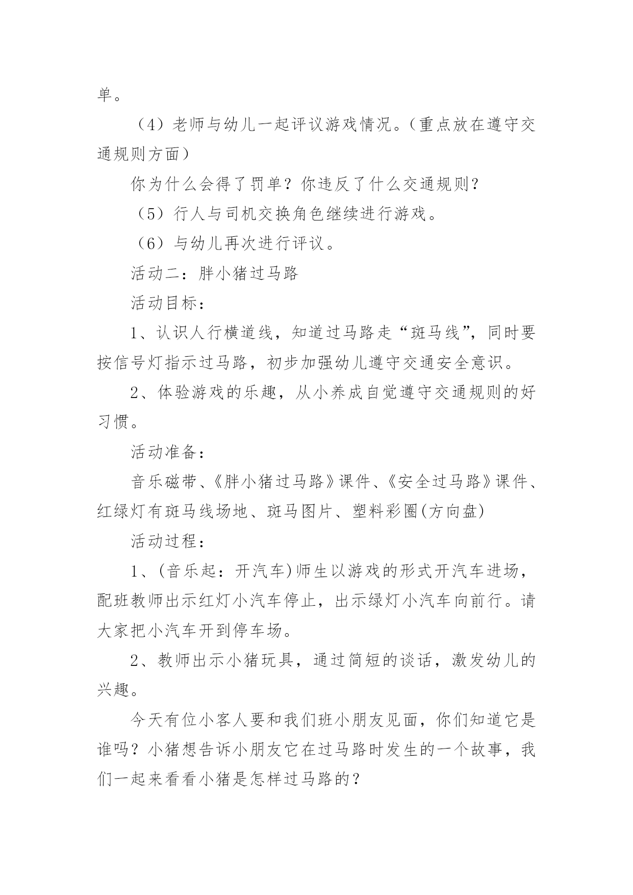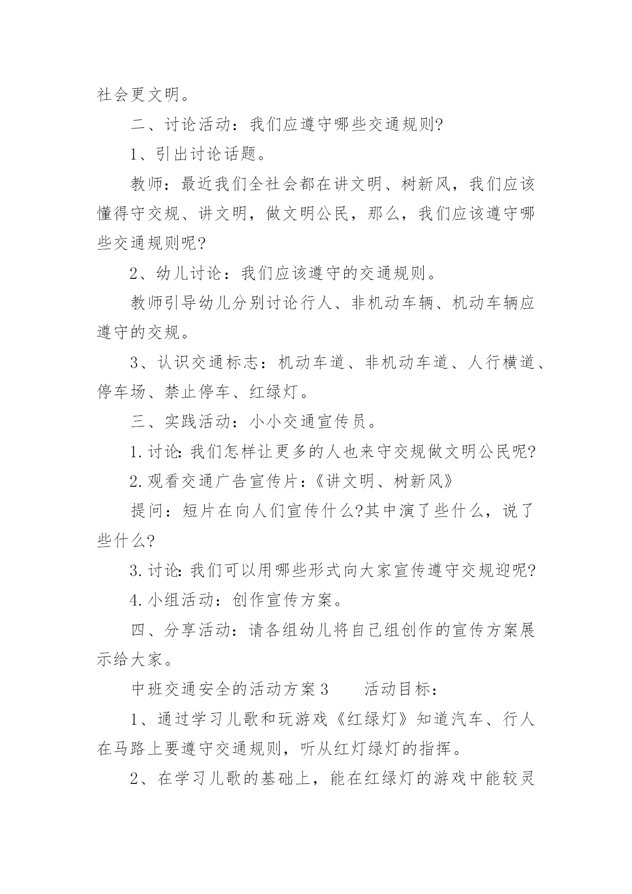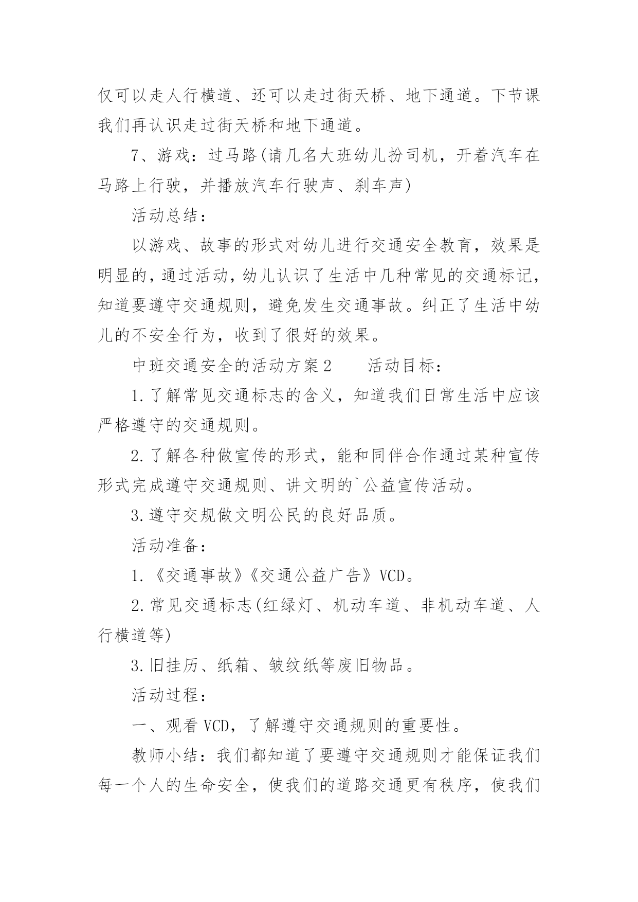 中班交通安全的活动方案2021年中班交通安全的活动方案为了确保活动能无误进行,常常需要提前制定一份优秀的活动方案,活动方案的内容和形式都要围绕着活动的主题来展开,最终达到活动的目的或者意义。那么大家知道活动方案怎么写才规范吗?下面是小编收集整理的2021年中班交通安全的活动方案,欢迎阅读,希望大家能够喜欢。中班交通安全的活动方案1设计意图:安全意识是指幼儿对安全知识的掌握及保证自身安全的基本行为的认识,它是幼儿自我保护能力的一个重要方面。因此,我们对幼儿开展了“交通安全我知道”活动。教育幼儿要从小养成自觉遵守道路交通法规的良好习惯,树立交通安全意识,切实保护幼儿的交通安全。主题目标:1、认识马路上的标志,学习安全地过马路,增强幼儿的交通安全意识。2、体验游戏乐趣,养成自觉遵守交通规则的好品质。活动安排:活动一:我会过马路目标:1、懂得识别过马路的标志,安全地过马路。2、能够大胆地进行交流,勇于表达自己的想法。3、体验游戏扮演的乐趣,养成自觉遵守交通规则的好品质。材料:事先在有关交通规则的DV、自制的红绿灯、布置公路场景所需的道具。在活动室周围张贴交通事故图片、各种过马路的交通标志。活动过程:1、请幼儿一起观察交通事故图片,让幼儿认识到交通事故的严重性。2、与幼儿一起观看DV。引入主题,请幼儿观看关于交通安全的DV。请幼儿说说观看DV后的发现及感受,一起讨论应如何遵守交通规则。师:你们在录像中看到了人们是怎样过马路的?你觉得他们这么做会有怎样的.后果呢?我们怎样才能安全地过马路?3、请幼儿到教室四周去观察各种交通标志,并猜测它的作用,请个别幼儿上来说。告诉幼儿交通标志的真正意义。延伸活动:与幼儿一起玩“交通”游戏。(1)与幼儿一起将交通标志布置在“马路”的各个角落。(2)全班幼儿分两组,一组当行人,一组当司机(身戴汽车胸饰),两名幼儿当交通警察。(一个管行人,一个管汽车)(3)未遵守交通规则的司机及行人,交通警察给予罚单。(4)老师与幼儿一起评议游戏情况。(重点放在遵守交通规则方面)你为什么会得了罚单?你违反了什么交通规则?(5)行人与司机交换角色继续进行游戏。(6)与幼儿再次进行评议。活动二:胖小猪过马路活动目标:1、认识人行横道线,知道过马路走“斑马线”,同时要按信号灯指示过马路,初步加强幼儿遵守交通安全意识。2、体验游戏的乐趣,从小养成自觉遵守交通规则的好习惯。活动准备:音乐磁带、《胖小猪过马路》课件、《安全过马路》课件、红绿灯有斑马线场地、斑马图片、塑料彩圈(方向盘)活动过程:1、(音乐起:开汽车)师生以游戏的形式开汽车进场,配班教师出示红灯小汽车停止,出示绿灯小汽车向前行。请大家把小汽车开到停车场。2、教师出示小猪玩具,通过简短的谈话,激发幼儿的兴趣。今天有位小客人要和我们班小朋友见面,你们知道它是谁吗?小猪想告诉小朋友它在过马路时发生的一个故事,我们一起来看看小猪是怎样过马路的?3、教师边操作课件边生动地讲述故事。4、讲完故事后,师生以问答的方式再看一次课件。①故事的名字叫什么?②小猪走到路口,看见地面上有一条一条的白线叫什麽?在人行横道旁边上有一个什麽灯?③小猪看见人行横道旁边的红绿灯发生什麽变化?人行横道旁的红绿灯颜色变成红色小猪怎麽做的?小朋友站起来学学小猪怎样走路的。④小猪刚走到人行横道线的中间又发生了什麽事?⑤小猪的腿怎麽了?⑥小猪做得对不对?为什麽?5、刚才小朋友都说出了小猪做得不对的的地方,现在我们来看看小猪的大师兄孙悟空和沙师弟是怎样过马路的?请幼儿观看《安全过马路》课件片断。看后提问:刚才小朋友看见孙悟空和沙师弟是从什麽地方过马路的?过马路时要等到马路对面人行横道旁边的红绿灯变成什麽颜色时才能过马路?6、教师小结:马路上一条一条的白线,就是人行横道线,是人们安全通过马路的保障。它很像斑马身上的条纹,所以又叫它“斑马线”,行人过马路一定要走在斑马线内。过马路时要先看看有没有车辆,当人行横道旁的红绿灯的绿灯变亮时行人可以横穿过马路,红灯亮时行人不可以过马路。小朋友不要独自过马路,要有大人带领过马路,过马路时不仅可以走人行横道、还可以走过街天桥、地下通道。下节课我们再认识走过街天桥和地下通道。7、游戏:过马路(请几名大班幼儿扮司机,开着汽车在马路上行驶,并播放汽车行驶声、刹车声)活动总结:以游戏、故事的形式对幼儿进行交通安全教育,效果是明显的,通过活动,幼儿认识了生活中几种常见的交通标记,知道要遵守交通规则,避免发生交通事故。纠正了生活中幼儿的不安全行为,收到了很好的效果。中班交通安全的活动方案2活动目标:1.了解常见交通标志的含义,知道我们日常生活中应该严格遵守的交通规则。2.了解各种做宣传的形式,能和同伴合作通过某种宣传形式完成遵守交通规则、讲文明的`公益宣传活动。3.遵守交规做文明公民的良好品质