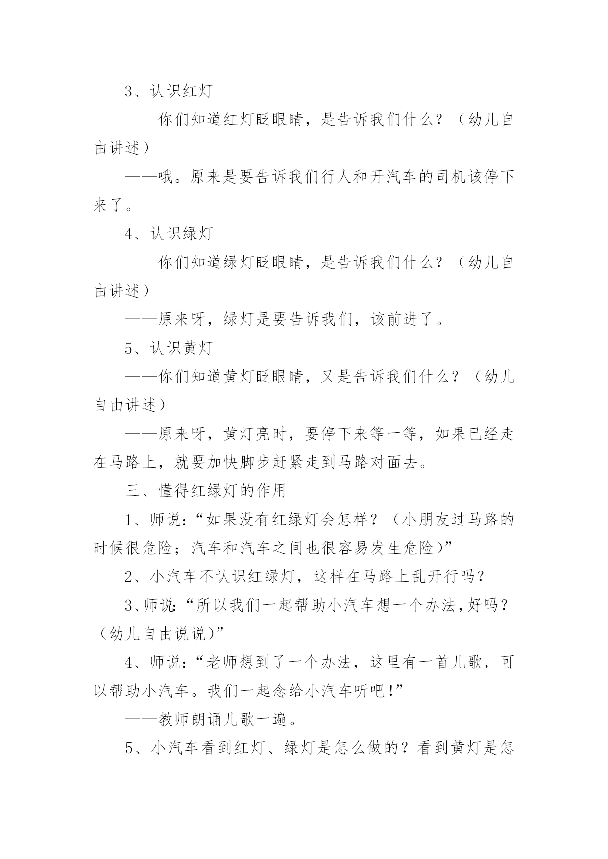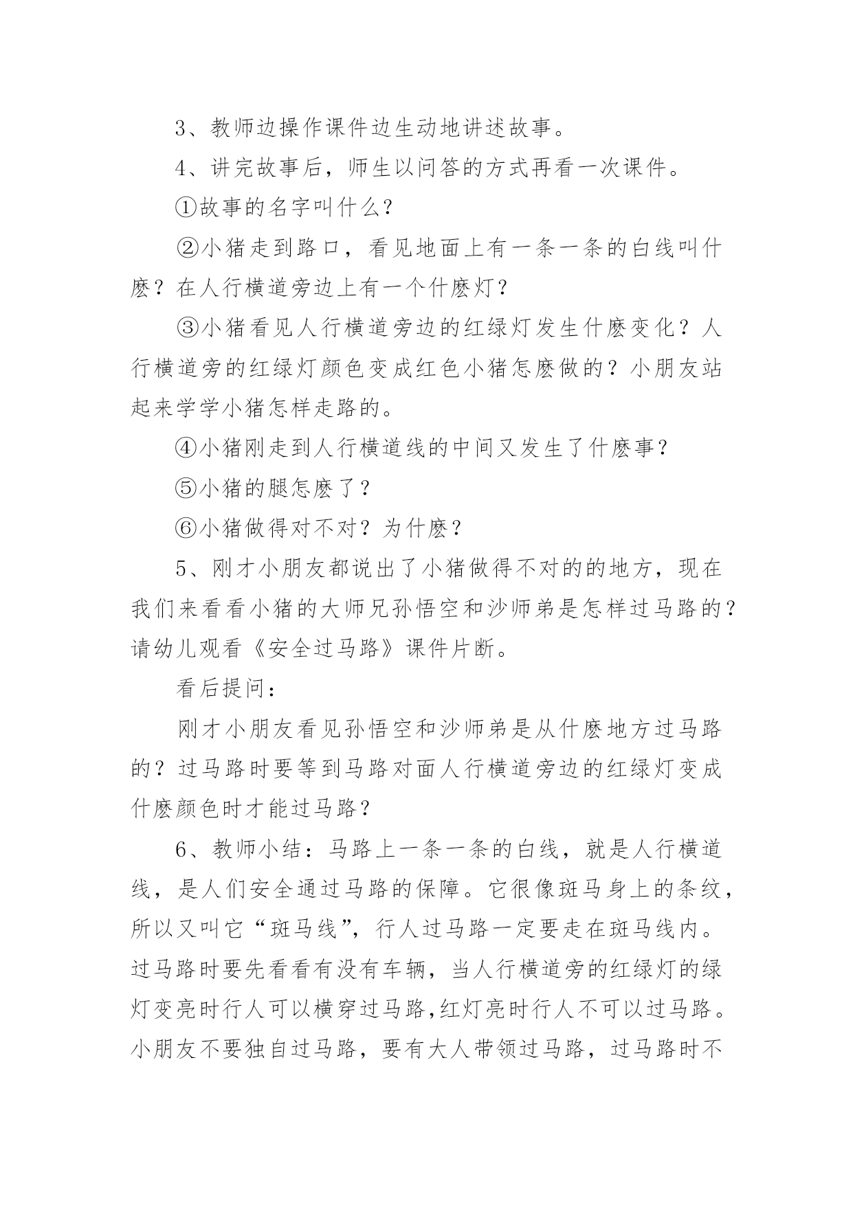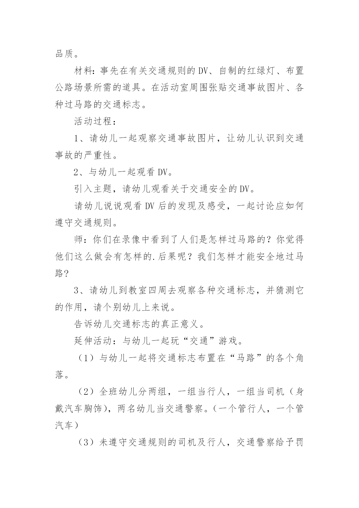 中班交通安全的活动方案2021年中班交通安全的活动方案为了确保活动能无误进行,常常需要提前制定一份优秀的活动方案,活动方案的内容和形式都要围绕着活动的主题来展开,最终达到活动的目的或者意义。那么大家知道活动方案怎么写才规范吗?下面是小编收集整理的2021年中班交通安全的活动方案,欢迎阅读,希望大家能够喜欢。中班交通安全的活动方案1设计意图:安全意识是指幼儿对安全知识的掌握及保证自身安全的基本行为的认识,它是幼儿自我保护能力的一个重要方面。因此,我们对幼儿开展了“交通安全我知道”活动。教育幼儿要从小养成自觉遵守道路交通法规的良好习惯,树立交通安全意识,切实保护幼儿的交通安全。主题目标:1、认识马路上的标志,学习安全地过马路,增强幼儿的交通安全意识。2、体验游戏乐趣,养成自觉遵守交通规则的好品质。活动安排:活动一:我会过马路目标:1、懂得识别过马路的标志,安全地过马路。2、能够大胆地进行交流,勇于表达自己的想法。3、体验游戏扮演的乐趣,养成自觉遵守交通规则的好品质。材料:事先在有关交通规则的DV、自制的红绿灯、布置公路场景所需的道具。在活动室周围张贴交通事故图片、各种过马路的交通标志。活动过程:1、请幼儿一起观察交通事故图片,让幼儿认识到交通事故的严重性。2、与幼儿一起观看DV。引入主题,请幼儿观看关于交通安全的DV。请幼儿说说观看DV后的发现及感受,一起讨论应如何遵守交通规则。师:你们在录像中看到了人们是怎样过马路的?你觉得他们这么做会有怎样的.后果呢?我们怎样才能安全地过马路?3、请幼儿到教室四周去观察各种交通标志,并猜测它的作用,请个别幼儿上来说。告诉幼儿交通标志的真正意义。延伸活动:与幼儿一起玩“交通”游戏。(1)与幼儿一起将交通标志布置在“马路”的各个角落。(2)全班幼儿分两组,一组当行人,一组当司机(身戴汽车胸饰),两名幼儿当交通警察。(一个管行人,一个管汽车)(3)未遵守交通规则的司机及行人,交通警察给予罚单。(4)老师与幼儿一起评议游戏情况。(重点放在遵守交通规则方面)你为什么会得了罚单?你违反了什么交通规则?(5)行人与司机交换角色继续进行游戏。(6)与幼儿再次进行评议。活动二:胖小猪过马路活动目标:1、认识人行横道线,知道过马路走“斑马线”,同时要按信号灯指示过马路,初步加强幼儿遵守交通安全意识。2、体验游戏的乐趣,从小养成自觉遵守交通规则的好习惯。活动准备:音乐磁带、《胖小猪过马路》课件、《安全过马路》课件、红绿灯有斑马线场地、斑马图片、塑料彩圈(方向盘)活动过程:1、(音乐起:开汽车)师生以游戏的形式开汽车进场,配班教师出示红灯小汽车停止,出示绿灯小汽车向前行。请大家把小汽车开到停车场。2、教师出示小猪玩具,通过简短的谈话,激发幼儿的兴趣。今天有位小客人要和我们班小朋友见面,你们知道它是谁吗?小猪想告诉小朋友它在过马路时发生的一个故事,我们一起来看看小猪是怎样过马路的?3、教师边操作课件边生动地讲述故事。4、讲完故事后,师生以问答的方式再看一次课件。①故事的名字叫什么?②小猪走到路口,看见地面上有一条一条的白线叫什麽?在人行横道旁边上有一个什麽灯?③小猪看见人行横道旁边的红绿灯发生什麽变化?人行横道旁的红绿灯颜色变成红色小猪怎麽做的?小朋友站起来学学小猪怎样走路的。④小猪刚走到人行横道线的中间又发生了什麽事?⑤小猪的腿怎麽了?⑥小猪做得对不对?为什麽?5、刚才小朋友都说出了小猪做得不对的的地方,现在我们来看看小猪的大师兄孙悟空和沙师弟是怎样过马路的?请幼儿观看《安全过马路》课件片断。看后提问:刚才小朋友看见孙悟空和沙师弟是从什麽地方过马路的?过马路时要等到马路对面人行横道旁边的红绿灯变成什麽颜色时才能过马路?6、教师小结:马路上一条一条的白线,就是人行横道线,是人们安全通过马路的保障。它很像斑马身上的条纹,所以又叫它“斑马线”,行人过马路一定要走在斑马线内。过马路时要先看看有没有车辆,当人行横道旁的红绿灯的绿灯变亮时行人可以横穿过马路,红灯亮时行人不可以过马路。小朋友不要独自过马路,要有大人带领过马路,过马路时不仅可以走人行横道、还可以走过街天桥、地下通道。下节课我们再认识走过街天桥和地下通道。7、游戏:过马路(请几名大班幼儿扮司机,开着汽车在马路上行驶,并播放汽车行驶声、刹车声)活动总结:以游戏、故事的形式对幼儿进行交通安全教育,效果是明显的,通过活动,幼儿认识了生活中几种常见的交通标记,知道要遵守交通规则,避免发生交通事故。纠正了生活中幼儿的不安全行为,收到了很好的效果。中班交通安全的活动方案2活动目标:1.了解常见交通标志的含义,知道我们日常生活中应该严格遵守的交通规则。2.了解各种做宣传的形式,能和同伴合作通过某种宣传形式完成遵守交通规则、讲文明的`公益宣传活动。3.遵守交规做文明公民的良好品质
