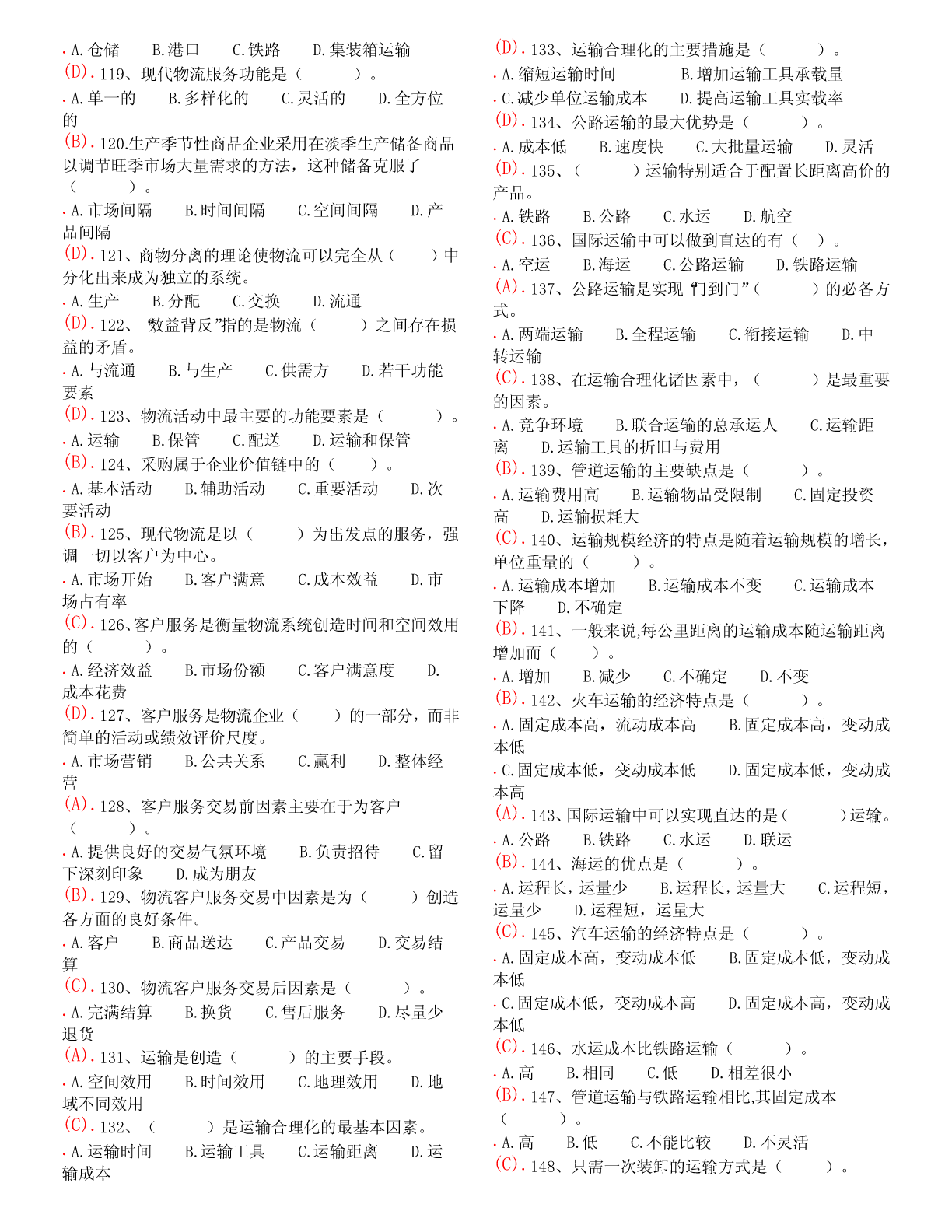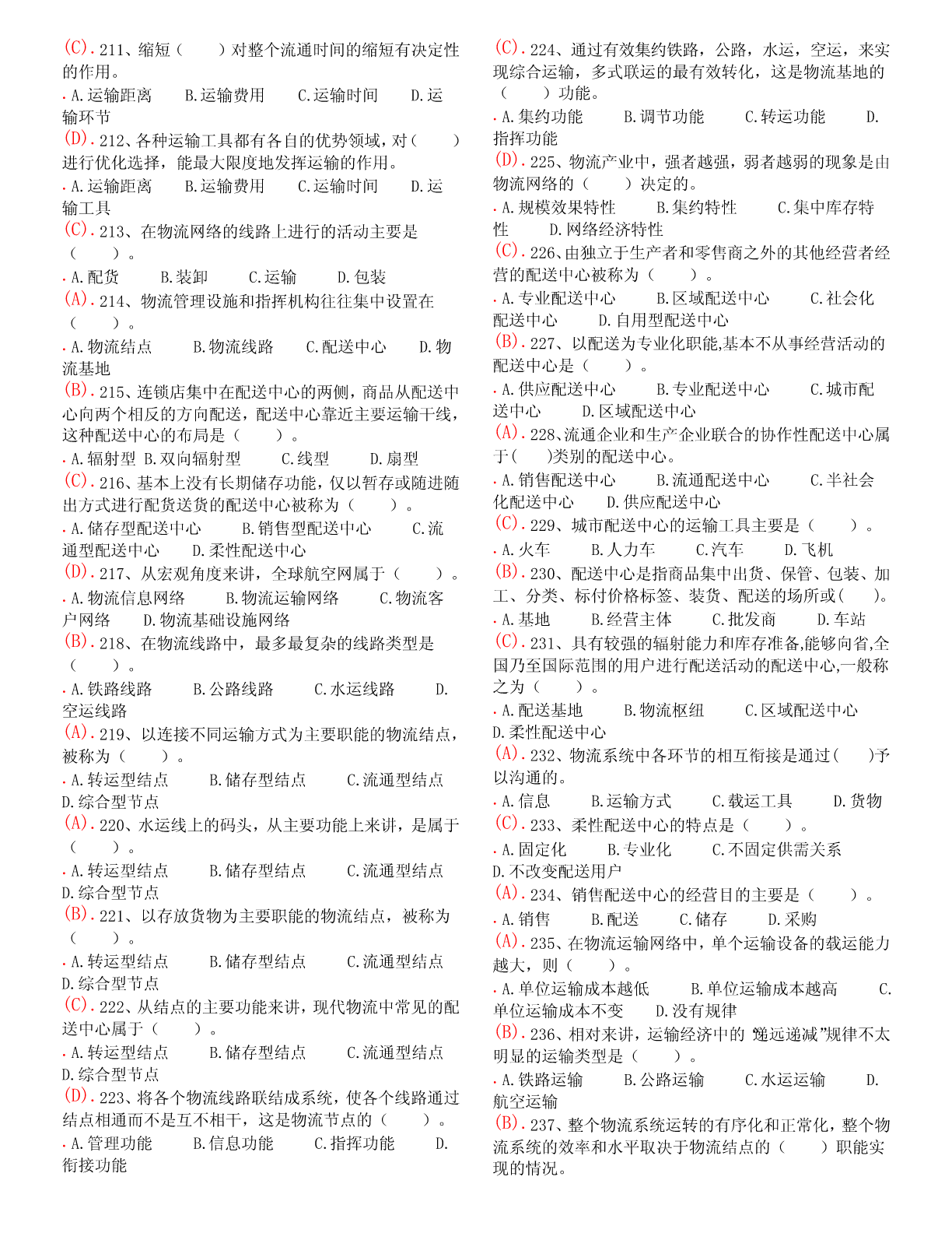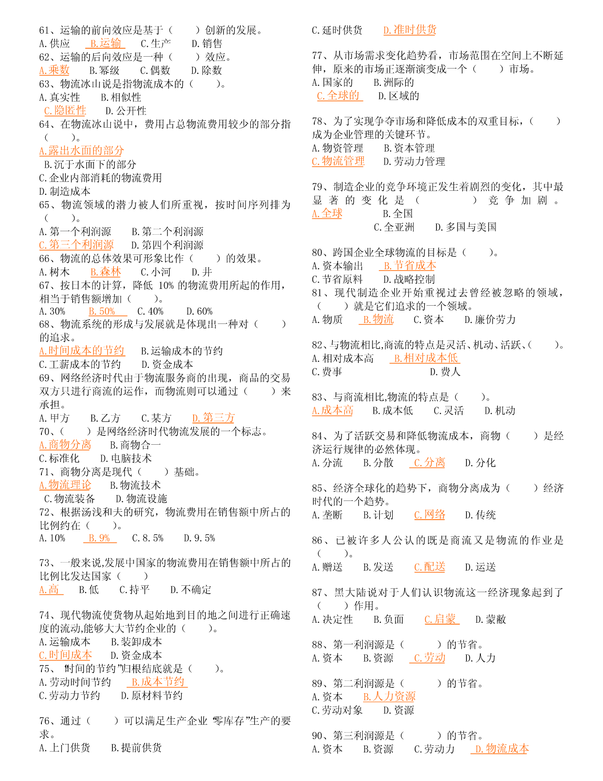 现代物流管理基础一特征称为物流的()。1、物流是()流程的一部分A.效益背反B.复杂性C.动态性D.系统性A.一体化B.供应链15、物流线路密度经济和物流网络的幅员经济,是指物C.市场营销D.国际贸易流的()特征。2、第一代物流是指()。A.复杂性B.中间层次性A.机械物流B.人工物流C.网络经济性D.效益背反C.自动化物流D.集成物流16、在物流领域采取的如:直达运输、联合运输、看板、3、第二代物流是()。实行按专门线路配送等管理技术手段,是为了实现A.集成物流B.智能型物流()的目标。C.机械物流D.自动化物流A.速度经济B.降低成本4、第五代物流是()。C.规模经济D.范围经济A.人工物流B.智能型物流C.机械物流D.自动化物流17、在物流系统中引入机械化、自动化、电子计算机技5、第三代物流是()。术的应用、通信技术、网络的建立,是为了实现()A.人工物流B.机械物流的目标。C.自动化物流D.集成物流A.速度经济B.降低成本6、第四代物流是()。C.规模经济D.范围经济A.人工物流B.机械物流18、物流企业在同时提供运输、仓储、流通加工、配送C.自动化物流D.集成物流以及这些功能集成的服务时远比单独建立起一个个功能7、物流从()角度可划分为宏观物流与微观物流。性企业来提供运输、仓储、流通加工、配送更具效益。A.物流在经济中的运行角度目的是为了实现()的目标。B.物流服务对象角度A.速度经济B.降低成本C.物流活动空间范围角度C.规模经济D.范围经济D.物流活动的动作主体19、通过物流活动有效组织和协调,能够对企业的成本8、物流从()角度可划分为社会物流与企业物流。降低和差异化产生影响,从而形成()。A.物流在经济中的运行角度A.竞争优势B.降低成本B.物流服务对象角度C.规模经济D.范围经济C.物流活动空间范围角度20、强调在中央控制下各个自动化物流设备的协同性,是D.物流活动的动作主体指第()代物流。9、物流从()角度可划分为国际物流、国内物流和A.一B.二C.三D.四区域物流。21、采用机器人堆垛物料和包装、监视物流过程及执行A.物流在经济中的运行角度某些过程,是第()代物流。B.物流服务对象角度A.一B.二C.三D.四C.物流活动空间范围角度22、人工物流是指()。D.物流活动的动作主体A.第一代物流B.第二代物流10、物流从()角度可划分为第一方物流、第二方C.第三代物流D.第四代物流物流、第三方物流、第四方物流。23、机械物流是指()。A.物流在经济中的运行B.物流服务对象A.第一代物流B.第二代物流C.物流活动空间范围D.物流活动的运作主体C.第三代物流D.第四代物流11、物流活动地域跨度大、时间跨度大,这一现象体现24、自动化物流是指()。物流的()特征。A.第一代物流B.第二代物流A.系统性B.客观性C.第三代物流D.第四代物流C.大跨度性D.动态性25、集成化物流是指()。12、物流系统随需求、供应、渠道、价格的变化,而难A.第一代物流B.第二代物流于长期稳定。这一现象体现物流的()特征。C.第三代物流D.第四代物流A.系统性B.客观性26、智能化物流是指()。C.大跨度性D.动态性A.第二代物流B.第三代物流13、物流系统本身具有可分性,可以分成若干个子系统,C.第四代物流D.第五代物流同时物流系统在整个社会再生产中又处于流通环节中。27、在一个单一工作站的物资流动是指()。这一现象体现物流的()特征。A.工场物流B.设施物流A.复杂性B.中间层次性C.企业物流D.供应链物流C.网络经济性D.效益背反28、在一个设施内的工作站之间的物资流动是指()。14、物流系统中某一项活动得到优化将会使系统中的另A.工场物流B.设施物流一活动相应劣化,甚至会出现系统总体恶化的结果。这C.企业物流D.供应链物流46、()的目标是使得个人在单个机器上的工作沿安29、在设施之间和企业流程中的物资和信息流动过程是装线工作的物资移动呈平滑状态。指()。A.工场物流B.设施物流A.工场物流B.设施物流C.企业物流D.供应链物流C.企业物流D.供应链物流30、企业之间的物资、信息和资金的流动是指()。47、宏观物流的主要特点是()。A.全球物流B.设施物流A.综合性和全局性B.具体性和局部性C.企业物流D.供应链物流C.综合性和战略性D.客观性和全局性31、跨国间的物资、信息和资金流动是指()。48、微观物流的主要特点是()。A.全球物流B.设施物流A.综合性和全局性B.具体性和局部性C.综合性和C.企业物流D.供应链物流战略性D.客观性和全局性32、由卖方、生产者、供应者组织的物流活动,是第()