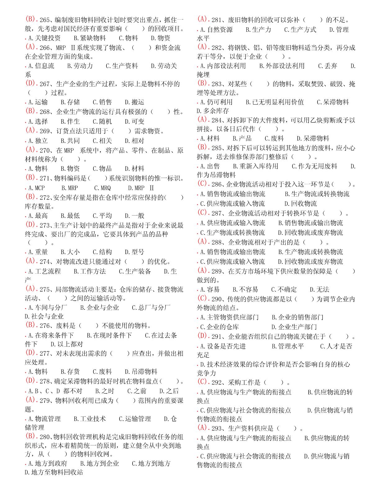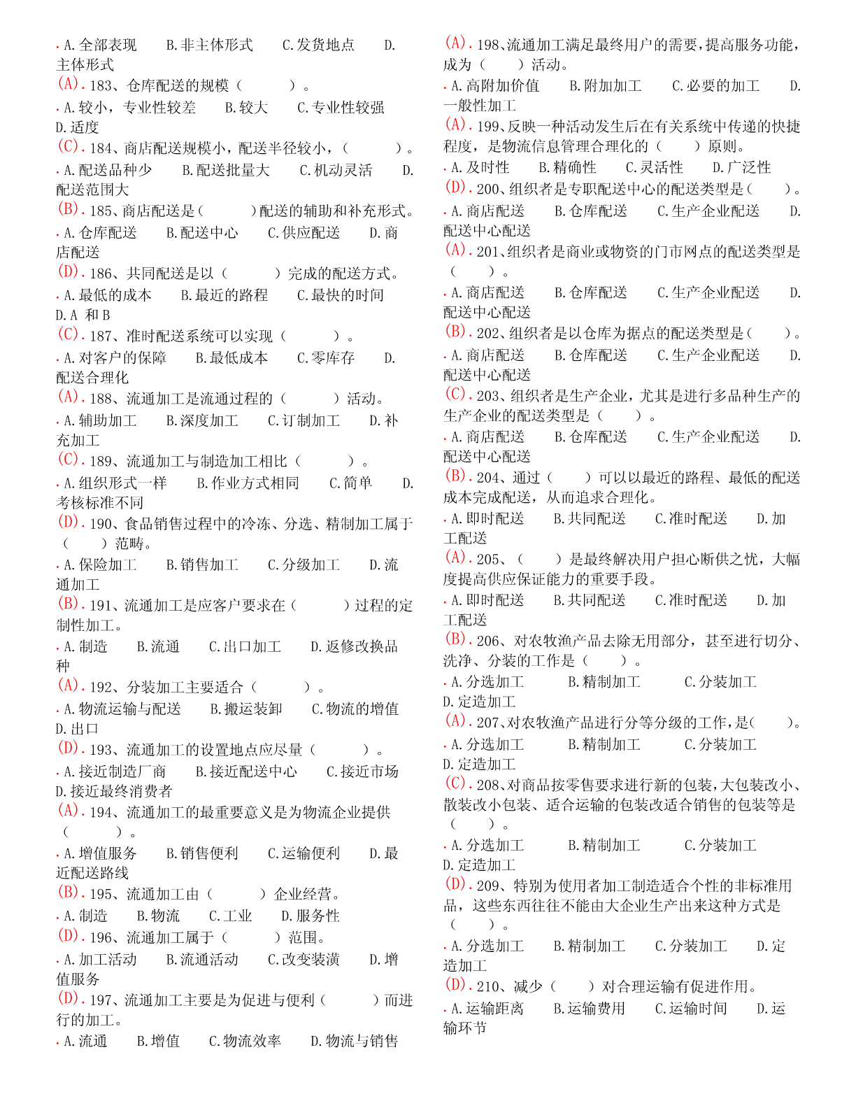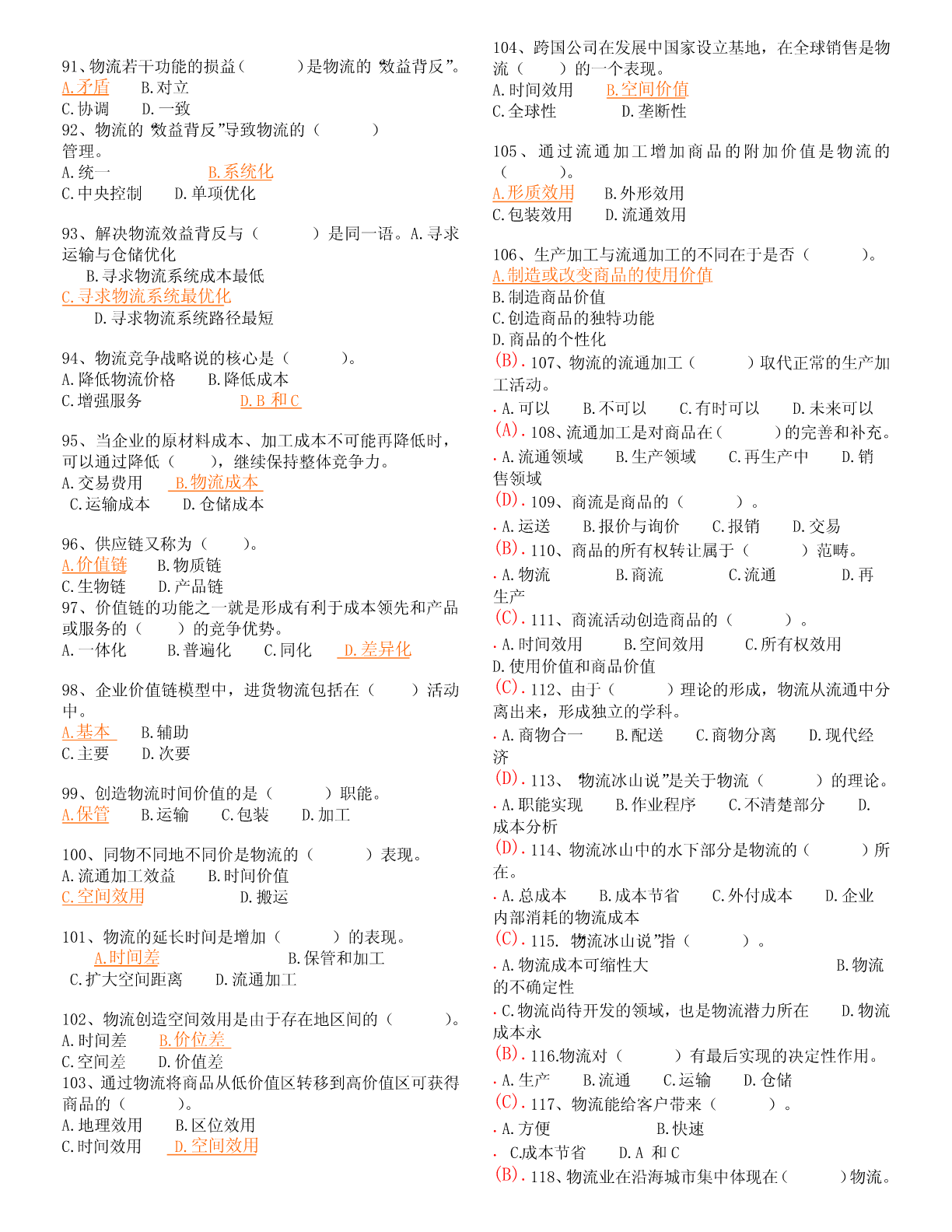 现代物流管理基础一特征称为物流的()。1、物流是()流程的一部分A.效益背反B.复杂性C.动态性D.系统性A.一体化B.供应链15、物流线路密度经济和物流网络的幅员经济,是指物C.市场营销D.国际贸易流的()特征。2、第一代物流是指()。A.复杂性B.中间层次性A.机械物流B.人工物流C.网络经济性D.效益背反C.自动化物流D.集成物流16、在物流领域采取的如:直达运输、联合运输、看板、3、第二代物流是()。实行按专门线路配送等管理技术手段,是为了实现A.集成物流B.智能型物流()的目标。C.机械物流D.自动化物流A.速度经济B.降低成本4、第五代物流是()。C.规模经济D.范围经济A.人工物流B.智能型物流C.机械物流D.自动化物流17、在物流系统中引入机械化、自动化、电子计算机技5、第三代物流是()。术的应用、通信技术、网络的建立,是为了实现()A.人工物流B.机械物流的目标。C.自动化物流D.集成物流A.速度经济B.降低成本6、第四代物流是()。C.规模经济D.范围经济A.人工物流B.机械物流18、物流企业在同时提供运输、仓储、流通加工、配送C.自动化物流D.集成物流以及这些功能集成的服务时远比单独建立起一个个功能7、物流从()角度可划分为宏观物流与微观物流。性企业来提供运输、仓储、流通加工、配送更具效益。A.物流在经济中的运行角度目的是为了实现()的目标。B.物流服务对象角度A.速度经济B.降低成本C.物流活动空间范围角度C.规模经济D.范围经济D.物流活动的动作主体19、通过物流活动有效组织和协调,能够对企业的成本8、物流从()角度可划分为社会物流与企业物流。降低和差异化产生影响,从而形成()。A.物流在经济中的运行角度A.竞争优势B.降低成本B.物流服务对象角度C.规模经济D.范围经济C.物流活动空间范围角度20、强调在中央控制下各个自动化物流设备的协同性,是D.物流活动的动作主体指第()代物流。9、物流从()角度可划分为国际物流、国内物流和A.一B.二C.三D.四区域物流。21、采用机器人堆垛物料和包装、监视物流过程及执行A.物流在经济中的运行角度某些过程,是第()代物流。B.物流服务对象角度A.一B.二C.三D.四C.物流活动空间范围角度22、人工物流是指()。D.物流活动的动作主体A.第一代物流B.第二代物流10、物流从()角度可划分为第一方物流、第二方C.第三代物流D.第四代物流物流、第三方物流、第四方物流。23、机械物流是指()。A.物流在经济中的运行B.物流服务对象A.第一代物流B.第二代物流C.物流活动空间范围D.物流活动的运作主体C.第三代物流D.第四代物流11、物流活动地域跨度大、时间跨度大,这一现象体现24、自动化物流是指()。物流的()特征。A.第一代物流B.第二代物流A.系统性B.客观性C.第三代物流D.第四代物流C.大跨度性D.动态性25、集成化物流是指()。12、物流系统随需求、供应、渠道、价格的变化,而难A.第一代物流B.第二代物流于长期稳定。这一现象体现物流的()特征。C.第三代物流D.第四代物流A.系统性B.客观性26、智能化物流是指()。C.大跨度性D.动态性A.第二代物流B.第三代物流13、物流系统本身具有可分性,可以分成若干个子系统,C.第四代物流D.第五代物流同时物流系统在整个社会再生产中又处于流通环节中。27、在一个单一工作站的物资流动是指()。这一现象体现物流的()特征。A.工场物流B.设施物流A.复杂性B.中间层次性C.企业物流D.供应链物流C.网络经济性D.效益背反28、在一个设施内的工作站之间的物资流动是指()。14、物流系统中某一项活动得到优化将会使系统中的另A.工场物流B.设施物流一活动相应劣化,甚至会出现系统总体恶化的结果。这C.企业物流D.供应链物流46、()的目标是使得个人在单个机器上的工作沿安29、在设施之间和企业流程中的物资和信息流动过程是装线工作的物资移动呈平滑状态。指()。A.工场物流B.设施物流A.工场物流B.设施物流C.企业物流D.供应链物流C.企业物流D.供应链物流30、企业之间的物资、信息和资金的流动是指()。47、宏观物流的主要特点是()。A.全球物流B.设施物流A.综合性和全局性B.具体性和局部性C.企业物流D.供应链物流C.综合性和战略性D.客观性和全局性31、跨国间的物资、信息和资金流动是指()。48、微观物流的主要特点是()。A.全球物流B.设施物流A.综合性和全局性B.具体性和局部性C.综合性和C.企业物流D.供应链物流战略性D.客观性和全局性32、由卖方、生产者、供应者组织的物流活动,是第()