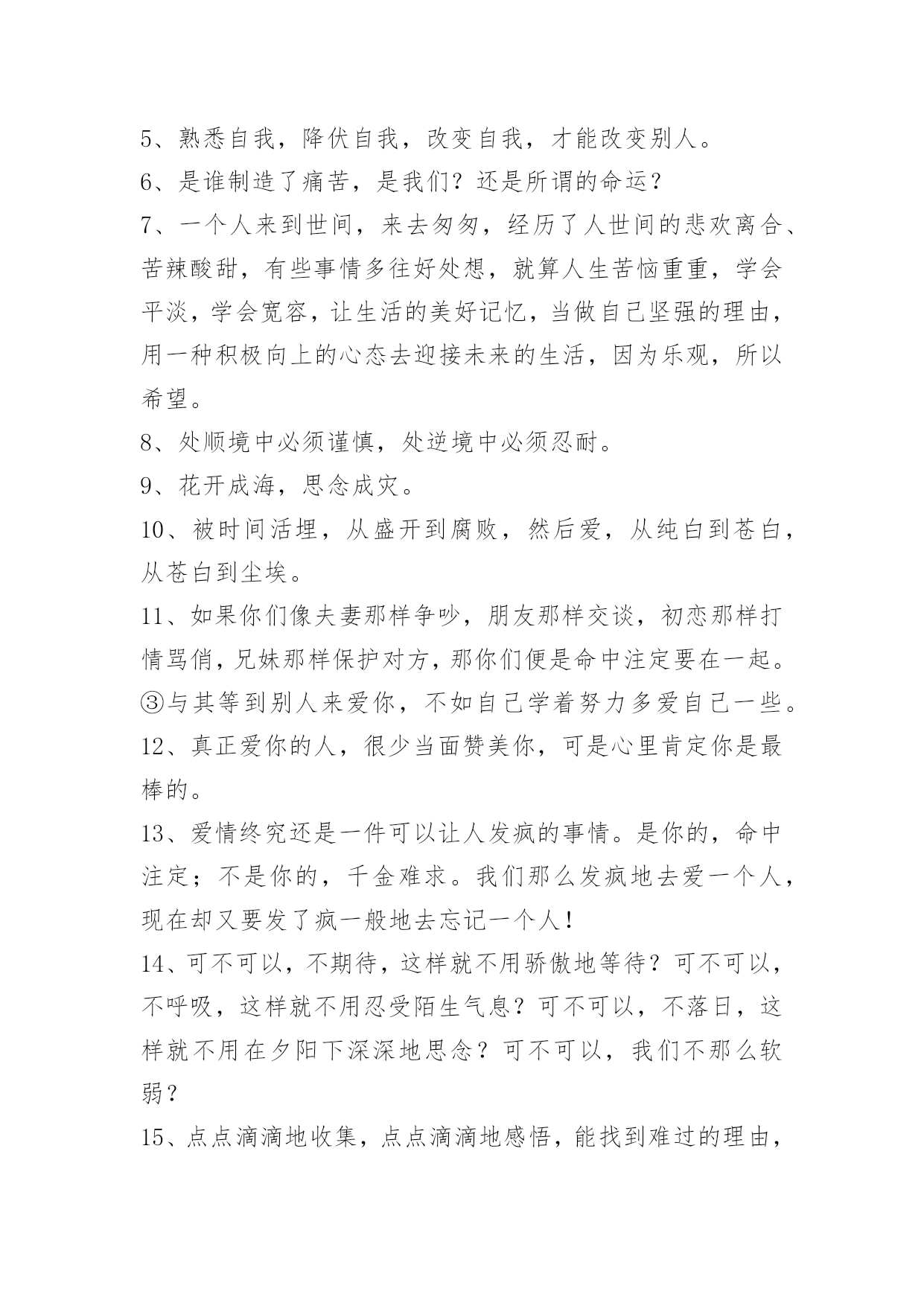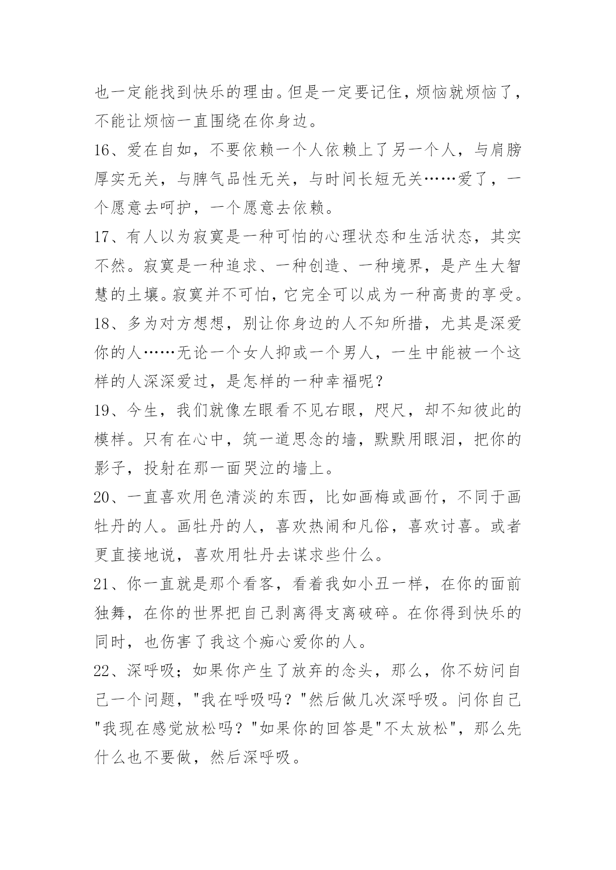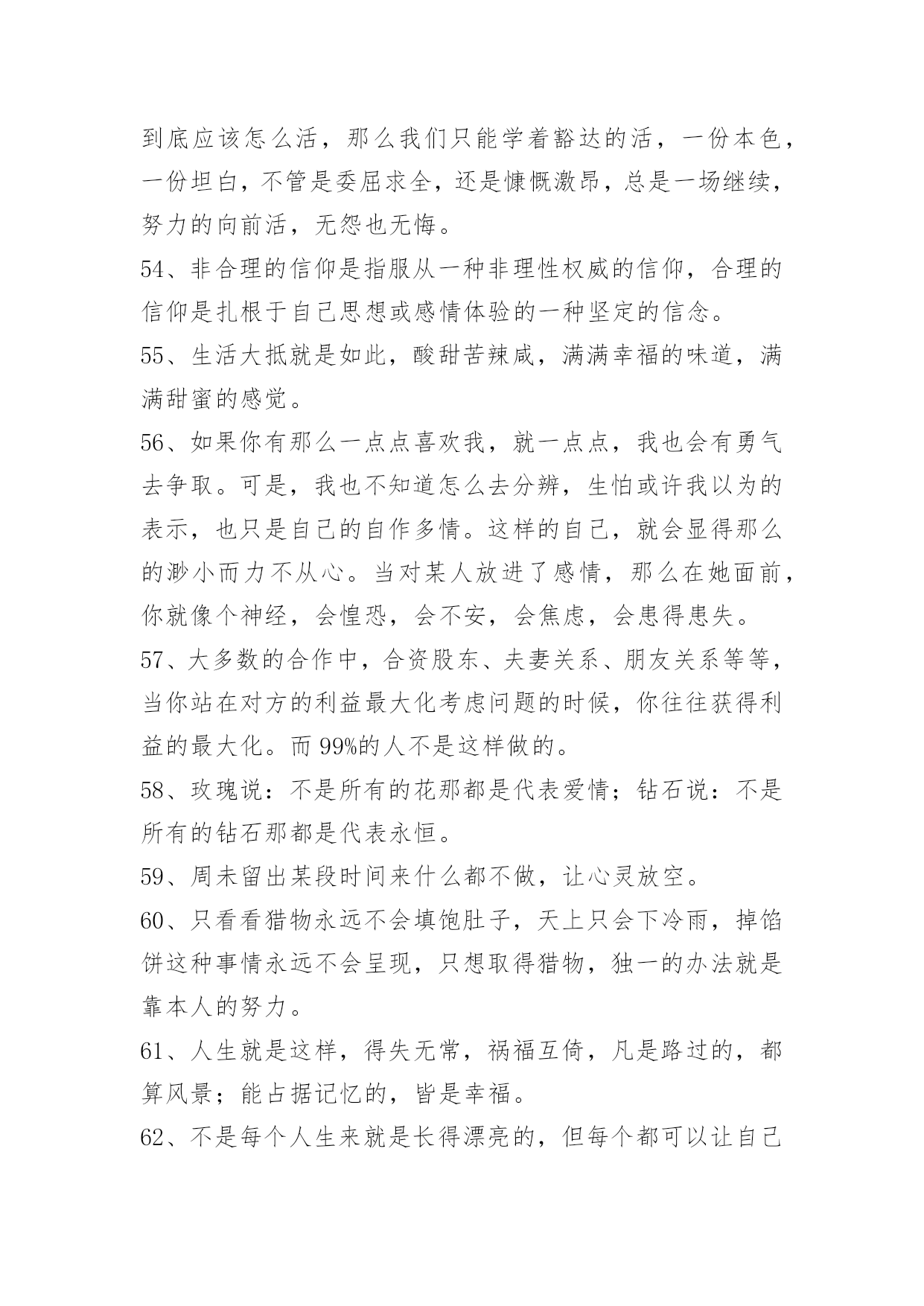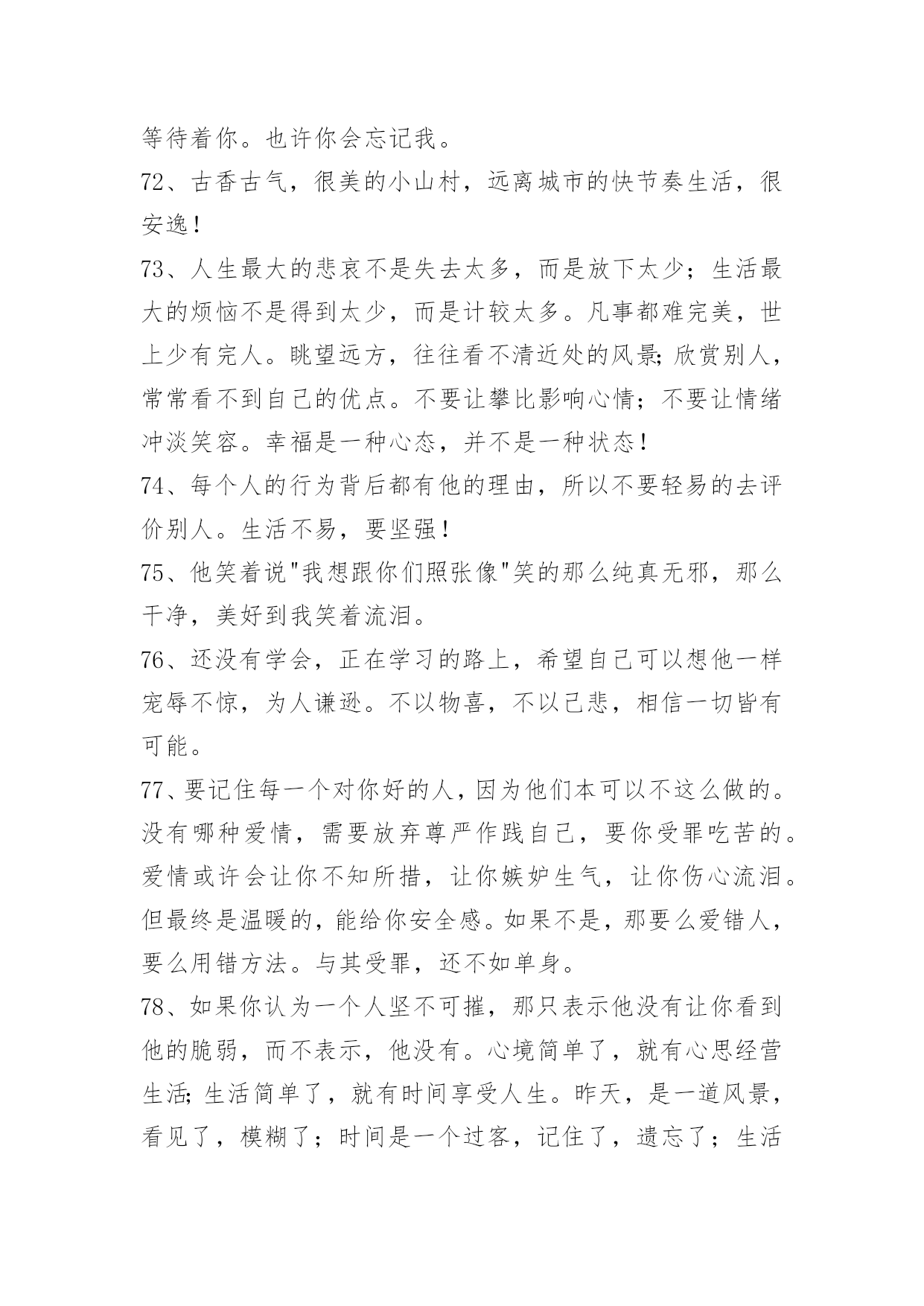 生活个性说说感言关于生活个性说说感言(精选110句)照亮我的道路,并且不断地给我新的勇气去愉快地正视生活的理想,是善、美和真。要是没有志同道合者之间的亲切感情,要不是全神贯注于客观世界那个在艺术和科学工作领域里永远达不到的对象,那末在我看来,生活就会是空虚的。人们所努力追求的庸俗的目标下面这篇文章是小编为各位读者准备的生活个性说说感言,希望能够帮助到大家。1、静静的人生,就是一路风景,一路歌。总在陌生的风景里,吟唱一首陌生的歌,拥有一段陌生的情怀。2、有没用不是别人说了算,自己都不努力就没更没得救。3、如果一个人先从自己的思想上一开始奋斗,那么他就是个有价值的人。你,改变思想,思想也会改变你,改变你的人生道路,无论是物质上的贫穷还是精神上的贫穷,只要拥有一颗不甘平凡的积极向上的心灵,乐于从思想上改变自己,那么你的目光有多远,路就有多远。4、一个从不回头的人,未必是因勇敢,也许是怕被识破脸上的泪痕。一个时刻微笑的人,未必是因快乐,可能是怕被看穿心底的叹息。真实,是件很难的事。人总怕被生活轻视,拼命活出一副坚硬的样子。久了,就离自己越来越远。要有多强大,才终于学会不掩饰。一生中最有分量的一个字,原来是——真。5、熟悉自我,降伏自我,改变自我,才能改变别人。6、是谁制造了痛苦,是我们?还是所谓的命运?7、一个人来到世间,来去匆匆,经历了人世间的悲欢离合、苦辣酸甜,有些事情多往好处想,就算人生苦恼重重,学会平淡,学会宽容,让生活的美好记忆,当做自己坚强的理由,用一种积极向上的心态去迎接未来的生活,因为乐观,所以希望。8、处顺境中必须谨慎,处逆境中必须忍耐。9、花开成海,思念成灾。10、被时间活埋,从盛开到腐败,然后爱,从纯白到苍白,从苍白到尘埃。11、如果你们像夫妻那样争吵,朋友那样交谈,初恋那样打情骂俏,兄妹那样保护对方,那你们便是命中注定要在一起。③与其等到别人来爱你,不如自己学着努力多爱自己一些。12、真正爱你的人,很少当面赞美你,可是心里肯定你是最棒的。13、爱情终究还是一件可以让人发疯的事情。是你的,命中注定;不是你的,千金难求。我们那么发疯地去爱一个人,现在却又要发了疯一般地去忘记一个人!14、可不可以,不期待,这样就不用骄傲地等待?可不可以,不呼吸,这样就不用忍受陌生气息?可不可以,不落日,这样就不用在夕阳下深深地思念?可不可以,我们不那么软弱?15、点点滴滴地收集,点点滴滴地感悟,能找到难过的理由,也一定能找到快乐的理由。但是一定要记住,烦恼就烦恼了,不能让烦恼一直围绕在你身边。16、爱在自如,不要依赖一个人依赖上了另一个人,与肩膀厚实无关,与脾气品性无关,与时间长短无关……爱了,一个愿意去呵护,一个愿意去依赖。17、有人以为寂寞是一种可怕的心理状态和生活状态,其实不然。寂寞是一种追求、一种创造、一种境界,是产生大智慧的土壤。寂寞并不可怕,它完全可以成为一种高贵的享受。18、多为对方想想,别让你身边的人不知所措,尤其是深爱你的人……无论一个女人抑或一个男人,一生中能被一个这样的人深深爱过,是怎样的一种幸福呢?19、今生,我们就像左眼看不见右眼,咫尺,却不知彼此的模样。只有在心中,筑一道思念的墙,默默用眼泪,把你的影子,投射在那一面哭泣的墙上。20、一直喜欢用色清淡的东西,比如画梅或画竹,不同于画牡丹的人。画牡丹的人,喜欢热闹和凡俗,喜欢讨喜。或者更直接地说,喜欢用牡丹去谋求些什么。21、你一直就是那个看客,看着我如小丑一样,在你的面前独舞,在你的世界把自己剥离得支离破碎。在你得到快乐的同时,也伤害了我这个痴心爱你的人。22、深呼吸;如果你产生了放弃的念头,那么,你不妨问自己一个问题,"我在呼吸吗?"然后做几次深呼吸。问你自己"我现在感觉放松吗?"如果你的回答是"不太放松",那么先什么也不要做,然后深呼吸。23、在人的一生中,总有一些愿望不能实现,总有许多梦想难以成真。即便如此,我们也没有理由去抱怨人生。生活对谁都没有好恶之分,它像一杯白开水,有人喝下香甜可口,有人觉得淡而无味。其实,水的味道倒不一定重要,重要的是,你以什么心情去体验它,所谓的人生的幸福与痛苦,不过是每个人对生活的一种心理体验。乐观者即使陷入困境,体验到的也只有快乐,一种与逆境抗争的快乐。24、谦虚和内,心的安宁是携手同行的。把石头丢进大河,河水并不受到影响。有信仰的人,若因别人的恶评雨,心乱,他就不是大河,而只是水塘。有信仰的人最富贵,有道德的人最安乐,肯修行的人最安心,有智慧的人最可敬。25、人生都有低谷,你或许怀念曾经的辉煌;可当你真的处于人生辉煌顶峰时,你或许会向往闲云野鹤的怡然。其实,人生无常,守住自己的淡然心态最可贵。落叶同然留恋高高的枝头,可它明白只有积蓄能量,才能有来年的春暖花开。不矫揉造作,人生才能宁静而致远。26、心是个连自己都控