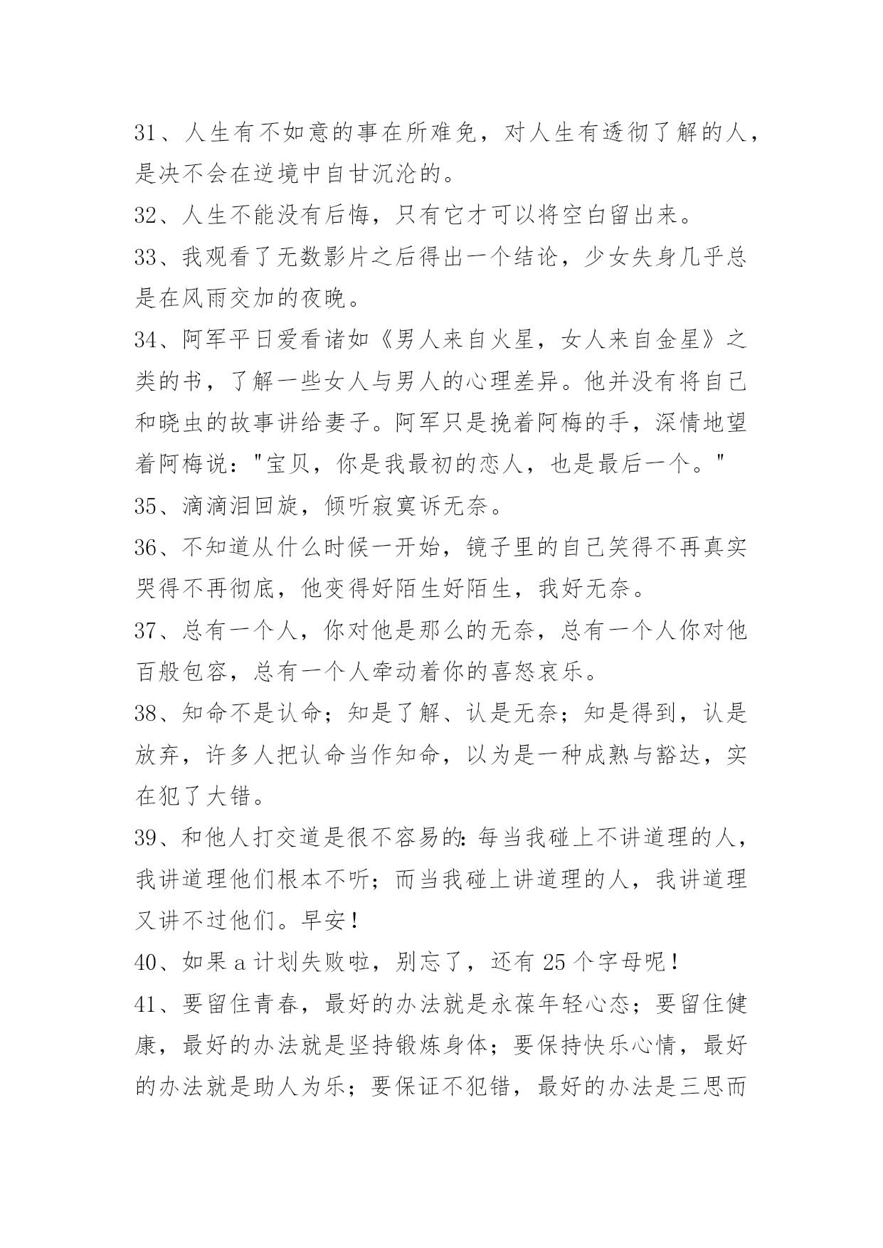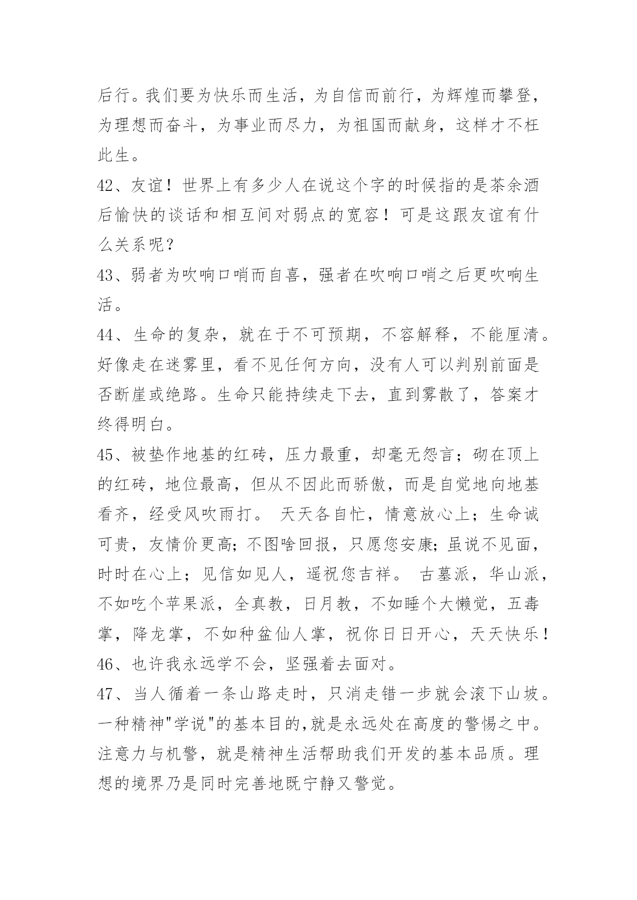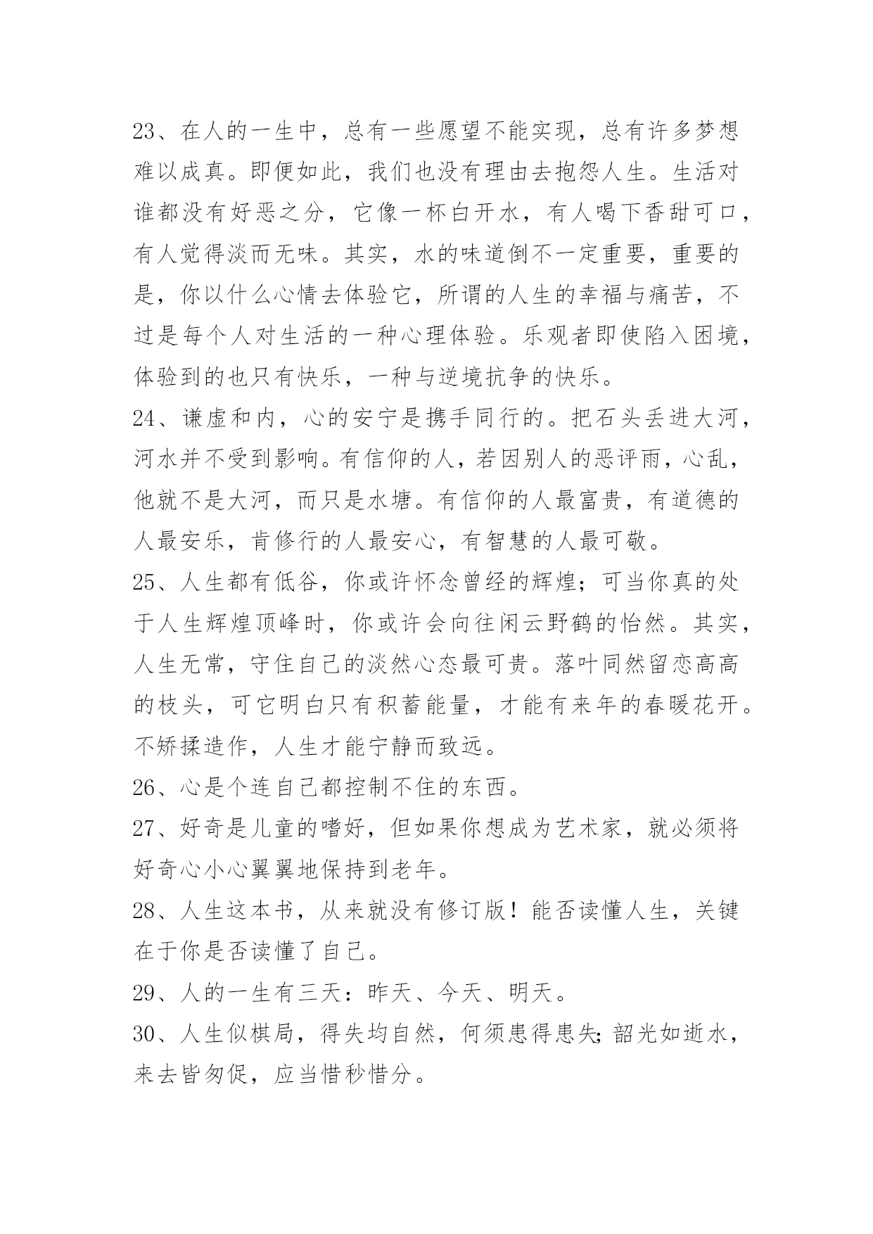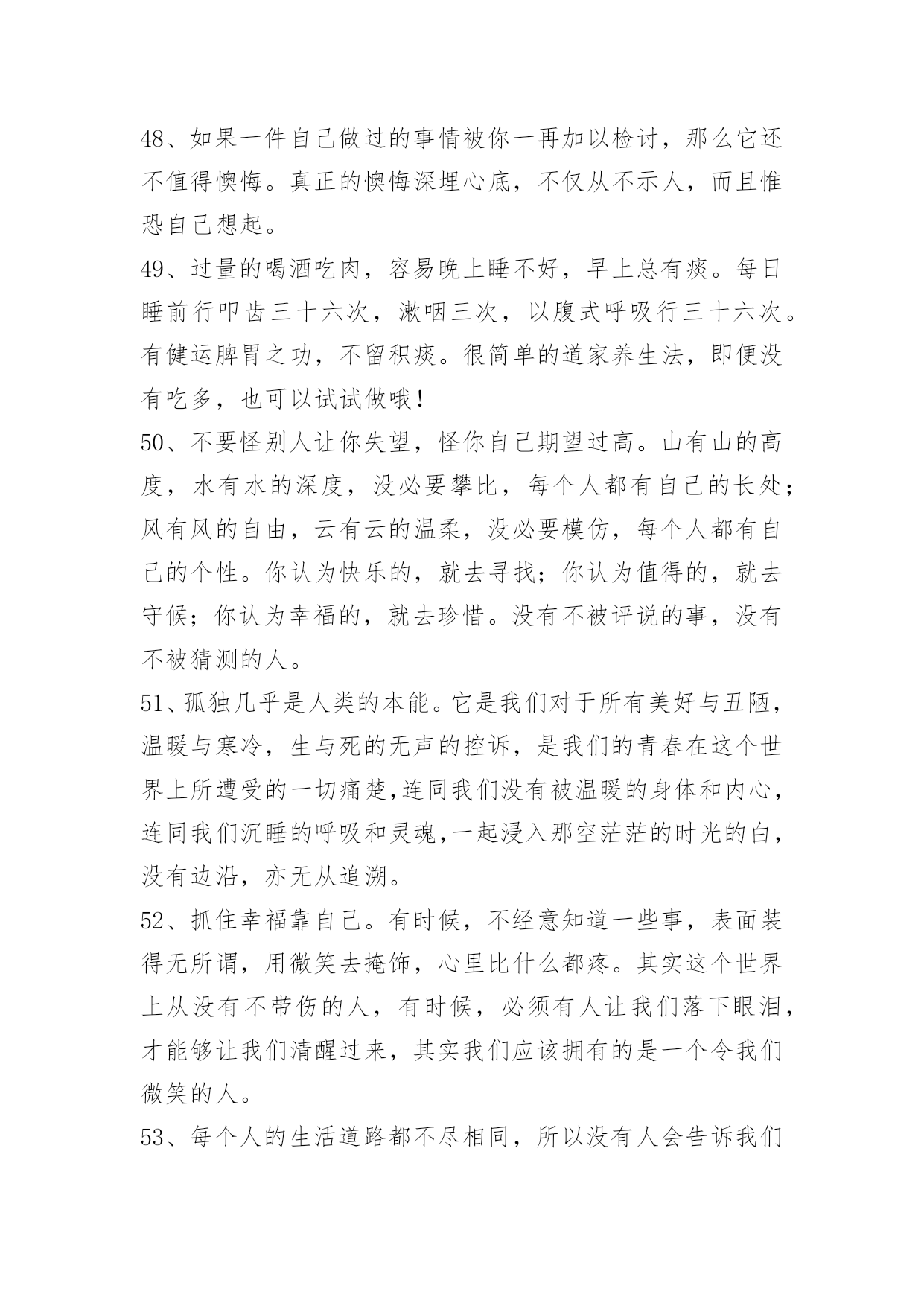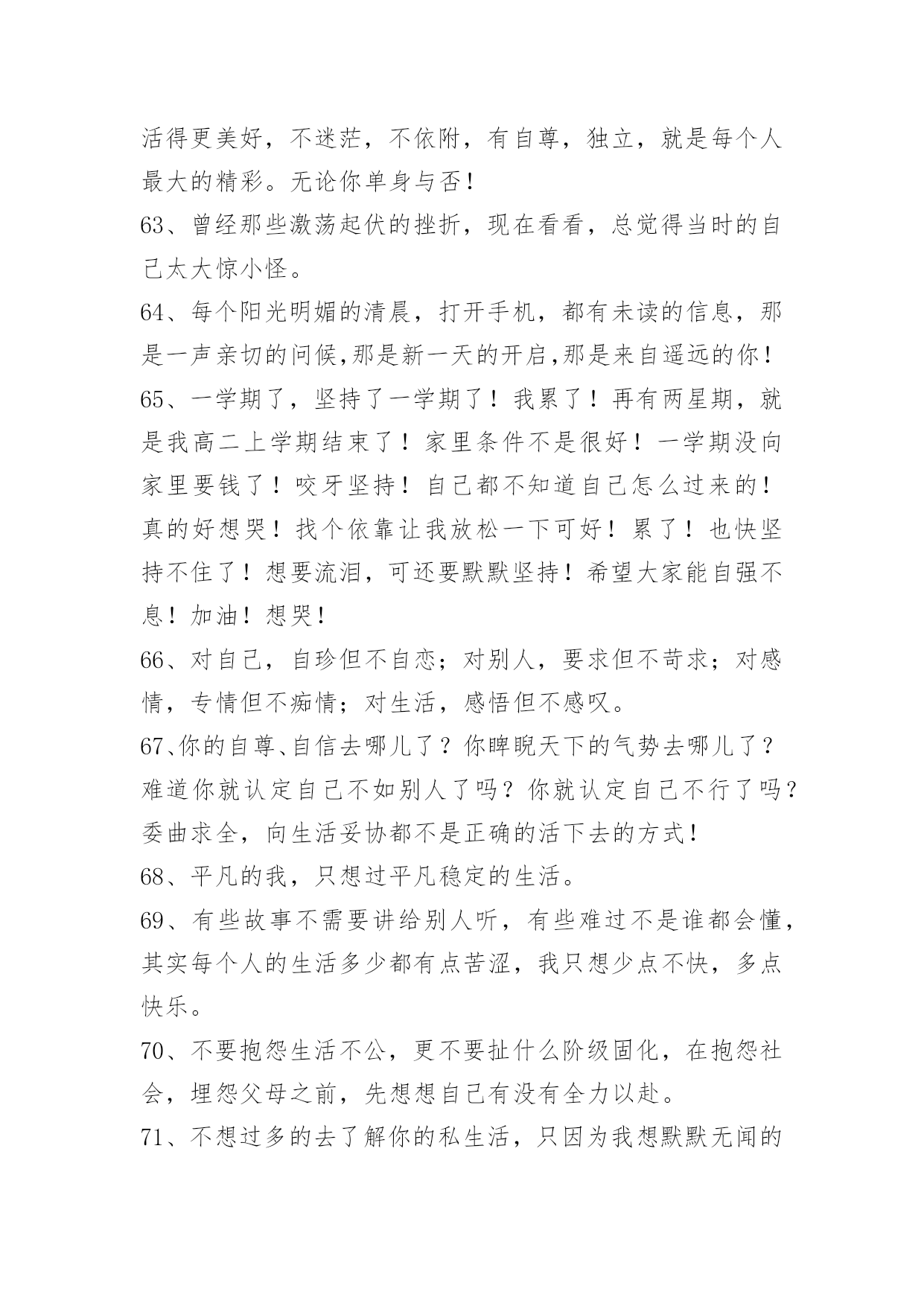 生活个性说说感言关于生活个性说说感言(精选110句)照亮我的道路,并且不断地给我新的勇气去愉快地正视生活的理想,是善、美和真。要是没有志同道合者之间的亲切感情,要不是全神贯注于客观世界那个在艺术和科学工作领域里永远达不到的对象,那末在我看来,生活就会是空虚的。人们所努力追求的庸俗的目标下面这篇文章是小编为各位读者准备的生活个性说说感言,希望能够帮助到大家。1、静静的人生,就是一路风景,一路歌。总在陌生的风景里,吟唱一首陌生的歌,拥有一段陌生的情怀。2、有没用不是别人说了算,自己都不努力就没更没得救。3、如果一个人先从自己的思想上一开始奋斗,那么他就是个有价值的人。你,改变思想,思想也会改变你,改变你的人生道路,无论是物质上的贫穷还是精神上的贫穷,只要拥有一颗不甘平凡的积极向上的心灵,乐于从思想上改变自己,那么你的目光有多远,路就有多远。4、一个从不回头的人,未必是因勇敢,也许是怕被识破脸上的泪痕。一个时刻微笑的人,未必是因快乐,可能是怕被看穿心底的叹息。真实,是件很难的事。人总怕被生活轻视,拼命活出一副坚硬的样子。久了,就离自己越来越远。要有多强大,才终于学会不掩饰。一生中最有分量的一个字,原来是——真。5、熟悉自我,降伏自我,改变自我,才能改变别人。6、是谁制造了痛苦,是我们?还是所谓的命运?7、一个人来到世间,来去匆匆,经历了人世间的悲欢离合、苦辣酸甜,有些事情多往好处想,就算人生苦恼重重,学会平淡,学会宽容,让生活的美好记忆,当做自己坚强的理由,用一种积极向上的心态去迎接未来的生活,因为乐观,所以希望。8、处顺境中必须谨慎,处逆境中必须忍耐。9、花开成海,思念成灾。10、被时间活埋,从盛开到腐败,然后爱,从纯白到苍白,从苍白到尘埃。11、如果你们像夫妻那样争吵,朋友那样交谈,初恋那样打情骂俏,兄妹那样保护对方,那你们便是命中注定要在一起。③与其等到别人来爱你,不如自己学着努力多爱自己一些。12、真正爱你的人,很少当面赞美你,可是心里肯定你是最棒的。13、爱情终究还是一件可以让人发疯的事情。是你的,命中注定;不是你的,千金难求。我们那么发疯地去爱一个人,现在却又要发了疯一般地去忘记一个人!14、可不可以,不期待,这样就不用骄傲地等待?可不可以,不呼吸,这样就不用忍受陌生气息?可不可以,不落日,这样就不用在夕阳下深深地思念?可不可以,我们不那么软弱?15、点点滴滴地收集,点点滴滴地感悟,能找到难过的理由,也一定能找到快乐的理由。但是一定要记住,烦恼就烦恼了,不能让烦恼一直围绕在你身边。16、爱在自如,不要依赖一个人依赖上了另一个人,与肩膀厚实无关,与脾气品性无关,与时间长短无关……爱了,一个愿意去呵护,一个愿意去依赖。17、有人以为寂寞是一种可怕的心理状态和生活状态,其实不然。寂寞是一种追求、一种创造、一种境界,是产生大智慧的土壤。寂寞并不可怕,它完全可以成为一种高贵的享受。18、多为对方想想,别让你身边的人不知所措,尤其是深爱你的人……无论一个女人抑或一个男人,一生中能被一个这样的人深深爱过,是怎样的一种幸福呢?19、今生,我们就像左眼看不见右眼,咫尺,却不知彼此的模样。只有在心中,筑一道思念的墙,默默用眼泪,把你的影子,投射在那一面哭泣的墙上。20、一直喜欢用色清淡的东西,比如画梅或画竹,不同于画牡丹的人。画牡丹的人,喜欢热闹和凡俗,喜欢讨喜。或者更直接地说,喜欢用牡丹去谋求些什么。21、你一直就是那个看客,看着我如小丑一样,在你的面前独舞,在你的世界把自己剥离得支离破碎。在你得到快乐的同时,也伤害了我这个痴心爱你的人。22、深呼吸;如果你产生了放弃的念头,那么,你不妨问自己一个问题,"我在呼吸吗?"然后做几次深呼吸。问你自己"我现在感觉放松吗?"如果你的回答是"不太放松",那么先什么也不要做,然后深呼吸。23、在人的一生中,总有一些愿望不能实现,总有许多梦想难以成真。即便如此,我们也没有理由去抱怨人生。生活对谁都没有好恶之分,它像一杯白开水,有人喝下香甜可口,有人觉得淡而无味。其实,水的味道倒不一定重要,重要的是,你以什么心情去体验它,所谓的人生的幸福与痛苦,不过是每个人对生活的一种心理体验。乐观者即使陷入困境,体验到的也只有快乐,一种与逆境抗争的快乐。24、谦虚和内,心的安宁是携手同行的。把石头丢进大河,河水并不受到影响。有信仰的人,若因别人的恶评雨,心乱,他就不是大河,而只是水塘。有信仰的人最富贵,有道德的人最安乐,肯修行的人最安心,有智慧的人最可敬。25、人生都有低谷,你或许怀念曾经的辉煌;可当你真的处于人生辉煌顶峰时,你或许会向往闲云野鹤的怡然。其实,人生无常,守住自己的淡然心态最可贵。落叶同然留恋高高的枝头,可它明白只有积蓄能量,才能有来年的春暖花开。不矫揉造作,人生才能宁静而致远。26、心是个连自己都控
