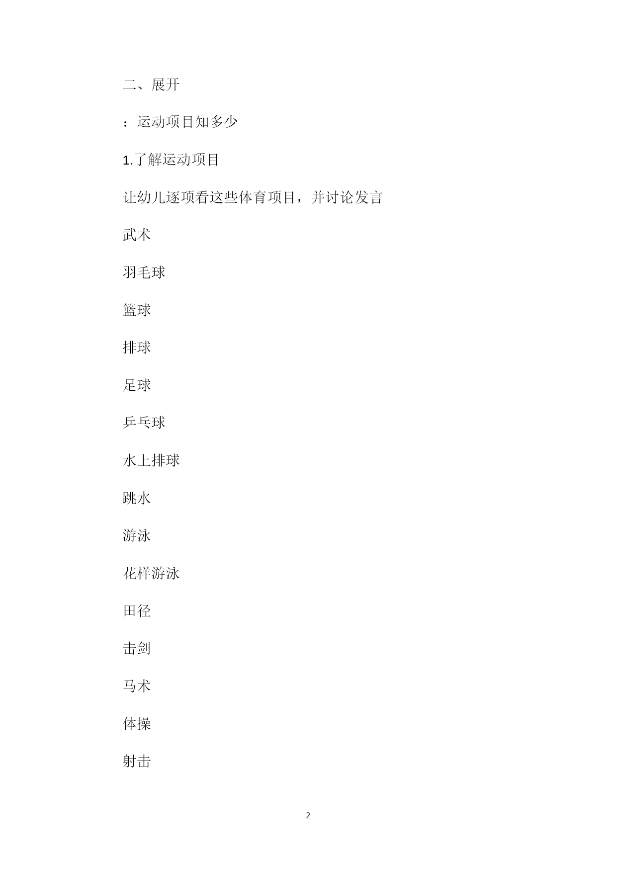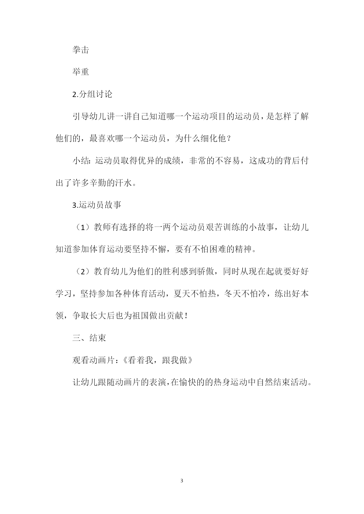 PAGEPAGE3大班美术《我喜爱的运动》教案大班美术《我喜爱的运动》教案包含了,活动目标是,通过活动,让幼儿了解一些运动项目,培养幼儿对参加运动的喜爱,能用较完整的句子较连贯地讲述“我最喜欢的运动”,清楚地表达自己的意思。活动目标:1.通过活动,让幼儿了解一些运动项目,培养幼儿对参加运动的喜爱。2.能用较完整的句子较连贯地讲述我最喜欢的运动,清楚地表达自己的意思。3知道参加体育运动要坚持不懈,有不怕困难的精神活动准备:1.课件-动画片:看着我,跟我做2.:运动项目知多少活动过程:一、导入启发幼儿谈论运动项目小朋友,你们观看过运动会比赛吗?你看到了什么比赛项目?你最喜欢哪一个运动项目?(让幼儿自由讲述,激发谈论的兴趣)二、展开:运动项目知多少1.了解运动项目让幼儿逐项看这些体育项目,并讨论发言武术羽毛球篮球排球足球乒乓球水上排球跳水游泳花样游泳田径击剑马术体操射击拳击举重2.分组讨论引导幼儿讲一讲自己知道哪一个运动项目的运动员,是怎样了解他们的,最喜欢哪一个运动员,为什么细化他?小结:运动员取得优异的成绩,非常的不容易,这成功的背后付出了许多辛勤的汗水。3.运动员故事(1)教师有选择的将一两个运动员艰苦训练的小故事,让幼儿知道参加体育运动要坚持不懈,要有不怕困难的精神。(2)教育幼儿为他们的胜利感到骄傲,同时从现在起就要好好学习,坚持参加各种体育活动,夏天不怕热,冬天不怕冷,练出好本领,争取长大后也为祖国做出贡献!三、结束观看动画片:《看着我,跟我做》让幼儿跟随动画片的表演,在愉快的的热身运动中自然结束活动。