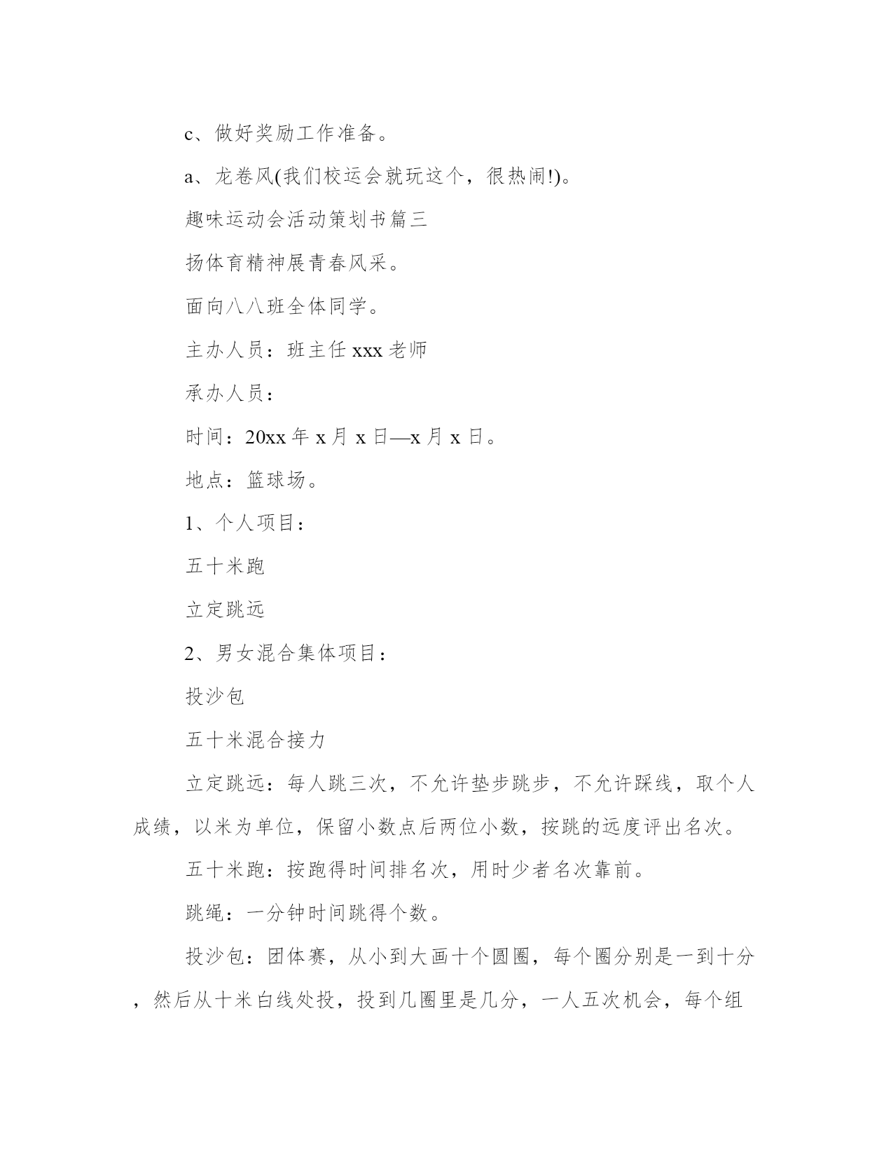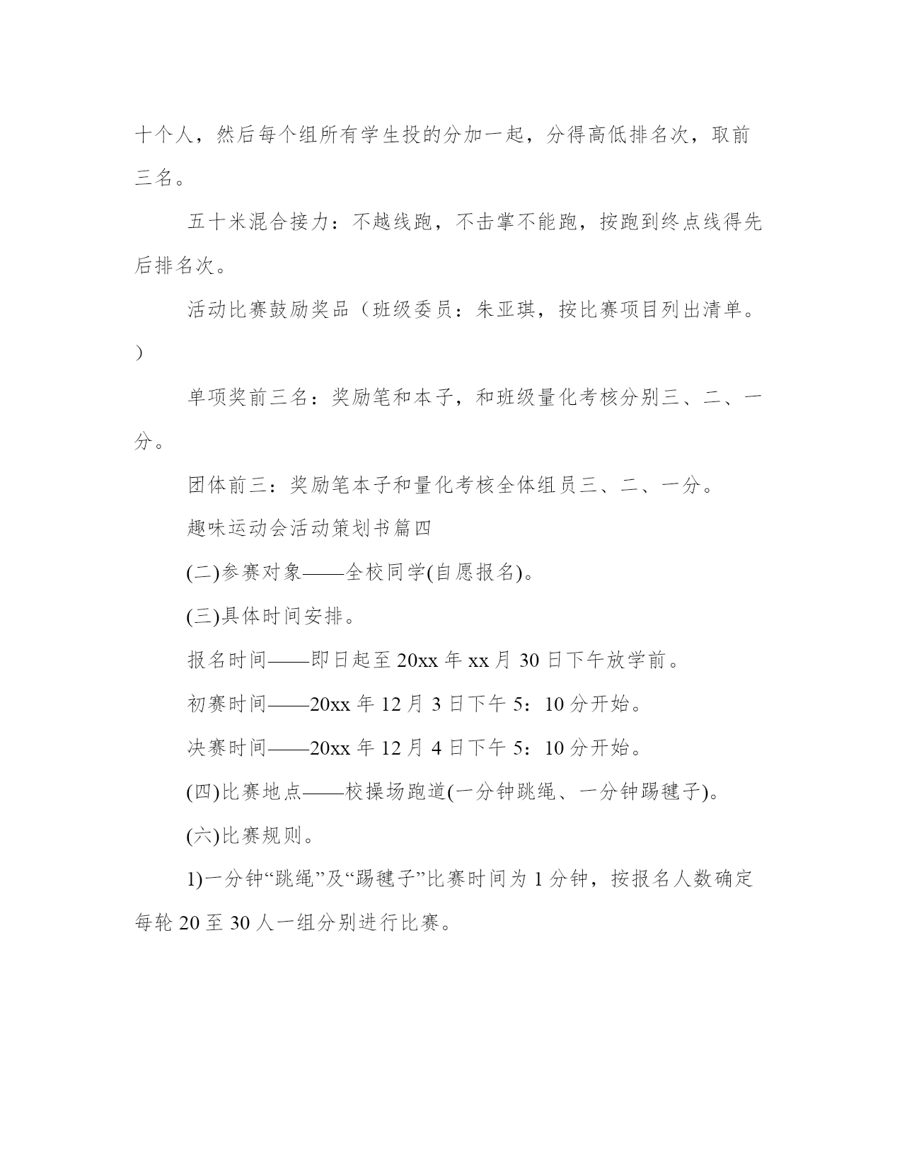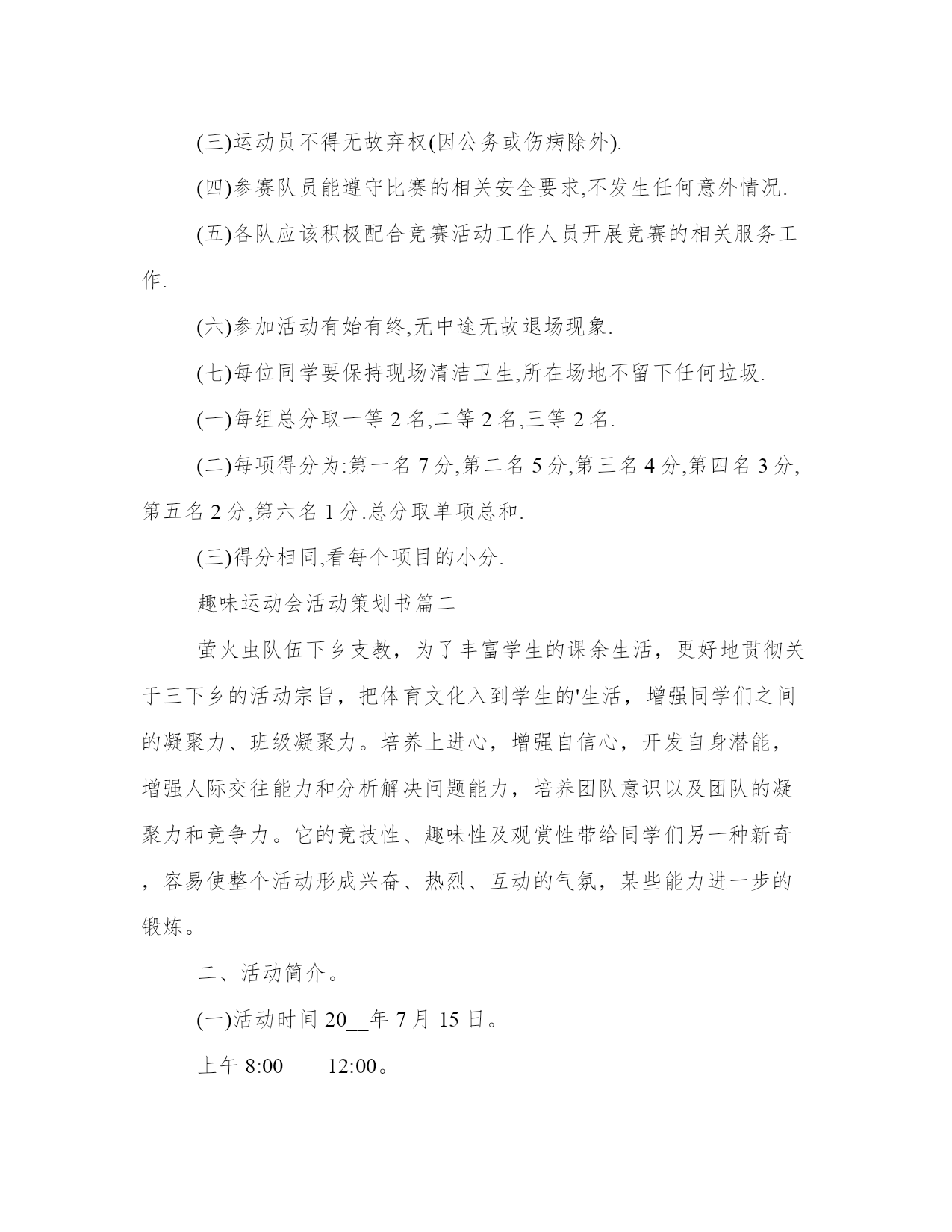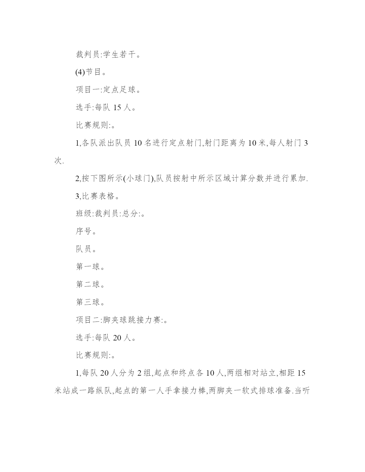趣味运动会活动策划书趣味运动会活动策划(模板12篇)每个人都曾试图在平淡的学习、工作和生活中写一篇文章。写作是培养人的观察、联想、想象、思维和记忆的重要手段。写范文的时候需要注意什么呢?有哪些格式需要注意呢?接下来小编就给大家介绍一下优秀的范文该怎么写,我们一起来看一看吧。趣味运动会活动策划书篇一为丰富高一学生的文化生活,倡导"每天健身一小时,健康生活一辈子",增强学生的身体素质和凝聚力,构建"和美年级段",高一年级段将举办高一年级段第一次趣味运动会,现制定活动方案如下:。顾问:王文斌。主任:林海兵。副主任:方志国(负责安全)李玲芬(负责纪律)杨华(负责后勤)。总裁判长:体育老师金福云。裁判:袁世平蒋珍霞吴霞。1,报名方法,时间:参加比赛的名单在10月8日前报承办班级班主任或负责人。2,分组情况:特色组机械组经济组。1,时间:定于10.14下午班会课,若因天气原因,另通知。2,地点:校内操场。3,场地划分。特色组:a幢前的篮球场地。机械组:国旗台边的排球场地。经济组:c幢前大门口场地。(一),特色组:。(1)参加班级:高一18,6,15,8,9,17。(2)承办班级:高一18。(3)组织机构:。组长:袁世平。副组长:王学军庄晓红郑霄杨爱群杜娟。成员:学生会人员若干。裁判长:袁世平(兼职)。裁判员:学生若干。(4)节目。项目一:爱心速递。(1),比赛人数及分组:每队15名队员。(2),比赛赛制:一场决定胜负,用时最少的队获胜。(3),比赛规则:。a,每个队15名队员依次排开排成一列,间距一臂;。c,当第一名队员站在最后一位并双手持球后视为比赛结束(比赛过程中,第一名队员是不跑动的)。d,在传球过程中,球落地后,须由传球队员捡球后重新传球.(4),比赛纪律:比赛中应绝对服从裁判,以裁判员的`判罚为最终判决.项目二:钉纽扣。1,器械:针线纽扣\布。2,参赛人数:每班十人。3,规则:。(1),比赛采用接力形式进行,每队第一人听到发令后,跑向终点处首先把线穿到针上然后用针线把纽扣钉到布上,要求拿起布,纽扣不掉下来为准,补好以后放回原处,回到起点,第二个接,第三个继续,直到最后一名完成后.(2),要求把钮扣钉成五条直线上,每条直线上四颗钮扣.(3),完成后,拿回钉了十纽扣的布回来,以最快完成,补得最漂亮美观的为胜.(二),机械组:。(1)参加班级:高一4,5,11,12,13,14。(2)承办班级:高一4。(3)组织机构:。组长:蒋珍霞。副组长:仇军曼戴旭华童灵华潘云明郑建明。成员:学生会人员若干。裁判长:蒋珍霞(兼职)。裁判员:学生若干。(4)节目。项目一:定点足球。选手:每队15人。比赛规则:。1,各队派出队员10名进行定点射门,射门距离为10米,每人射门3次.2,按下图所示(小球门),队员按射中所示区域计算分数并进行累加.3,比赛表格。班级:裁判员:总分:。序号。队员。第一球。第二球。第三球。项目二:脚夹球跳接力赛:。选手:每队20人。比赛规则:。1,每队20人分为2组,起点和终点各10人,两组相对站立,相距15米站成一路纵队,起点的第一人手拿接力棒,两脚夹一软式排球准备.当听到信号后,以蛙跳方式跳向本队终点组的第一个人,同伴接棒后,采用同样方式跳向起点第二名队员,重复进行,以各队完成时间多少排定名次.2,必须在比赛的赛道内进行,出赛道加时间2秒一次.3,在跳的过程中,球若掉落,须在原地夹好后再继续跳进,否则判为失败.(三),经济组:。(1)参加班级:高一1,2,3,7,10,16。(2)承办班级:高一2。(3)组织机构:。组长:吴霞。副组长:金平菊汪士林罗海霞王丽华盛慧贞。成员:学生会人员若干。裁判长:吴霞(兼职)。裁判员:学生若干。(4)节目。项目一:双龙戏珠接力赛。选手:每队20人(其中女学生不小于8人)分为两组依次进行。规则:。1,各队分成两大组分别站在东西两侧,每次由两名队员背对背夹着蓝球,听到开始信号后,从起跑线起侧前移动,到达终点线后,在交界区内拿下篮球交给下一组队员(其他队员不能帮忙);以此类推,以最后两人冲过终点线为结束比赛,以时间多少排列最终名次.3,若有用手托(扶)或没有在交界区交接者按每一次犯规加时2秒计入比赛成绩。项目二:连环套。1.比赛人数及分组:每队12名队员(其中女学生不小于6人),分为两组依次进行。2.比赛赛距:场地长约25米,。3.比赛赛制:按照每组最后一个人到达终点的先后按计时取名次。4.比赛规则:。1)每队12人纵队排在线上,每位队员之间相隔2米.第一位队员站在游泳圈内,另外手拿一个泳圈.发令后,第一位迅速将手上的