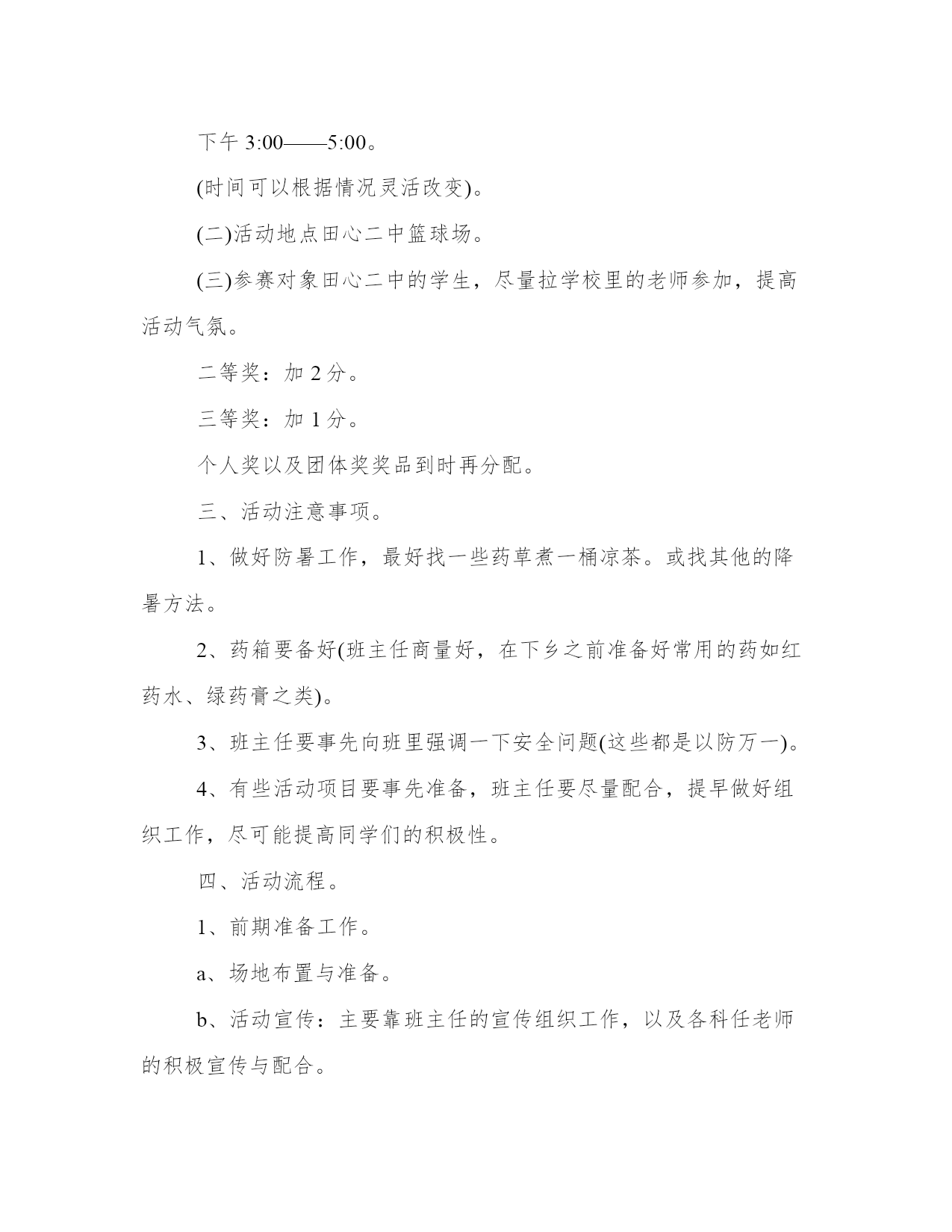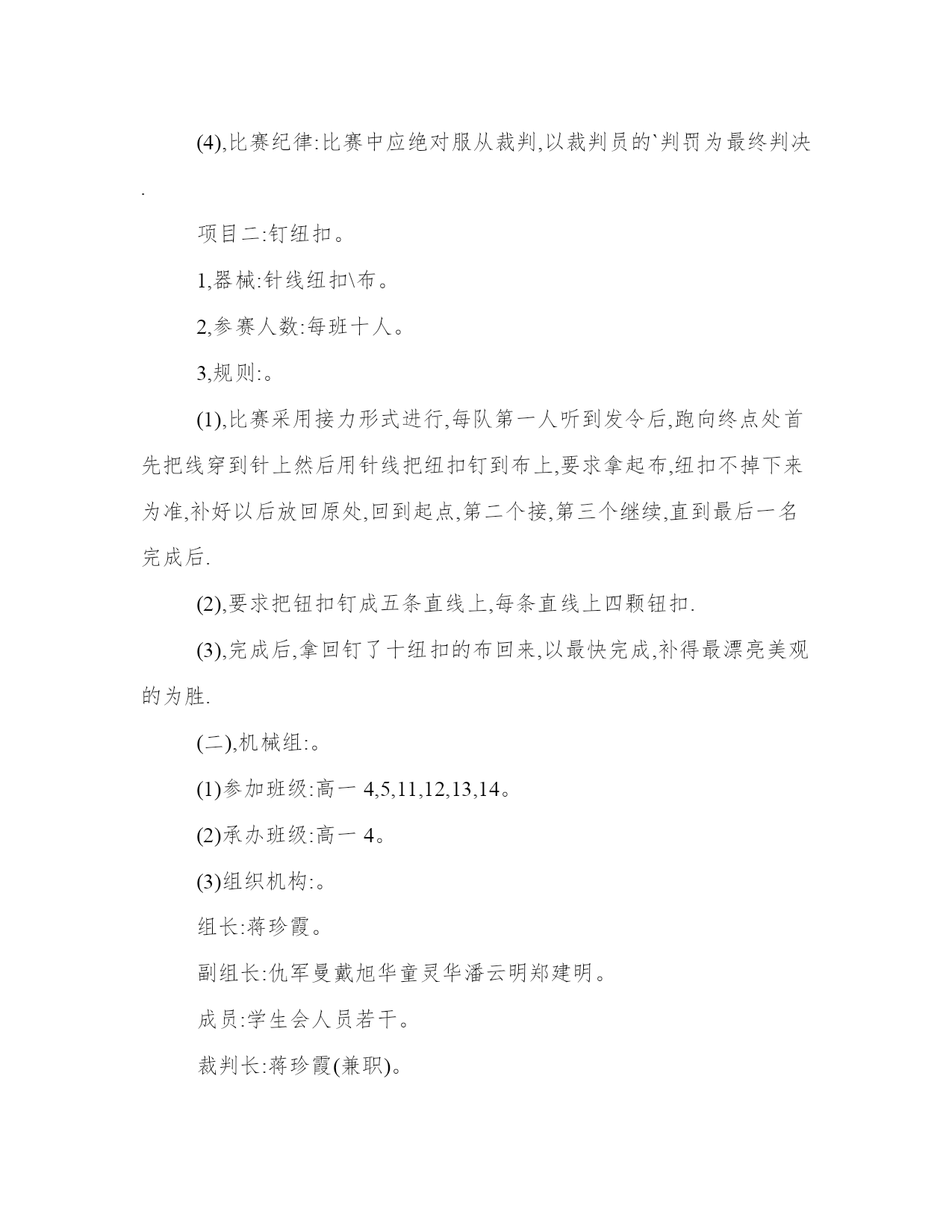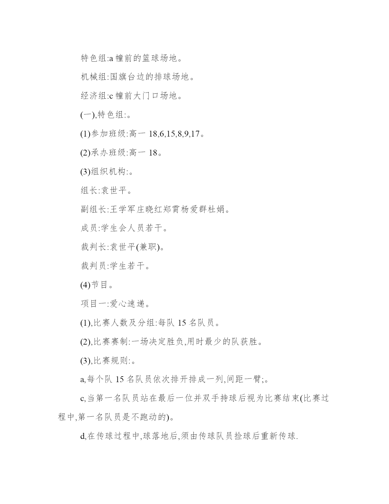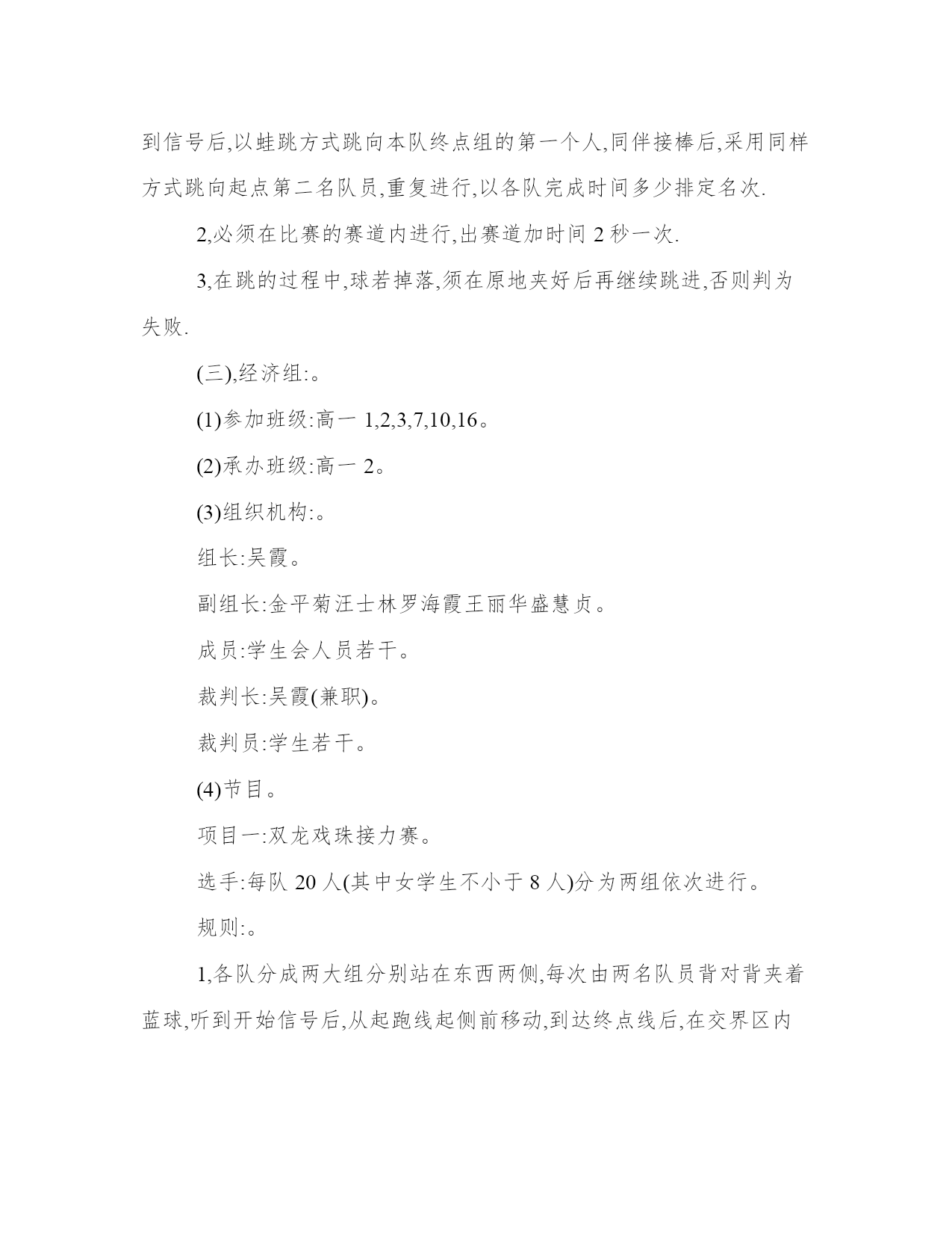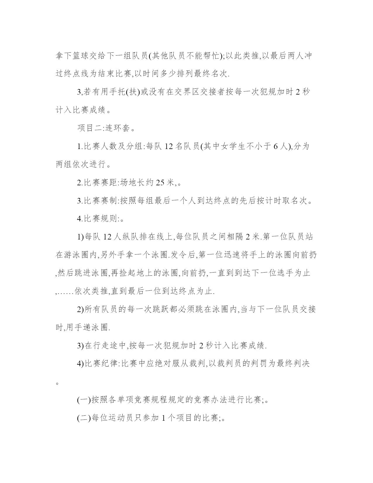 趣味运动会活动策划书趣味运动会活动策划(模板12篇)每个人都曾试图在平淡的学习、工作和生活中写一篇文章。写作是培养人的观察、联想、想象、思维和记忆的重要手段。写范文的时候需要注意什么呢?有哪些格式需要注意呢?接下来小编就给大家介绍一下优秀的范文该怎么写,我们一起来看一看吧。趣味运动会活动策划书篇一为丰富高一学生的文化生活,倡导"每天健身一小时,健康生活一辈子",增强学生的身体素质和凝聚力,构建"和美年级段",高一年级段将举办高一年级段第一次趣味运动会,现制定活动方案如下:。顾问:王文斌。主任:林海兵。副主任:方志国(负责安全)李玲芬(负责纪律)杨华(负责后勤)。总裁判长:体育老师金福云。裁判:袁世平蒋珍霞吴霞。1,报名方法,时间:参加比赛的名单在10月8日前报承办班级班主任或负责人。2,分组情况:特色组机械组经济组。1,时间:定于10.14下午班会课,若因天气原因,另通知。2,地点:校内操场。3,场地划分。特色组:a幢前的篮球场地。机械组:国旗台边的排球场地。经济组:c幢前大门口场地。(一),特色组:。(1)参加班级:高一18,6,15,8,9,17。(2)承办班级:高一18。(3)组织机构:。组长:袁世平。副组长:王学军庄晓红郑霄杨爱群杜娟。成员:学生会人员若干。裁判长:袁世平(兼职)。裁判员:学生若干。(4)节目。项目一:爱心速递。(1),比赛人数及分组:每队15名队员。(2),比赛赛制:一场决定胜负,用时最少的队获胜。(3),比赛规则:。a,每个队15名队员依次排开排成一列,间距一臂;。c,当第一名队员站在最后一位并双手持球后视为比赛结束(比赛过程中,第一名队员是不跑动的)。d,在传球过程中,球落地后,须由传球队员捡球后重新传球.(4),比赛纪律:比赛中应绝对服从裁判,以裁判员的`判罚为最终判决.项目二:钉纽扣。1,器械:针线纽扣\布。2,参赛人数:每班十人。3,规则:。(1),比赛采用接力形式进行,每队第一人听到发令后,跑向终点处首先把线穿到针上然后用针线把纽扣钉到布上,要求拿起布,纽扣不掉下来为准,补好以后放回原处,回到起点,第二个接,第三个继续,直到最后一名完成后.(2),要求把钮扣钉成五条直线上,每条直线上四颗钮扣.(3),完成后,拿回钉了十纽扣的布回来,以最快完成,补得最漂亮美观的为胜.(二),机械组:。(1)参加班级:高一4,5,11,12,13,14。(2)承办班级:高一4。(3)组织机构:。组长:蒋珍霞。副组长:仇军曼戴旭华童灵华潘云明郑建明。成员:学生会人员若干。裁判长:蒋珍霞(兼职)。裁判员:学生若干。(4)节目。项目一:定点足球。选手:每队15人。比赛规则:。1,各队派出队员10名进行定点射门,射门距离为10米,每人射门3次.2,按下图所示(小球门),队员按射中所示区域计算分数并进行累加.3,比赛表格。班级:裁判员:总分:。序号。队员。第一球。第二球。第三球。项目二:脚夹球跳接力赛:。选手:每队20人。比赛规则:。1,每队20人分为2组,起点和终点各10人,两组相对站立,相距15米站成一路纵队,起点的第一人手拿接力棒,两脚夹一软式排球准备.当听到信号后,以蛙跳方式跳向本队终点组的第一个人,同伴接棒后,采用同样方式跳向起点第二名队员,重复进行,以各队完成时间多少排定名次.2,必须在比赛的赛道内进行,出赛道加时间2秒一次.3,在跳的过程中,球若掉落,须在原地夹好后再继续跳进,否则判为失败.(三),经济组:。(1)参加班级:高一1,2,3,7,10,16。(2)承办班级:高一2。(3)组织机构:。组长:吴霞。副组长:金平菊汪士林罗海霞王丽华盛慧贞。成员:学生会人员若干。裁判长:吴霞(兼职)。裁判员:学生若干。(4)节目。项目一:双龙戏珠接力赛。选手:每队20人(其中女学生不小于8人)分为两组依次进行。规则:。1,各队分成两大组分别站在东西两侧,每次由两名队员背对背夹着蓝球,听到开始信号后,从起跑线起侧前移动,到达终点线后,在交界区内拿下篮球交给下一组队员(其他队员不能帮忙);以此类推,以最后两人冲过终点线为结束比赛,以时间多少排列最终名次.3,若有用手托(扶)或没有在交界区交接者按每一次犯规加时2秒计入比赛成绩。项目二:连环套。1.比赛人数及分组:每队12名队员(其中女学生不小于6人),分为两组依次进行。2.比赛赛距:场地长约25米,。3.比赛赛制:按照每组最后一个人到达终点的先后按计时取名次。4.比赛规则:。1)每队12人纵队排在线上,每位队员之间相隔2米.第一位队员站在游泳圈内,另外手拿一个泳圈.发令后,第一位迅速将手上的