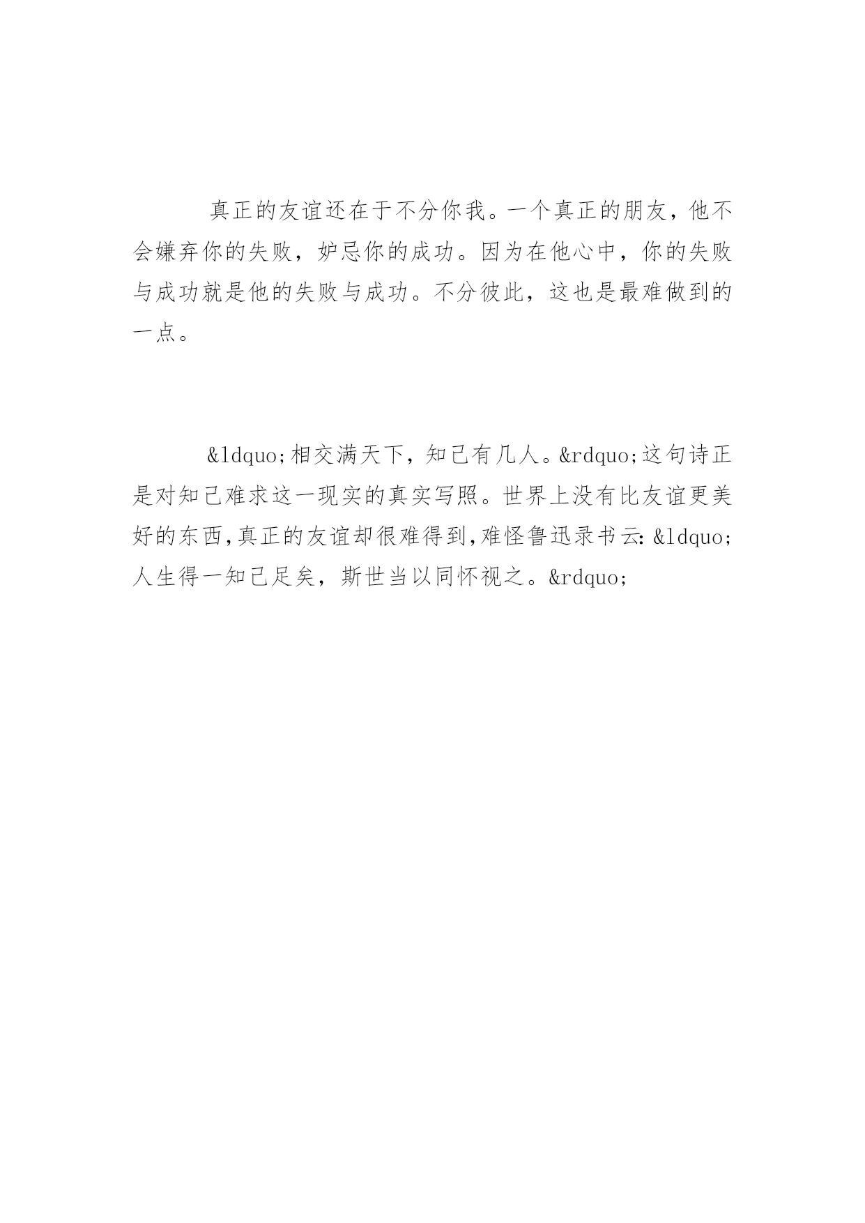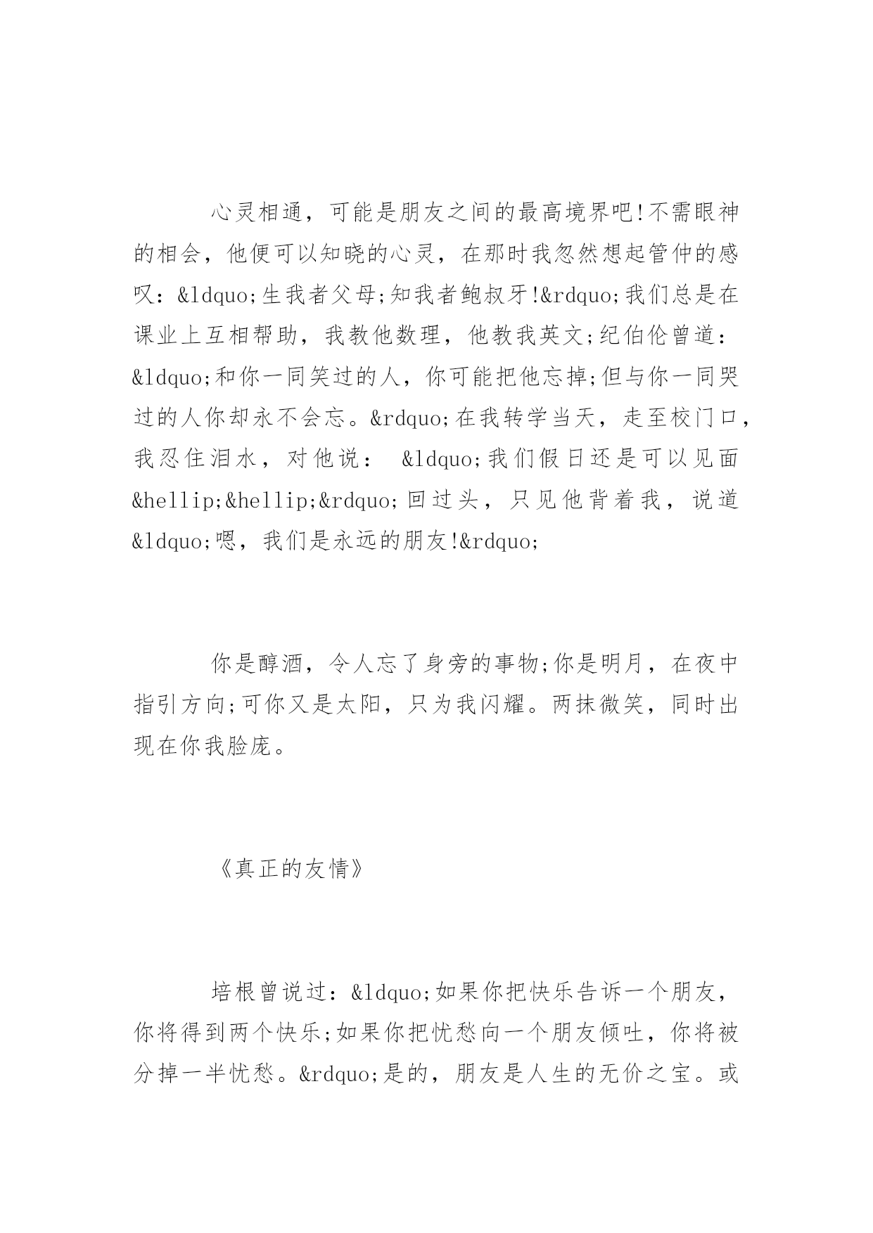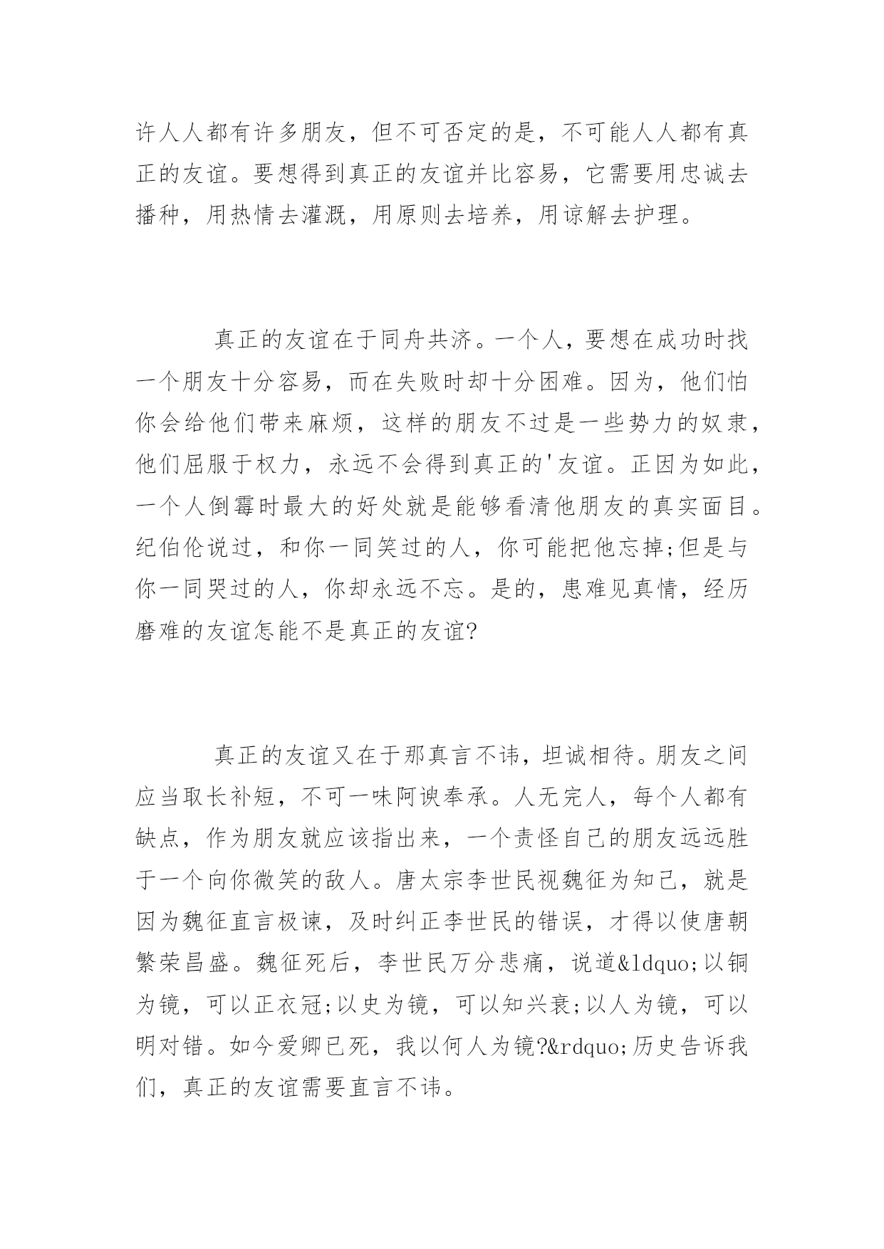 中考优秀作文欣赏:真正的友情2015年中考优秀作文欣赏:真正的友情《真正的友情》心灵之间的交流,可以将两个人之间的桥梁越缩越短。友谊不只是要“共享富”而已,还要“共患难”,因为只有在你我身陷深渊之中,友谊的光亮才会特别得明显、耀眼,温暖你的身灵,照耀你的心灵,将一切烦恼如尘土一般灰飞烟灭,此时的那道光便是朋友。知己就像一棵树,没有了他,人生就少了一道风景;那全然模糊的记忆似乎正慢慢清晰,第一次的相遇,我的嘴角泛起了一抹微笑,在寂寞无人的夜:他有双深邃的眼眸,宽大的鼻梁却使他有点稚气,但谁都没想到他竟会成为我最好的朋友;晚自习下课之时,我望着一弯新月,心烦意乱,此时从我身后冒出了一句话“这世上真的有外星人,至少,我要去找到。”不知怎地,这具颇有语病的话意令一切都变的不重要,我的心门就此为他打开……心灵相通,可能是朋友之间的最高境界吧!不需眼神的相会,他便可以知晓的心灵,在那时我忽然想起管仲的感叹:“生我者父母;知我者鲍叔牙!”我们总是在课业上互相帮助,我教他数理,他教我英文;纪伯伦曾道:“和你一同笑过的人,你可能把他忘掉;但与你一同哭过的人你却永不会忘。”在我转学当天,走至校门口,我忍住泪水,对他说:“我们假日还是可以见面……”回过头,只见他背着我,说道“嗯,我们是永远的朋友!”你是醇酒,令人忘了身旁的事物;你是明月,在夜中指引方向;可你又是太阳,只为我闪耀。两抹微笑,同时出现在你我脸庞。《真正的友情》培根曾说过:“如果你把快乐告诉一个朋友,你将得到两个快乐;如果你把忧愁向一个朋友倾吐,你将被分掉一半忧愁。”是的,朋友是人生的无价之宝。或许人人都有许多朋友,但不可否定的是,不可能人人都有真正的友谊。要想得到真正的友谊并比容易,它需要用忠诚去播种,用热情去灌溉,用原则去培养,用谅解去护理。真正的友谊在于同舟共济。一个人,要想在成功时找一个朋友十分容易,而在失败时却十分困难。因为,他们怕你会给他们带来麻烦,这样的朋友不过是一些势力的奴隶,他们屈服于权力,永远不会得到真正的'友谊。正因为如此,一个人倒霉时最大的好处就是能够看清他朋友的真实面目。纪伯伦说过,和你一同笑过的人,你可能把他忘掉;但是与你一同哭过的人,你却永远不忘。是的,患难见真情,经历磨难的友谊怎能不是真正的友谊?真正的友谊又在于那真言不讳,坦诚相待。朋友之间应当取长补短,不可一味阿谀奉承。人无完人,每个人都有缺点,作为朋友就应该指出来,一个责怪自己的朋友远远胜于一个向你微笑的敌人。唐太宗李世民视魏征为知己,就是因为魏征直言极谏,及时纠正李世民的错误,才得以使唐朝繁荣昌盛。魏征死后,李世民万分悲痛,说道“以铜为镜,可以正衣冠;以史为镜,可以知兴衰;以人为镜,可以明对错。如今爱卿已死,我以何人为镜?”历史告诉我们,真正的友谊需要直言不讳。真正的友谊还在于不分你我。一个真正的朋友,他不会嫌弃你的失败,妒忌你的成功。因为在他心中,你的失败与成功就是他的失败与成功。不分彼此,这也是最难做到的一点。“相交满天下,知己有几人。”这句诗正是对知己难求这一现实的真实写照。世界上没有比友谊更美好的东西,真正的友谊却很难得到,难怪鲁迅录书云:“人生得一知己足矣,斯世当以同怀视之。”