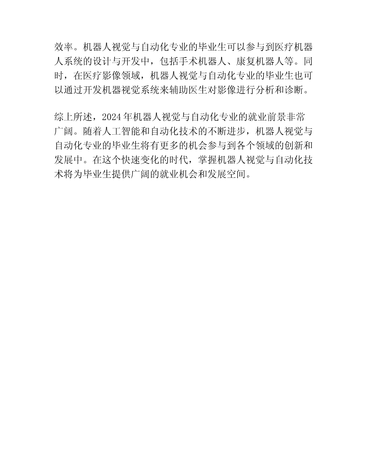 2024机器人视觉与自动化专业2024机器人视觉与自动化专业就业前景展望近年来,机器人视觉与自动化专业逐渐成为热门的技术领域。随着人工智能和自动化技术的快速发展,机器人视觉与自动化专业毕业生在市场中的需求不断增加。那么,让我们展望一下2024年机器人视觉与自动化专业的就业前景。首先,在制造业方面,机器人技术的应用逐渐扩大。随着人们对生活质量的要求提高,对机器人产品的需求也在逐渐增加。机器人视觉与自动化专业的毕业生将有机会参与到各类机器人产品的研发、生产以及维护工作中。例如,在汽车制造业中,机器人的应用已经不可或缺。机器人视觉与自动化专业的毕业生可以参与到汽车工厂的自动化生产线建设中,包括机器视觉系统的设计与开发,工厂内部的自动化物流系统等。同时,在电子产品制造领域,机器人视觉与自动化专业的毕业生也可以参与到智能手机、电视等产品的生产中,提高生产效率和质量。其次,在物流行业方面,机器人技术的应用也呈现出越来越广阔的发展前景。随着电商的兴起和物流业的迅速发展,对机器人视觉与自动化专业毕业生的需求也在逐渐增加。机器人在仓储、分拣、配送等环节的应用已经成为现实。机器人视觉与自动化专业的毕业生可以参与到物流企业中机器人系统的研发和部署工作,提高物流效率和准确性。再次,在医疗领域,机器人视觉与自动化专业也有着广阔的应用空间。医疗机器人的发展将为医疗行业带来更高的精准度和效率。机器人视觉与自动化专业的毕业生可以参与到医疗机器人系统的设计与开发中,包括手术机器人、康复机器人等。同时,在医疗影像领域,机器人视觉与自动化专业的毕业生也可以通过开发机器视觉系统来辅助医生对影像进行分析和诊断。综上所述,2024年机器人视觉与自动化专业的就业前景非常广阔。随着人工智能和自动化技术的不断进步,机器人视觉与自动化专业的毕业生将有更多的机会参与到各个领域的创新和发展中。在这个快速变化的时代,掌握机器人视觉与自动化技术将为毕业生提供广阔的就业机会和发展空间。