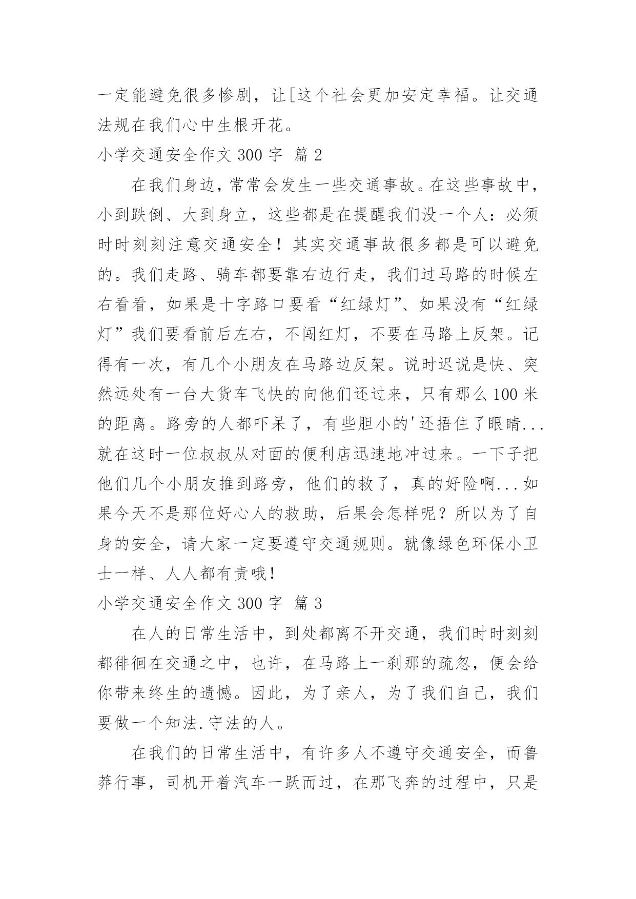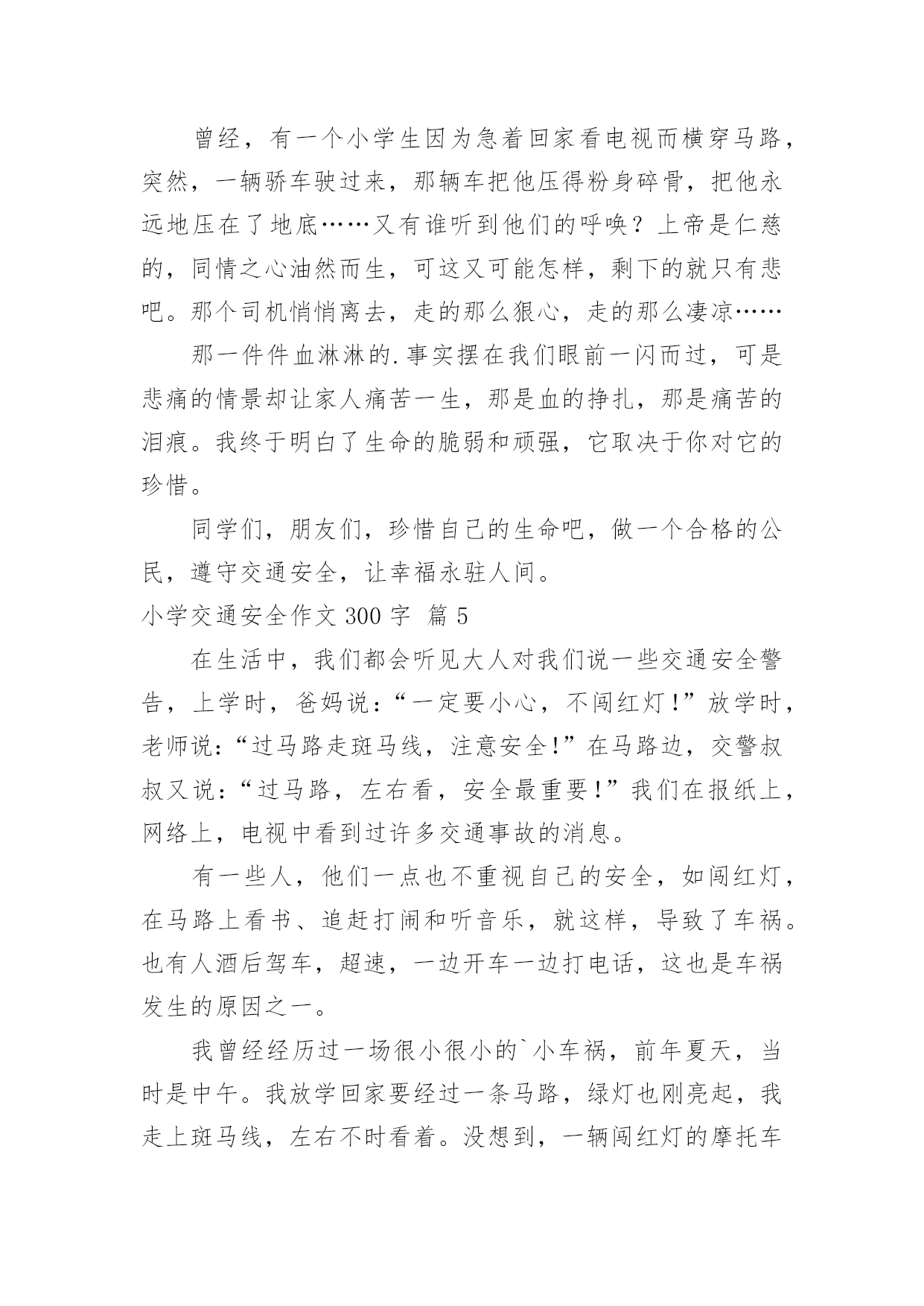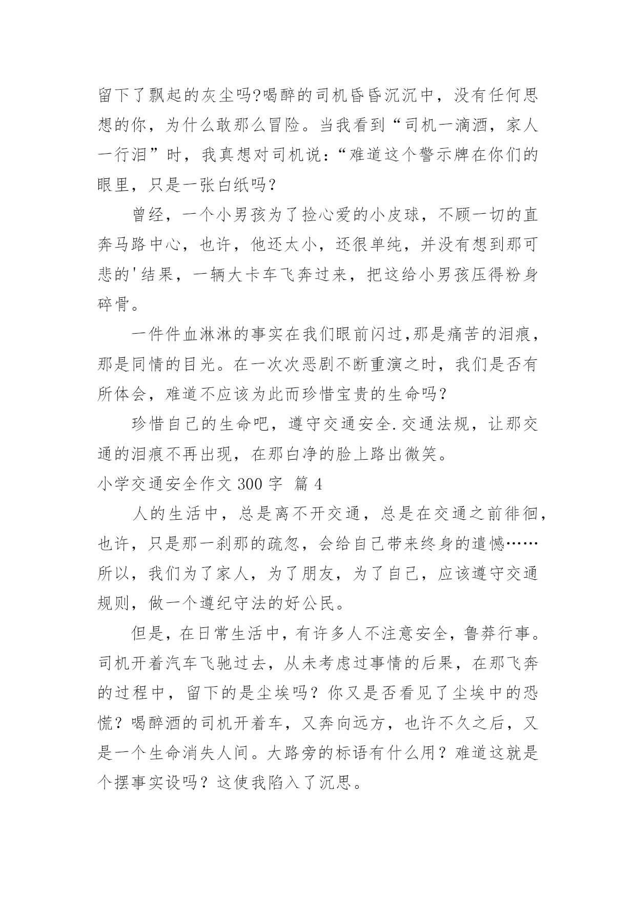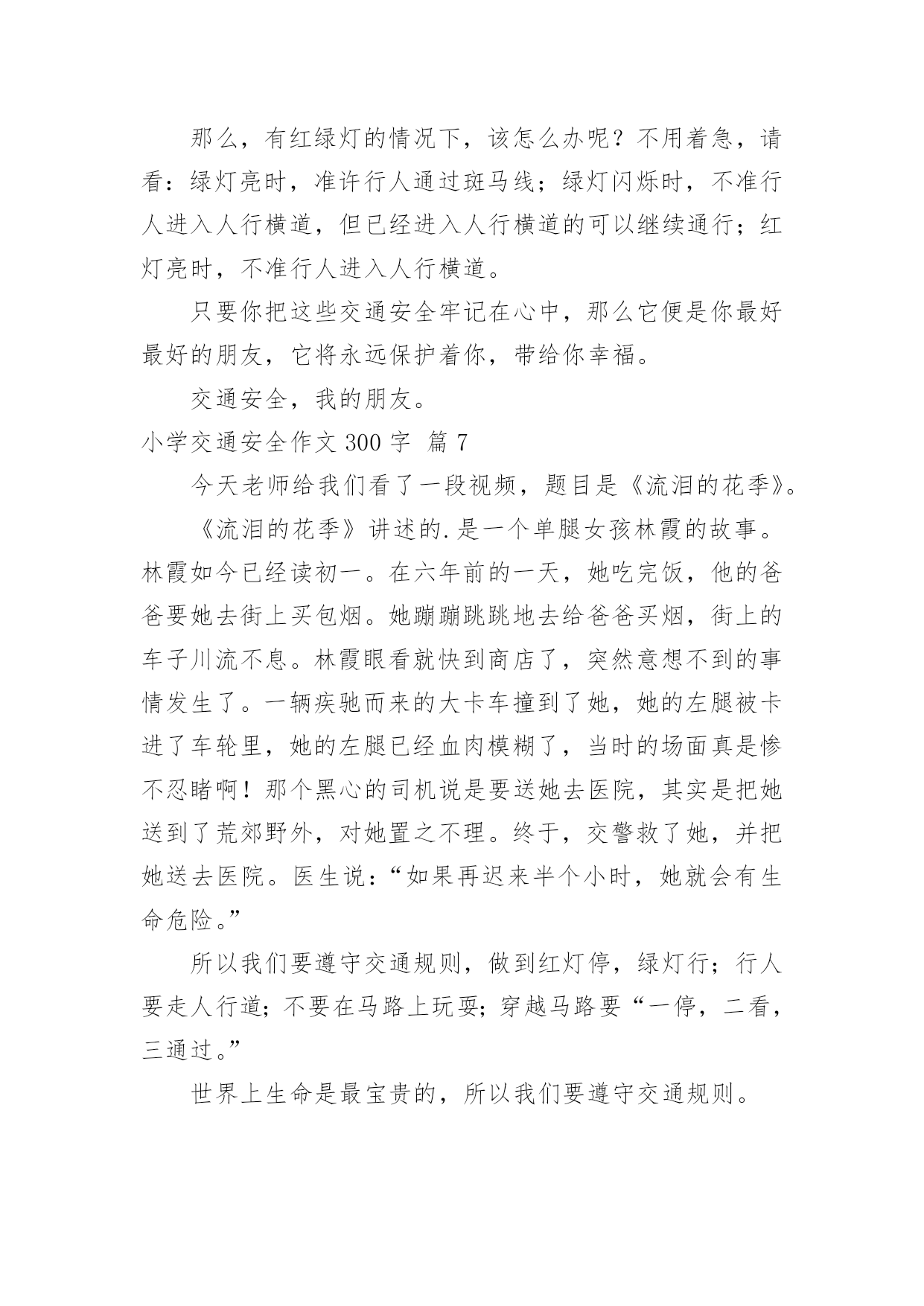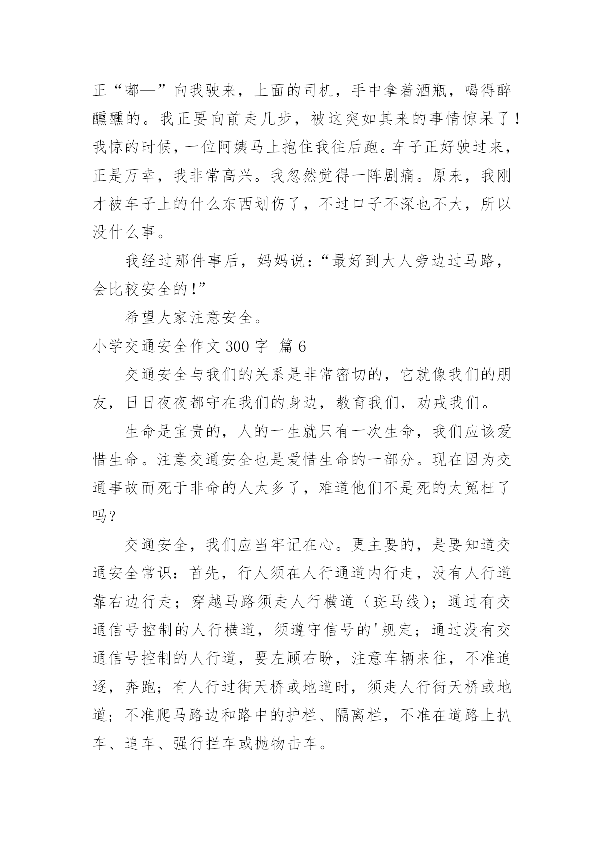 小学交通安全作文300字(优秀)实用的小学交通安全作文300字在平凡的学习、工作、生活中,大家都经常接触到作文吧,借助作文人们可以实现文化交流的目的。相信许多人会觉得作文很难写吧,下面是小编整理的小学交通安全作文300字7篇,欢迎大家借鉴与参考,希望对大家有所帮助。小学交通安全作文300字篇1我们每个人的生命都是唯一的,是宝贵的,我们要懂得珍惜生命。然而有些人却不珍惜生命,而导致死亡。那么朋友你珍惜生命吗?如果你想要生命活得精彩,活得健康,第一步就请你遵守交通规则。有一次,我在电视新闻上看到这样一件事:在热闹的街口,车辆川流不息,一个骑摩托车的人在红灯前想要停下来,但好像又有急事要办,犹豫了一下然后还是快速地冲了过去,不料这时一辆黑色轿车刚好横向驶来,只听见“砰“的一声巨响,连人带摩托车飞出了好几米远,摩托车被撞得粉碎,而这个人当场气绝身亡,殷红的鲜血染红了一地,真是惨不忍睹……交通事故是多么可怕啊!就在那一刹那,一霎时,就有可能一个人的'性命被送掉,再悔都来不及了。在你违规前请仔细想想后果,想想你的家人,朋友,俗语说的好:“生命重于泰山,不要轻于鸿毛。”为了自己,为了家人,请遵守交通规则吧!如果我们每个人心中都有交通规则,我相信一定能避免很多惨剧,让[这个社会更加安定幸福。让交通法规在我们心中生根开花。小学交通安全作文300字篇2在我们身边,常常会发生一些交通事故。在这些事故中,小到跌倒、大到身立,这些都是在提醒我们没一个人:必须时时刻刻注意交通安全!其实交通事故很多都是可以避免的。我们走路、骑车都要靠右边行走,我们过马路的时候左右看看,如果是十字路口要看“红绿灯”、如果没有“红绿灯”我们要看前后左右,不闯红灯,不要在马路上反架。记得有一次,有几个小朋友在马路边反架。说时迟说是快、突然远处有一台大货车飞快的向他们还过来,只有那么100米的距离。路旁的人都吓呆了,有些胆小的'还捂住了眼睛...就在这时一位叔叔从对面的便利店迅速地冲过来。一下子把他们几个小朋友推到路旁,他们的救了,真的好险啊...如果今天不是那位好心人的救助,后果会怎样呢?所以为了自身的安全,请大家一定要遵守交通规则。就像绿色环保小卫士一样、人人都有责哦!小学交通安全作文300字篇3在人的日常生活中,到处都离不开交通,我们时时刻刻都徘徊在交通之中,也许,在马路上一刹那的疏忽,便会给你带来终生的遗憾。因此,为了亲人,为了我们自己,我们要做一个知法.守法的人。在我们的日常生活中,有许多人不遵守交通安全,而鲁莽行事,司机开着汽车一跃而过,在那飞奔的过程中,只是留下了飘起的灰尘吗?喝醉的司机昏昏沉沉中,没有任何思想的你,为什么敢那么冒险。当我看到“司机一滴酒,家人一行泪”时,我真想对司机说:“难道这个警示牌在你们的眼里,只是一张白纸吗?曾经,一个小男孩为了捡心爱的小皮球,不顾一切的直奔马路中心,也许,他还太小,还很单纯,并没有想到那可悲的'结果,一辆大卡车飞奔过来,把这给小男孩压得粉身碎骨。一件件血淋淋的事实在我们眼前闪过,那是痛苦的泪痕,那是同情的目光。在一次次恶剧不断重演之时,我们是否有所体会,难道不应该为此而珍惜宝贵的生命吗?珍惜自己的生命吧,遵守交通安全.交通法规,让那交通的泪痕不再出现,在那白净的脸上路出微笑。小学交通安全作文300字篇4人的生活中,总是离不开交通,总是在交通之前徘徊,也许,只是那一刹那的疏忽,会给自己带来终身的遣憾……所以,我们为了家人,为了朋友,为了自己,应该遵守交通规则,做一个遵纪守法的好公民。但是,在日常生活中,有许多人不注意安全,鲁莽行事。司机开着汽车飞驰过去,从未考虑过事情的后果,在那飞奔的过程中,留下的是尘埃吗?你又是否看见了尘埃中的恐慌?喝醉酒的司机开着车,又奔向远方,也许不久之后,又是一个生命消失人间。大路旁的标语有什么用?难道这就是个摆事实设吗?这使我陷入了沉思。曾经,有一个小学生因为急着回家看电视而横穿马路,突然,一辆骄车驶过来,那辆车把他压得粉身碎骨,把他永远地压在了地底……又有谁听到他们的呼唤?上帝是仁慈的,同情之心油然而生,可这又可能怎样,剩下的就只有悲吧。那个司机悄悄离去,走的那么狠心,走的那么凄凉……那一件件血淋淋的.事实摆在我们眼前一闪而过,可是悲痛的情景却让家人痛苦一生,那是血的挣扎,那是痛苦的泪痕。我终于明白了生命的脆弱和顽强,它取决于你对它的珍惜。同学们,朋友们,珍惜自己的生命吧,做一个合格的公民,遵守交通安全,让幸福永驻人间。小学交通安全作文300字篇5在生活中,我们都会听见大人对我们说一些交通安全警告,上学时,爸妈说:“一定要小心,不闯红灯!”放学时,老师说:“过马路走斑马线,注意安全!”在马路边,交警叔叔又说:“过马路,左右看,安全最重要!”我们在报纸上,网络上,电视中看到过许多交通事故的消息。
