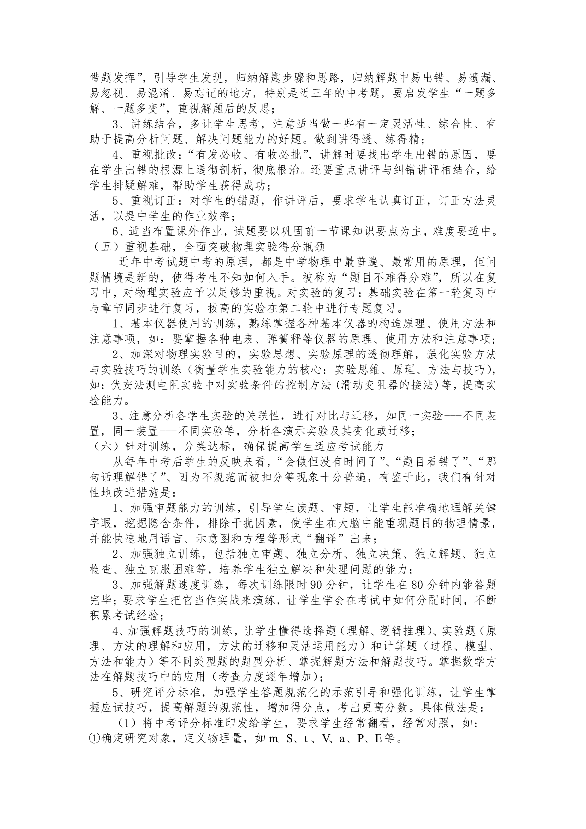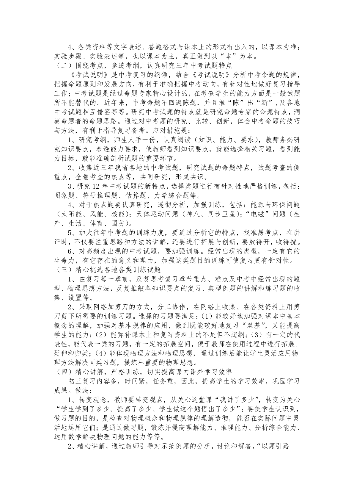 中考物理复习计划一、指导思想1、针对性——重视对考情(考纲、考题)和学情的分析研究。2、科学性——明确任务,高效备考,寻找一条离成功最近的路。二、复习进度初三物理总复习分为三个阶段阶段时间模式主要内容至2013主要针对各单元知识点及相关知识点进以章、节为单元进行第一阶段年4月行分析、归纳,复习的重点在基本概念单元复习训练中旬及其相互关系、基本规律及其应用主要针对物理学中的几个分支(力学、电至2013按知识块(力学、电磁磁学、热学)进行小综合复习,复习的重第二阶段年5月学、物理实验、热学)点是在本知识块内进行基本概念及其相中旬进行小综合复习训练互关系的分析与理解,基本规律在小综合内的运用(包括物理实验拔高)主要针对物理学科各个知识点间和理、至2013进行大综合(包括理化、生各学科之间知识点进行大组合复第三阶段年6月科综合和学科内综习训练,复习的重点是进行重要概念及中旬合)复习训练相互关系的辨析、重要规律的应用三、复习策略加强对考试说明、中考试题的研究强化三轮复习,向细节要质量始终坚持1、对学科重点的强化训练;2、对题目的归类讲解和对学生的分层次指导;3、讲练结合的基本复习模式;4、良好解题习惯的培养与科学应试指导四、具体措施(一)紧抓课本,细挖教材,扎实推进基础知识复习工作中考立足课本考基础,于变化中考能力。中考试题源于课本,不拘泥于课本,中考卷中的大多数试题都可以从课本上的例题、习题、总复习题中找到它们的“影子”,甚至课本中的插图、阅读材料等都可成为中考命题的素材;文字表述、规范答题都可以课本为参照。1、在复习中应立足基础知识,通过透彻理解,全面掌握基础知识,如对物理概念的理解,应该让学生从定义式及变形式、物理意义、单位及相关性等方面进行讨论;对定理或定律的理解,则应引导学生从其实验基础、基本内容、公式形式、物理实质、适用条件等作全面的分析。2、复习时引导学生回归教材,要抓住重点,帮助学生了解知识间的纵横联系,构建初中物理基础知识网络,形成完整的知识体系,使知识系统化、网络化。3、以课本的习题背景、插图和阅读材料为素材,深入浅出、举一反三地加以推敲、延伸或适当变形形成典型例题,应用中、低档试题进行训练,花大力气吃透课本上那些有特色、概念性强、构思新颖和方法灵活的习题。(切忌偏题、难题和怪题;切忌只盯课外题;切忌“眼高手低”)4、各类资料等文字表述、答题格式与课本上的形式有出入的,以课本为准;实验步骤、实验表述等,也以课本为主,真正做到以“本”为本。(二)围绕考点,参透考纲,认真研究三年中考试题特点《考试说明》是中考复习的纲领,结合《考试说明》分析中考命题的规律,把握命题原则和发展方向,有利于准确把握中考动向,有针对性地做好复习指导工作;中考试题是经过命题专家精心设计的,在考查学生的能力方面是一般试题所不能替代的。近年来,中考命题不回避陈题,并且推“陈”出“新”,及各地中考试题相互借鉴等等。研究中考试题的特点就是研究命题专家的命题特点,洞察命题者的命题思路。通过对中考题的研究、比较、创新,体会中考命题的技巧与方法,有利于指导复习备考。应对措施是:1、研究考纲,师生人手一份,认真阅读(知识、能力、要求),教师务必研究知识要点,参透能力要求,使教师看到知识要点,就能选择相关习题,看到能力目标,就能准确剖析试题的重要环节。2、收集近三年我省各地的中考试题,研究试题的命题特点,试题考查的侧重点,全卷考查的热点等,共同研究,形成共识。3、研究12年中考试题的新特点,选择类题进行有针对性地严格训练,包括:图象题、符号推理题、估算题、力学综合题等。4、对于热点题要认真研究,透彻分析,加强训练,包括:能源与环保问题(太阳能、风能、核能);天体运动问题(神八、同步卫星);“电磁”问题(生产、生活、体育、国防)。5、加大往年中考题的训练力度,要通过分析它的特点,找准易考点,在讲评时,不仅要注重思路和方法的讲解,还要进行拓展与创新,要放得开,收得拢。6、对高频度出现的中考试题,要加强训练。经常出现的类型,一定有它的生命力,有它存在的意义和理由,加强这类题目的训练可使复习更有针对性。(三)精心挑选各地各类训练试题1、在复习每一章前,反复思考复习章节重点、难点及中考中经常出现的题型、物理思想方法,反复推敲各知识要点的复习、典型例题的讲解和练习题的收集、设置等。2、采取网络加剪刀的方式,分工协作,在网络上收集、在各类资料上用剪刀剪下所需要的训练习题。选择的习题要满足:(1)能较好地加强对课本中基本概念的理解,加强对基本规律的应用,做到既能较好地复习“双基”,又能提高学生的能力;(2)能弥补课本