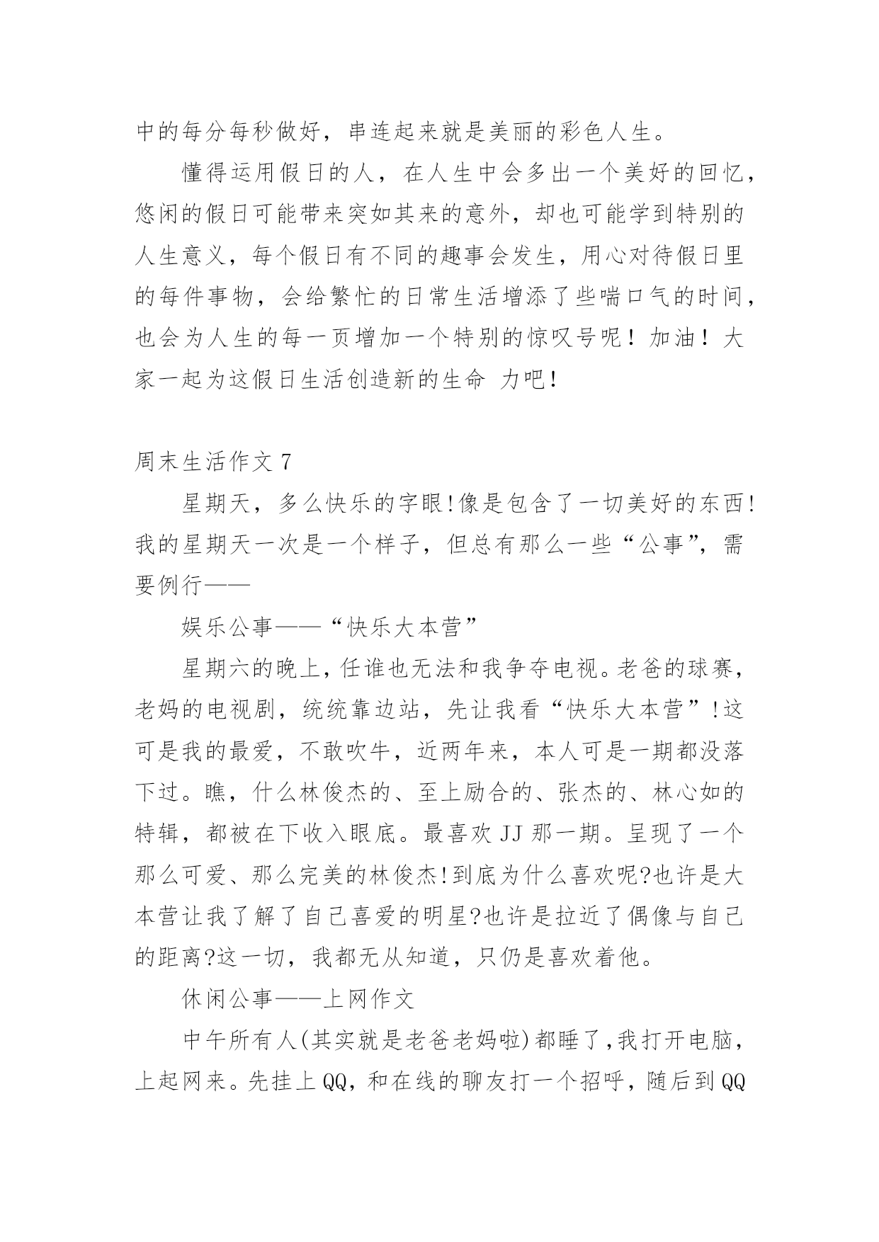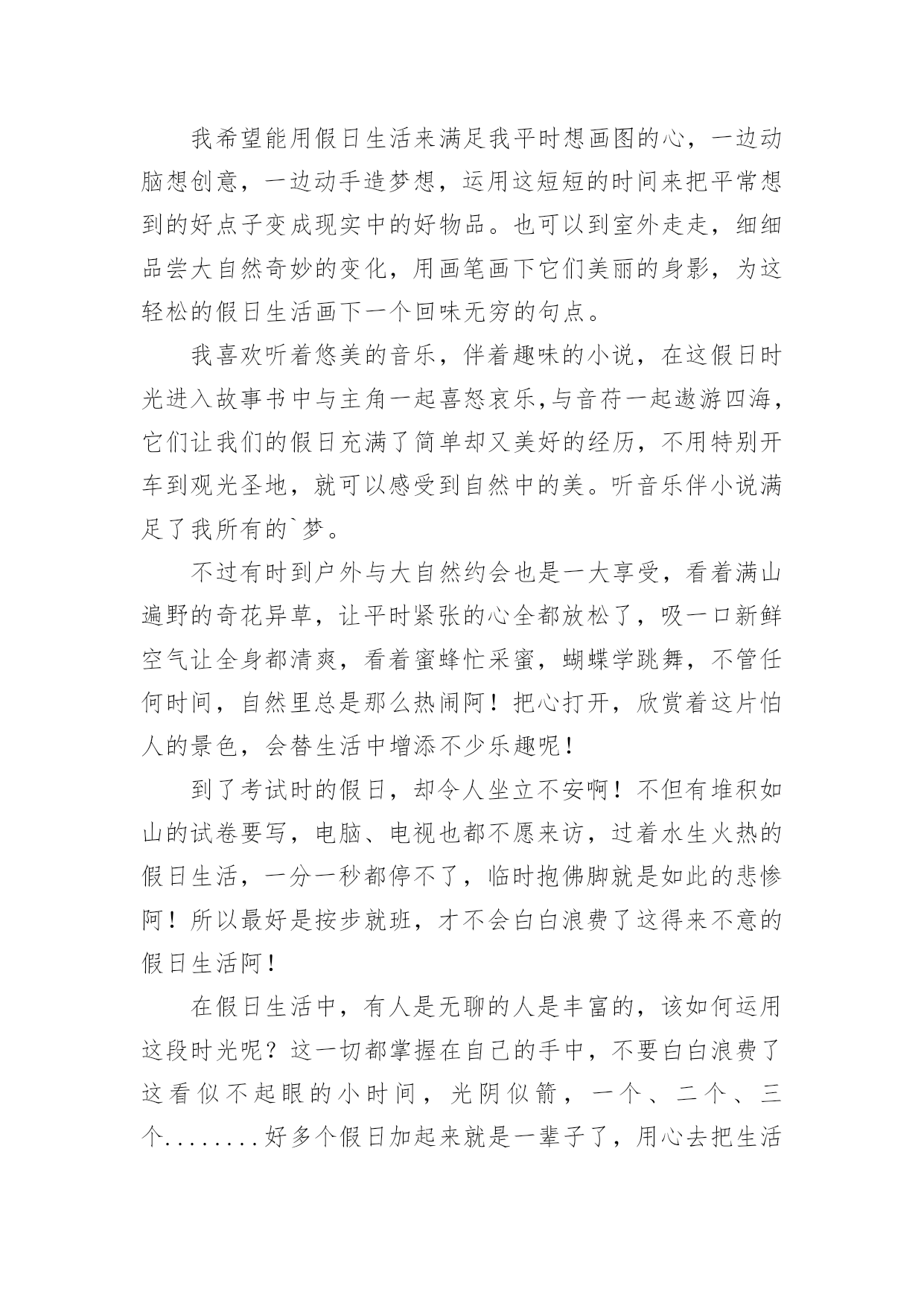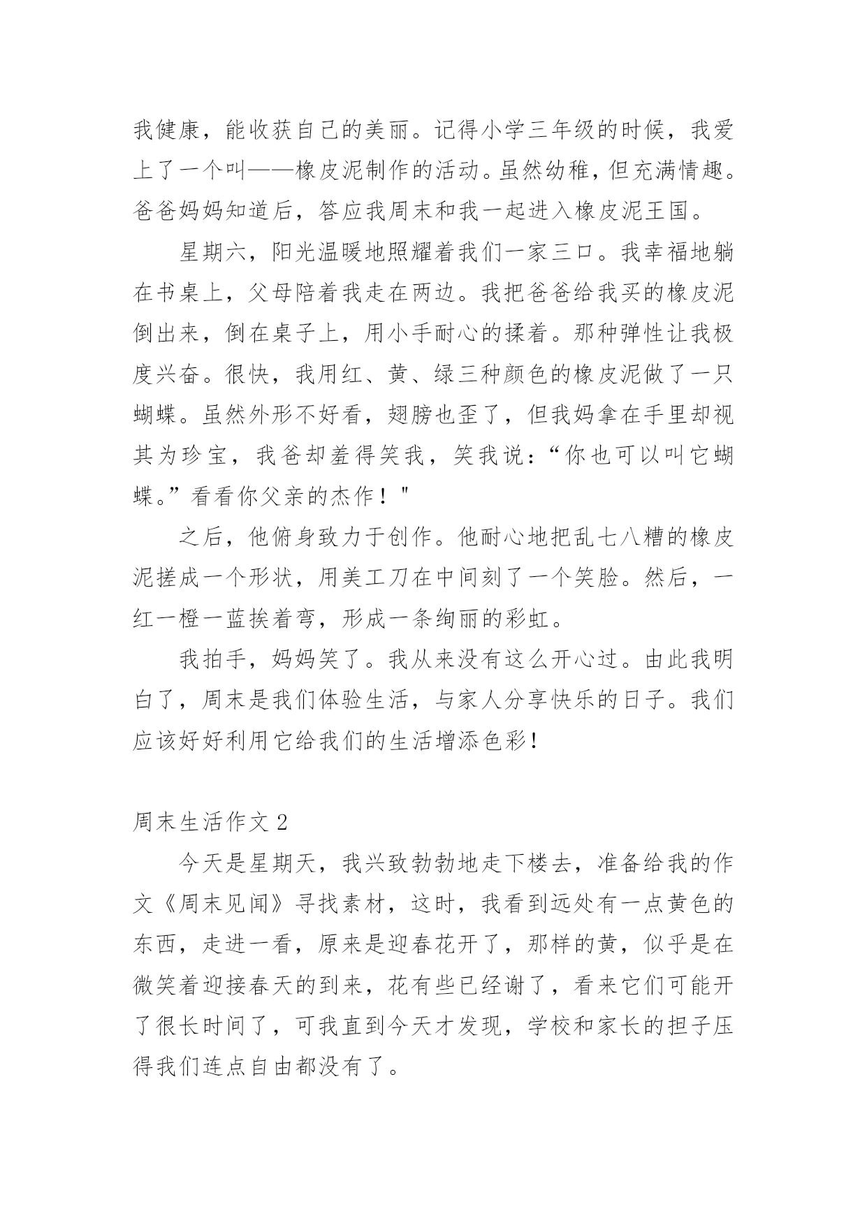 周末生活作文在平平淡淡的日常中,大家都跟作文打过交道吧,作文是由文字组成,经过人的思想考虑,通过语言组织来表达一个主题意义的文体。怎么写作文才能避免踩雷呢?下面是小编为大家整理的周末生活作文,欢迎大家借鉴与参考,希望对大家有所帮助。周末生活作文1不知不觉中,一周五天的学习时间又过去了,我终于迎来了一个属于自己的不一样的周末。我相信只要你是个孩子,没有人不喜欢周末的时光。和很多同学一样,一周中我最讨厌的一天叫周一,最喜欢的两天是周六和周日。每次来这两天,心情都忍不住变得开朗舒服。平日压在心里的巨石,在周六周日的反复打击下也不复存在。这就像一个一直在我脑海里生长的叫做“压力”的肿瘤。突然有一天,它神奇地消失了,这意味着我再也不用被它迫害了。那种喜悦和激动是无法言表的。在我小小的`心里,周末有这样的魔力,它是上帝创造的独一无二的天使,可以消除千千万万学生心中的一切烦恼,让我们获得一片属于自己的自由蓝天。我一直很庆幸自己出生在一个开明的家庭,有一对通情达理的父母。他们不爱我的成就,只关心我的成长,只希望我健康,能收获自己的美丽。记得小学三年级的时候,我爱上了一个叫——橡皮泥制作的活动。虽然幼稚,但充满情趣。爸爸妈妈知道后,答应我周末和我一起进入橡皮泥王国。星期六,阳光温暖地照耀着我们一家三口。我幸福地躺在书桌上,父母陪着我走在两边。我把爸爸给我买的橡皮泥倒出来,倒在桌子上,用小手耐心的揉着。那种弹性让我极度兴奋。很快,我用红、黄、绿三种颜色的橡皮泥做了一只蝴蝶。虽然外形不好看,翅膀也歪了,但我妈拿在手里却视其为珍宝,我爸却羞得笑我,笑我说:“你也可以叫它蝴蝶。”看看你父亲的杰作!"之后,他俯身致力于创作。他耐心地把乱七八糟的橡皮泥搓成一个形状,用美工刀在中间刻了一个笑脸。然后,一红一橙一蓝挨着弯,形成一条绚丽的彩虹。我拍手,妈妈笑了。我从来没有这么开心过。由此我明白了,周末是我们体验生活,与家人分享快乐的日子。我们应该好好利用它给我们的生活增添色彩!周末生活作文2今天是星期天,我兴致勃勃地走下楼去,准备给我的作文《周末见闻》寻找素材,这时,我看到远处有一点黄色的东西,走进一看,原来是迎春花开了,那样的黄,似乎是在微笑着迎接春天的到来,花有些已经谢了,看来它们可能开了很长时间了,可我直到今天才发现,学校和家长的担子压得我们连点自由都没有了。这时,我看见了一枝花儿开得似乎比其他的小一点,我走了过去,才发现这枝花儿被夹在石缝中了,怪不得比别的花开的小,但是他却比别的花儿坚强,他的种子不是落在了肥沃的土地,而是落在了石缝之间,如果开在土地上,他的花朵一定最大。这枝花儿有多么顽强的生命力呀,他虽开在了石头之间,但却从不抱怨,依然默默地开花,凋谢,这就是他的一生呀,是这样的短暂,可他却用在了默默的'奉献上!这不正像生活中的人么,像清洁工,像老师……,想到这里,我立刻跑回家去写我的作文。人们常说:“生命在于运动”,今天清晨,空气非常新鲜,有淡淡的一股新鲜的香气,沁人心脾。我和爸爸穿过马路,一起来到了我家对面的百花公园。公园里好多人都在晨练,有白发苍苍的老人,有身强体壮的年轻人,还有活泼可爱的小朋友。他们有的在舞扇子,有的在打太极拳,有的在拉空竹,还有的像在百米赛跑……看到这情景,我也情不自禁的加入到晨跑的队伍中,一路上又遇到许多锻炼的人,有的跟着音乐,成群结队的做早操;有的几个人围在一块,互相踢毽子给其他人;有的站在花坛边压腿,扭腰,活动手脚;有的也和我们一样,从我们对面或身后会跑来或跑过几个人。已经跑了路程的一半,我的额头上冒出了汗珠,脚步放慢了。这时,一位叔叔从后面追了上来,和爸爸热情地打招呼,原来是爸爸的同学。叔叔看看我:“这孩子真棒!”听了叔叔的夸奖,我跑的更快了,不一会儿,就到了终点。走在回家的路上,我心里暗下决心:今后我一定会多锻炼身体。周末生活作文3Weekendstopeoplemeanthattheycanhaveatwo-daygoodrest.Forexample,peoplecangoouttoenjoythemselvesorgettogetherwithrelativesandfriendstotalkwitheachotherorwatchinterestingvideotapeswiththewholefamily.Everyonespendsweekendsinhisownway.Withintwodays,somepeoplecanrelaxthemselvesbylisteningtomusic,readingnovels,orwatchingfilms.Othersperhapsaremoreactivebyplayingbasketball,wimmingordancing.Differentpeopl