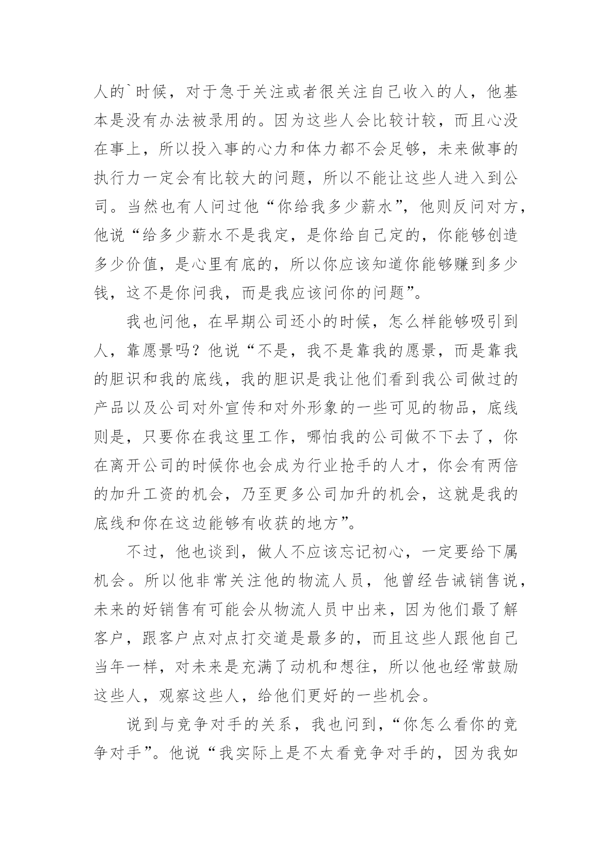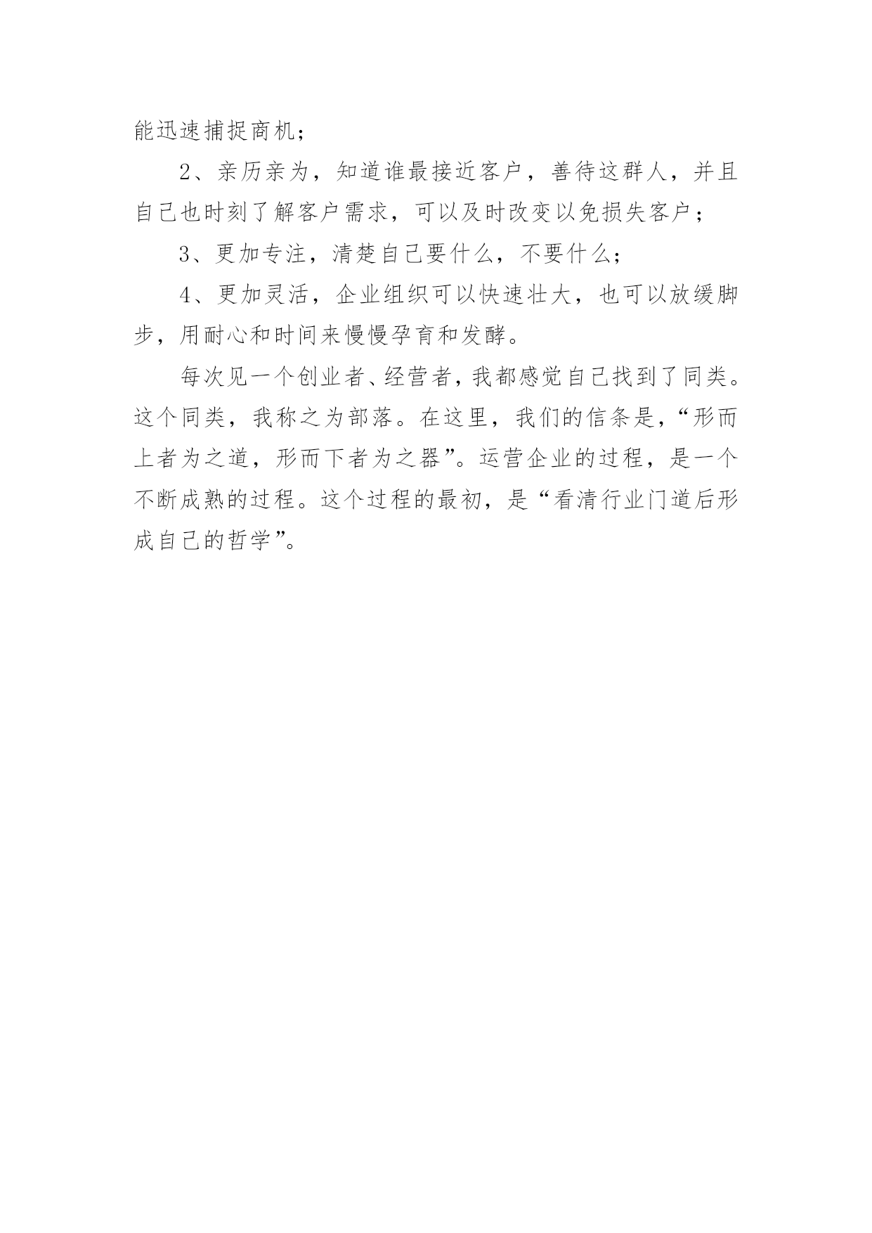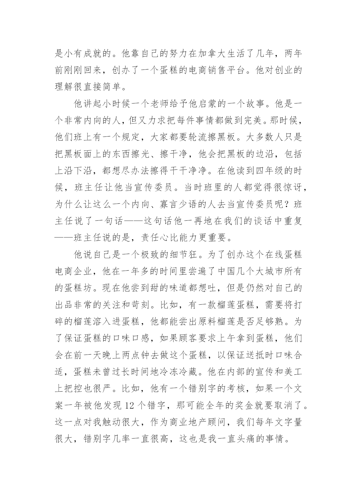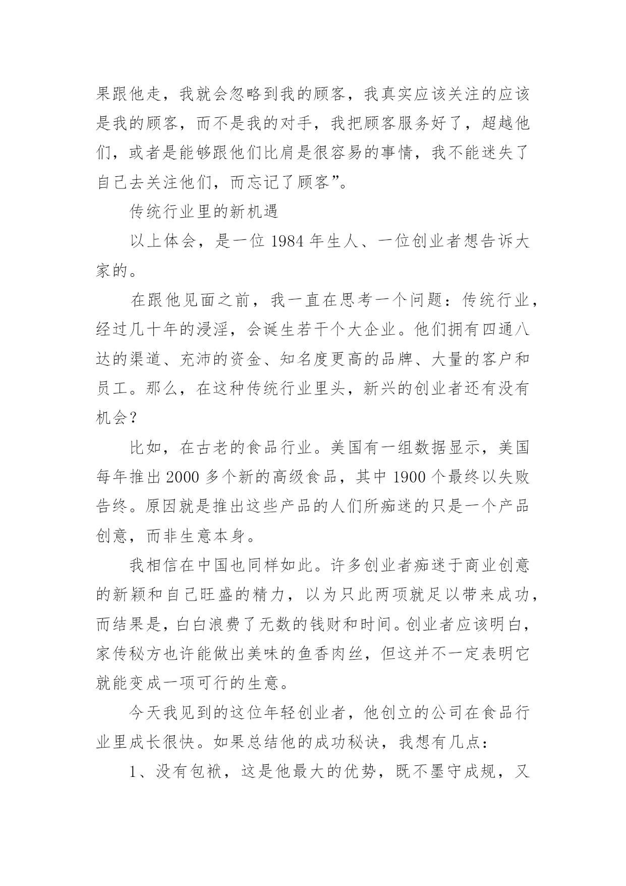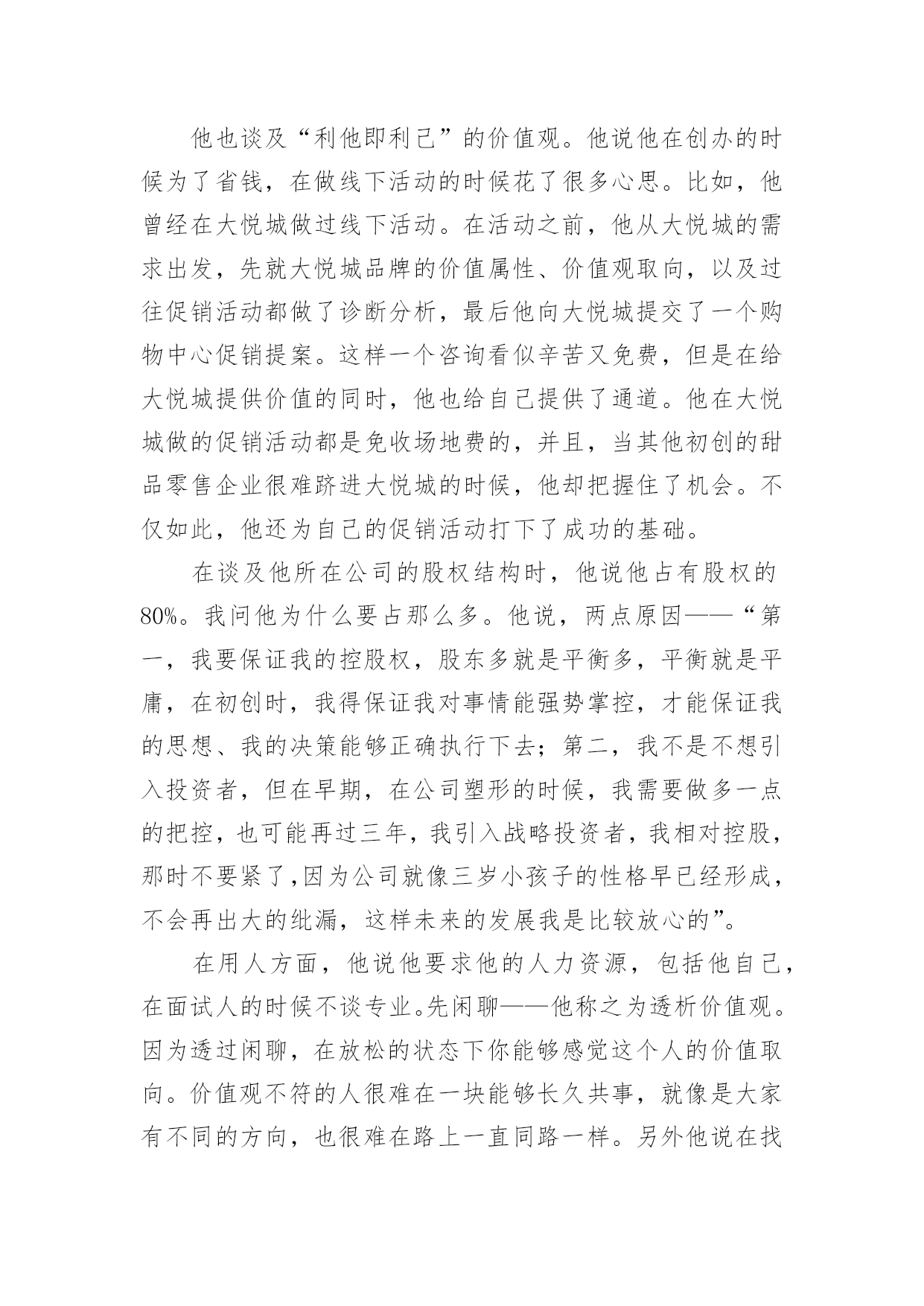 新科技革命下的创业新科技革命下的创业去年,电商的冲击力被媒体放大之后,实体商业充满了无处不在的高压氛围。新技术革命带来的各行业的新商业变革,依凭新技术、新商业模式,创业者像野草一样,稍有缝隙便能发展、壮大,挣出一片天地。但因为整个时代变得太快,你刚刚舒一口气,却一不小心像诺基亚一样,“并没有做错什么,但不知为什么输了”。人人都说电商很可怕很厉害。但它到底可怕和厉害在哪里?它的命门在哪里?这方面的报告,模棱两可。一个创业者的自白这是我过去一年见到的众多创业者中的一位。他年龄很小,只有30岁,创办了一家很火的在线甜品电商企业。刚刚见到他,我感到非常意外。他那么年轻,经历却很丰富。他来自福建的一个小地方,家里很穷,他是家里的老大,从小要照顾弟弟妹妹,所以他早早就开始打工。他在高中的时候就在街头卖过报纸,上大学的时候勤工俭学,在王府井大街铺过地砖,做过劳工,还做过很多看起来卑微的工作。因为这些经历,让他的谈话透出很多力量。他说,正是出身穷苦,他对未来弃满了动机。在做一件事的时候,像他这样的人才能全新地投入,愿意把它做到极致,并且因此对很多事敏感,对事物敏感,他才能发现它的机会。在此之前,他已经有过三次创业的经历,其中有两次是小有成就的。他靠自己的努力在加拿大生活了几年,两年前刚刚回来,创办了一个蛋糕的电商销售平台。他对创业的理解很直接简单。他讲起小时候一个老师给予他启蒙的一个故事。他是一个非常内向的人,但又力求把每件事情都做到完美。那时候,他们班上有一个规定,大家都要轮流擦黑板。大多数人只是把黑板面上的东西擦光、擦干净,他会把黑板的边沿,包括上沿下沿,都想尽办法擦得干干净净。在他读到四年级的时候,班主任让他当宣传委员。当时班里的人都觉得很惊讶,为什么让这么一个内向、寡言少语的人去当宣传委员呢?班主任说了一句话——这句话他一再地在我们的谈话中重复——班主任说的是,责任心比能力更重要。他说自己是一个极致的细节狂。为了创办这个在线蛋糕电商企业,他在一年多的时间里尝遍了中国几个大城市所有的蛋糕坊。现在他尝到甜的味道都想吐,但是仍然对自己的出品非常的关注和苛刻。比如,有一款榴莲蛋糕,需要将打碎的榴莲溶入进蛋糕,他都能尝出原料榴莲是否足够熟。为了保证蛋糕的口味口感,如果顾客要求上午拿到蛋糕,他们会在前一天晚上两点钟去做这个蛋糕,以保证送抵时口味合适,蛋糕未曾过长时间地冷冻冷藏。他在内部的宣传和美工上把控也很严。比如,他有一个错别字的考核,如果一个文案一年被他发现12个错字,那可能全年的奖金就要取消了。这一点对我触动很大,作为商业地产顾问,我们每年文字量很大,错别字几率一直很高,这也是我一直头痛的事情。他也谈及“利他即利己”的价值观。他说他在创办的时候为了省钱,在做线下活动的时候花了很多心思。比如,他曾经在大悦城做过线下活动。在活动之前,他从大悦城的需求出发,先就大悦城品牌的价值属性、价值观取向,以及过往促销活动都做了诊断分析,最后他向大悦城提交了一个购物中心促销提案。这样一个咨询看似辛苦又免费,但是在给大悦城提供价值的同时,他也给自己提供了通道。他在大悦城做的促销活动都是免收场地费的,并且,当其他初创的甜品零售企业很难跻进大悦城的时候,他却把握住了机会。不仅如此,他还为自己的促销活动打下了成功的基础。在谈及他所在公司的股权结构时,他说他占有股权的80%。我问他为什么要占那么多。他说,两点原因——“第一,我要保证我的控股权,股东多就是平衡多,平衡就是平庸,在初创时,我得保证我对事情能强势掌控,才能保证我的思想、我的决策能够正确执行下去;第二,我不是不想引入投资者,但在早期,在公司塑形的时候,我需要做多一点的把控,也可能再过三年,我引入战略投资者,我相对控股,那时不要紧了,因为公司就像三岁小孩子的性格早已经形成,不会再出大的纰漏,这样未来的发展我是比较放心的”。在用人方面,他说他要求他的人力资源,包括他自己,在面试人的时候不谈专业。先闲聊——他称之为透析价值观。因为透过闲聊,在放松的状态下你能够感觉这个人的价值取向。价值观不符的人很难在一块能够长久共事,就像是大家有不同的方向,也很难在路上一直同路一样。另外他说在找人的`时候,对于急于关注或者很关注自己收入的人,他基本是没有办法被录用的。因为这些人会比较计较,而且心没在事上,所以投入事的心力和体力都不会足够,未来做事的执行力一定会有比较大的问题,所以不能让这些人进入到公司。当然也有人问过他“你给我多少薪水”,他则反问对方,他说“给多少薪水不是我定,是你给自己定的,你能够创造多少价值,是心里有底的,所以你应该知道你能够赚到多少钱,这不是你问我,而是我应该问你的问题”。我也问他,在早期公司还小的时候,怎么样能够吸引到人,靠愿景吗?他说“不是,我不是靠我的愿景,而是靠我的胆识和我的底线,我的胆识是我让他