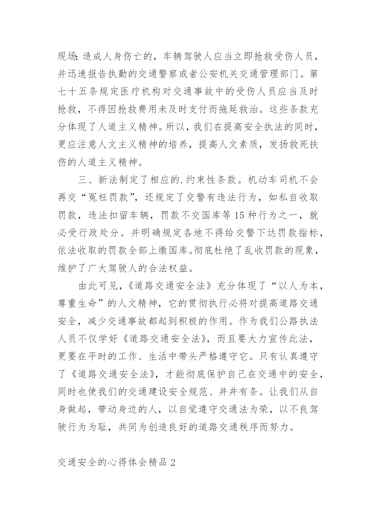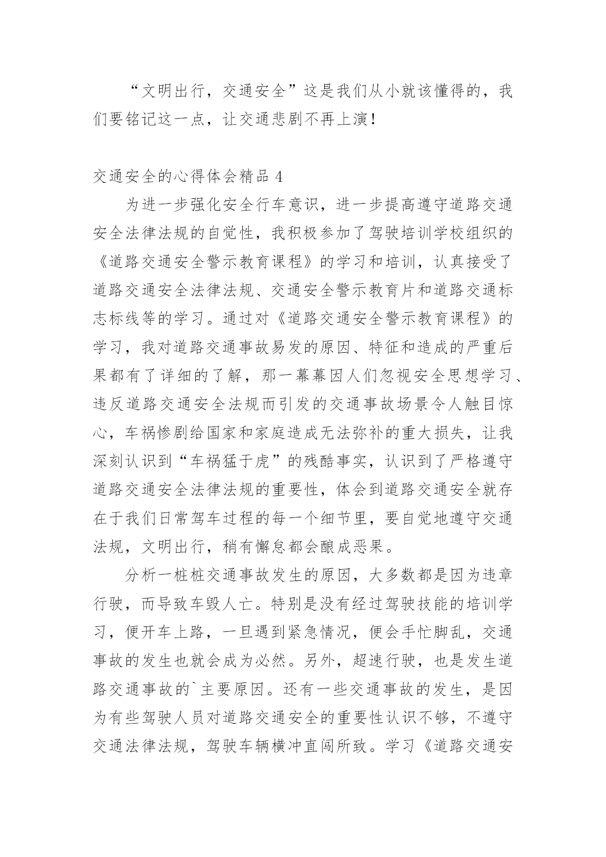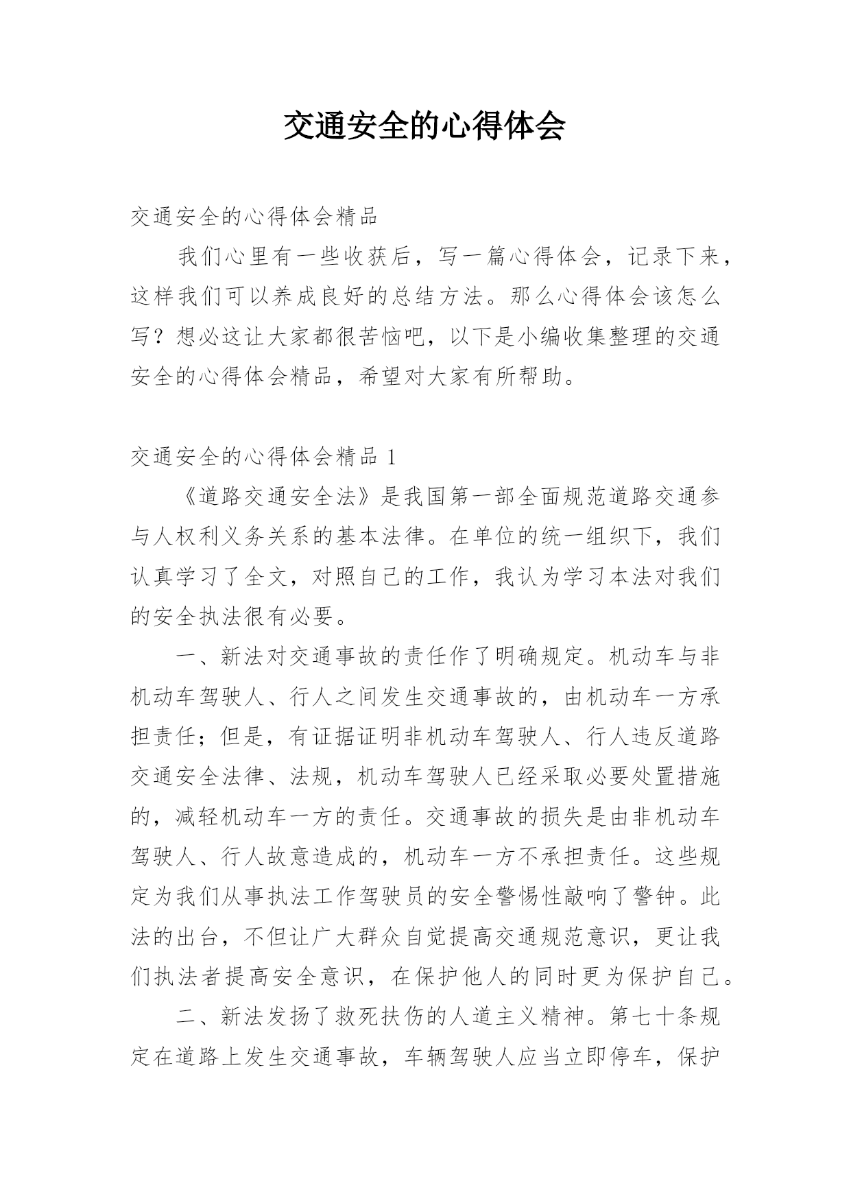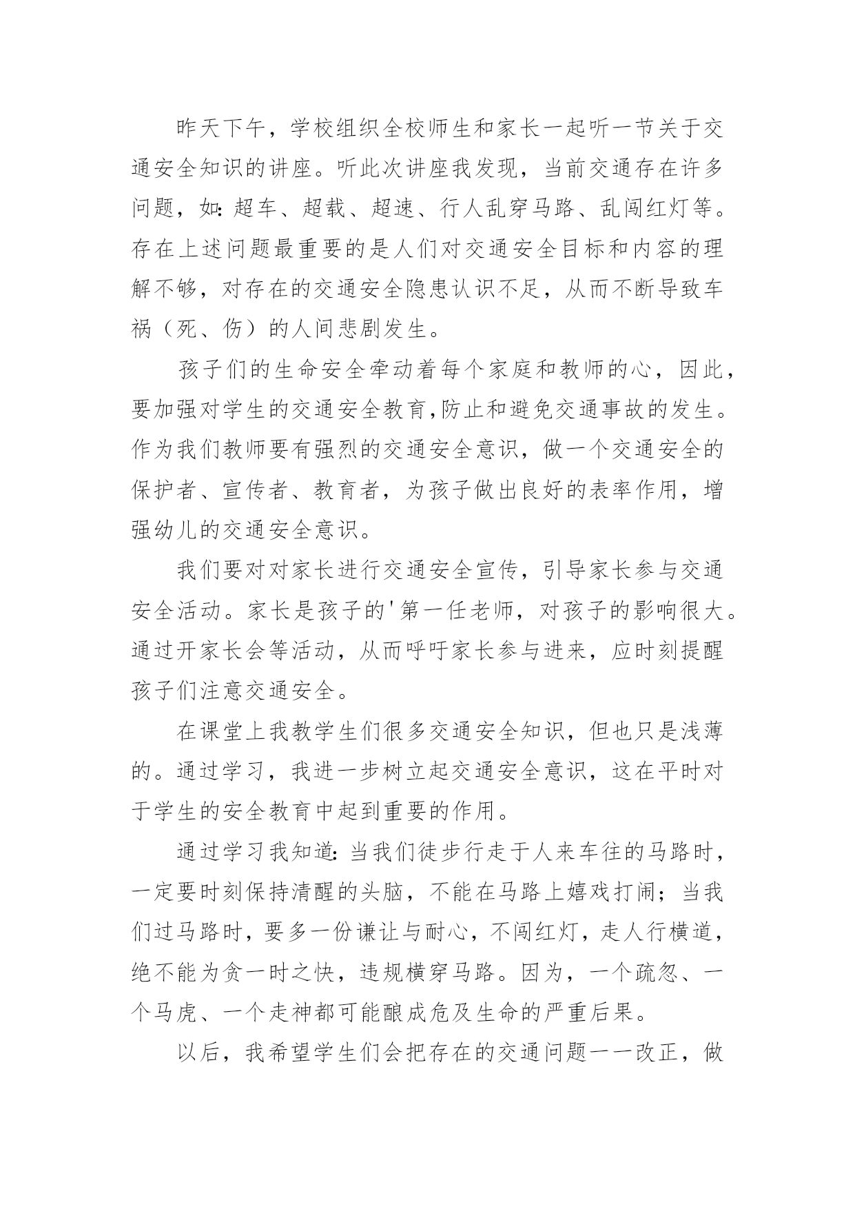 交通安全的心得体会交通安全的心得体会精品我们心里有一些收获后,写一篇心得体会,记录下来,这样我们可以养成良好的总结方法。那么心得体会该怎么写?想必这让大家都很苦恼吧,以下是小编收集整理的交通安全的心得体会精品,希望对大家有所帮助。交通安全的心得体会精品1《道路交通安全法》是我国第一部全面规范道路交通参与人权利义务关系的基本法律。在单位的统一组织下,我们认真学习了全文,对照自己的工作,我认为学习本法对我们的安全执法很有必要。一、新法对交通事故的责任作了明确规定。机动车与非机动车驾驶人、行人之间发生交通事故的,由机动车一方承担责任;但是,有证据证明非机动车驾驶人、行人违反道路交通安全法律、法规,机动车驾驶人已经采取必要处置措施的,减轻机动车一方的责任。交通事故的损失是由非机动车驾驶人、行人故意造成的,机动车一方不承担责任。这些规定为我们从事执法工作驾驶员的安全警惕性敲响了警钟。此法的出台,不但让广大群众自觉提高交通规范意识,更让我们执法者提高安全意识,在保护他人的同时更为保护自己。二、新法发扬了救死扶伤的人道主义精神。第七十条规定在道路上发生交通事故,车辆驾驶人应当立即停车,保护现场;造成人身伤亡的,车辆驾驶人应当立即抢救受伤人员,并迅速报告执勤的交通警察或者公安机关交通管理部门。第七十五条规定医疗机构对交通事故中的受伤人员应当及时抢救,不得因抢救费用未及时支付而拖延救治。这些条款充分体现了人道主义精神。所以,我们在提高安全执法的同时,更应注意人文主义精神的培养,提高人文素质,发扬救死扶伤的人道主义精神。三、新法制定了相应的.约束性条款。机动车司机不会再交“冤枉罚款”,还规定了交警有违法行为,如私自收取罚款,违法扣留车辆,罚款不交国库等15种行为之一,就必受行政处分。并明确规定各地不得给交警下达罚款指标,依法收取的罚款全部上缴国库。彻底杜绝了乱收罚款的现象,维护了广大驾驶人的合法权益。由此可见,《道路交通安全法》充分体现了“以人为本,尊重生命”的人文精神,它的贯彻执行必将对提高道路交通安全,减少交通事故都起到积极的作用。作为我们公路执法人员不仅学好《道路交通安全法》,而且要大力宣传此法,更要在平时的工作、生活中带头严格遵守它。只有认真遵守了《道路交通安全法》,才能彻底保护自己在交通中的安全,同时也使我们的交通建设安全规范、井井有条。让我们从自身做起,带动身边的人,以自觉遵守交通法为荣,以不良驾驶行为为耻,共同为创造良好的道路交通秩序而努力。交通安全的心得体会精品2昨天下午,学校组织全校师生和家长一起听一节关于交通安全知识的讲座。听此次讲座我发现,当前交通存在许多问题,如:超车、超载、超速、行人乱穿马路、乱闯红灯等。存在上述问题最重要的是人们对交通安全目标和内容的理解不够,对存在的交通安全隐患认识不足,从而不断导致车祸(死、伤)的人间悲剧发生。孩子们的生命安全牵动着每个家庭和教师的心,因此,要加强对学生的交通安全教育,防止和避免交通事故的发生。作为我们教师要有强烈的交通安全意识,做一个交通安全的保护者、宣传者、教育者,为孩子做出良好的表率作用,增强幼儿的交通安全意识。我们要对对家长进行交通安全宣传,引导家长参与交通安全活动。家长是孩子的'第一任老师,对孩子的影响很大。通过开家长会等活动,从而呼吁家长参与进来,应时刻提醒孩子们注意交通安全。在课堂上我教学生们很多交通安全知识,但也只是浅薄的。通过学习,我进一步树立起交通安全意识,这在平时对于学生的安全教育中起到重要的作用。通过学习我知道:当我们徒步行走于人来车往的马路时,一定要时刻保持清醒的头脑,不能在马路上嬉戏打闹;当我们过马路时,要多一份谦让与耐心,不闯红灯,走人行横道,绝不能为贪一时之快,违规横穿马路。因为,一个疏忽、一个马虎、一个走神都可能酿成危及生命的严重后果。以后,我希望学生们会把存在的交通问题一一改正,做一个遵守交通规则的好学生。让爸爸妈妈放心,让老师安心。交通安全的心得体会精品3这个星期星期二下午,在我们学校举行了一场讲演比赛——“文明出行,交通安全”。在演讲结束后,走出报告厅,我不禁心潮腾涌:是啊!中国现在正向汽车行业发展,很多家庭都有了小轿车,马路上开着“宝马”“奔驰”,这是好事。但是,我国每五分钟都有一个交通事故,每一分钟都有一个人被压死在车轮下,中国交通事故数量居全世界之首!多么惊人的数字啊!这到底是为什么呢?我认为,我国人口实在是太多了,因此很难管理,是导致了交通事故的人数不断上升的重要原因。还有,房子造的多,可是马路的建设却滞后,马路上甚至有些没有红绿灯,护栏杆。农村就更不要说了,一眼望去,很多都是坑坑洼洼的乡间小路,多几辆车,多几个人,行使就会很困难,你推我攘,很容易发生事故。还有一个管理的问题,比如说有些学校门口经常会有大型车辆过往,学生的.安全就得