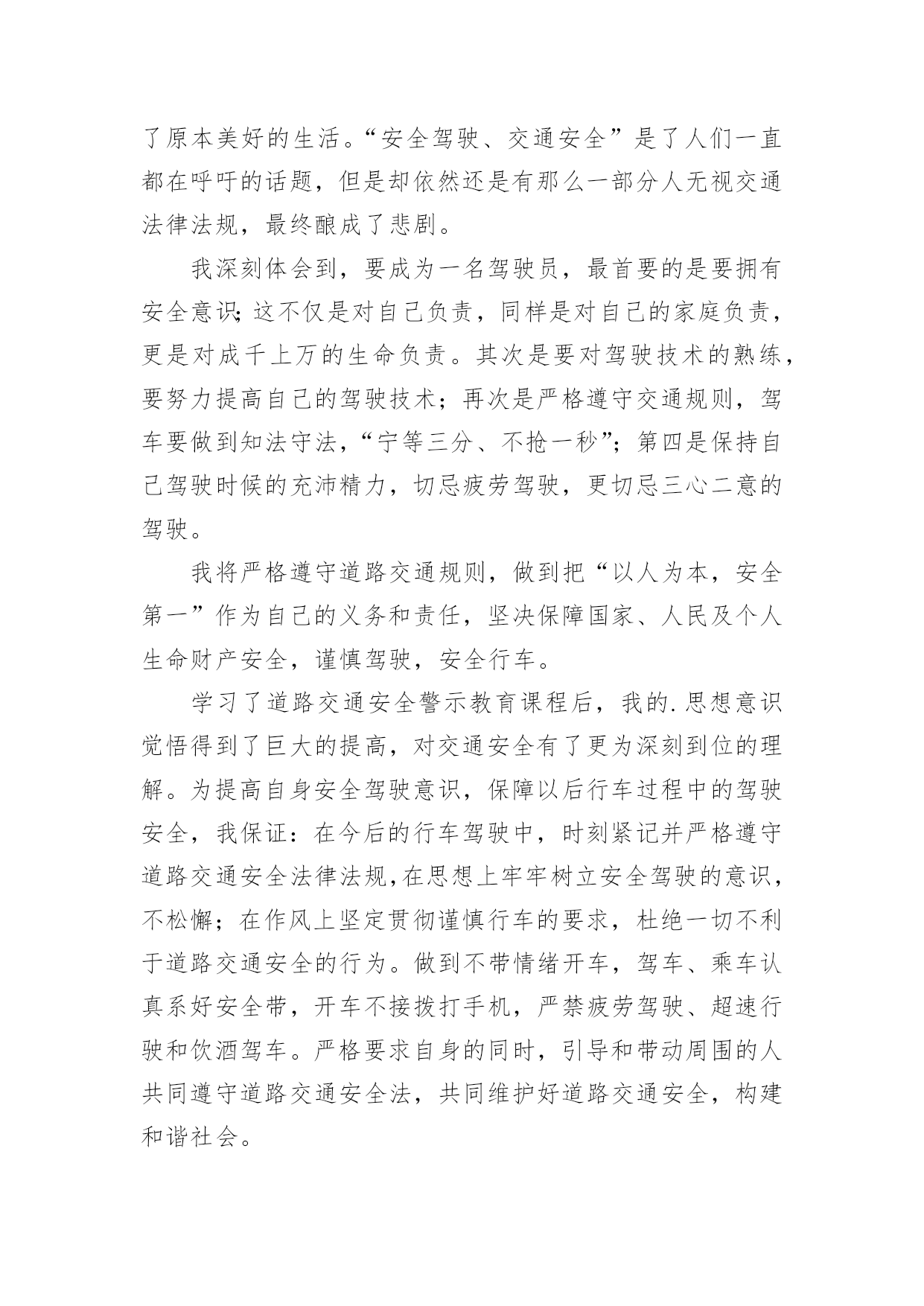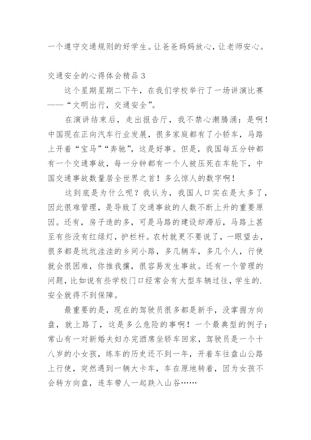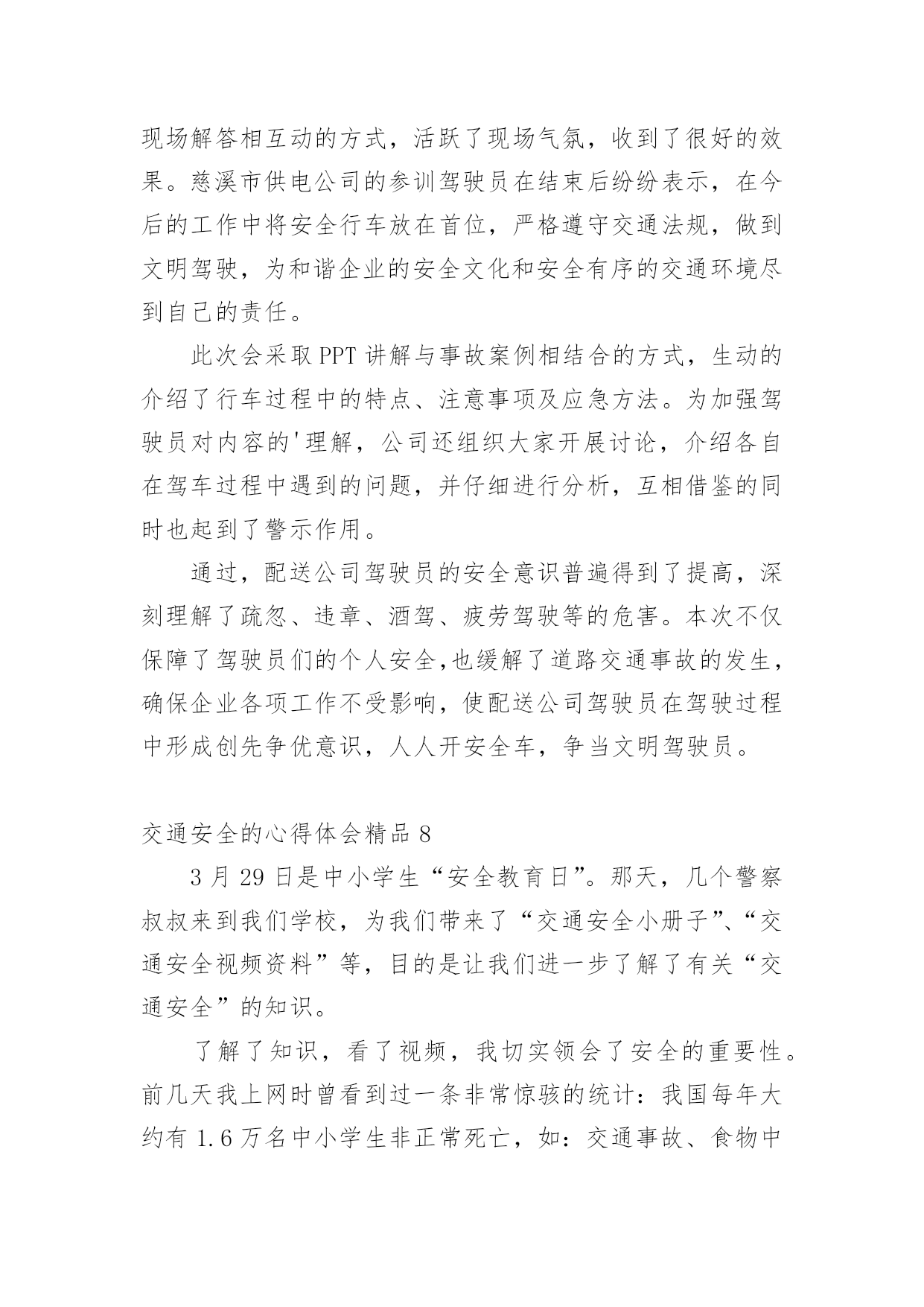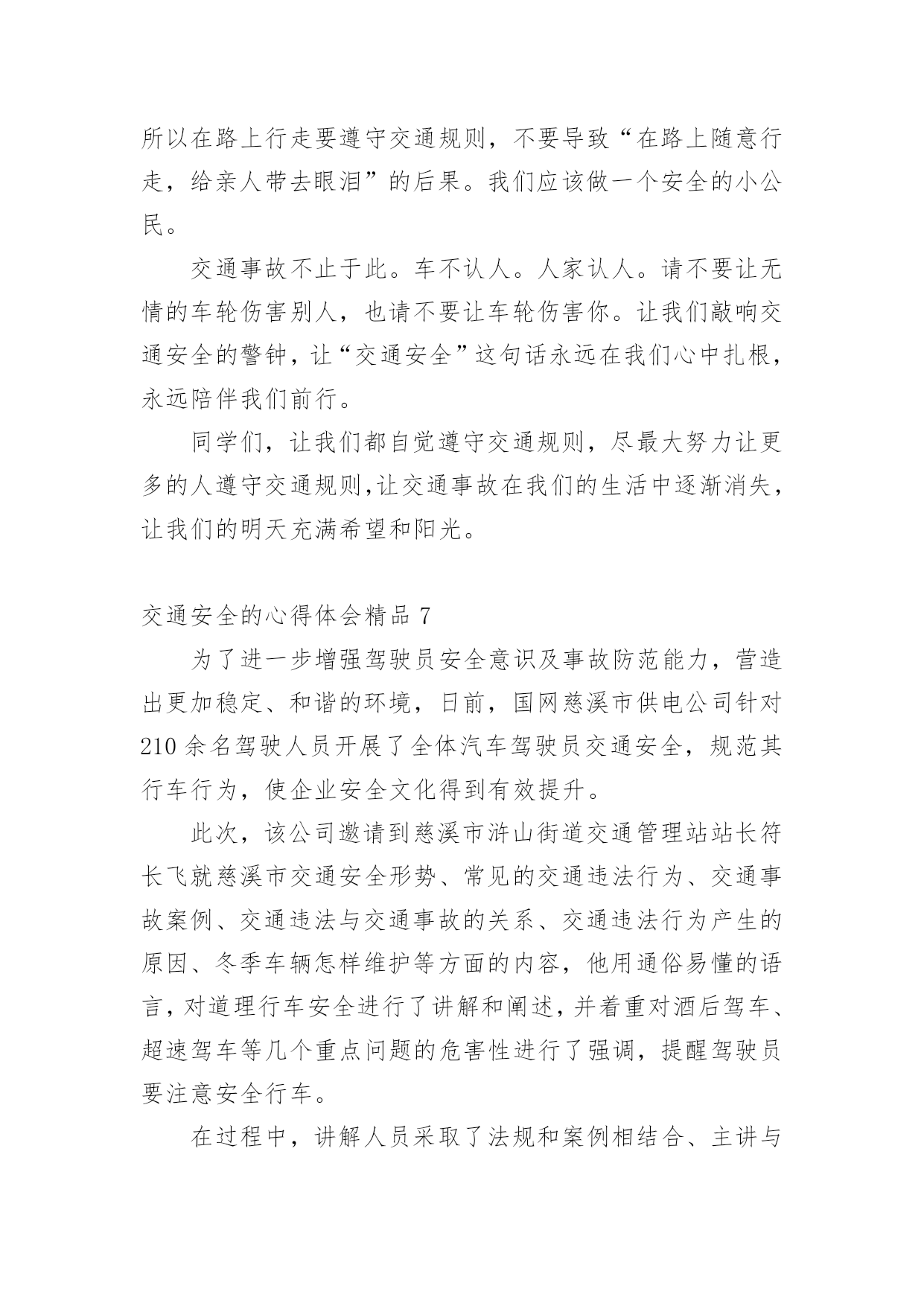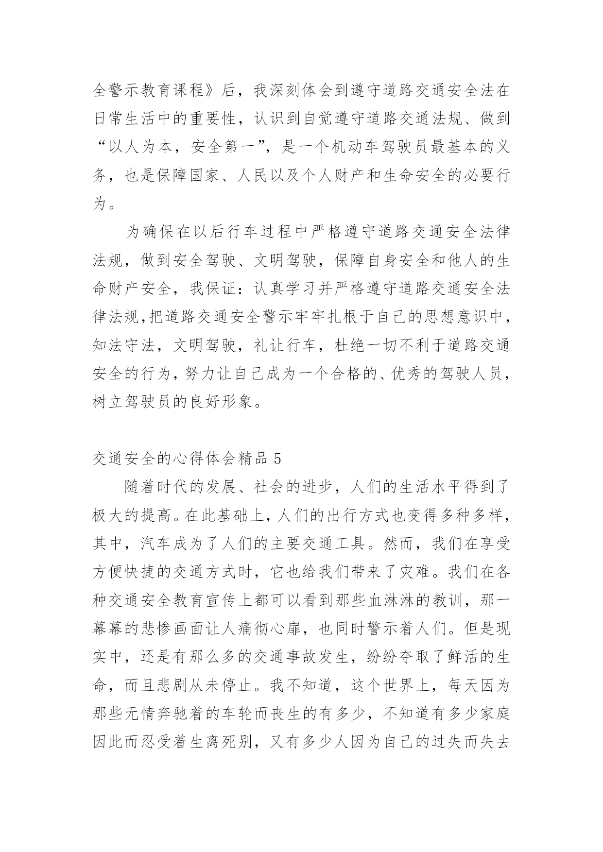 交通安全的心得体会交通安全的心得体会精品我们心里有一些收获后,写一篇心得体会,记录下来,这样我们可以养成良好的总结方法。那么心得体会该怎么写?想必这让大家都很苦恼吧,以下是小编收集整理的交通安全的心得体会精品,希望对大家有所帮助。交通安全的心得体会精品1《道路交通安全法》是我国第一部全面规范道路交通参与人权利义务关系的基本法律。在单位的统一组织下,我们认真学习了全文,对照自己的工作,我认为学习本法对我们的安全执法很有必要。一、新法对交通事故的责任作了明确规定。机动车与非机动车驾驶人、行人之间发生交通事故的,由机动车一方承担责任;但是,有证据证明非机动车驾驶人、行人违反道路交通安全法律、法规,机动车驾驶人已经采取必要处置措施的,减轻机动车一方的责任。交通事故的损失是由非机动车驾驶人、行人故意造成的,机动车一方不承担责任。这些规定为我们从事执法工作驾驶员的安全警惕性敲响了警钟。此法的出台,不但让广大群众自觉提高交通规范意识,更让我们执法者提高安全意识,在保护他人的同时更为保护自己。二、新法发扬了救死扶伤的人道主义精神。第七十条规定在道路上发生交通事故,车辆驾驶人应当立即停车,保护现场;造成人身伤亡的,车辆驾驶人应当立即抢救受伤人员,并迅速报告执勤的交通警察或者公安机关交通管理部门。第七十五条规定医疗机构对交通事故中的受伤人员应当及时抢救,不得因抢救费用未及时支付而拖延救治。这些条款充分体现了人道主义精神。所以,我们在提高安全执法的同时,更应注意人文主义精神的培养,提高人文素质,发扬救死扶伤的人道主义精神。三、新法制定了相应的.约束性条款。机动车司机不会再交“冤枉罚款”,还规定了交警有违法行为,如私自收取罚款,违法扣留车辆,罚款不交国库等15种行为之一,就必受行政处分。并明确规定各地不得给交警下达罚款指标,依法收取的罚款全部上缴国库。彻底杜绝了乱收罚款的现象,维护了广大驾驶人的合法权益。由此可见,《道路交通安全法》充分体现了“以人为本,尊重生命”的人文精神,它的贯彻执行必将对提高道路交通安全,减少交通事故都起到积极的作用。作为我们公路执法人员不仅学好《道路交通安全法》,而且要大力宣传此法,更要在平时的工作、生活中带头严格遵守它。只有认真遵守了《道路交通安全法》,才能彻底保护自己在交通中的安全,同时也使我们的交通建设安全规范、井井有条。让我们从自身做起,带动身边的人,以自觉遵守交通法为荣,以不良驾驶行为为耻,共同为创造良好的道路交通秩序而努力。交通安全的心得体会精品2昨天下午,学校组织全校师生和家长一起听一节关于交通安全知识的讲座。听此次讲座我发现,当前交通存在许多问题,如:超车、超载、超速、行人乱穿马路、乱闯红灯等。存在上述问题最重要的是人们对交通安全目标和内容的理解不够,对存在的交通安全隐患认识不足,从而不断导致车祸(死、伤)的人间悲剧发生。孩子们的生命安全牵动着每个家庭和教师的心,因此,要加强对学生的交通安全教育,防止和避免交通事故的发生。作为我们教师要有强烈的交通安全意识,做一个交通安全的保护者、宣传者、教育者,为孩子做出良好的表率作用,增强幼儿的交通安全意识。我们要对对家长进行交通安全宣传,引导家长参与交通安全活动。家长是孩子的'第一任老师,对孩子的影响很大。通过开家长会等活动,从而呼吁家长参与进来,应时刻提醒孩子们注意交通安全。在课堂上我教学生们很多交通安全知识,但也只是浅薄的。通过学习,我进一步树立起交通安全意识,这在平时对于学生的安全教育中起到重要的作用。通过学习我知道:当我们徒步行走于人来车往的马路时,一定要时刻保持清醒的头脑,不能在马路上嬉戏打闹;当我们过马路时,要多一份谦让与耐心,不闯红灯,走人行横道,绝不能为贪一时之快,违规横穿马路。因为,一个疏忽、一个马虎、一个走神都可能酿成危及生命的严重后果。以后,我希望学生们会把存在的交通问题一一改正,做一个遵守交通规则的好学生。让爸爸妈妈放心,让老师安心。交通安全的心得体会精品3这个星期星期二下午,在我们学校举行了一场讲演比赛——“文明出行,交通安全”。在演讲结束后,走出报告厅,我不禁心潮腾涌:是啊!中国现在正向汽车行业发展,很多家庭都有了小轿车,马路上开着“宝马”“奔驰”,这是好事。但是,我国每五分钟都有一个交通事故,每一分钟都有一个人被压死在车轮下,中国交通事故数量居全世界之首!多么惊人的数字啊!这到底是为什么呢?我认为,我国人口实在是太多了,因此很难管理,是导致了交通事故的人数不断上升的重要原因。还有,房子造的多,可是马路的建设却滞后,马路上甚至有些没有红绿灯,护栏杆。农村就更不要说了,一眼望去,很多都是坑坑洼洼的乡间小路,多几辆车,多几个人,行使就会很困难,你推我攘,很容易发生事故。还有一个管理的问题,比如说有些学校门口经常会有大型车辆过往,学生的.安全就得