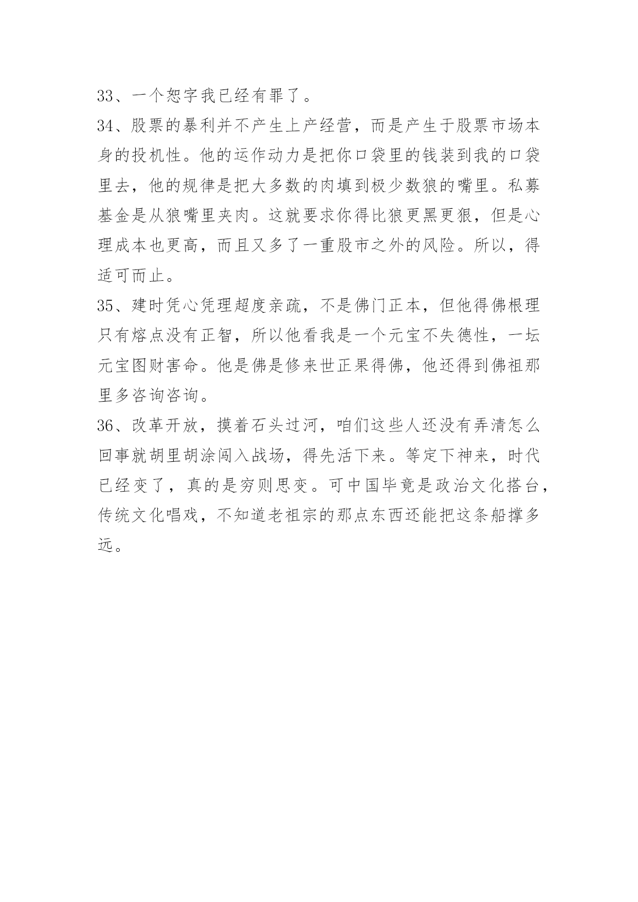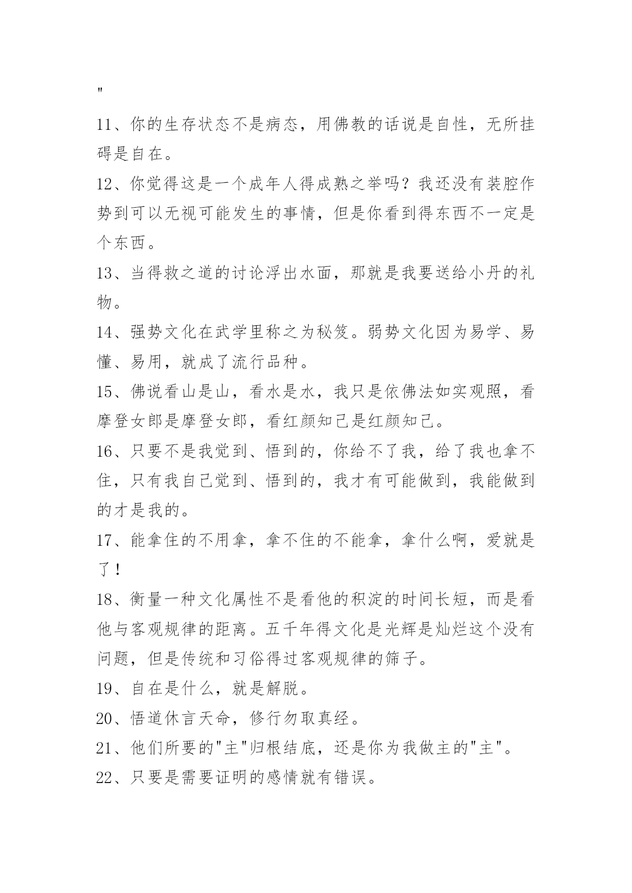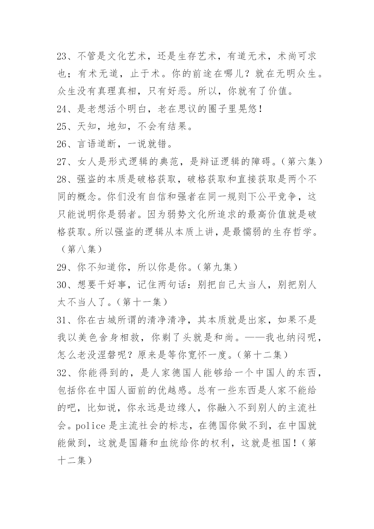 天道的语录36条2024年天道的语录36条文明对于不能以人字界定的人无能为力。下面是小编收集整理的天道的语录36条,一起来看一下吧。1、可品行这个东西今天缺个角明天裂个缝,也就离坍陷不远了。2、有很多本应该坚持的东西,会因为人心偶尔的松懈,和把持不住,就渐渐在不经意间失去。所以说,有的坚持,是不能给自己借口去放松的。3、人的法则是,一颗阴暗的心,永远托不起一张灿烂的脸。4、一切有为法,应作如是观,为法,如是,又当如何。还是有情本位,唯独出离不了一个情字,真希望有个祈祷就管用的天哪。5、金银珠宝不足以点缀你这样的女人。6、神话得实质就是强制力作用下得杀富济贫。7、只有我自己觉到、悟到的,我才有可能做到,我能做到的才是我的。8、你不知道你所以你是你。知之为不知,不知更非知。9、天下之道论到极至,是百姓的柴米油盐。人生冷暖论到极至,是男人和女人的一个情字。10、"你不知道你,所以你是你;如果你知道了你,你就不是你了。""既然是知道就不是,那就是不可知,无须知了。"11、你的生存状态不是病态,用佛教的话说是自性,无所挂碍是自在。12、你觉得这是一个成年人得成熟之举吗?我还没有装腔作势到可以无视可能发生的事情,但是你看到得东西不一定是个东西。13、当得救之道的讨论浮出水面,那就是我要送给小丹的礼物。14、强势文化在武学里称之为秘笈。弱势文化因为易学、易懂、易用,就成了流行品种。15、佛说看山是山,看水是水,我只是依佛法如实观照,看摩登女郎是摩登女郎,看红颜知己是红颜知己。16、只要不是我觉到、悟到的,你给不了我,给了我也拿不住,只有我自己觉到、悟到的,我才有可能做到,我能做到的才是我的。17、能拿住的不用拿,拿不住的不能拿,拿什么啊,爱就是了!18、衡量一种文化属性不是看他的积淀的时间长短,而是看他与客观规律的距离。五千年得文化是光辉是灿烂这个没有问题,但是传统和习俗得过客观规律的筛子。19、自在是什么,就是解脱。20、悟道休言天命,修行勿取真经。21、他们所要的"主"归根结底,还是你为我做主的"主"。22、只要是需要证明的感情就有错误。23、不管是文化艺术,还是生存艺术,有道无术,术尚可求也;有术无道,止于术。你的前途在哪儿?就在无明众生。众生没有真理真相,只有好恶。所以,你就有了价值。24、是老想活个明白,老在思议的圈子里晃悠!25、天知,地知,不会有结果。26、言语道断,一说就错。27、女人是形式逻辑的典范,是辩证逻辑的障碍。(第六集)28、强盗的本质是破格获取,破格获取和直接获取是两个不同的概念。你们没有自信和强者在同一规则下公平竞争,这只能说明你是弱者。因为弱势文化所追求的最高价值就是破格获取。所以强盗的逻辑从本质上讲,是最懦弱的生存哲学。(第八集)29、你不知道你,所以你是你。(第九集)30、想要干好事,记住两句话:别把自己太当人,别把别人太不当人了。(第十一集)31、你在古城所谓的清净清净,其本质就是出家,如果不是我以美色舍身相救,你剃了头就是和尚。——我也纳闷呢,怎么老没涅磐呢?原来是等你宽怀一度。(第十二集)32、你能得到的,是人家德国人能够给一个中国人的东西,包括你在中国人面前的优越感。总有一些东西是人家不能给的吧,比如说,你永远是边缘人,你融入不到别人的主流社会。police是主流社会的标志,在德国你做不到,在中国就能做到,这就是国籍和血统给你的权利,这就是祖国!(第十二集)33、一个恕字我已经有罪了。34、股票的暴利并不产生上产经营,而是产生于股票市场本身的投机性。他的运作动力是把你口袋里的钱装到我的口袋里去,他的规律是把大多数的肉填到极少数狼的嘴里。私募基金是从狼嘴里夹肉。这就要求你得比狼更黑更狠,但是心理成本也更高,而且又多了一重股市之外的风险。所以,得适可而止。35、建时凭心凭理超度亲疏,不是佛门正本,但他得佛根理只有熔点没有正智,所以他看我是一个元宝不失德性,一坛元宝图财害命。他是佛是修来世正果得佛,他还得到佛祖那里多咨询咨询。36、改革开放,摸着石头过河,咱们这些人还没有弄清怎么回事就胡里胡涂闯入战场,得先活下来。等定下神来,时代已经变了,真的是穷则思变。可中国毕竟是政治文化搭台,传统文化唱戏,不知道老祖宗的那点东西还能把这条船撑多远。