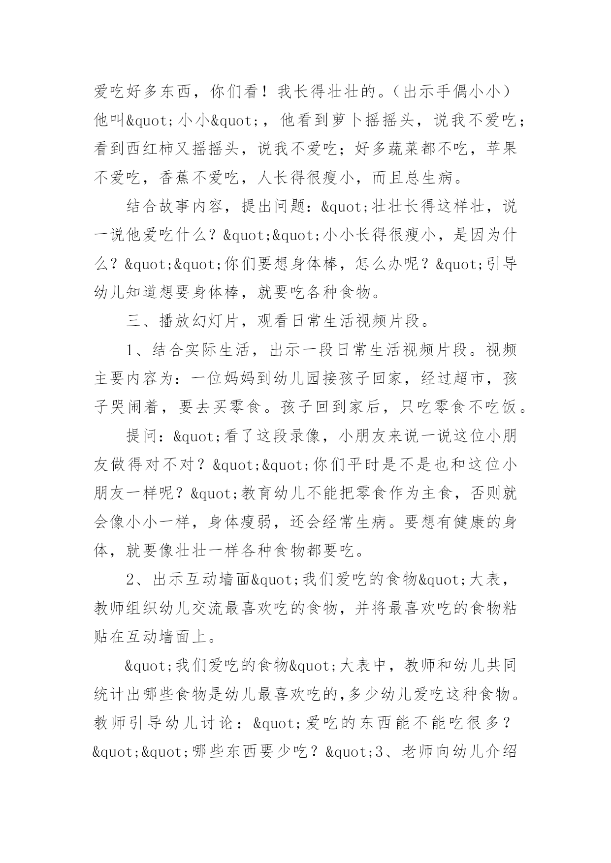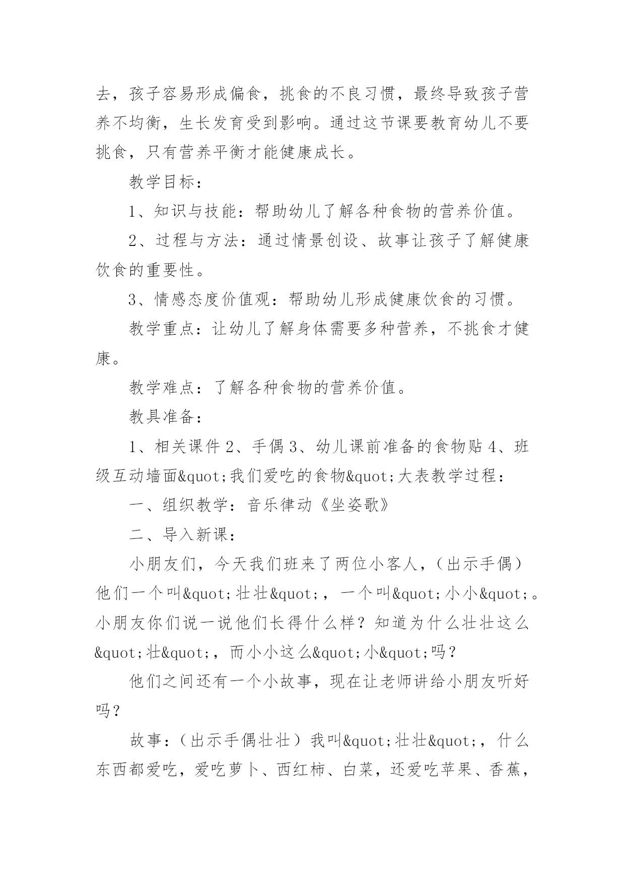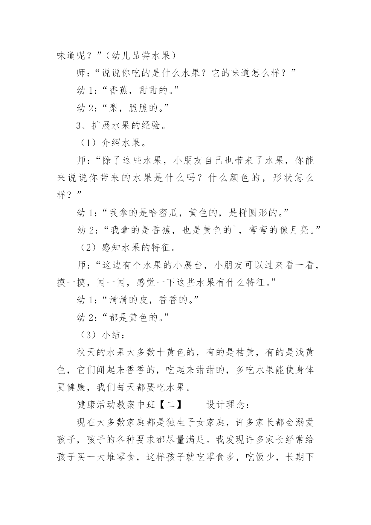 健康活动教案中班健康活动教案中班一份优秀教案是设计者教育思想、智慧、动机、经验、个性和教学艺术性的综合体现。小编收集了健康活动教案中班。欢迎阅读。健康活动教案中班【一】一、目标:1、能用多种感官感知黄色水果的特征。2、知道水果有营养,并有每天吃水果的习惯。二、准备:1、黄色的水果,水果展台,盘子,盆若干。2、幼儿活动材料第二册第7-8页。3、将水果洗净,切成片状。三、过程:1、猜猜是什么。师:“有个谜语想请大家来猜一猜。”(幼儿根据谜面的描述,举起相应的水果进行验证)“扁扁的,圆圆的,桔黄色,一瓣一瓣的。”(桔子)“弯弯的像月亮,青青的不好吃,黄黄的甜蜜蜜。”(香蕉)师:“这些水果都穿着什么颜色的外衣?”幼:“黄色的。”2、品尝黄色水果的味道。师:“不知道这些黄色水果能不能吃,吃起来会是什么味道呢?”(幼儿品尝水果)师:“说说你吃的是什么水果?它的味道怎么样?”幼1:“香蕉,甜甜的。”幼2:“梨,脆脆的。”3、扩展水果的经验。(1)介绍水果。师:“除了这些水果,小朋友自己也带来了水果,你能来说说你带来的水果是什么吗?什么颜色的,形状怎么样?”幼1:“我拿的是哈密瓜,黄色的,是椭圆形的。”幼2:“我拿的是香蕉,也是黄色的`,弯弯的像月亮。”(2)感知水果的特征。师:“这边有个水果的小展台,小朋友可以过来看一看,摸一摸,闻一闻,感觉一下这些水果有什么特征。”幼1:“滑滑的皮,香香的。”幼2:“都是黄色的。”(3)小结:秋天的水果大多数十黄色的,有的是桔黄,有的是浅黄色,它们闻起来香香的,吃起来甜甜的,多吃水果能使身体更健康,我们每天都要吃水果。健康活动教案中班【二】设计理念:现在大多数家庭都是独生子女家庭,许多家长都会溺爱孩子,孩子的各种要求都尽量满足。我发现许多家长经常给孩子买一大堆零食,这样孩子就吃零食多,吃饭少,长期下去,孩子容易形成偏食,挑食的不良习惯,最终导致孩子营养不均衡,生长发育受到影响。通过这节课要教育幼儿不要挑食,只有营养平衡才能健康成长。教学目标:1、知识与技能:帮助幼儿了解各种食物的营养价值。2、过程与方法:通过情景创设、故事让孩子了解健康饮食的重要性。3、情感态度价值观:帮助幼儿形成健康饮食的习惯。教学重点:让幼儿了解身体需要多种营养,不挑食才健康。教学难点:了解各种食物的营养价值。教具准备:1、相关课件2、手偶3、幼儿课前准备的食物贴4、班级互动墙面"我们爱吃的食物"大表教学过程:一、组织教学:音乐律动《坐姿歌》二、导入新课:小朋友们,今天我们班来了两位小客人,(出示手偶)他们一个叫"壮壮",一个叫"小小"。小朋友你们说一说他们长得什么样?知道为什么壮壮这么"壮",而小小这么"小"吗?他们之间还有一个小故事,现在让老师讲给小朋友听好吗?故事:(出示手偶壮壮)我叫"壮壮",什么东西都爱吃,爱吃萝卜、西红柿、白菜,还爱吃苹果、香蕉,爱吃好多东西,你们看!我长得壮壮的。(出示手偶小小)他叫"小小",他看到萝卜摇摇头,说我不爱吃;看到西红柿又摇摇头,说我不爱吃;好多蔬菜都不吃,苹果不爱吃,香蕉不爱吃,人长得很瘦小,而且总生病。结合故事内容,提出问题:"壮壮长得这样壮,说一说他爱吃什么?""小小长得很瘦小,是因为什么?""你们要想身体棒,怎么办呢?"引导幼儿知道想要身体棒,就要吃各种食物。三、播放幻灯片,观看日常生活视频片段。1、结合实际生活,出示一段日常生活视频片段。视频主要内容为:一位妈妈到幼儿园接孩子回家,经过超市,孩子哭闹着,要去买零食。孩子回到家后,只吃零食不吃饭。提问:"看了这段录像,小朋友来说一说这位小朋友做得对不对?""你们平时是不是也和这位小朋友一样呢?"教育幼儿不能把零食作为主食,否则就会像小小一样,身体瘦弱,还会经常生病。要想有健康的身体,就要像壮壮一样各种食物都要吃。2、出示互动墙面"我们爱吃的食物"大表,教师组织幼儿交流最喜欢吃的食物,并将最喜欢吃的食物粘贴在互动墙面上。"我们爱吃的食物"大表中,教师和幼儿共同统计出哪些食物是幼儿最喜欢吃的,多少幼儿爱吃这种食物。教师引导幼儿讨论:"爱吃的东西能不能吃很多?""哪些东西要少吃?"3、老师向幼儿介绍各种食物的营养成分。(蔬菜和水果中含有大量的维生素,含有从其他食物中补充不到的`营养成分。并且有预防和治疗疾病的功效。)总结:不同的食物有不同的营养成分,吃不同的食物就能获得不同的营养,有了丰富的营养,身体才能更加健康。四、延伸活
