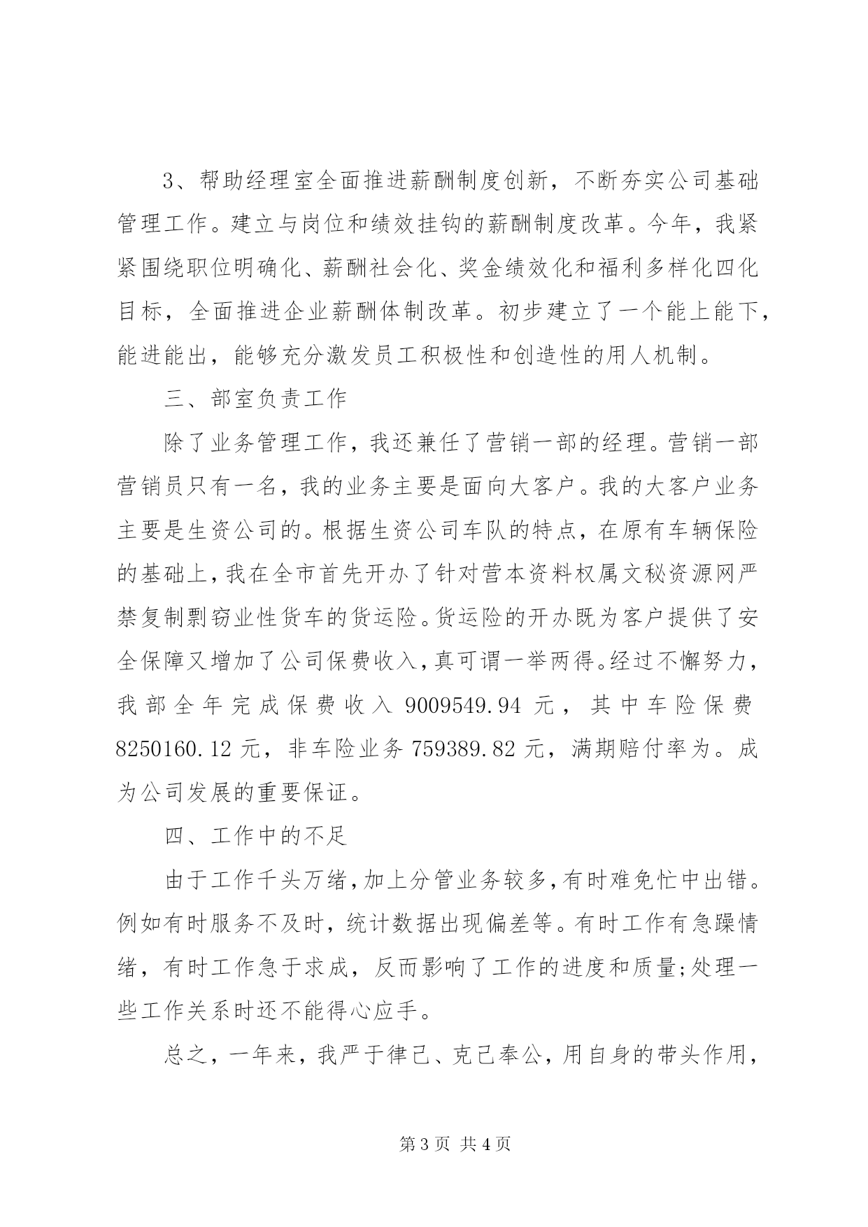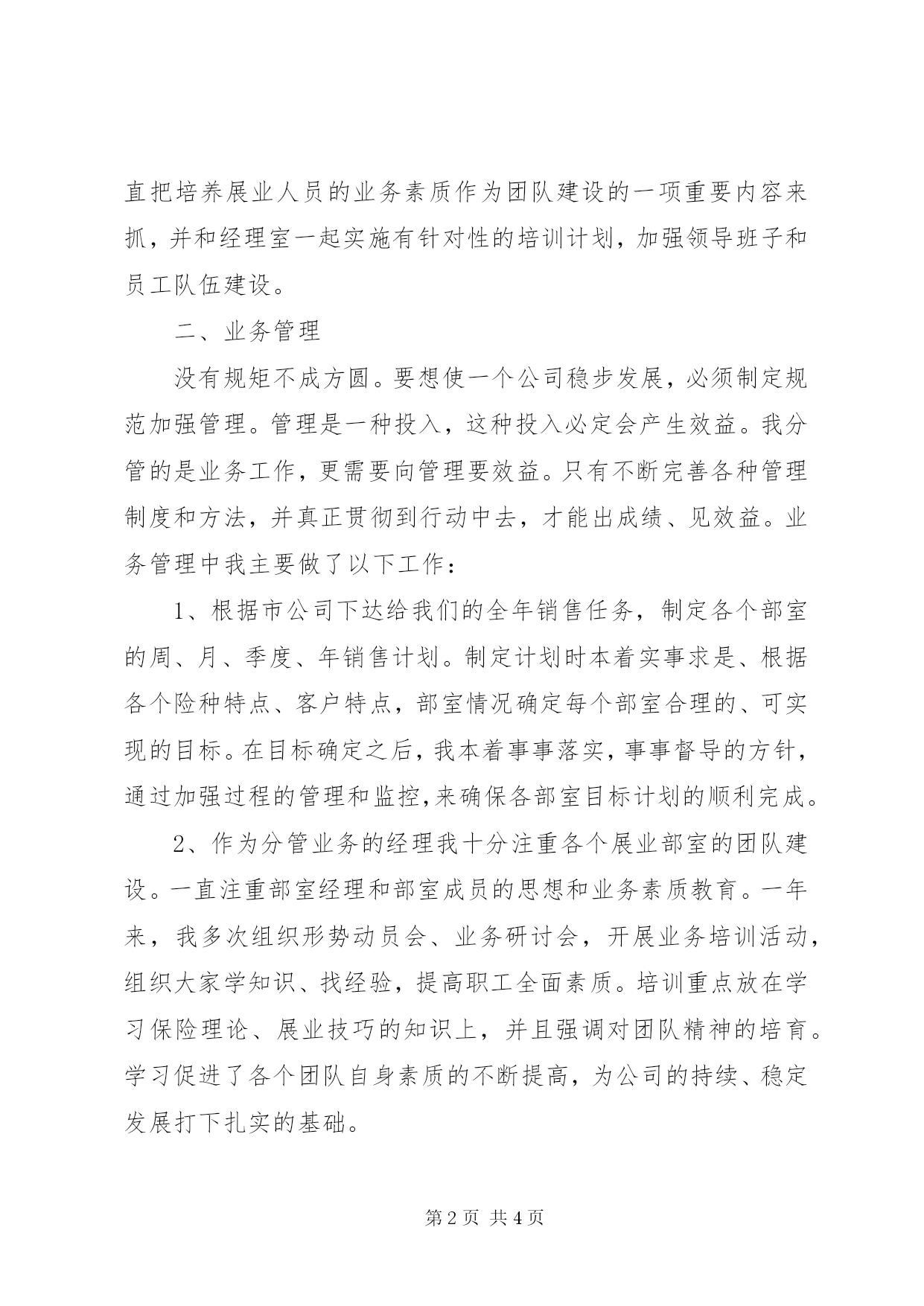 第PAGE\*Arabic\*MERGEFORMAT4页共NUMPAGES\*MERGEFORMAT4页保险个人年终总结范文一年来,大地保险河东公司在省市公司正确领导下,依靠我公司全体员工的不懈努力,公司业务取得了突破性进展,率先在全省突破保费收入千万元大关。今年,我公司提前两个月完成了省公司下达的全年营销任务,各项工作健康顺利发展。下面结合我的具体分管工作,谈谈这一年来的成绩与不足。一、工作思想积极贯彻省市公司关于公司发展的一系列重要指示,与时俱进,勤奋工作,务实求效,勇争一流,带领各部员工紧紧围绕立足改革、加快发展、真诚服务、提高效益这一中心,进一步转变观念、改革创新,面对竞争日趋激烈的临沂保险市场,强化核心竞争力,开展多元化经营,经过努力和拼搏,公司保持了较好的发展态势,为大地保险公司的持续发展,做出了应有的贡献。全方面加强学习,努力提高自身业务素质水平和管理水平。作为一名领导干部,肩负着上级领导和全体员工赋予的重要职责与使命,公司的经营方针政策需要我去贯彻实施。因此,我十分本资料权属文秘资源网严禁复制剽窃注重保险理论的学习和管理能力的培养。注意用科学的方法指导自己的工作,规范自己的言行,树立强烈的责任感和事业心,不断提高自己的业务能力和管理能力。不断提高公司业务人员队伍的整体素质水平。一年来,我一直把培养展业人员的业务素质作为团队建设的一项重要内容来抓,并和经理室一起实施有针对性的培训计划,加强领导班子和员工队伍建设。二、业务管理没有规矩不成方圆。要想使一个公司稳步发展,必须制定规范加强管理。管理是一种投入,这种投入必定会产生效益。我分管的是业务工作,更需要向管理要效益。只有不断完善各种管理制度和方法,并真正贯彻到行动中去,才能出成绩、见效益。业务管理中我主要做了以下工作:1、根据市公司下达给我们的全年销售任务,制定各个部室的周、月、季度、年销售计划。制定计划时本着实事求是、根据各个险种特点、客户特点,部室情况确定每个部室合理的、可实现的目标。在目标确定之后,我本着事事落实,事事督导的方针,通过加强过程的管理和监控,来确保各部室目标计划的顺利完成。2、作为分管业务的经理我十分注重各个展业部室的团队建设。一直注重部室经理和部室成员的思想和业务素质教育。一年来,我多次组织形势动员会、业务研讨会,开展业务培训活动,组织大家学知识、找经验,提高职工全面素质。培训重点放在学习保险理论、展业技巧的知识上,并且强调对团队精神的培育。学习促进了各个团队自身素质的不断提高,为公司的持续、稳定发展打下扎实的基础。3、帮助经理室全面推进薪酬制度创新,不断夯实公司基础管理工作。建立与岗位和绩效挂钩的薪酬制度改革。今年,我紧紧围绕职位明确化、薪酬社会化、奖金绩效化和福利多样化四化目标,全面推进企业薪酬体制改革。初步建立了一个能上能下,能进能出,能够充分激发员工积极性和创造性的用人机制。三、部室负责工作除了业务管理工作,我还兼任了营销一部的经理。营销一部营销员只有一名,我的业务主要是面向大客户。我的大客户业务主要是生资公司的。根据生资公司车队的特点,在原有车辆保险的基础上,我在全市首先开办了针对营本资料权属文秘资源网严禁复制剽窃业性货车的货运险。货运险的开办既为客户提供了安全保障又增加了公司保费收入,真可谓一举两得。经过不懈努力,我部全年完成保费收入9009549.94元,其中车险保费8250160.12元,非车险业务759389.82元,满期赔付率为。成为公司发展的重要保证。四、工作中的不足由于工作千头万绪,加上分管业务较多,有时难免忙中出错。例如有时服务不及时,统计数据出现偏差等。有时工作有急躁情绪,有时工作急于求成,反而影响了工作的进度和质量;处理一些工作关系时还不能得心应手。总之,一年来,我严于律己、克己奉公,用自身的带头作用,在思想上提高职工的认识,行动上用严格的制度规范,在我的带领下,公司员工以不断发展建设为己任,以诚信为先,稳健经营,价值为上,服务社会为经营宗旨,锐意改革,不断创新,规范运作,取得了很大成绩。新的一年即将到来,保险市场的竞争将更加激烈,公司要想继续保持较好的发展态势,必须进一步解放思想,更新观念,突破自我,逐渐加大市场营销力度。新的一年我将以饱满的激情、以百倍的信心,迎接未来的挑战,使本职工作再上新台阶。我相信,在上级公司的正确领导下,在全体员工的共同努力下,上下一心,艰苦奋斗,同舟共济,全力拼搏,我们公司一定能够创造出更加辉煌的业绩。