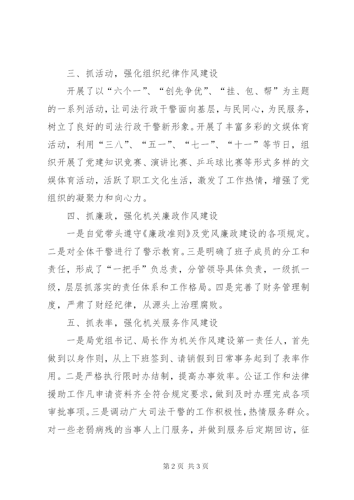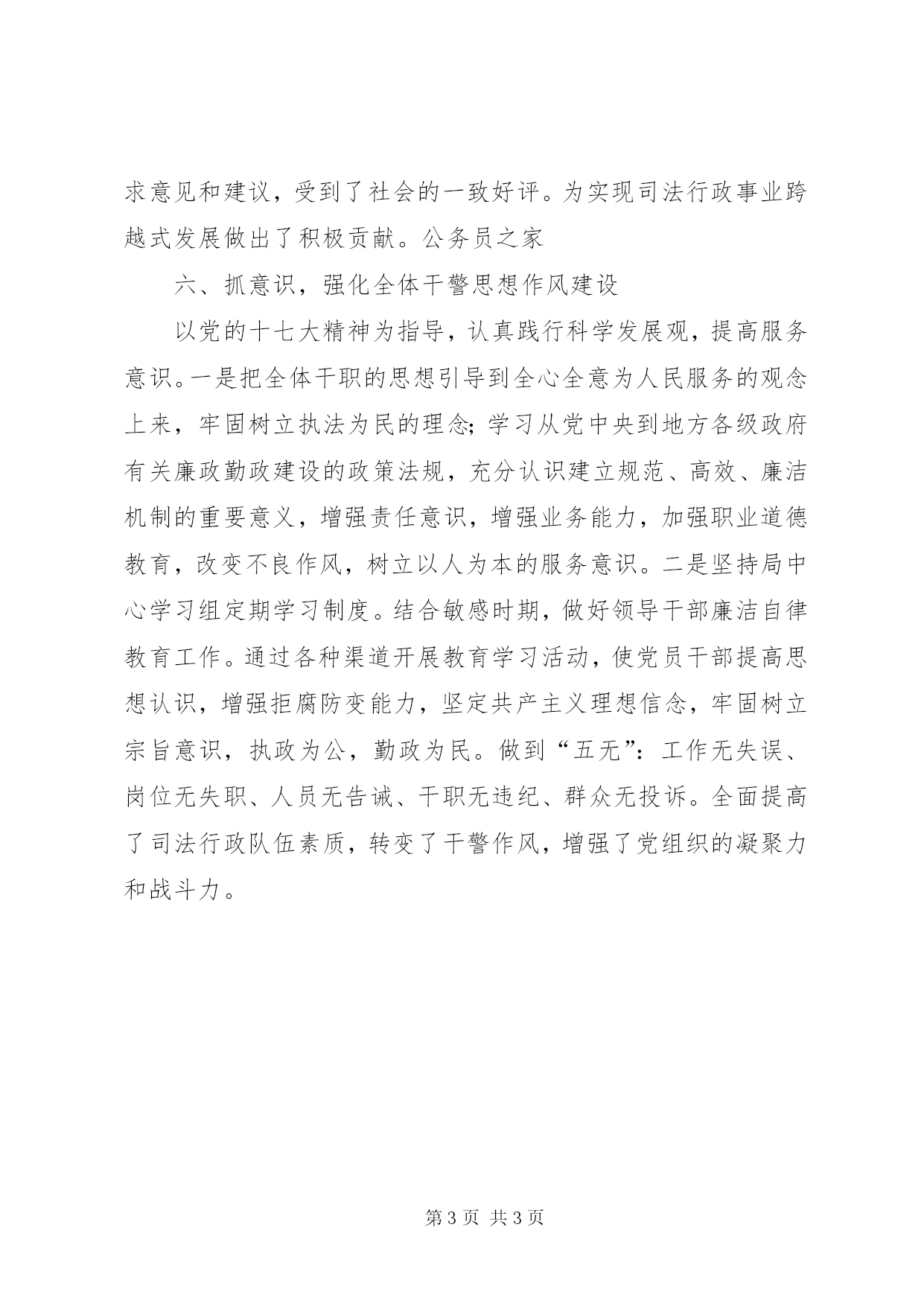 第PAGE\*Arabic\*MERGEFORMAT3页共NUMPAGES\*MERGEFORMAT3页县司法局作风建设指导实施办法县司法局为切实加强队伍作风建设,提高司法行政效能,坚持六抓六强化,推进司法行政工作全面发展,不断开创司法行政工作新局面。一、抓学习,强化领导干部作风建设为了提高全体干警的综合素质,更好地发挥先锋模范作用,一是一把手主持中心组坚持每月学政治、学理论、学法规,并亲自进行辅导。二是完善了学习制度,将学习制度化、经常化。今年重点学习了党的十七大报告精神,“三个代表”重要思想,科学发展观理论,党的基本知识,学习了吴战保同志的先进事迹和《中国共产党纪律处分条例》及党建知识等,全面提高了党员干部的综合素质。三是组织举办了各种业务培训班,对党员干部进行党的理论和党建知识培训,执法人员进行业务培训。二、抓管理,强化机关单位作风建设认真贯彻党的十七大精神,严肃党的纪律,加强内部管理,坚持用制度管人,制定和完善了各项规章制度。制定了《XX县区司法局2010年目标管理考核办法》,对党员干部的政治思想、业务素质、勤政务实、工作业绩、廉洁自律等方面进行综合考核。进一步明确了工作职责,使管理更加规范化,制度化,为把司法行政队伍建设成为一支政治可靠,作风过硬,纪律严明、业务精悍的高素质队伍提供了纪律保障。三、抓活动,强化组织纪律作风建设开展了以“六个一”、“创先争优”、“挂、包、帮”为主题的一系列活动,让司法行政干警面向基层,与民同心,为民服务,树立了良好的司法行政干警新形象。开展了丰富多彩的文娱体育活动,利用“三八”、“五一”、“七一”、“十一”等节日,组织开展了党建知识竞赛、演讲比赛、乒乓球比赛等形式多样的文娱体育活动,活跃了职工文化生活,激发了工作热情,增强了党组织的凝聚力和向心力。四、抓廉政,强化机关廉政作风建设一是自觉带头遵守《廉政准则》及党风廉政建设的各项规定。二是对全体干警进行了警示教育。三是明确了班子成员的分工和责任,形成了“一把手”负总责,分管领导具体负责,一级抓一级,层层抓落实的责任体系和工作格局。四是完善了财务管理制度,严肃了财经纪律,从源头上治理腐败。五、抓表率,强化机关服务作风建设一是局党组书记、局长作为机关作风建设第一责任人,首先做到以身作则,从上下班签到、请销假到日常事务起到了表率作用。二是严格执行限时办结制,提高办事效率。公证工作和法律援助工作凡申请资料齐全符合规定要求,做到及时办理完成各项审批事项。三是调动广大司法干警的工作积极性,热情服务群众。对一些老弱病残的当事人上门服务,并做到服务后定期回访,征求意见和建议,受到了社会的一致好评。为实现司法行政事业跨越式发展做出了积极贡献。公务员之家六、抓意识,强化全体干警思想作风建设以党的十七大精神为指导,认真践行科学发展观,提高服务意识。一是把全体干职的思想引导到全心全意为人民服务的观念上来,牢固树立执法为民的理念;学习从党中央到地方各级政府有关廉政勤政建设的政策法规,充分认识建立规范、高效、廉洁机制的重要意义,增强责任意识,增强业务能力,加强职业道德教育,改变不良作风,树立以人为本的服务意识。二是坚持局中心学习组定期学习制度。结合敏感时期,做好领导干部廉洁自律教育工作。通过各种渠道开展教育学习活动,使党员干部提高思想认识,增强拒腐防变能力,坚定共产主义理想信念,牢固树立宗旨意识,执政为公,勤政为民。做到“五无”:工作无失误、岗位无失职、人员无告诫、干职无违纪、群众无投诉。全面提高了司法行政队伍素质,转变了干警作风,增强了党组织的凝聚力和战斗力。