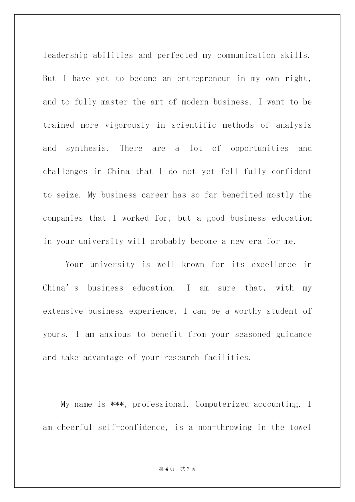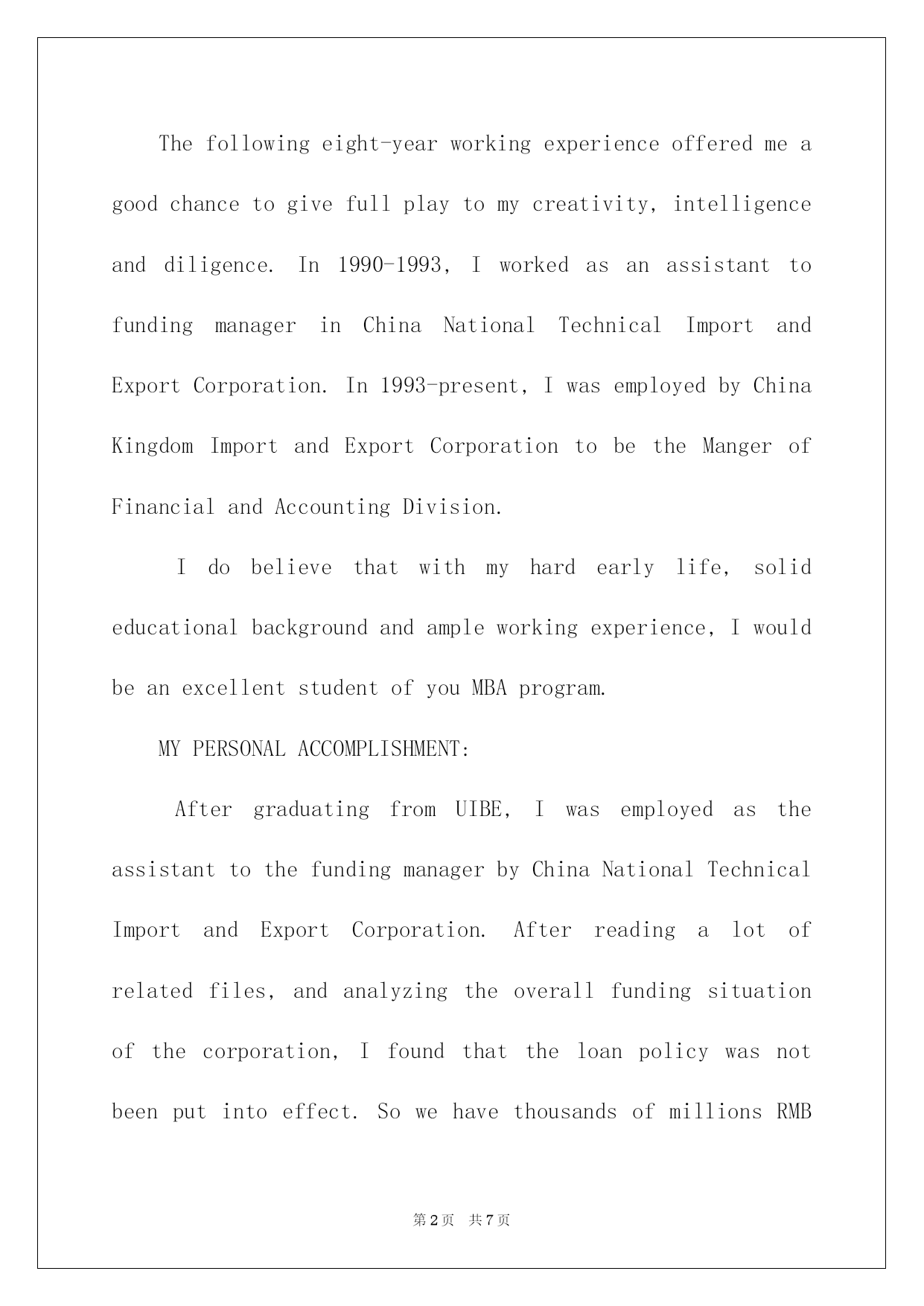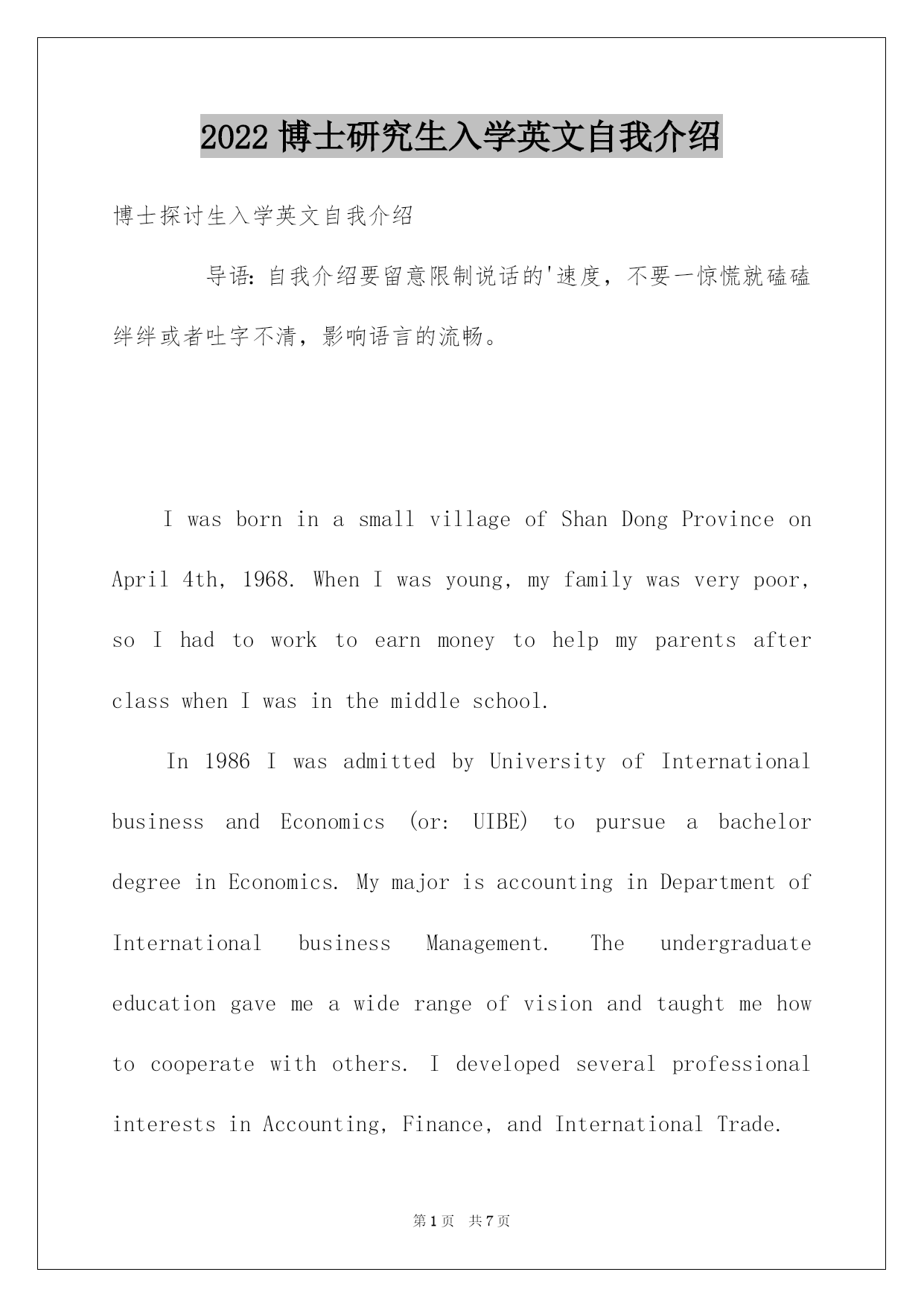 第PAGE\*Arabic\*MERGEFORMAT7页共NUMPAGES\*Arabic\*MERGEFORMAT7页第PAGE\*MERGEFORMAT7页共NUMPAGES\*MERGEFORMAT7页第PAGE\*MERGEFORMAT7页共NUMPAGES\*MERGEFORMAT7页第PAGE\*MERGEFORMAT7页共NUMPAGES\*MERGEFORMAT7页第PAGE\*MERGEFORMAT7页共NUMPAGES\*MERGEFORMAT7页第PAGE\*MERGEFORMAT7页共NUMPAGES\*MERGEFORMAT7页第PAGE\*MERGEFORMAT7页共NUMPAGES\*MERGEFORMAT7页第PAGE\*MERGEFORMAT7页共NUMPAGES\*MERGEFORMAT7页第PAGE\*MERGEFORMAT7页共NUMPAGES\*MERGEFORMAT7页第PAGE\*MERGEFORMAT7页共NUMPAGES\*MERGEFORMAT7页第PAGE\*MERGEFORMAT7页共NUMPAGES\*MERGEFORMAT7页2022博士研究生入学英文自我介绍博士探讨生入学英文自我介绍导语:自我介绍要留意限制说话的'速度,不要一惊慌就磕磕绊绊或者吐字不清,影响语言的流畅。IwasborninasmallvillageofShanDongProvinceonApril4th,1968.WhenIwasyoung,myfamilywasverypoor,soIhadtoworktoearnmoneytohelpmyparentsafterclasswhenIwasinthemiddleschool.In1986IwasadmittedbyUniversityofInternationalbusinessandEconomics(or:UIBE)topursueabachelordegreeinEconomics.MymajorisaccountinginDepartmentofInternationalbusinessManagement.Theundergraduateeducationgavemeawiderangeofvisionandtaughtmehowtocooperatewithothers.IdevelopedseveralprofessionalinterestsinAccounting,Finance,andInternationalTrade.Thefollowingeight-yearworkingexperienceofferedmeagoodchancetogivefullplaytomycreativity,intelligenceanddiligence.In1990-1993,IworkedasanassistanttofundingmanagerinChinaNationalTechnicalImportandExportCorporation.In1993-present,IwasemployedbyChinaKingdomImportandExportCorporationtobetheMangerofFinancialandAccountingDivision.Idobelievethatwithmyhardearlylife,solideducationalbackgroundandampleworkingexperience,IwouldbeanexcellentstudentofyouMBAprogram.MYPERSONALACCOMPLISHMENT:AftergraduatingfromUIBE,IwasemployedastheassistanttothefundingmanagerbyChinaNationalTechnicalImportandExportCorporation.Afterreadingalotofrelatedfiles,andanalyzingtheoverallfundingsituationofthecorporation,Ifoundthattheloanpolicywasnotbeenputintoeffect.SowehavethousandsofmillionsRMBloanwithveryhighinterestratewhilealargeamountofcashinbankwithverylowinterestratew