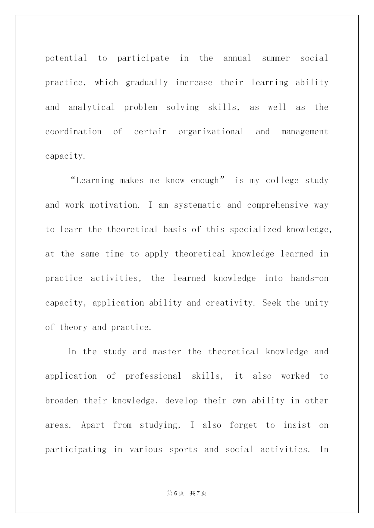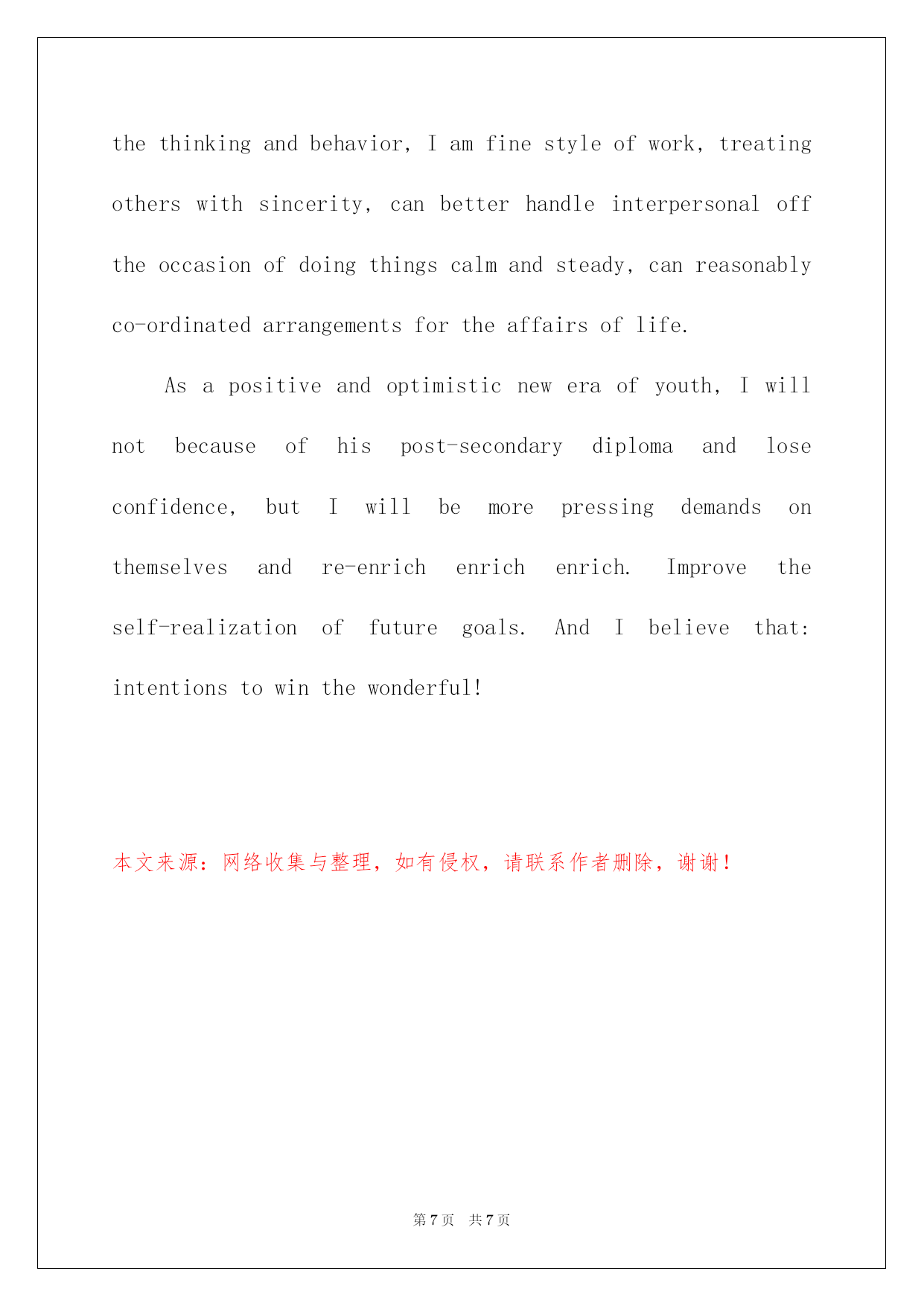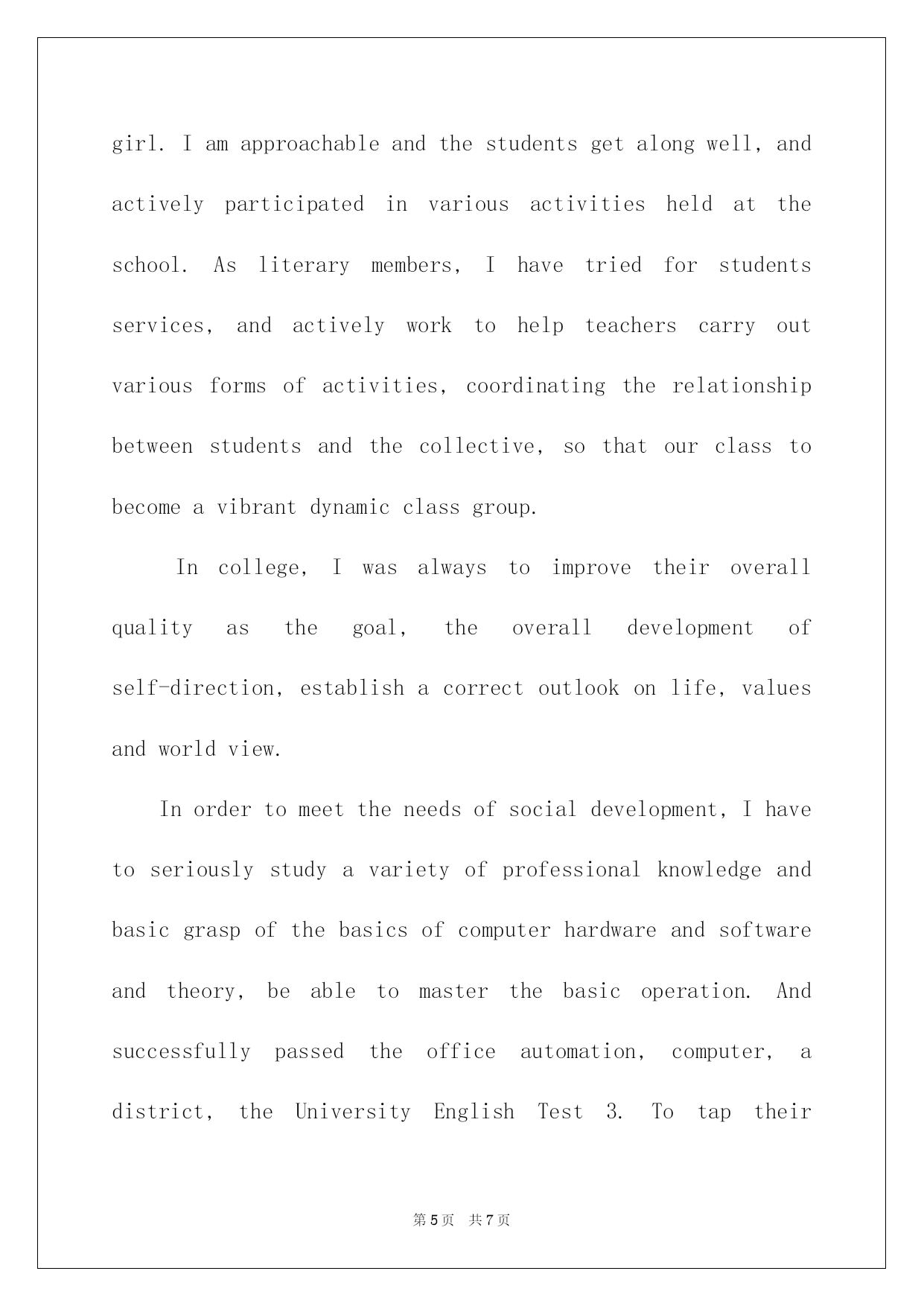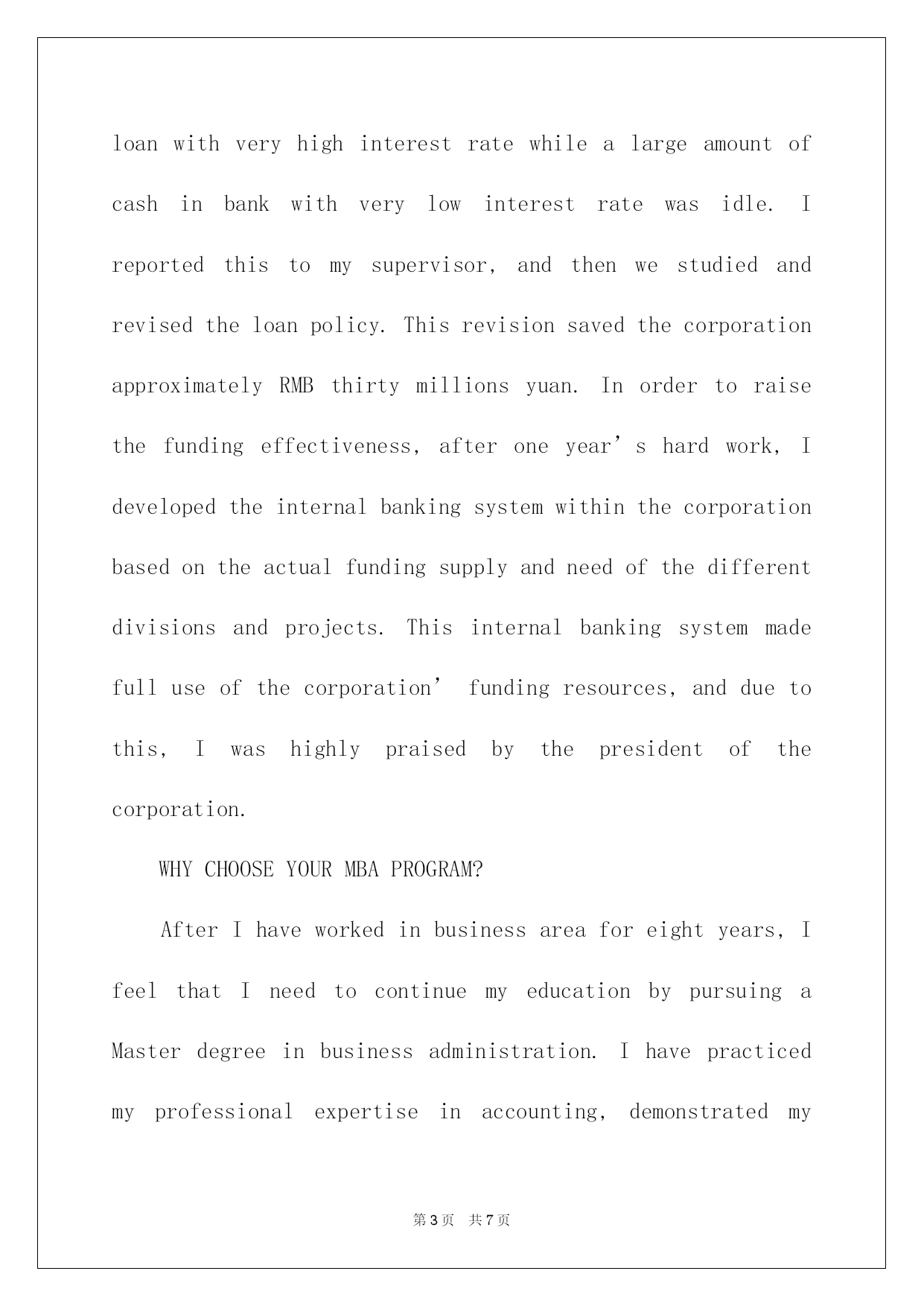 第PAGE\*Arabic\*MERGEFORMAT7页共NUMPAGES\*Arabic\*MERGEFORMAT7页第PAGE\*MERGEFORMAT7页共NUMPAGES\*MERGEFORMAT7页第PAGE\*MERGEFORMAT7页共NUMPAGES\*MERGEFORMAT7页第PAGE\*MERGEFORMAT7页共NUMPAGES\*MERGEFORMAT7页第PAGE\*MERGEFORMAT7页共NUMPAGES\*MERGEFORMAT7页第PAGE\*MERGEFORMAT7页共NUMPAGES\*MERGEFORMAT7页第PAGE\*MERGEFORMAT7页共NUMPAGES\*MERGEFORMAT7页第PAGE\*MERGEFORMAT7页共NUMPAGES\*MERGEFORMAT7页第PAGE\*MERGEFORMAT7页共NUMPAGES\*MERGEFORMAT7页第PAGE\*MERGEFORMAT7页共NUMPAGES\*MERGEFORMAT7页第PAGE\*MERGEFORMAT7页共NUMPAGES\*MERGEFORMAT7页2022博士研究生入学英文自我介绍博士探讨生入学英文自我介绍导语:自我介绍要留意限制说话的'速度,不要一惊慌就磕磕绊绊或者吐字不清,影响语言的流畅。IwasborninasmallvillageofShanDongProvinceonApril4th,1968.WhenIwasyoung,myfamilywasverypoor,soIhadtoworktoearnmoneytohelpmyparentsafterclasswhenIwasinthemiddleschool.In1986IwasadmittedbyUniversityofInternationalbusinessandEconomics(or:UIBE)topursueabachelordegreeinEconomics.MymajorisaccountinginDepartmentofInternationalbusinessManagement.Theundergraduateeducationgavemeawiderangeofvisionandtaughtmehowtocooperatewithothers.IdevelopedseveralprofessionalinterestsinAccounting,Finance,andInternationalTrade.Thefollowingeight-yearworkingexperienceofferedmeagoodchancetogivefullplaytomycreativity,intelligenceanddiligence.In1990-1993,IworkedasanassistanttofundingmanagerinChinaNationalTechnicalImportandExportCorporation.In1993-present,IwasemployedbyChinaKingdomImportandExportCorporationtobetheMangerofFinancialandAccountingDivision.Idobelievethatwithmyhardearlylife,solideducationalbackgroundandampleworkingexperience,IwouldbeanexcellentstudentofyouMBAprogram.MYPERSONALACCOMPLISHMENT:AftergraduatingfromUIBE,IwasemployedastheassistanttothefundingmanagerbyChinaNationalTechnicalImportandExportCorporation.Afterreadingalotofrelatedfiles,andanalyzingtheoverallfundingsituationofthecorporation,Ifoundthattheloanpolicywasnotbeenputintoeffect.SowehavethousandsofmillionsRMBloanwithveryhighinterestratewhilealargeamountofcashinbankwithverylowinterestratew