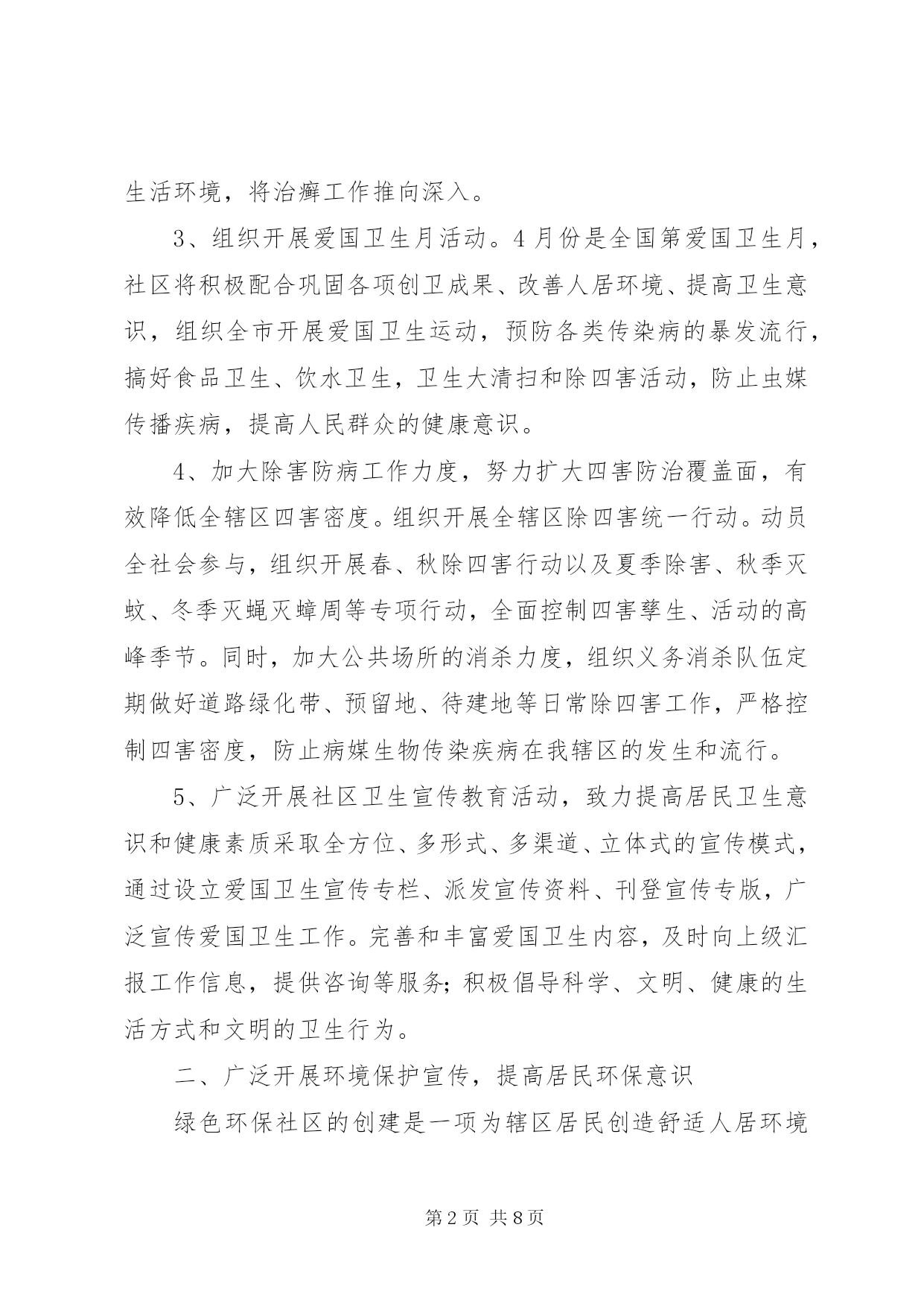 第PAGE\*Arabic\*MERGEFORMAT8页共NUMPAGES\*MERGEFORMAT8页XX年社区公共卫生工作计划2017年社区公共卫生工作计划(一)在即将过去的20xx年里我社区卫生工作,以营造整洁优美的市容环境为目标,发动组织居民群众和社区多方力量,在社区内大力开展爱国卫生运动,全面整治环境,消除四害,清理乱张贴,加强环保工作,创建绿色社区,开展全方位、多形式的宣传活动,不断提高居民的健康意识和文明意识,工作取得了一定的成效,为了巩固所取得的成绩,落实环境卫生长效管理机制,社区制定了20xx年社区卫生各项工作计划如下:一、全面加强社区卫生长效管理,促进环境卫生整体水平不断提高1、加强对社区居民小区环境卫生的监督检查,组织发动广大群众做好巩固和发展创建成果的工作。持之以恒的开展周末卫生劳动活动,集中清理乱堆放和清除卫生死角,通过街道干部、社区工作人员周末卫生劳动带动辖区单位、群众共同参与创建国家文明卫生XX县区工作中来。2、继续开展整治乱张贴、非法小广告牛皮癣活动,采取包干包段和集中行动的方法,对辖区内所有楼院、小街巷等处的乱张贴进行清理整治。建立长效机制,要求社区保洁员在保洁时,发现一处清除一处,并定期检查。加强宣传,鼓励居民向社区、城管举报乱张贴者等。努力为广大居民群众营造一个文明整洁的生活环境,将治癣工作推向深入。3、组织开展爱国卫生月活动。4月份是全国第爱国卫生月,社区将积极配合巩固各项创卫成果、改善人居环境、提高卫生意识,组织全市开展爱国卫生运动,预防各类传染病的暴发流行,搞好食品卫生、饮水卫生,卫生大清扫和除四害活动,防止虫媒传播疾病,提高人民群众的健康意识。4、加大除害防病工作力度,努力扩大四害防治覆盖面,有效降低全辖区四害密度。组织开展全辖区除四害统一行动。动员全社会参与,组织开展春、秋除四害行动以及夏季除害、秋季灭蚊、冬季灭蝇灭蟑周等专项行动,全面控制四害孳生、活动的高峰季节。同时,加大公共场所的消杀力度,组织义务消杀队伍定期做好道路绿化带、预留地、待建地等日常除四害工作,严格控制四害密度,防止病媒生物传染疾病在我辖区的发生和流行。5、广泛开展社区卫生宣传教育活动,致力提高居民卫生意识和健康素质采取全方位、多形式、多渠道、立体式的宣传模式,通过设立爱国卫生宣传专栏、派发宣传资料、刊登宣传专版,广泛宣传爱国卫生工作。完善和丰富爱国卫生内容,及时向上级汇报工作信息,提供咨询等服务;积极倡导科学、文明、健康的生活方式和文明的卫生行为。二、广泛开展环境保护宣传,提高居民环保意识绿色环保社区的创建是一项为辖区居民创造舒适人居环境的工作,同时也是一项具体事务性工作,需要辖区单位、社区居民的共同参与,需要全体社区成员的共同维护。为此社区将积极配合区、街环保、卫生、城管部门加强对辖区单位环境保护工作的检查和督促。为引导广大社区居民的文明生活方式,社区将组织志愿者队伍,定期开展活动。倡议广大的社区居民使用环保、无公害的产品,选择绿色的生活方式,自觉控制生活中的垃圾、噪声、污水、油烟的排放。在社区内各小区和宿舍楼道倡导使用节能灯,公共场所使用节能水龙头等。三、大力开展社区绿化工作社区绿化工作是环境保护的重要内容。社区将重视抓好社区绿化工作。与社区各单位和小区物业部门签订园林绿化养护管理目标责任书,督促各小区配备专业的园艺技术员,配备有关工具。发动社区居民共同对社区内树木、花草进行细心的管理,使社区的绿化覆盖率达30%以上。不断提升创建绿色社区工作的水平。总之20xx年,我社区环境卫生工作要全面落实贯彻科学发展观,积极做好爱国卫生工作,不断提高卫生水平。社区干部和居民群众齐抓共管,齐心协力,确保全年环境卫生各项工作任务的圆满完成。2017年社区公共卫生工作计划(二)20xx年是推进医改工作的关键之年,为落实好党的民生工程,积极稳妥推进乡村一体化建设,提高公共卫生服务和突发公共卫生事件应急处置能力,使全镇人民逐步享有均等化的公共卫生服务。根据全县卫生工作会议和镇第十四次党代会精神,结合我镇实际,特制定20xx年公共卫生工作计划。一、加强组织管理,健全各项工作制度。建立由镇政府领导,中心卫生院为主体,乡村医生为基础、村级卫生力量为补充的新型农村公共卫生服务体系。由镇公共卫生管理员具体负责卫生工作的日常管理与协调。各村妇女主任兼任公共卫生信息员,配合村卫生室做好本村的环境卫生、改水改厕、健康宣教、企业卫生、集体聚餐、食品药品等健康相关产品的巡查、信息报告,协助辖区专业保健人员做好本村常住人口及流动人口的妇幼卫生管理、免疫规范工作。中心卫生院将进一步加强领导,组建责任医生团队,指导对本辖区内的公共卫生工作规范有序开展。村卫生室在中心卫生院统一管理下,承担行政村的基本公共卫生服务和基本医疗服务。二