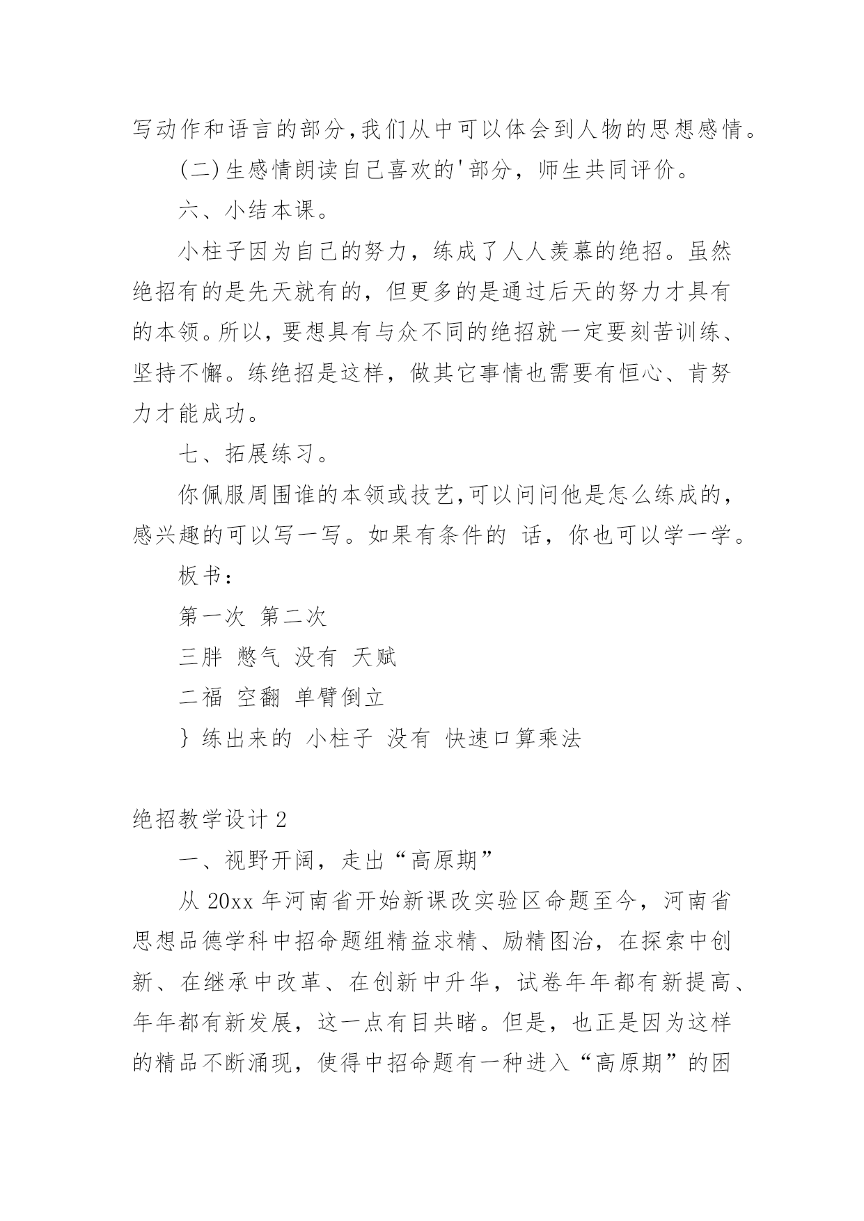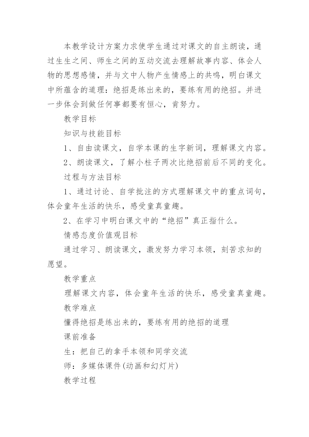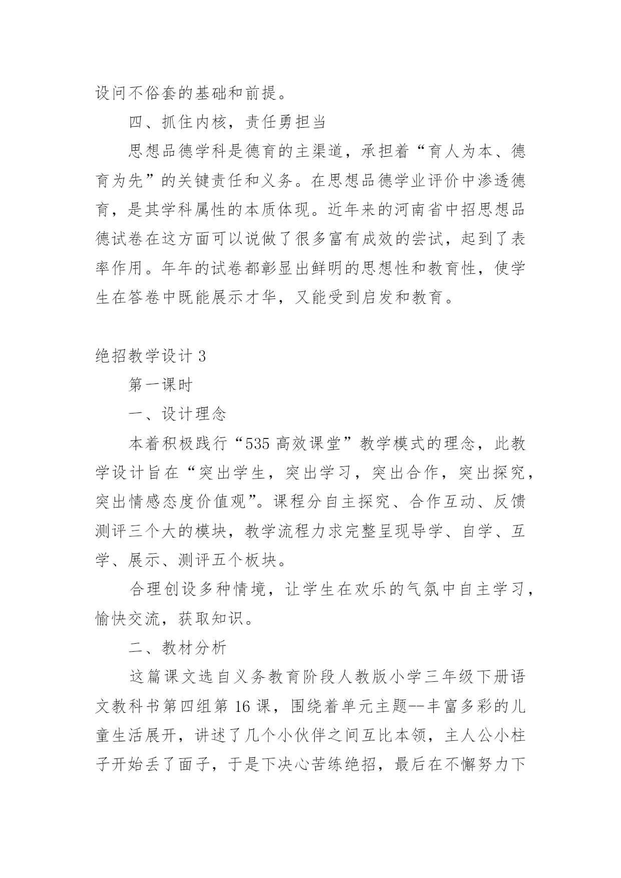 绝招教学设计作为一名教学工作者,就难以避免地要准备教学设计,教学设计把教学各要素看成一个系统,分析教学问题和需求,确立解决的程序纲要,使教学效果最优化。那么写教学设计需要注意哪些问题呢?下面是小编整理的绝招教学设计,仅供参考,希望能够帮助到大家。绝招教学设计1教学内容义务教育课程标准实验教科书语文三年级下册第四单元第16课《绝招》学情分析由于学生有着与文中孩子们相似的生活环境和生活体验,所以学生对本课的学习一定很感兴趣。再加上学生已经具备了初步的阅读理解能力,所以本节课读懂课文不是难点。关键要引导学生理解绝招是练出来的,做任何事都要有恒心。同时,有感情地朗读也要作为一个重点来训练。教材分析本课是一篇略读课文。课文描写几个小伙伴在一起比绝招的趣事。这篇课文富有童趣,文中描写的每个人物形象都很真实、生动,让学生产生亲切感。文章语言生动有趣,非常适合有感情朗读。设计理念本教学设计方案力求使学生通过对课文的自主朗读,通过生生之间、师生之间的互动交流去理解故事内容、体会人物的思想感情,并与文中人物产生情感上的共鸣,明白课文中所蕴含的道理:绝招是练出来的,要练有用的绝招。并进一步体会到做任何事都要有恒心,肯努力。教学目标知识与技能目标1、自由读课文,自学本课的生字新词,理解课文内容。2、朗读课文,了解小柱子两次比绝招前后不同的变化。过程与方法目标1、通过讨论、自学批注的方式理解课文中的重点词句,体会童年生活的快乐,感受童真童趣。2、在学习中明白课文中的“绝招”真正指什么。情感态度价值观目标通过学习、朗读课文,激发努力学习本领,刻苦求知的愿望。教学重点理解课文内容,体会童年生活的快乐,感受童真童趣。教学难点懂得绝招是练出来的,要练有用的绝招的道理课前准备生:把自己的拿手本领和同学交流师:多媒体课件(动画和幻灯片)教学过程一、谈话导入课题。(一)师:老师知道你们都喜欢看动画片,而且还知道你们喜欢谁!(师说几个学生喜欢的动画片中的人物)(二)你们为什么喜欢他呀?他有什么本领?(三)生自由发言(四)师:同学们,这些都是他们的绝招。我们今天学习的课文也和绝招有关(师板书课题:《绝招》,齐读)。(五)理解课题。(生各抒己见后师小结:绝招是一个人很难练成的,了不起的。本领。)二、看动画,了解故事内容。(一)播放动画课件,学生边看边想:故事中讲了一件什么事,都有谁,他们几次比绝招,比了什么。(二)生自由回答,师归纳板书:第一次第二次三胖憋气没有二福空翻单臂倒立小柱子没有快速口算乘法三、初读课文,读准字音。过渡语:刚才的故事就发生在咱们的课文中。赶快打开课本去看看吧!请你用喜欢的方式读课文,注意把课文读正确、读通顺,遇到难读的字词,多读几次。(一)学生自由读课文。(二)出示下列词语,检查认读情况:憋气腮帮子蔫蔫铲馅攥饺子攥得快尴尬撇到下巴颏咧开羡慕握拳1、生自读。2、指名读。3、齐读。四、再读课文,激发努力学习本领,刻苦求知的愿望。(一)说说你最佩服谁的绝招并找出相关语句读一读(指导读出小伙伴们的自信)。(二)大家的绝招都是怎么来的呢?1、生自由发言,师总结板书:天赋练出来的2、小柱子是怎么练绝招的?提示;当小伙伴们都在玩耍时,小柱子在();当练习遇到困难时,小柱子();为了学得更好,小柱子还经常去请教();……(1)生自由发言。(2)师总结:正是有了这份努力与坚持,小柱子才练成了让大家羡慕的绝招,谁来夸夸小柱子?3、小柱子为什么说要练有用的绝招呢?生讨论后师总结:只有有用的绝招才值得我们花时间和精力去练习。五、指导有感情地朗读课文。(一)提示:课文中有许多写得很精彩的地方,尤其是描写动作和语言的部分,我们从中可以体会到人物的思想感情。(二)生感情朗读自己喜欢的'部分,师生共同评价。六、小结本课。小柱子因为自己的努力,练成了人人羡慕的绝招。虽然绝招有的是先天就有的,但更多的是通过后天的努力才具有的本领。所以,要想具有与众不同的绝招就一定要刻苦训练、坚持不懈。练绝招是这样,做其它事情也需要有恒心、肯努力才能成功。七、拓展练习。你佩服周围谁的本领或技艺,可以问问他是怎么练成的,感兴趣的可以写一写。如果有条件的话,你也可以学一学。板书:第一次第二次三胖憋气没有天赋二福空翻单臂倒立}练出来的小柱子没有快速口算乘法绝招教学设计2一、视野开阔,走出“高原期”从20xx年河南省开始新课改实验区命题至今,河南省思想品德学科中招命题组精益求精、励精图治,在探索中创新、在继承中改革、在创新中升华,试卷年年都有新提高、年年都有新发展,这一点有目共睹。但是,也正是因为这样的精品不断涌现,使得中招命题有一种进入“高原期”的困惑――试卷无论是形式还是内容、无论是背景材料还是设问、无论是卷首语还是温馨提示、无论是文字还是图片,都达到了相当高的境界,要想有新的突破,真的很不容易。20