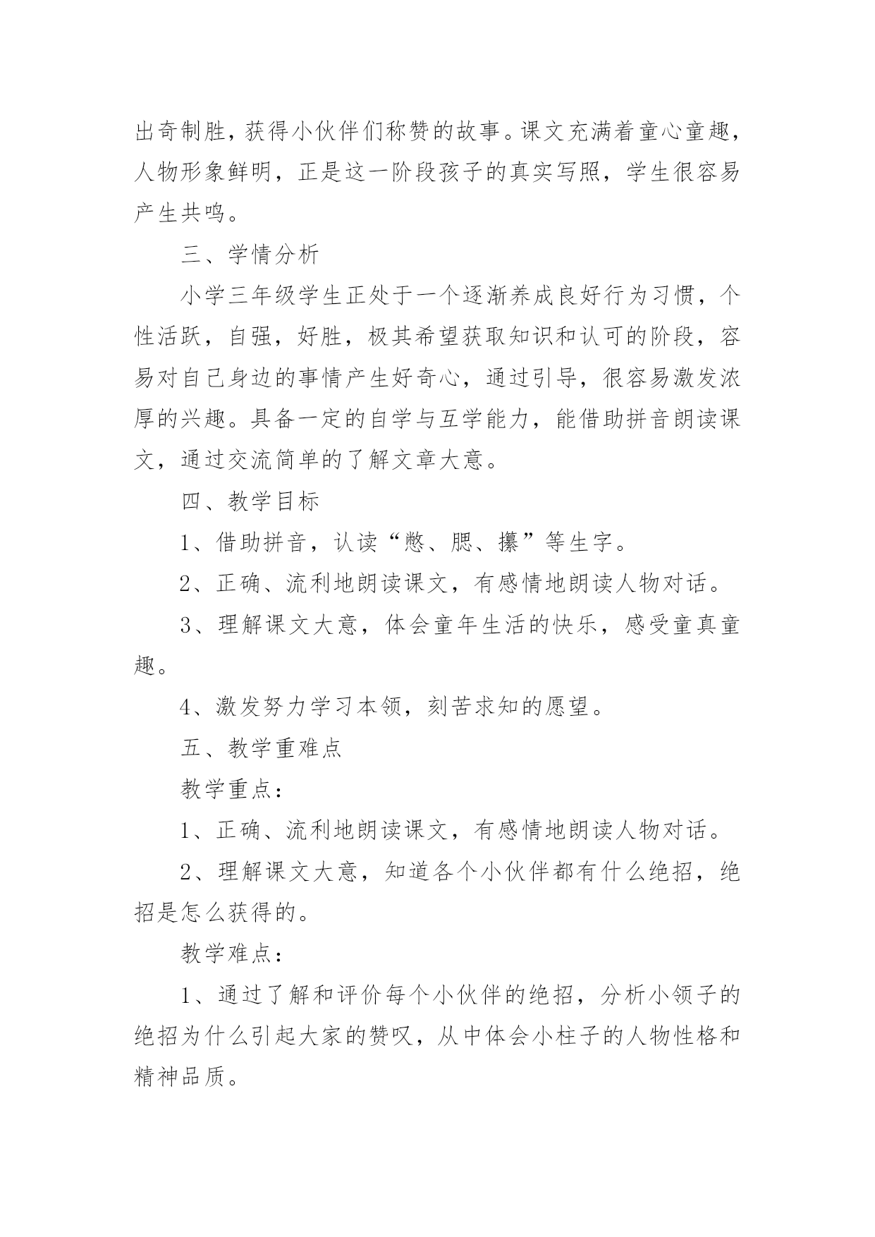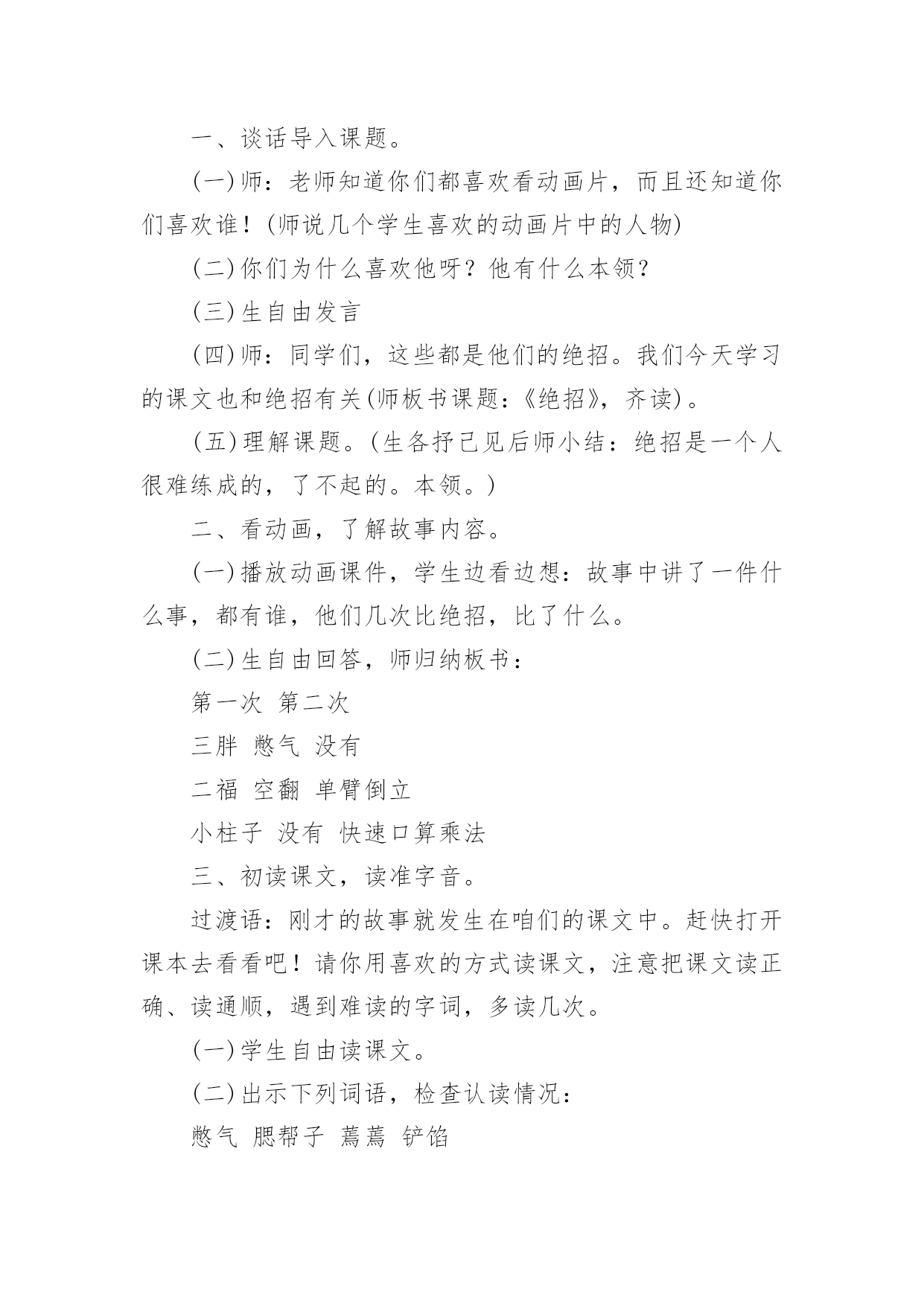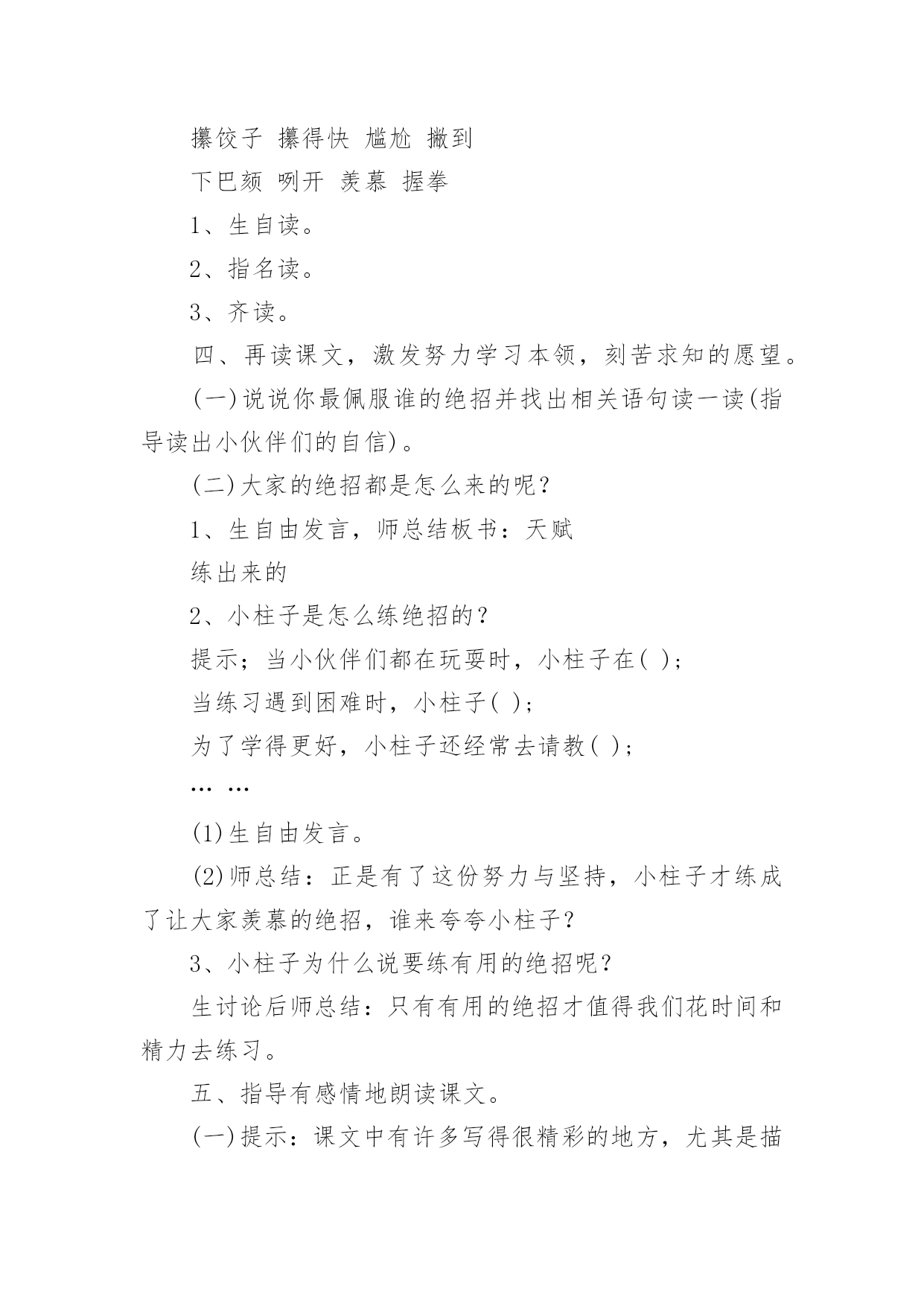绝招教学设计作为一名教学工作者,就难以避免地要准备教学设计,教学设计把教学各要素看成一个系统,分析教学问题和需求,确立解决的程序纲要,使教学效果最优化。那么写教学设计需要注意哪些问题呢?下面是小编整理的绝招教学设计,仅供参考,希望能够帮助到大家。绝招教学设计1教学内容义务教育课程标准实验教科书语文三年级下册第四单元第16课《绝招》学情分析由于学生有着与文中孩子们相似的生活环境和生活体验,所以学生对本课的学习一定很感兴趣。再加上学生已经具备了初步的阅读理解能力,所以本节课读懂课文不是难点。关键要引导学生理解绝招是练出来的,做任何事都要有恒心。同时,有感情地朗读也要作为一个重点来训练。教材分析本课是一篇略读课文。课文描写几个小伙伴在一起比绝招的趣事。这篇课文富有童趣,文中描写的每个人物形象都很真实、生动,让学生产生亲切感。文章语言生动有趣,非常适合有感情朗读。设计理念本教学设计方案力求使学生通过对课文的自主朗读,通过生生之间、师生之间的互动交流去理解故事内容、体会人物的思想感情,并与文中人物产生情感上的共鸣,明白课文中所蕴含的道理:绝招是练出来的,要练有用的绝招。并进一步体会到做任何事都要有恒心,肯努力。教学目标知识与技能目标1、自由读课文,自学本课的生字新词,理解课文内容。2、朗读课文,了解小柱子两次比绝招前后不同的变化。过程与方法目标1、通过讨论、自学批注的方式理解课文中的重点词句,体会童年生活的快乐,感受童真童趣。2、在学习中明白课文中的“绝招”真正指什么。情感态度价值观目标通过学习、朗读课文,激发努力学习本领,刻苦求知的愿望。教学重点理解课文内容,体会童年生活的快乐,感受童真童趣。教学难点懂得绝招是练出来的,要练有用的绝招的道理课前准备生:把自己的拿手本领和同学交流师:多媒体课件(动画和幻灯片)教学过程一、谈话导入课题。(一)师:老师知道你们都喜欢看动画片,而且还知道你们喜欢谁!(师说几个学生喜欢的动画片中的人物)(二)你们为什么喜欢他呀?他有什么本领?(三)生自由发言(四)师:同学们,这些都是他们的绝招。我们今天学习的课文也和绝招有关(师板书课题:《绝招》,齐读)。(五)理解课题。(生各抒己见后师小结:绝招是一个人很难练成的,了不起的。本领。)二、看动画,了解故事内容。(一)播放动画课件,学生边看边想:故事中讲了一件什么事,都有谁,他们几次比绝招,比了什么。(二)生自由回答,师归纳板书:第一次第二次三胖憋气没有二福空翻单臂倒立小柱子没有快速口算乘法三、初读课文,读准字音。过渡语:刚才的故事就发生在咱们的课文中。赶快打开课本去看看吧!请你用喜欢的方式读课文,注意把课文读正确、读通顺,遇到难读的字词,多读几次。(一)学生自由读课文。(二)出示下列词语,检查认读情况:憋气腮帮子蔫蔫铲馅攥饺子攥得快尴尬撇到下巴颏咧开羡慕握拳1、生自读。2、指名读。3、齐读。四、再读课文,激发努力学习本领,刻苦求知的愿望。(一)说说你最佩服谁的绝招并找出相关语句读一读(指导读出小伙伴们的自信)。(二)大家的绝招都是怎么来的呢?1、生自由发言,师总结板书:天赋练出来的2、小柱子是怎么练绝招的?提示;当小伙伴们都在玩耍时,小柱子在();当练习遇到困难时,小柱子();为了学得更好,小柱子还经常去请教();……(1)生自由发言。(2)师总结:正是有了这份努力与坚持,小柱子才练成了让大家羡慕的绝招,谁来夸夸小柱子?3、小柱子为什么说要练有用的绝招呢?生讨论后师总结:只有有用的绝招才值得我们花时间和精力去练习。五、指导有感情地朗读课文。(一)提示:课文中有许多写得很精彩的地方,尤其是描写动作和语言的部分,我们从中可以体会到人物的思想感情。(二)生感情朗读自己喜欢的'部分,师生共同评价。六、小结本课。小柱子因为自己的努力,练成了人人羡慕的绝招。虽然绝招有的是先天就有的,但更多的是通过后天的努力才具有的本领。所以,要想具有与众不同的绝招就一定要刻苦训练、坚持不懈。练绝招是这样,做其它事情也需要有恒心、肯努力才能成功。七、拓展练习。你佩服周围谁的本领或技艺,可以问问他是怎么练成的,感兴趣的可以写一写。如果有条件的话,你也可以学一学。板书:第一次第二次三胖憋气没有天赋二福空翻单臂倒立}练出来的小柱子没有快速口算乘法绝招教学设计2一、视野开阔,走出“高原期”从20xx年河南省开始新课改实验区命题至今,河南省思想品德学科中招命题组精益求精、励精图治,在探索中创新、在继承中改革、在创新中升华,试卷年年都有新提高、年年都有新发展,这一点有目共睹。但是,也正是因为这样的精品不断涌现,使得中招命题有一种进入“高原期”的困惑――试卷无论是形式还是内容、无论是背景材料还是设问、无论是卷首语还是温馨提示、无论是文字还是图片,都达到了相当高的境界,要想有新的突破,真的很不容易。20