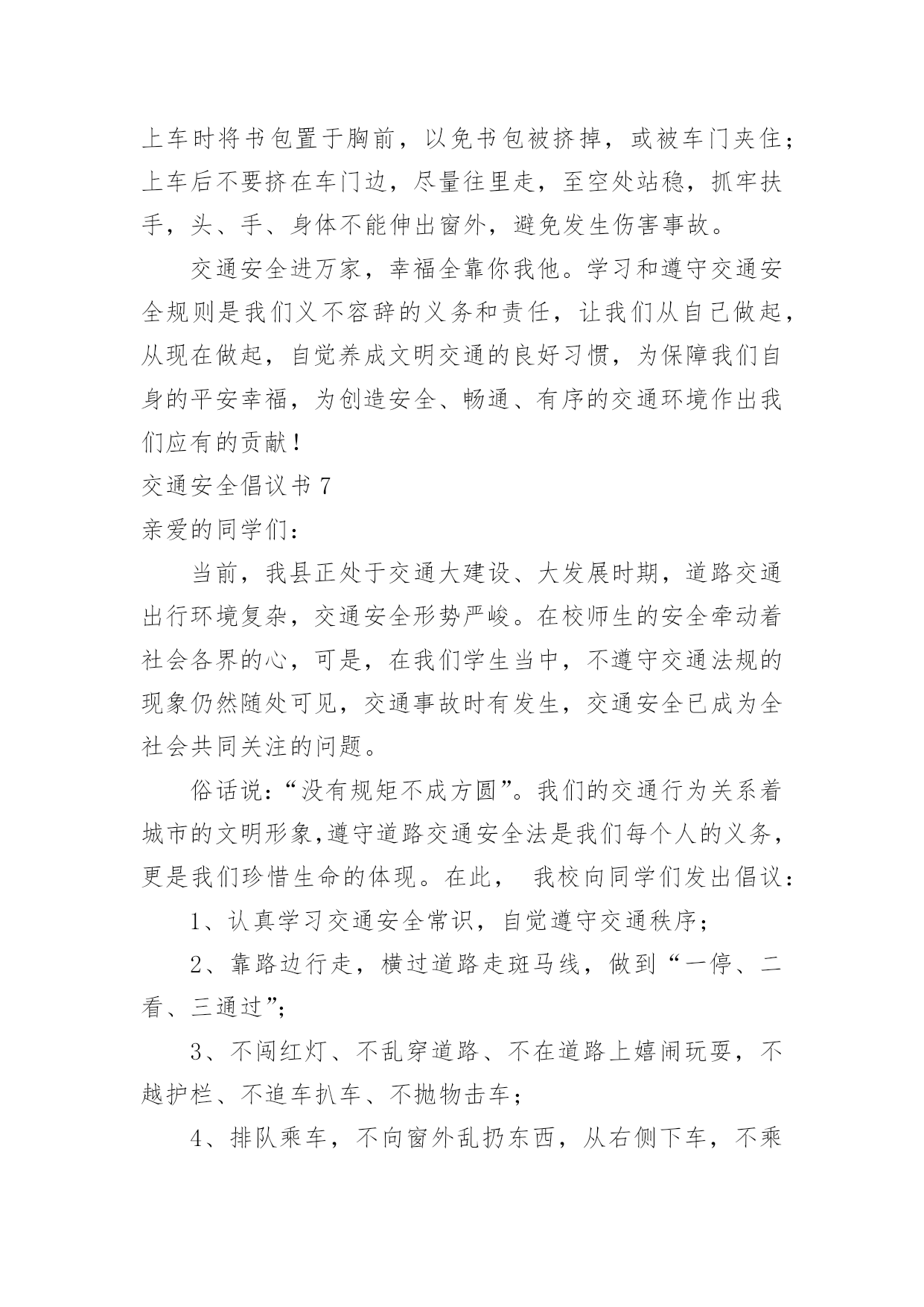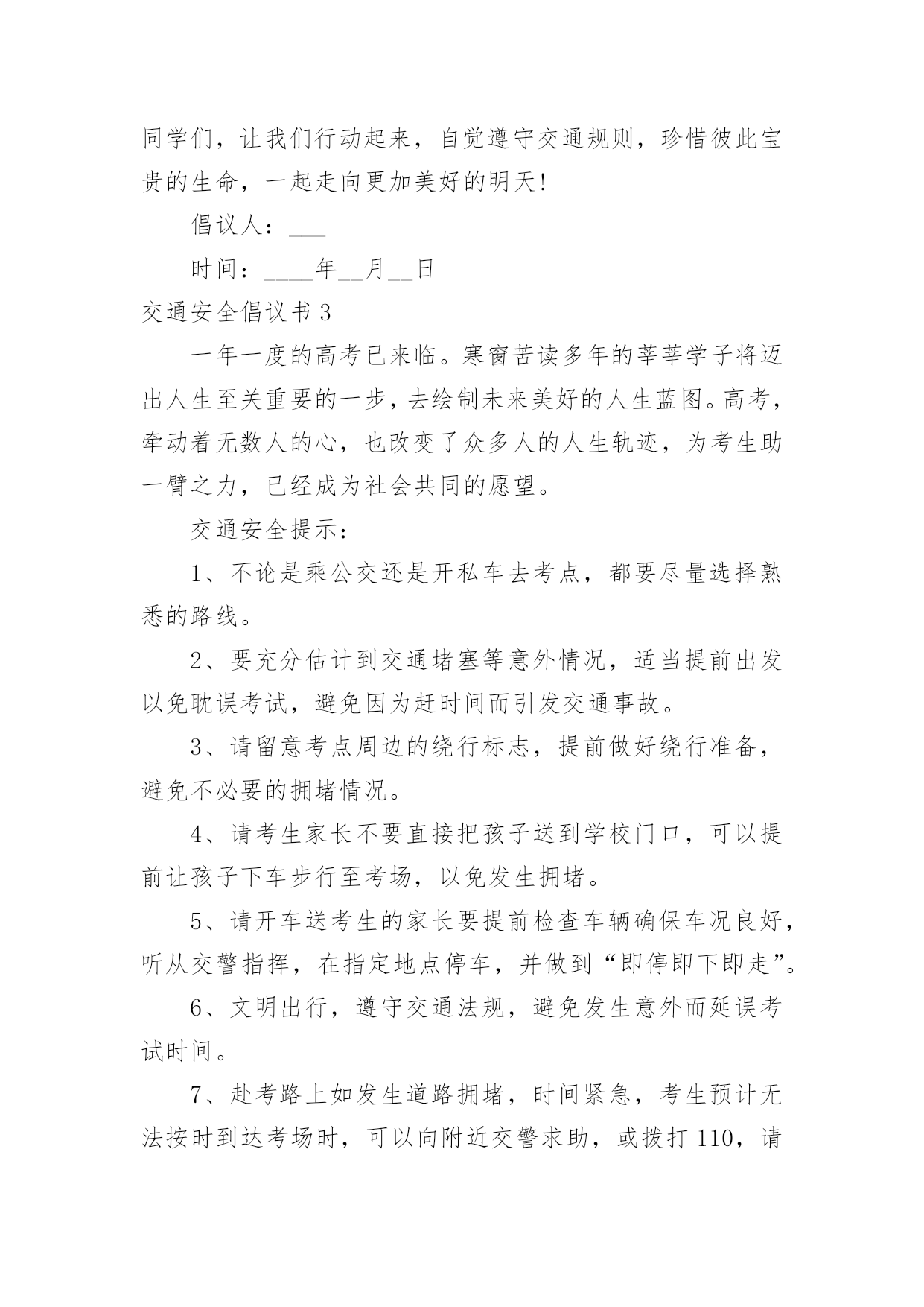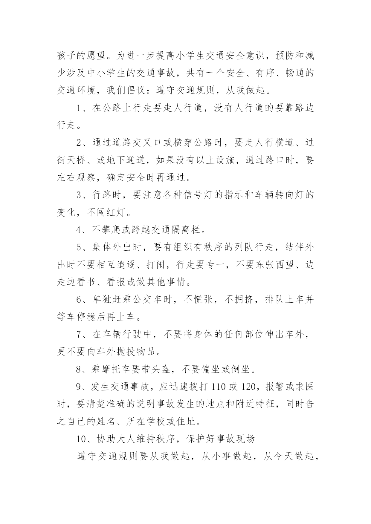 交通安全倡议书交通安全倡议书(15篇)现如今,接触并使用倡议书的人越来越多,倡议书是由某一组织或社团拟定、就某事向社会提出建议或提议社会成员共同去做某事的书面文章。如何写一份恰当的倡议书呢?以下是小编帮大家整理的交通安全倡议书,希望能够帮助到大家。交通安全倡议书1尊敬的市民朋友们:你们好!交通是我们生活中重要的组成部分。与我们的生活密不可分。发达的现代交通在为我们带来便利和舒适的同时,也增加了许多安全隐患。在上下学的路上,我经常会看到一些车辆不遵守交通规则。闯红灯,逆行,不按规定车道行驶等一些不文明的交通行为。别认为这都是些小事,但这些交通隐患和淡薄的安全意识会扼杀宝贵的生命。因此,我们向全体市民们发出倡议:1、在道路上行走时,要在人行道内行走或靠路边行走。不要在道路两侧嬉戏、追逐或长时间逗留,不要突然横过道路。横过道路时,必须从人行横道、天桥及其他行人过街设施通过;在通过人行横道时,也要注意观察来往车辆,加强自身安全防范。2、通过设有交通信号灯和人行横道的路口时,应当注意观察人行横道指示灯,在绿灯亮时通行;通过没有交通信号灯或人行横道的路口,应注意避让通行的车辆,在没有车辆通行的前提下安全通行。3、横过道路要做到:左看、右看、再左看,三次确认保安全,即;左看,确认近处无驶来车辆;再右看,确认远处无车辆通过;再次左看确认安全,才能迅速安全通过。4、年满12周岁才能依法在道路上骑自行车。在道路上骑车时,应在非机动车道或靠路边平稳行驶,不要在道路上相互追逐、扶身并行或脱把骑车,更不要在路中心或机动车道上骑车。5、自觉学习交通安全知识,文明通行,不酒后驾驶、不超速、不违法超车、不疲劳驾驶、不闯红灯、不乱停乱放,驾驶和乘坐二轮摩托车时须戴好安全头盔。交通的文明需要大家共同建设,文明的交通需要大家共同呵护。让我们携起手来,倡导文明交通,树立文明新风,为我市安全、畅通、和谐、文明的交通环境作出自已应有的贡献!昌吉市回民小学20xx年3月交通安全倡议书2___:平平安安出门,快快乐乐回家。这是每一个家庭每一个孩子的愿望。为进一步提高小学生交通安全意识,预防和减少涉及中小学生的交通事故,共有一个安全、有序、畅通的交通环境,我们倡议:遵守交通规则,从我做起。1、在公路上行走要走人行道,没有人行道的要靠路边行走。2、通过道路交叉口或横穿公路时,要走人行横道、过街天桥、或地下通道,如果没有以上设施,通过路口时,要左右观察,确定安全时再通过。3、行路时,要注意各种信号灯的指示和车辆转向灯的变化,不闯红灯。4、不攀爬或跨越交通隔离栏。5、集体外出时,要有组织有秩序的列队行走,结伴外出时不要相互追逐、打闹,行走要专一,不要东张西望、边走边看书、看报或做其他事情。6、单独赶乘公交车时,不慌张,不拥挤,排队上车并等车停稳后再上车。7、在车辆行驶中,不要将身体的任何部位伸出车外,更不要向车外抛投物品。8、乘摩托车要带头盔,不要偏坐或倒坐。9、发生交通事故,应迅速拨打110或120,报警或求医时,要清楚准确的说明事故发生的地点和附近特征,同时告之自己的姓名、所在学校或住址。10、协助大人维持秩序,保护好事故现场遵守交通规则要从我做起,从小事做起,从今天做起,同学们,让我们行动起来,自觉遵守交通规则,珍惜彼此宝贵的生命,一起走向更加美好的明天!倡议人:___时间:____年__月__日交通安全倡议书3一年一度的高考已来临。寒窗苦读多年的莘莘学子将迈出人生至关重要的一步,去绘制未来美好的人生蓝图。高考,牵动着无数人的心,也改变了众多人的人生轨迹,为考生助一臂之力,已经成为社会共同的愿望。交通安全提示:1、不论是乘公交还是开私车去考点,都要尽量选择熟悉的路线。2、要充分估计到交通堵塞等意外情况,适当提前出发以免耽误考试,避免因为赶时间而引发交通事故。3、请留意考点周边的绕行标志,提前做好绕行准备,避免不必要的拥堵情况。4、请考生家长不要直接把孩子送到学校门口,可以提前让孩子下车步行至考场,以免发生拥堵。5、请开车送考生的家长要提前检查车辆确保车况良好,听从交警指挥,在指定地点停车,并做到“即停即下即走”。6、文明出行,遵守交通法规,避免发生意外而延误考试时间。7、赴考路上如发生道路拥堵,时间紧急,考生预计无法按时到达考场时,可以向附近交警求助,或拨打110,请求交警提供帮助。交通安全倡议书4当我们背起行囊,肩负着亲人的希望,怀揣着对未来的美好蓝图,走进凤中美丽校园时;当我们朝气蓬勃,漫步于人来人往的宽阔街道时,你是否注意到隐藏在交通线上的危险呢?一组组惊人的数字、一幕幕惨不忍睹的画面、一个个载着锥心伤痛却又一去不返的年轻生命,这一切的矛头不约而同地指向了共同的事实,不遵守交通法规即是不珍爱自己的生命。我们拥有年轻的身躯、远大的志向,却往往会忽略交通安全这种"小事"