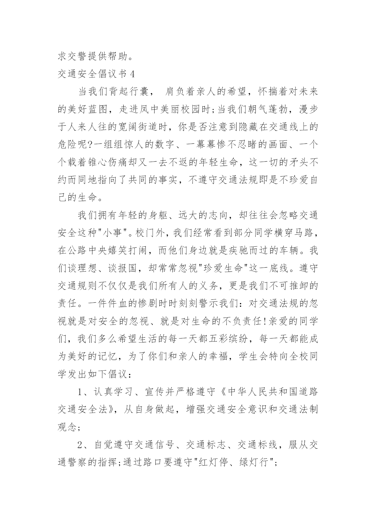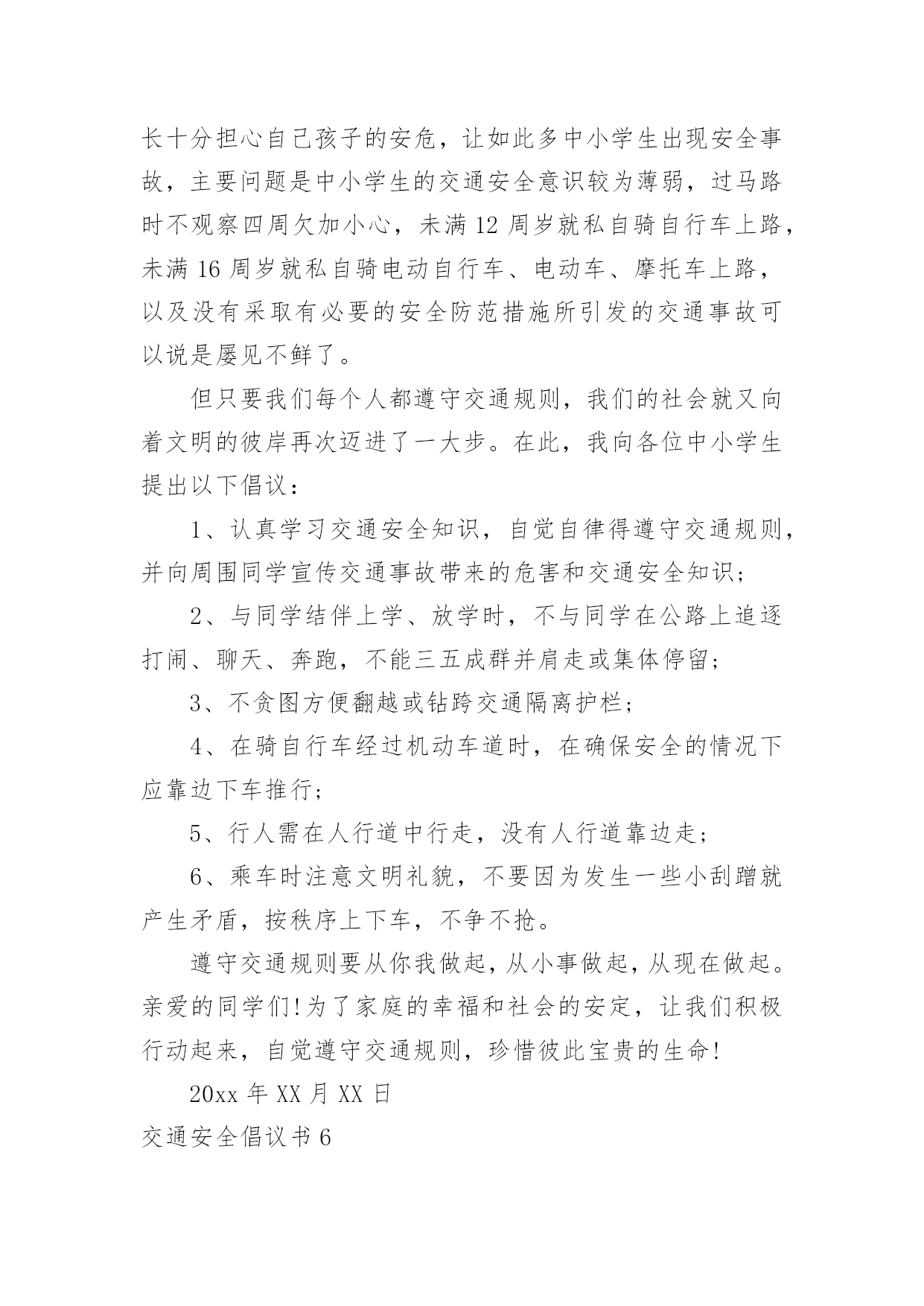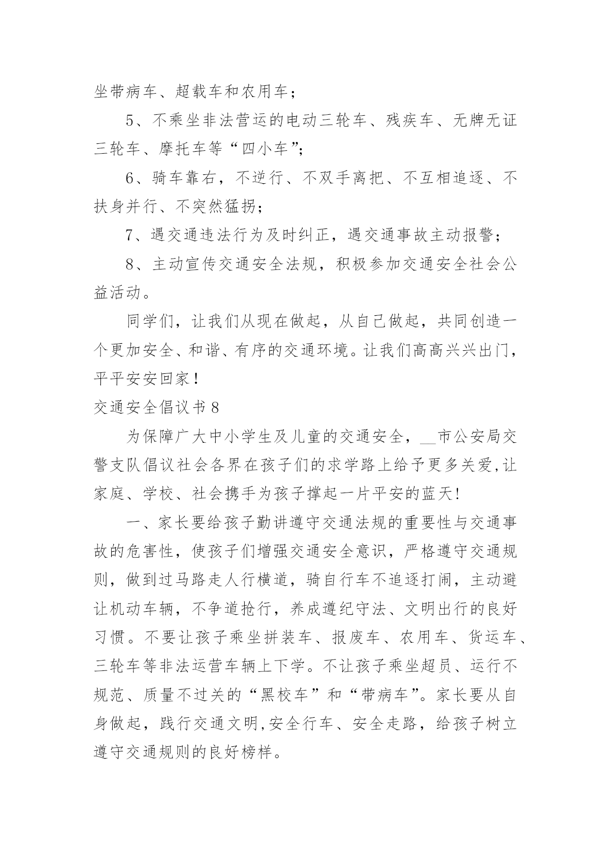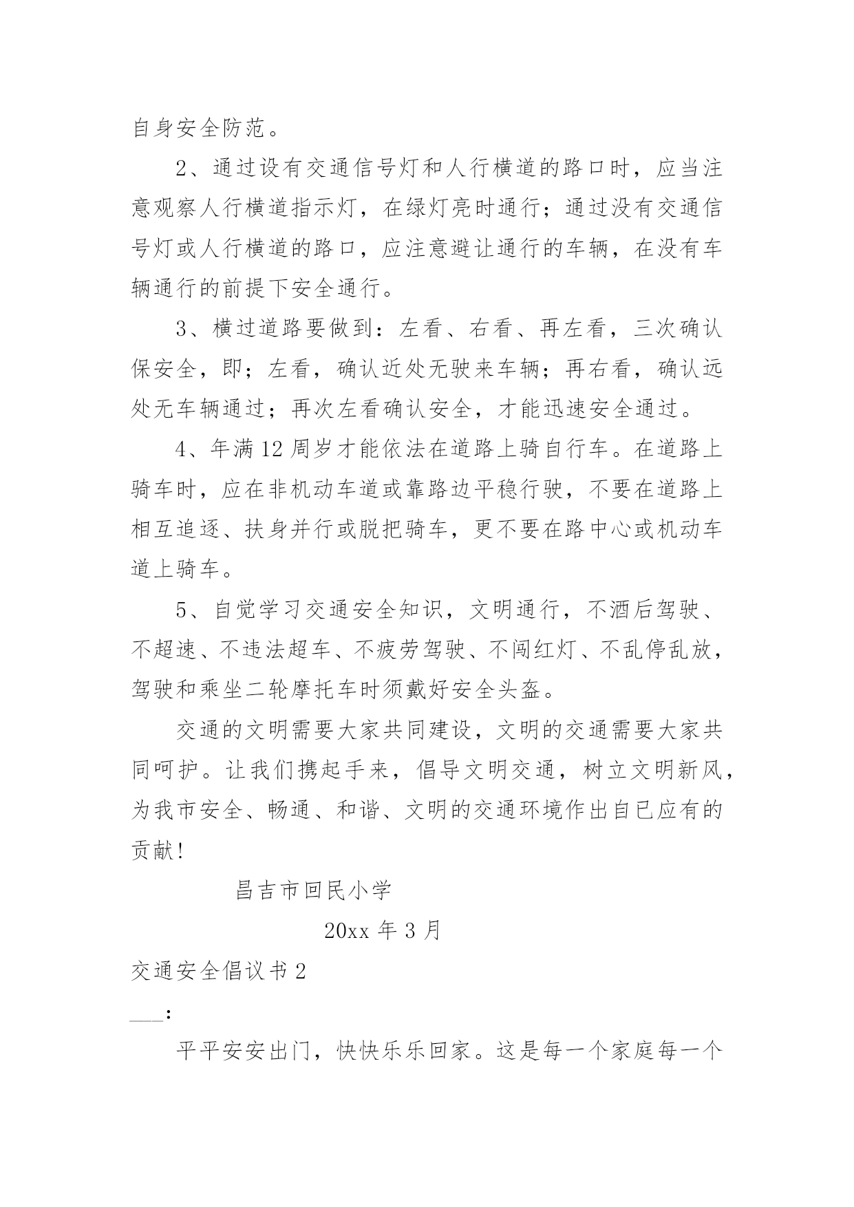 交通安全倡议书交通安全倡议书(15篇)现如今,接触并使用倡议书的人越来越多,倡议书是由某一组织或社团拟定、就某事向社会提出建议或提议社会成员共同去做某事的书面文章。如何写一份恰当的倡议书呢?以下是小编帮大家整理的交通安全倡议书,希望能够帮助到大家。交通安全倡议书1尊敬的市民朋友们:你们好!交通是我们生活中重要的组成部分。与我们的生活密不可分。发达的现代交通在为我们带来便利和舒适的同时,也增加了许多安全隐患。在上下学的路上,我经常会看到一些车辆不遵守交通规则。闯红灯,逆行,不按规定车道行驶等一些不文明的交通行为。别认为这都是些小事,但这些交通隐患和淡薄的安全意识会扼杀宝贵的生命。因此,我们向全体市民们发出倡议:1、在道路上行走时,要在人行道内行走或靠路边行走。不要在道路两侧嬉戏、追逐或长时间逗留,不要突然横过道路。横过道路时,必须从人行横道、天桥及其他行人过街设施通过;在通过人行横道时,也要注意观察来往车辆,加强自身安全防范。2、通过设有交通信号灯和人行横道的路口时,应当注意观察人行横道指示灯,在绿灯亮时通行;通过没有交通信号灯或人行横道的路口,应注意避让通行的车辆,在没有车辆通行的前提下安全通行。3、横过道路要做到:左看、右看、再左看,三次确认保安全,即;左看,确认近处无驶来车辆;再右看,确认远处无车辆通过;再次左看确认安全,才能迅速安全通过。4、年满12周岁才能依法在道路上骑自行车。在道路上骑车时,应在非机动车道或靠路边平稳行驶,不要在道路上相互追逐、扶身并行或脱把骑车,更不要在路中心或机动车道上骑车。5、自觉学习交通安全知识,文明通行,不酒后驾驶、不超速、不违法超车、不疲劳驾驶、不闯红灯、不乱停乱放,驾驶和乘坐二轮摩托车时须戴好安全头盔。交通的文明需要大家共同建设,文明的交通需要大家共同呵护。让我们携起手来,倡导文明交通,树立文明新风,为我市安全、畅通、和谐、文明的交通环境作出自已应有的贡献!昌吉市回民小学20xx年3月交通安全倡议书2___:平平安安出门,快快乐乐回家。这是每一个家庭每一个孩子的愿望。为进一步提高小学生交通安全意识,预防和减少涉及中小学生的交通事故,共有一个安全、有序、畅通的交通环境,我们倡议:遵守交通规则,从我做起。1、在公路上行走要走人行道,没有人行道的要靠路边行走。2、通过道路交叉口或横穿公路时,要走人行横道、过街天桥、或地下通道,如果没有以上设施,通过路口时,要左右观察,确定安全时再通过。3、行路时,要注意各种信号灯的指示和车辆转向灯的变化,不闯红灯。4、不攀爬或跨越交通隔离栏。5、集体外出时,要有组织有秩序的列队行走,结伴外出时不要相互追逐、打闹,行走要专一,不要东张西望、边走边看书、看报或做其他事情。6、单独赶乘公交车时,不慌张,不拥挤,排队上车并等车停稳后再上车。7、在车辆行驶中,不要将身体的任何部位伸出车外,更不要向车外抛投物品。8、乘摩托车要带头盔,不要偏坐或倒坐。9、发生交通事故,应迅速拨打110或120,报警或求医时,要清楚准确的说明事故发生的地点和附近特征,同时告之自己的姓名、所在学校或住址。10、协助大人维持秩序,保护好事故现场遵守交通规则要从我做起,从小事做起,从今天做起,同学们,让我们行动起来,自觉遵守交通规则,珍惜彼此宝贵的生命,一起走向更加美好的明天!倡议人:___时间:____年__月__日交通安全倡议书3一年一度的高考已来临。寒窗苦读多年的莘莘学子将迈出人生至关重要的一步,去绘制未来美好的人生蓝图。高考,牵动着无数人的心,也改变了众多人的人生轨迹,为考生助一臂之力,已经成为社会共同的愿望。交通安全提示:1、不论是乘公交还是开私车去考点,都要尽量选择熟悉的路线。2、要充分估计到交通堵塞等意外情况,适当提前出发以免耽误考试,避免因为赶时间而引发交通事故。3、请留意考点周边的绕行标志,提前做好绕行准备,避免不必要的拥堵情况。4、请考生家长不要直接把孩子送到学校门口,可以提前让孩子下车步行至考场,以免发生拥堵。5、请开车送考生的家长要提前检查车辆确保车况良好,听从交警指挥,在指定地点停车,并做到“即停即下即走”。6、文明出行,遵守交通法规,避免发生意外而延误考试时间。7、赴考路上如发生道路拥堵,时间紧急,考生预计无法按时到达考场时,可以向附近交警求助,或拨打110,请求交警提供帮助。交通安全倡议书4当我们背起行囊,肩负着亲人的希望,怀揣着对未来的美好蓝图,走进凤中美丽校园时;当我们朝气蓬勃,漫步于人来人往的宽阔街道时,你是否注意到隐藏在交通线上的危险呢?一组组惊人的数字、一幕幕惨不忍睹的画面、一个个载着锥心伤痛却又一去不返的年轻生命,这一切的矛头不约而同地指向了共同的事实,不遵守交通法规即是不珍爱自己的生命。我们拥有年轻的身躯、远大的志向,却往往会忽略交通安全这种"小事"