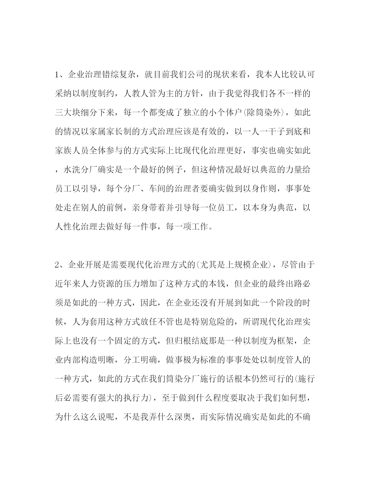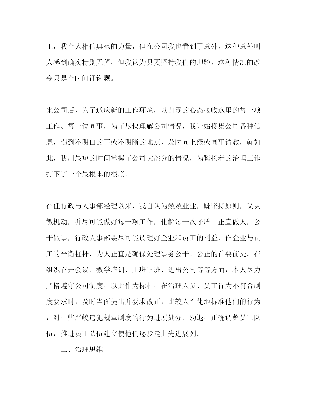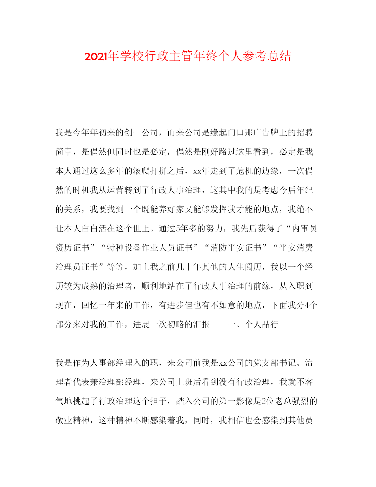 2021年学校行政主管年终个人参考总结我是今年年初来的创一公司,而来公司是缘起门口那广告牌上的招聘简章,是偶然但同时也是必定,偶然是刚好路过这里看到,必定是我本人通过这么多年的滚爬打拼之后,xx年走到了危机的边缘,一次偶然的时机我从运营转到了行政人事治理,这其中我的是考虑今后年纪的关系,我要找到一个既能养好家又能够发挥我才能的地点,我绝不让本人白白活在这个世上。通过5年多的努力,我先后获得了“内审员资历证书”“特种设备作业人员证书”“消防平安证书”“平安消费治理员证书”等等,加上我之前几十年其他的人生阅历,我以一个经历较为成熟的治理者,顺利地站在了行政人事治理的前缘,从入职到现在,回忆一年来的工作,有进步但也有不如意的地点,下面我分4个部分来对我的工作,进展一次初略的汇报一、个人品行我是作为人事部经理入的职,来公司前我是xx公司的党支部书记、治理者代表兼治理部经理,来公司上班后看到没有行政治理,我就不客气地挑起了行政治理这个担子,踏入公司的第一影像是2位老总强烈的敬业精神,这种精神不断感染着我,同时,我相信也会感染到其他员工,我个人相信典范的力量,但在公司我也看到了意外,这种意外叫人感到确实特别无望,但我认为只要坚持我们的理验,这种情况的改变只是个时间征询题。来公司后,为了适应新的工作环境,以归零的心态接收这里的每一项工作、每一位同事,为了尽快理解公司情况,我开始搜集公司各种信息,遇到不明白的事或不明晰的地点,及时向上级或同事请教,就如此,我用最短的时间掌握了公司大部分的情况,为紧接着的治理工作打下了一个最根本的根底。在任行政与人事部经理以来,我自认为兢兢业业,既坚持原则,又灵敏机动,并尽可能做好每一项工作,化解每一次矛盾。正直做人,公平做事,行政人事部要尽可能调理好企业和员工的利益,作企业与员工的平衡杠杆,为人正直是确保处理事务公平、公正的首要前提。在组织召开会议、教学培训、上班下班、进出公司等等方面,本人尽力严格遵守公司制度,以此作为标杆,在治理人员、员工行为不符合制度要求时,及时当面提出并要求改正,比较人性化地标准他们的行为,对一些严峻违犯规章制度的行为进展处分、劝退,正确调整员工队伍,推进员工队伍建立使他们逐步走上先进展列。二、治理思维1、企业治理错综复杂,就目前我们公司的现状来看,我本人比较认可采纳以制度制约,人教人管为主的方针,由于我觉得我们各不一样的三大块细分下来,每一个都变成了独立的小个体户(除筒染外),如此的情况以家属家长制的方式治理应该是有效的,以一人一干子到底和家族人员全体参与的方式实际上比现代化治理更好,事实也确实如此,水洗分厂确实是一个最好的例子,但这种情况最好以典范的力量给员工以引导,每个分厂、车间的治理者要确实做到以身作则,事事处处走在别人的前例,亲身带着并引导每一位员工,以本身为典范,以人性化治理去做好每一件事,每一项工作。2、企业开展是需要现代化治理方式的(尤其是上规模企业),尽管由于近年来人力资源的压力增加了这种方式的本钱,但企业的最终出路必须是如此的一种方式,因此,在企业还没有开展到如此一个阶段的时候,人为套用这种方式放任不管也是特别危险的,所谓现代化治理实际上也没有一个固定的方式,但归根结底那是一种以制度为框架,企业内部构造明晰,分工明确,做事极为标准的事事处处以制度管人的一种方式,如此的方式在我们筒染分厂施行的话根本仍然可行的(施行后必需要有强大的执行力),至于做到什么程度要取决于我们如何想,为什么这么说呢,不是我弄什么深奥,而实际情况确实是如此的不确定,就例如我们做饭,它涉及到加多少水,加多少柴,柴加多了自然就旺,征询题是柴也是有限的。