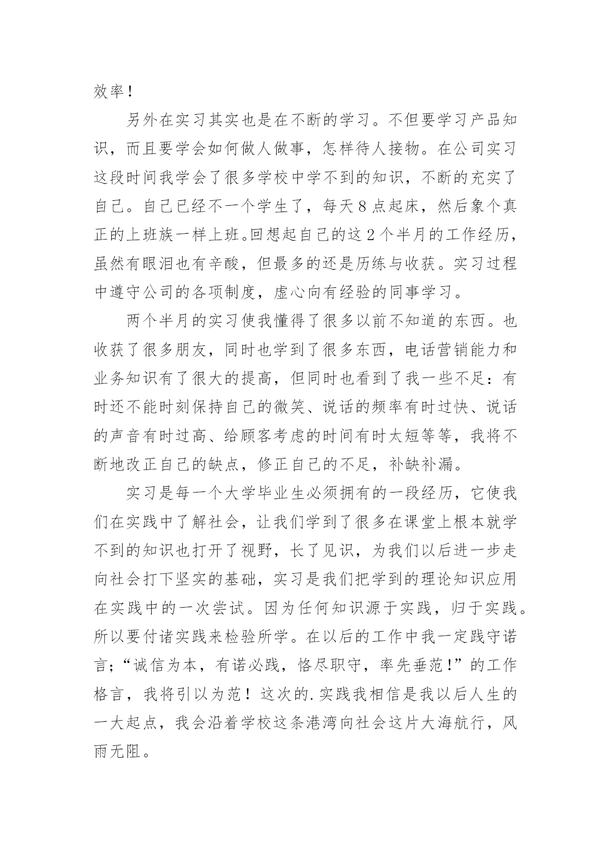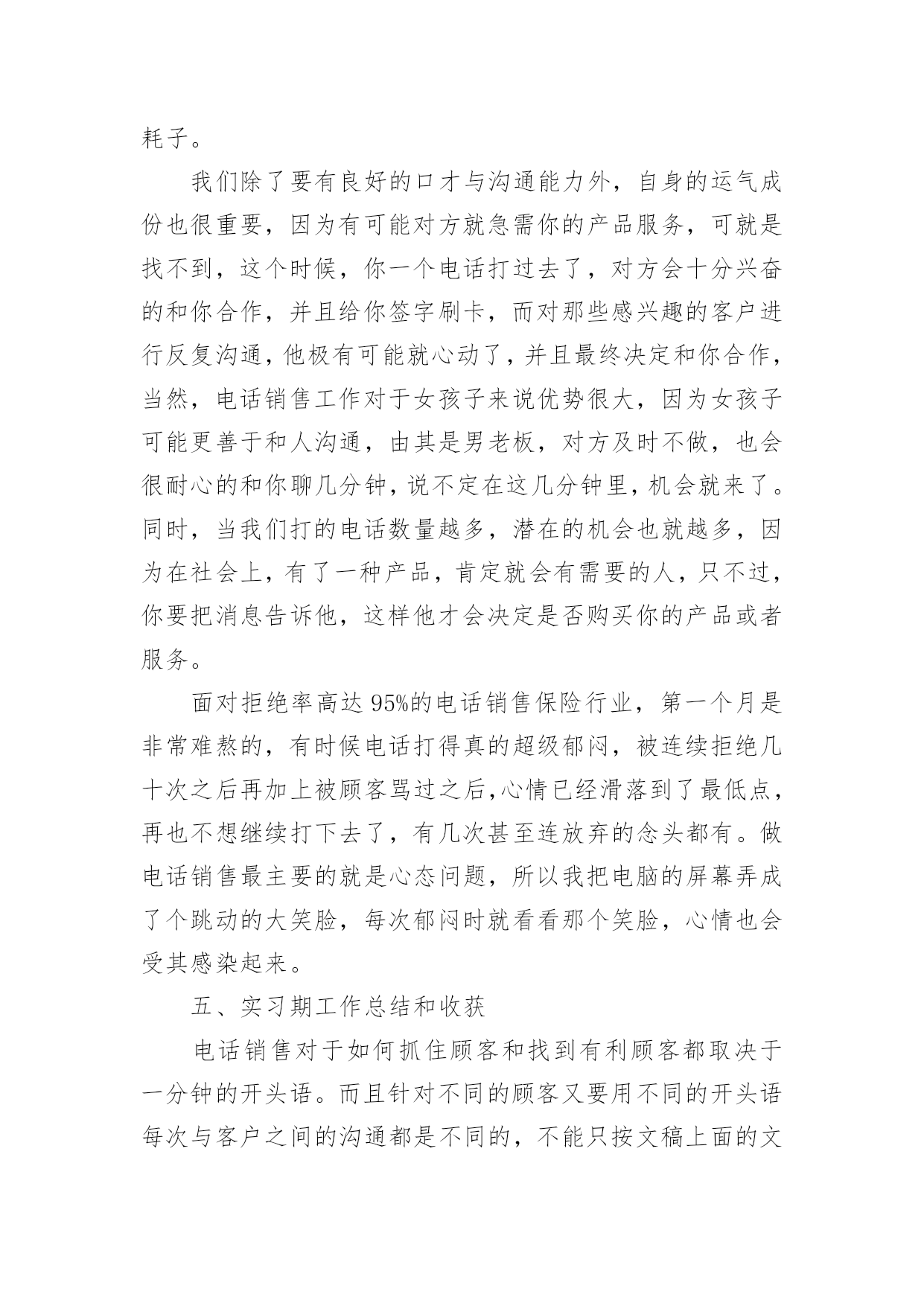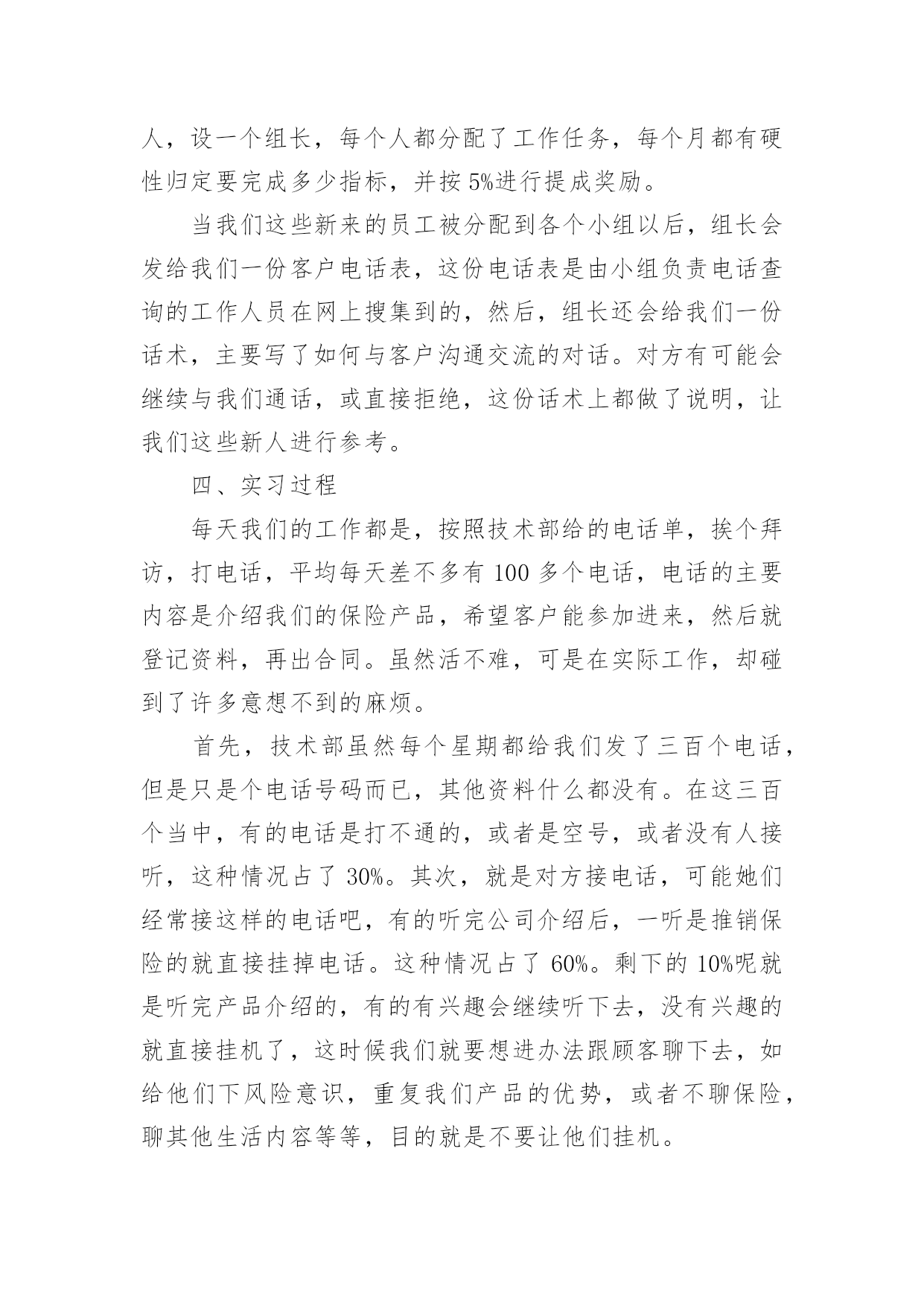 保险公司毕业实习总结总结是事后对某一时期、某一项目或某些工作进行回顾和分析,从而做出带有规律性的结论,它可以给我们下一阶段的学习和工作生活做指导,让我们一起来学习写总结吧。但是却发现不知道该写些什么,以下是小编帮大家整理的保险公司毕业实习总结,希望对大家有所帮助。保险公司毕业实习总结1一、实习时间20xx年xx月xx日二、实习单位简介xx保险公司股东实力强大,涉及行业广泛,股权结构合理,符合现代企业制度。xx保险公司拥有多家专业子公司。xx保险公司秉承“打造品质和实力的保险公司”的公司愿景,以“共同成长”为使命,把“诚信、关爱”、“创造价值”作为核心价值观,坚持“工作激情与管理理性”、“创新与执行”、“团队合作与发挥个人作用”等三个方面高度统一,发扬“战胜自我”的企业精神,以崇高的道德水准、高效健全的管理和高素质、高境界、高度职业化的员工队伍,为客户提供优质稳定的服务,成为高成长性的公司,成为客户首选的公司,成为优秀人才向往的公司。三、实习环境在公司,采取小组工作的形式,每个组有差不多十几个人,设一个组长,每个人都分配了工作任务,每个月都有硬性归定要完成多少指标,并按5%进行提成奖励。当我们这些新来的员工被分配到各个小组以后,组长会发给我们一份客户电话表,这份电话表是由小组负责电话查询的工作人员在网上搜集到的,然后,组长还会给我们一份话术,主要写了如何与客户沟通交流的对话。对方有可能会继续与我们通话,或直接拒绝,这份话术上都做了说明,让我们这些新人进行参考。四、实习过程每天我们的工作都是,按照技术部给的电话单,挨个拜访,打电话,平均每天差不多有100多个电话,电话的主要内容是介绍我们的保险产品,希望客户能参加进来,然后就登记资料,再出合同。虽然活不难,可是在实际工作,却碰到了许多意想不到的麻烦。首先,技术部虽然每个星期都给我们发了三百个电话,但是只是个电话号码而已,其他资料什么都没有。在这三百个当中,有的电话是打不通的,或者是空号,或者没有人接听,这种情况占了30%。其次,就是对方接电话,可能她们经常接这样的电话吧,有的听完公司介绍后,一听是推销保险的就直接挂掉电话。这种情况占了60%。剩下的10%呢就是听完产品介绍的,有的有兴趣会继续听下去,没有兴趣的就直接挂机了,这时候我们就要想进办法跟顾客聊下去,如给他们下风险意识,重复我们产品的优势,或者不聊保险,聊其他生活内容等等,目的就是不要让他们挂机。刚开始打电话的那两天因为是新人,对话术和说话技巧不熟悉,挂机率超级高,比如一周的三百个数据,两天就打光了,一天100多个电话,通时才一个小时多一点点,不能按期完成要打的电话目标话,数据打完了就重复拨打,有些电话被我重复打了四遍,搞得我都不好意思再打电话过去了。还有就是,有时连续打了好十几个电话,对方不是空号,就是直接拒绝你,要是碰上一个态度比较恶劣的人,可能还没说上一句话,就被对方给骂回来了,那个时候我的心情会是非常糟糕的,情绪也很低落,这样的情况,所有同事都碰到过。首先呢,他们要求我们这些新人去听优秀销售人员的录音,然后还原,再模仿他们的话术去跟顾客交流。这样两个星期后,挂机率没有那么高了,基本都能和顾客聊上了,每天的通时也在2个小时以上了。第二周星期五,我一生可能都不会忘记这个时间,幸运之神降临在我身上,我终于出单咯,而且是个8000的大单,那时候兴奋的输入顾客资料时手都是颤抖的。合同是我和小组一个老人陪我亲自送上门的,顾客也顺利签字刷卡了,有了这张单,这个月考核目标也顺利完成了。我的组长经常对我说:“每天要尽可能多打电话,这样潜在的意愿客户就能被发掘出来,就会有收益了”。同时,她还让我把那些对产品感兴趣的用户名字单独列出来,然后隔两天在给对方回电话,进行沟通,这样会好一点。因为电话销售这个工作,有点像守株待兔,或者通俗的说就是碰死耗子。我们除了要有良好的口才与沟通能力外,自身的运气成份也很重要,因为有可能对方就急需你的产品服务,可就是找不到,这个时候,你一个电话打过去了,对方会十分兴奋的和你合作,并且给你签字刷卡,而对那些感兴趣的客户进行反复沟通,他极有可能就心动了,并且最终决定和你合作,当然,电话销售工作对于女孩子来说优势很大,因为女孩子可能更善于和人沟通,由其是男老板,对方及时不做,也会很耐心的和你聊几分钟,说不定在这几分钟里,机会就来了。同时,当我们打的电话数量越多,潜在的机会也就越多,因为在社会上,有了一种产品,肯定就会有需要的人,只不过,你要把消息告诉他,这样他才会决定是否购买你的产品或者服务。面对拒绝率高达95%的电话销售保险行业,第一个月是非常难熬的,有时候电话打得真的超级郁闷,被连续拒绝几十次之后再加上被顾客骂过之后,心情已经滑落到了最低点,再也不想继续打下去了,有几次甚至连放弃的念头都有。做电话销售最主要
