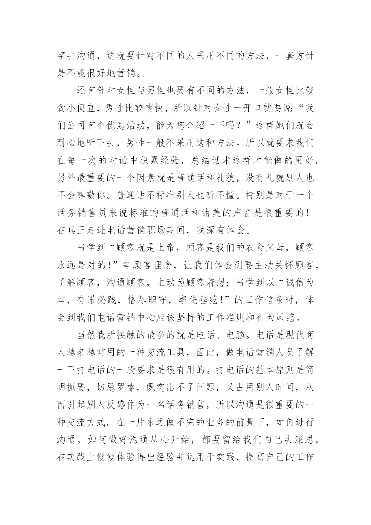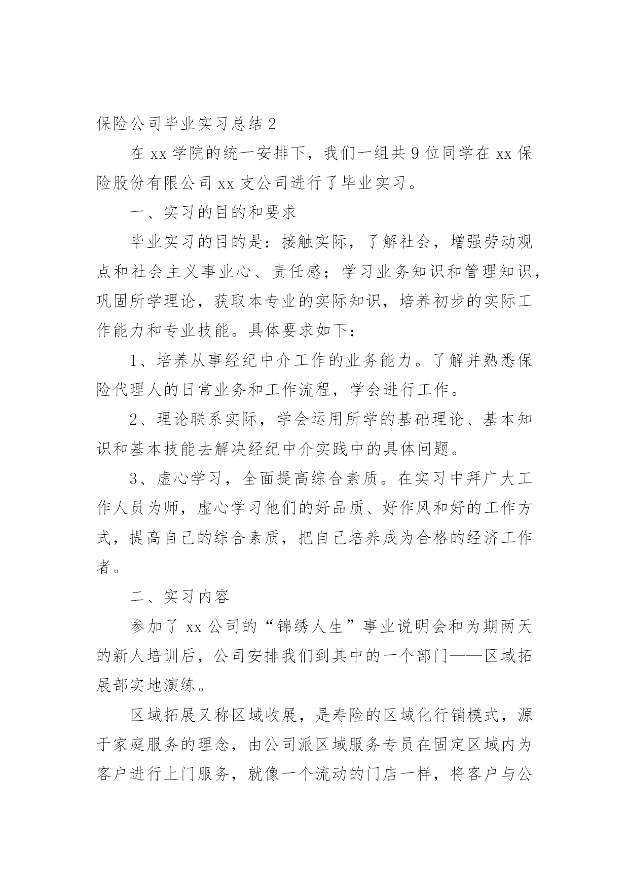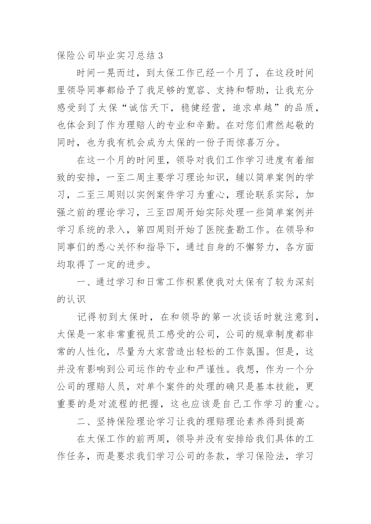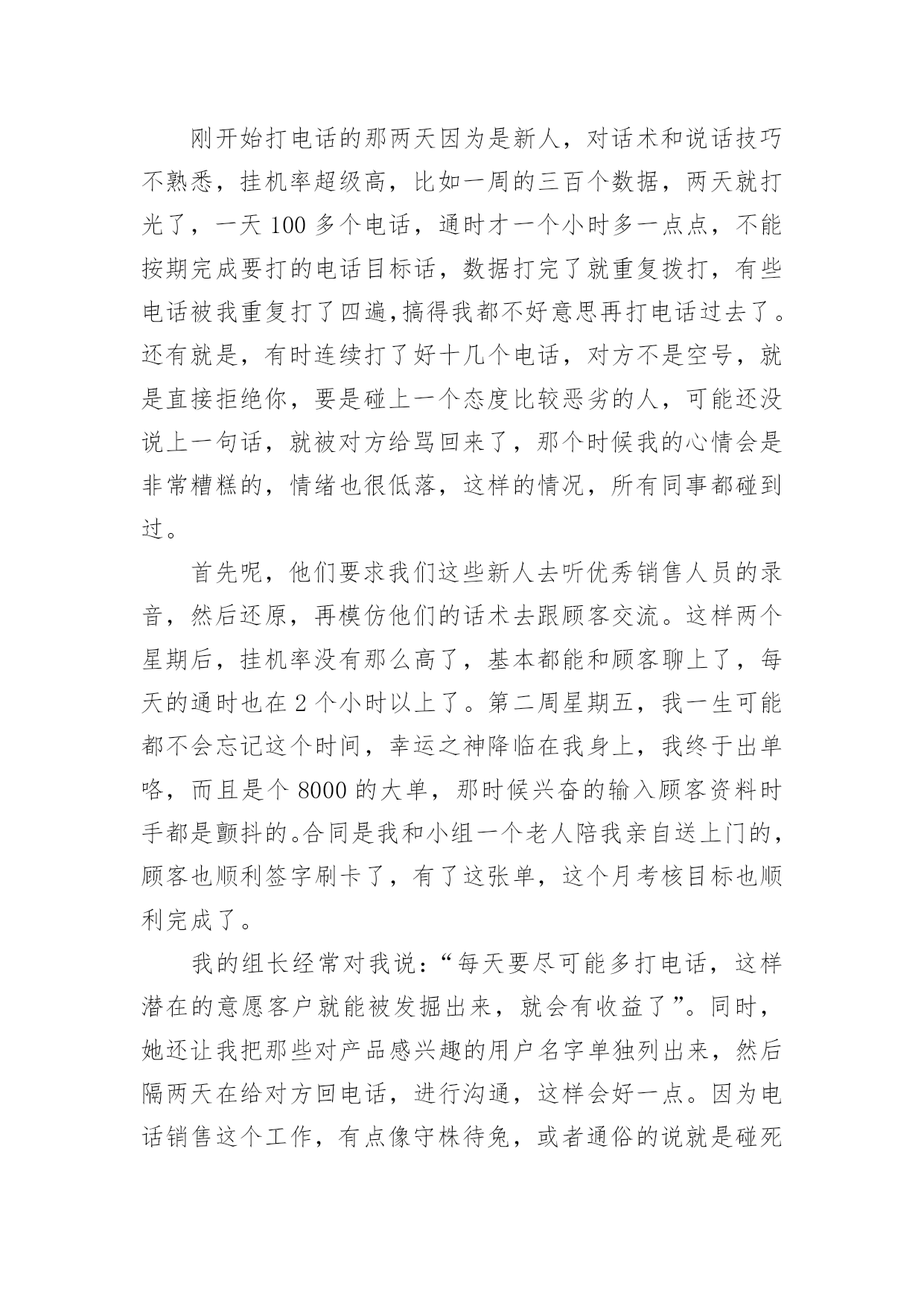 保险公司毕业实习总结总结是事后对某一时期、某一项目或某些工作进行回顾和分析,从而做出带有规律性的结论,它可以给我们下一阶段的学习和工作生活做指导,让我们一起来学习写总结吧。但是却发现不知道该写些什么,以下是小编帮大家整理的保险公司毕业实习总结,希望对大家有所帮助。保险公司毕业实习总结1一、实习时间20xx年xx月xx日二、实习单位简介xx保险公司股东实力强大,涉及行业广泛,股权结构合理,符合现代企业制度。xx保险公司拥有多家专业子公司。xx保险公司秉承“打造品质和实力的保险公司”的公司愿景,以“共同成长”为使命,把“诚信、关爱”、“创造价值”作为核心价值观,坚持“工作激情与管理理性”、“创新与执行”、“团队合作与发挥个人作用”等三个方面高度统一,发扬“战胜自我”的企业精神,以崇高的道德水准、高效健全的管理和高素质、高境界、高度职业化的员工队伍,为客户提供优质稳定的服务,成为高成长性的公司,成为客户首选的公司,成为优秀人才向往的公司。三、实习环境在公司,采取小组工作的形式,每个组有差不多十几个人,设一个组长,每个人都分配了工作任务,每个月都有硬性归定要完成多少指标,并按5%进行提成奖励。当我们这些新来的员工被分配到各个小组以后,组长会发给我们一份客户电话表,这份电话表是由小组负责电话查询的工作人员在网上搜集到的,然后,组长还会给我们一份话术,主要写了如何与客户沟通交流的对话。对方有可能会继续与我们通话,或直接拒绝,这份话术上都做了说明,让我们这些新人进行参考。四、实习过程每天我们的工作都是,按照技术部给的电话单,挨个拜访,打电话,平均每天差不多有100多个电话,电话的主要内容是介绍我们的保险产品,希望客户能参加进来,然后就登记资料,再出合同。虽然活不难,可是在实际工作,却碰到了许多意想不到的麻烦。首先,技术部虽然每个星期都给我们发了三百个电话,但是只是个电话号码而已,其他资料什么都没有。在这三百个当中,有的电话是打不通的,或者是空号,或者没有人接听,这种情况占了30%。其次,就是对方接电话,可能她们经常接这样的电话吧,有的听完公司介绍后,一听是推销保险的就直接挂掉电话。这种情况占了60%。剩下的10%呢就是听完产品介绍的,有的有兴趣会继续听下去,没有兴趣的就直接挂机了,这时候我们就要想进办法跟顾客聊下去,如给他们下风险意识,重复我们产品的优势,或者不聊保险,聊其他生活内容等等,目的就是不要让他们挂机。刚开始打电话的那两天因为是新人,对话术和说话技巧不熟悉,挂机率超级高,比如一周的三百个数据,两天就打光了,一天100多个电话,通时才一个小时多一点点,不能按期完成要打的电话目标话,数据打完了就重复拨打,有些电话被我重复打了四遍,搞得我都不好意思再打电话过去了。还有就是,有时连续打了好十几个电话,对方不是空号,就是直接拒绝你,要是碰上一个态度比较恶劣的人,可能还没说上一句话,就被对方给骂回来了,那个时候我的心情会是非常糟糕的,情绪也很低落,这样的情况,所有同事都碰到过。首先呢,他们要求我们这些新人去听优秀销售人员的录音,然后还原,再模仿他们的话术去跟顾客交流。这样两个星期后,挂机率没有那么高了,基本都能和顾客聊上了,每天的通时也在2个小时以上了。第二周星期五,我一生可能都不会忘记这个时间,幸运之神降临在我身上,我终于出单咯,而且是个8000的大单,那时候兴奋的输入顾客资料时手都是颤抖的。合同是我和小组一个老人陪我亲自送上门的,顾客也顺利签字刷卡了,有了这张单,这个月考核目标也顺利完成了。我的组长经常对我说:“每天要尽可能多打电话,这样潜在的意愿客户就能被发掘出来,就会有收益了”。同时,她还让我把那些对产品感兴趣的用户名字单独列出来,然后隔两天在给对方回电话,进行沟通,这样会好一点。因为电话销售这个工作,有点像守株待兔,或者通俗的说就是碰死耗子。我们除了要有良好的口才与沟通能力外,自身的运气成份也很重要,因为有可能对方就急需你的产品服务,可就是找不到,这个时候,你一个电话打过去了,对方会十分兴奋的和你合作,并且给你签字刷卡,而对那些感兴趣的客户进行反复沟通,他极有可能就心动了,并且最终决定和你合作,当然,电话销售工作对于女孩子来说优势很大,因为女孩子可能更善于和人沟通,由其是男老板,对方及时不做,也会很耐心的和你聊几分钟,说不定在这几分钟里,机会就来了。同时,当我们打的电话数量越多,潜在的机会也就越多,因为在社会上,有了一种产品,肯定就会有需要的人,只不过,你要把消息告诉他,这样他才会决定是否购买你的产品或者服务。面对拒绝率高达95%的电话销售保险行业,第一个月是非常难熬的,有时候电话打得真的超级郁闷,被连续拒绝几十次之后再加上被顾客骂过之后,心情已经滑落到了最低点,再也不想继续打下去了,有几次甚至连放弃的念头都有。做电话销售最主要