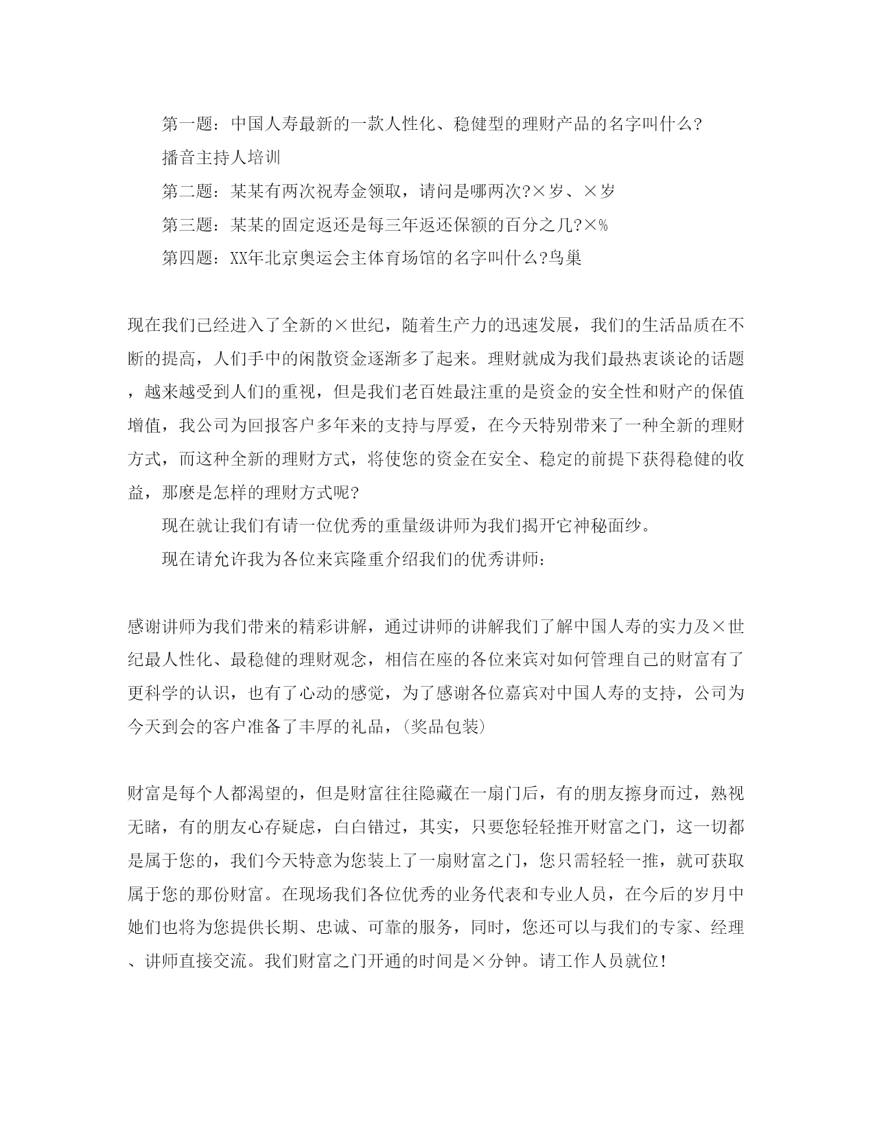 此资料由网络收集而来,如有侵权请告知上传者立即删除。资料共分享,我们负责传递知识。保险公司培训主持词一、纪律宣导:尊敬的各位嘉宾,朋友们,大家好!我们的新品发布会马上就要开始了,为了保证会议能够顺利的进行,请我们所有的业务同仁将手机关机或调到震动状态,请各位亲爱的客户,将手机调至震动,同时为了保证各位朋友在接下来的时间里能够安心、舒适的与我们共度欢乐时光,请大家不要吸烟、随意走动或大声喧哗,如有事请示意我们的礼仪人员,她们将给您提供专业、热心的服务。谢谢您的配合!婚庆主持人培训尊敬的各位来宾,女士们、先生们:大家下午好!青山湖畔,流光溢彩;xx酒店,高朋满座。连续五次入选世界×强、领先中国保险业的中国人寿,特选在高雅舒适的xx酒店举办隆重的中国人寿“新品发布会”,诚邀诸位嘉宾光临。为此我代表中国人寿xx分公司全体员工向各位嘉宾们的到来表示热烈的欢迎!xx国寿多年来的超常规发展得到了广大xx客户的大力支持,为了回馈广大支持中国人寿的分红型产品客户,中国人寿特意在xx酒店举办热烈隆重的答谢宴会,并且中国人寿xx分公司个险销售部经理某某先生也亲临会场致欢迎辞,让我们以热烈的掌声有请某某领导!感谢某某领导,通过某某的致辞,我们共同走进了中国人寿的世界,共同了解了中国人寿的雄厚实力和悠久历史,接下来就进入我们欢乐的有奖问答时间,届时每位答对题的嘉宾都将获得我们奉送的精美礼物。请各位来宾做好准备,在我宣布完问题后,说到1、2、×开始时,请您迅速举起您成功的高手,我们将选择第一位举起手的来宾回答我们的问题。第一题:中国人寿最新的一款人性化、稳健型的理财产品的名字叫什么?播音主持人培训第二题:某某有两次祝寿金领取,请问是哪两次?×岁、×岁第三题:某某的固定返还是每三年返还保额的百分之几?×%第四题:XX年北京奥运会主体育场馆的名字叫什么?鸟巢现在我们已经进入了全新的×世纪,随着生产力的迅速发展,我们的生活品质在不断的提高,人们手中的闲散资金逐渐多了起来。理财就成为我们最热衷谈论的话题,越来越受到人们的重视,但是我们老百姓最注重的是资金的安全性和财产的保值增值,我公司为回报客户多年来的支持与厚爱,在今天特别带来了一种全新的理财方式,而这种全新的理财方式,将使您的资金在安全、稳定的前提下获得稳健的收益,那麽是怎样的理财方式呢?现在就让我们有请一位优秀的重量级讲师为我们揭开它神秘面纱。现在请允许我为各位来宾隆重介绍我们的优秀讲师:感谢讲师为我们带来的精彩讲解,通过讲师的讲解我们了解中国人寿的实力及×世纪最人性化、最稳健的理财观念,相信在座的各位来宾对如何管理自己的财富有了更科学的认识,也有了心动的感觉,为了感谢各位嘉宾对中国人寿的支持,公司为今天到会的客户准备了丰厚的礼品,(奖品包装)财富是每个人都渴望的,但是财富往往隐藏在一扇门后,有的朋友擦身而过,熟视无睹,有的朋友心存疑虑,白白错过,其实,只要您轻轻推开财富之门,这一切都是属于您的,我们今天特意为您装上了一扇财富之门,您只需轻轻一推,就可获取属于您的那份财富。在现场我们各位优秀的业务代表和专业人员,在今后的岁月中她们也将为您提供长期、忠诚、可靠的服务,同时,您还可以与我们的专家、经理、讲师直接交流。我们财富之门开通的时间是×分钟。请工作人员就位!过去的我们无法控制,但明天的幸福生活却取决于您今天的决定,相信通过思考,您定会做出明智的选择。主持人培训