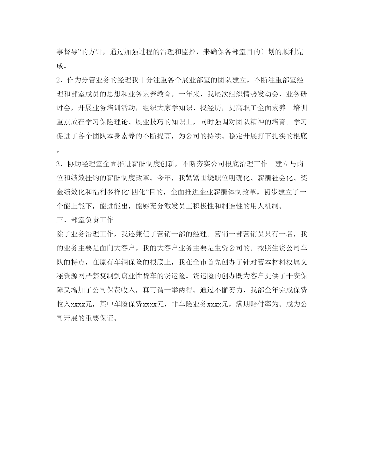 保险公司工作的自我参考总结一年来,xx保险xx公司在省市公司正确领导下,依托我公司全体员工的不懈努力,公司业务获得了打破性进展,领先在全省打破保费收入千万元大关。今年,我公司提早两个月完成了省公司下达的全年营销任务,各项工作健康顺利开展。下面结合我的详细分管工作,来作一个自我总结。一、工作思想积极贯彻省市公司关于公司开展的一系列重要指示,与时俱进,勤奋工作,务实求效,勇争一流,带着各部员工紧紧围绕“立足改革、加快开展、真诚效劳、提高效益”这一中心,进一步转变观念、改革创新,面对竞争日趋剧烈的临沂保险市场,强化核心竞争力,开展多元化运营,通过努力和拼搏,公司保持了较好的开展态势,为xx保险公司的持续开展,做出了应有的奉献。全方面加强学习,努力提高本身业务素养水平和治理水平。作为一名领导干部,肩负着上级领导和全体员工给予的重要职责与使命,公司的运营方针政策需要我去贯彻施行。因此,我十分本材料权属文秘资源网严禁复制剽窃注重保险理论的学习和治理才能的培养。留意用科学的方法指导本人的工作,标准本人的言行,树立强烈的责任感和事业心,不断提高本人的业务才能和治理才能。不断提高公司业务人员队伍的整体素养水平。一年来,我不断把培养展业人员的业务素养作为团队建立的一项重要内容来抓,并和经理室一起施行有针对性的培训计划,加强领导班子和员工队伍建立。二、业务治理“没有规矩不成方圆”。要想使一个公司稳步开展,必须制定标准加强治理。治理是一种投入,这种投入必定会产生效益。我分管的是业务工作,更需要向治理要效益。只有不断完善各种治理制度和方法,并真正贯彻到行动中去,才能出成绩、见效益。业务治理中我主要做了以下工作:1、按照市公司下达给我们的全年销售任务,制定各个部室的周、月、季度、年销售计划。制定计划时本着实事求是、按照各个险种特点、客户特点,部室情况确定每个部室合理的、可实现的目的。在目确实定之后,我本着“事事落实,事事督导”的方针,通过加强过程的治理和监控,来确保各部室目的计划的顺利完成。2、作为分管业务的经理我十分注重各个展业部室的团队建立。不断注重部室经理和部室成员的思想和业务素养教育。一年来,我屡次组织情势发动会、业务研讨会,开展业务培训活动,组织大家学知识、找经历,提高职工全面素养。培训重点放在学习保险理论、展业技巧的知识上,同时强调对团队精神的培育。学习促进了各个团队本身素养的不断提高,为公司的持续、稳定开展打下扎实的根底。3、协助经理室全面推进薪酬制度创新,不断夯实公司根底治理工作。建立与岗位和绩效挂钩的薪酬制度改革。今年,我紧紧围绕职位明确化、薪酬社会化、奖金绩效化和福利多样化“四化”目的,全面推进企业薪酬体制改革。初步建立了一个能上能下,能进能出,能够充分激发员工积极性和制造性的用人机制。三、部室负责工作除了业务治理工作,我还兼任了营销一部的经理。营销一部营销员只有一名,我的业务主要是面向大客户。我的大客户业务主要是生资公司的。按照生资公司车队的特点,在原有车辆保险的根底上,我在全市首先创办了针对营本材料权属文秘资源网严禁复制剽窃业性货车的货运险。货运险的创办既为客户提供了平安保障又增加了公司保费收入,真可谓一举两得。通过不懈努力,我部全年完成保费收入xxxx元,其中车险保费xxxx元,非车险业务xxxx元,满期赔付率为。成为公司开展的重要保证。