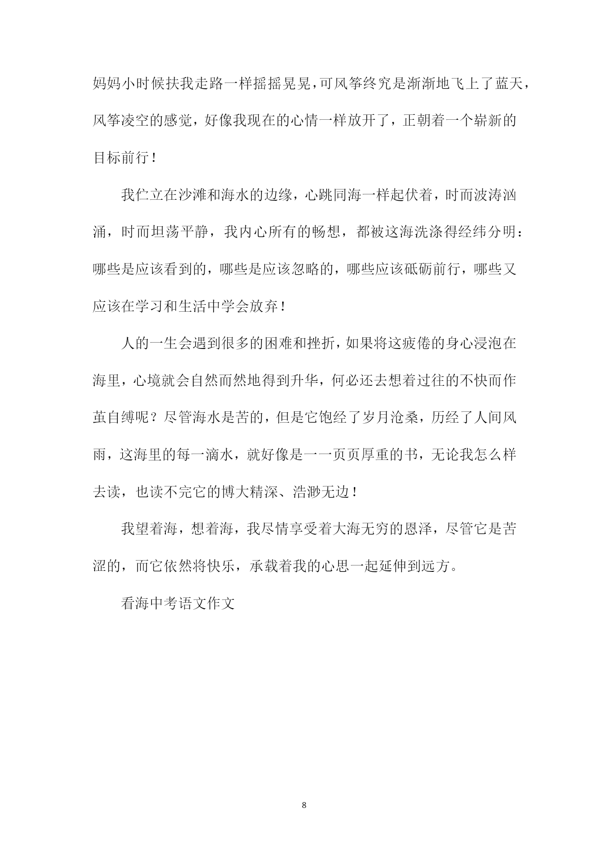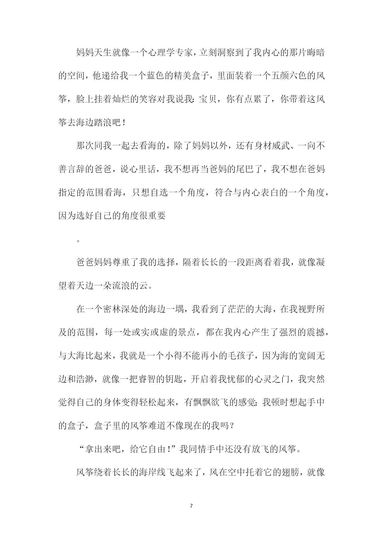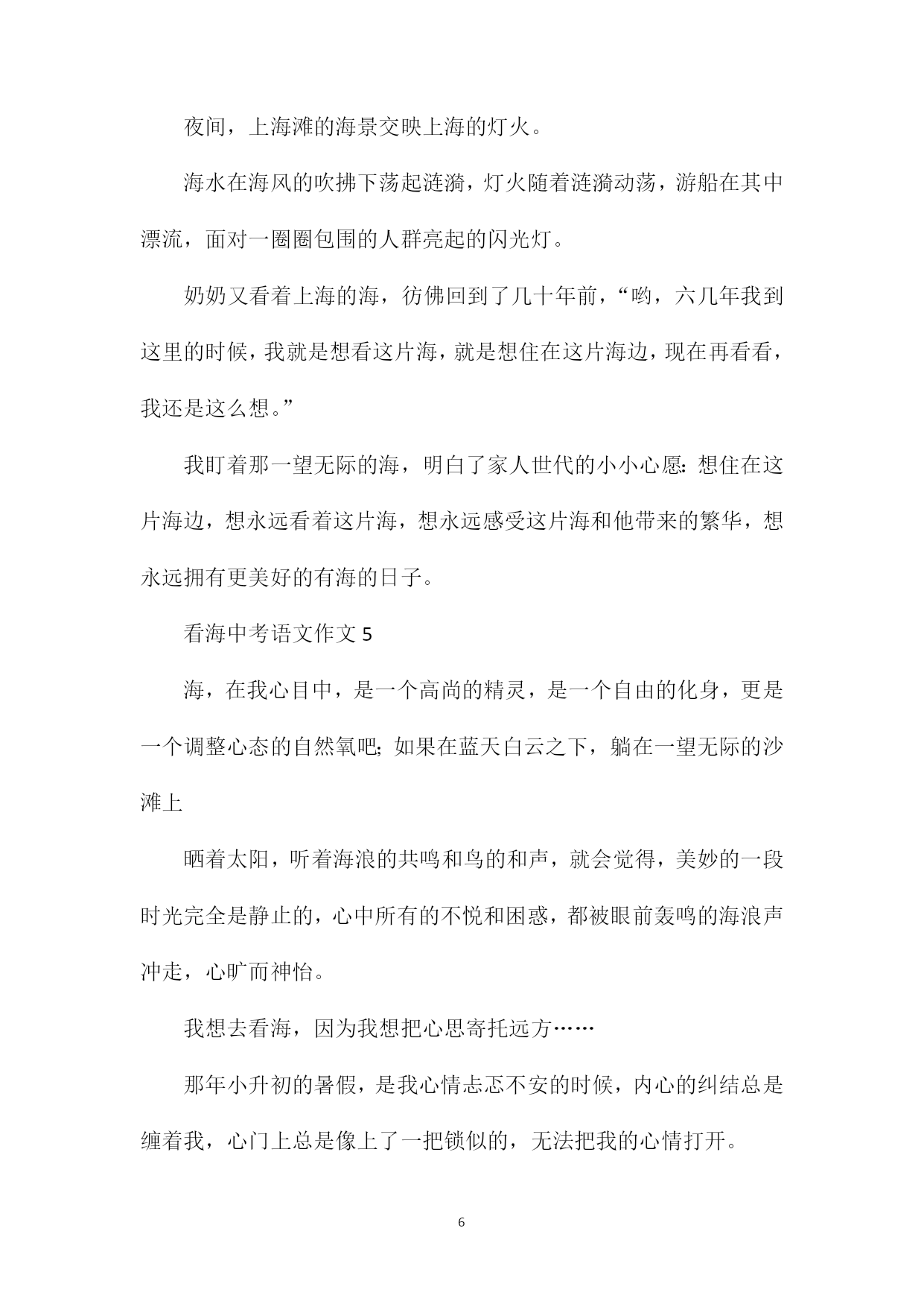 PAGEPAGE8看海中考语文作文想看海,海,它有气吞山河之势,有包容万物之量。想看海,海,它承载历史,托起巨轮,孕育生命,传承文明。想看海,海,有着梦幻般的蓝色,远远望去,海云相连。下面就是xx给大家带来的看海中考作文,希望能帮助到大家!看海中考语文作文1炎炎烈日,却阻挡不了心中的那美好的期盼——我们看海去!沙滩,椰树,海风……我想把小手安在浪花上,吮吸盐味的海水,沐浴灿烂的阳光;我想把小脚接在湿软的沙滩里,海水放肆地舔着脚丫,螃蟹在上面舞蹈;我想把眼睛装在海风上,风儿轻轻按摩着脸颊;我想把鼻子贴在山顶上,挺立的树木在尽情地歌唱;我想把嘴巴放在灿烂的阳光下,告诉人们!那景色是多么美妙!每当看到辽阔的大海,我喜欢去拥抱海风,细细地体会它的温暖,我喜欢感受海水的磅礴!一次次在礁石上有力的拍打,仿佛是在炫耀,又或者是在给予人们心灵上的慰藉与满足,我享受这种自然的声乐,只喜欢静静地听着。有时,我竟幻想我本就属于大海,可能因为老家靠海的缘故,对于海,我有一种归属感,家的感觉。尽情感受着,远离了喧闹城市,远离了繁荣富贵,只是平凡的大海,浪涛声,滚滚而来……那时的你伴着夏日的蝉鸣与我耳鬓厮磨,就算你的波涛,能把记忆涤平,却还有些贝壳与海螺撒在沙滩上,如夏夜的星,纯洁;又如夏夜的雨,繁杂。夜晚总是多愁善感的,就连立夏的夜晚也不例外。大海是宽容的,能容下世间万物,望着这海,不禁为曾经学校里的勾心斗角而感到搞笑,也许人的心胸可以像海一般宽阔,也可以像寄居蟹居住的海螺这般狭小。望着那片星辰大海,发现曾经为此流下的眼泪并不比这片星河少,想来竟觉得幼稚了。在海边的夜晚总是能让人感到舒心,我仿佛真的在一夜间长大了,海风徐徐地向我拂来,静静仰望星空,浮现曾经的纯洁与美好……看海中考语文作文2一个阳光明媚的星期六,妈妈在忙着收拾东西,我好奇地问妈妈:“我们去哪里呀?”妈妈笑着回答:“我们要去海南看海呢!”我不禁跳了起来,心想:大海究竟是怎样的呢?是不是有着许多海鱼、海龟、鲨鱼……的地方呢?我盼着去大海已经很久了,今天就能如愿以偿,我打起十二分精神,一切准备就绪。上了海南的飞机,几个小时过后,一股清香从机舱外传来,下了飞机,一眼就望见了一棵椰子树,真是高兴。妈妈带着我,坐着车,开往海边。一下车,我便跑向海边。“哇”一片蔚蓝色的大海映入我的眼帘;一阵阵波涛击打着海岸;一条条彩色的小鱼从海面一闪而过。我踏着轻快的步伐走向海边,瞻仰这浩瀚的大海。一阵清凉从我的脚丫上传来,原来是海浪这调皮的朋友。不愧是大海,如此广阔,如此令人敬佩:哺育着千千万万的生命,无忧无虑。走进海洋馆,看到潜水员的录像机播放着海里有着什么:左边游过一条三角形的小鱼,还有圆形的、长刺的……各式各样。在浅水区,还有一群红色的小鱼跳着欢快的舞蹈。越看越多,越看越美。妈妈问我:“想不想感受一下海的拥抱?”我激动地回答:“好!”租了一个游泳圈,一‘扑通’跳进海里,不小心喝了一口海水,真咸!但是却很舒服,泡在海里真是一种享受啊!泡了许久,我依然没有想回宾馆的思想,可是妈妈硬拉着我上了沙滩,而我却又偷偷跑到海边继续泡,妈妈发现了我,骂了我一顿,可是大海令我念念不忘。虽然路途很短暂,但我感受到了大海的温暖。看海中考语文作文3今天,爸爸带着我和哥哥一起去日照看海。虽然今天是去玩的,可大部分时间都浪费在车里,请看时间安排:去的路上三小时,吃饭一小时,看海加堆沙堡用四小时,回来三小时半。所以我们也没玩多长时间。爸爸把车开到日照停下,便打算先吃饭。我们去了一个叫“海鲜屋”的饭店,在里面点了“贝壳大杂烩”、“小鱼全家福”、“麻婆豆腐”。这些菜虽然名字起得好听,其实和我们在家里做的菜差不多,我吃着还没有家里做的菜好吃,可他们却说什么味道鲜美,我的天!他们的味觉出了什么问题呀?吃完饭,我和爸爸、哥哥从地下通道走到了沙滩上。我看见蔚蓝的海水如同蓝宝石一般,美丽极了。这时,爸爸看着海面心情大好,对我们说:“我们每个人都许一个愿吧!”我们几个人都点头称好,哥哥是直接喊出来他的愿望,把几只在吃鱼儿的海鸟吓跑了。爸爸许的愿望我不知道,不过我可不能把我许的愿望告诉你,不然就不灵了。许完愿,我和哥哥在水里玩了一会儿,水花拍打着我的脚,感觉凉凉的很舒服。清澈的海水能一眼望到底,海浪的声音好像一个活泼可爱的孩子发出银铃般的笑声,让人能忘了一切烦恼和忧愁。在我的思绪飘向远方时,突然哥哥泼了我一脸水,我尝了尝海水咸咸的,接着海面上就有了一场水枪大战。天色渐渐暗了下来,太阳快要下山了,在车上我不知不觉地睡着了,似乎梦到了今天看海时发生的有趣事情。看海中考语文作文4家里三代人都见过海,浪潮在三代人的血脉中澎湃。家中的每个人,都是在上海聆听海风低吟的,都是在上海拜访走不进内陆故