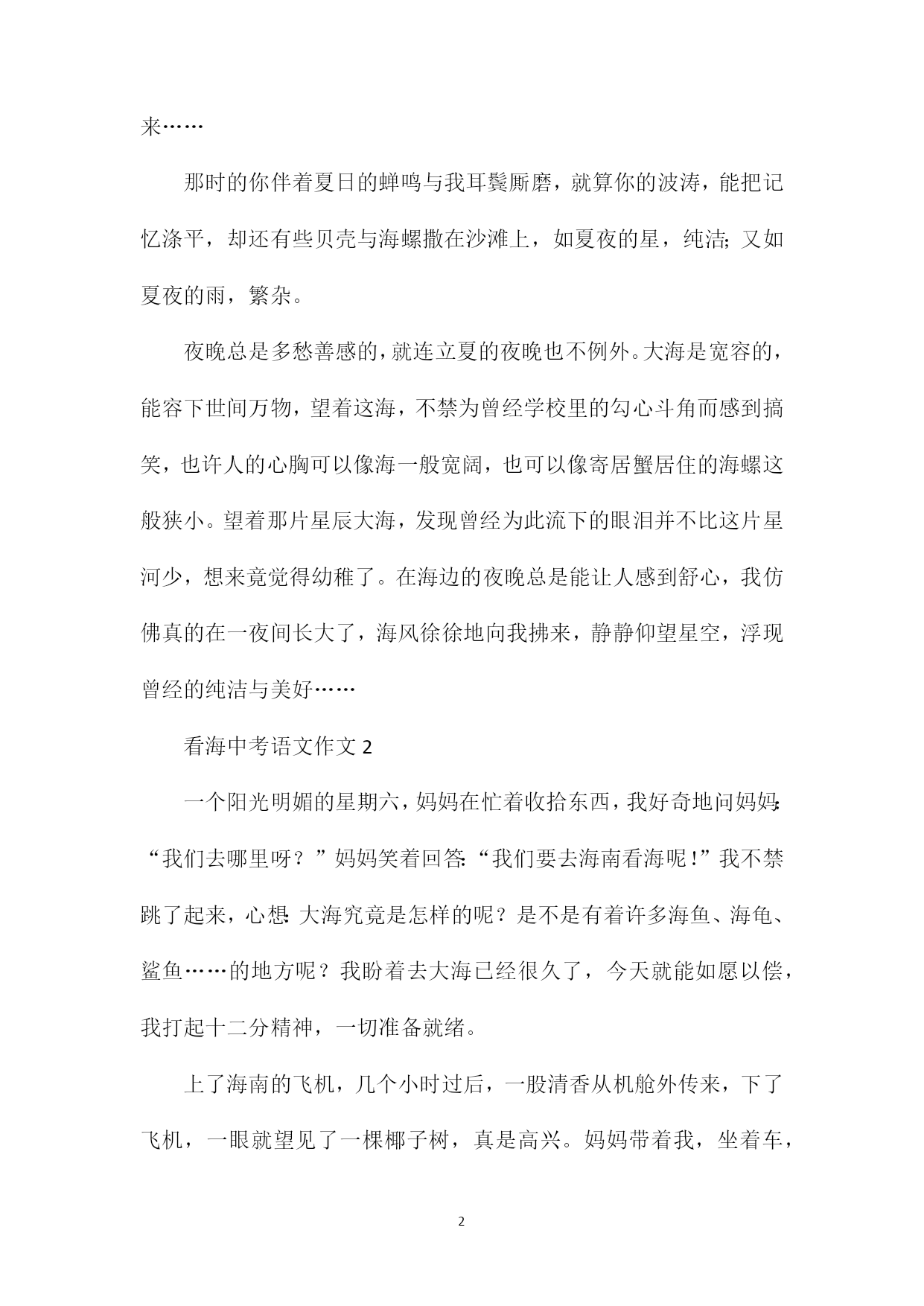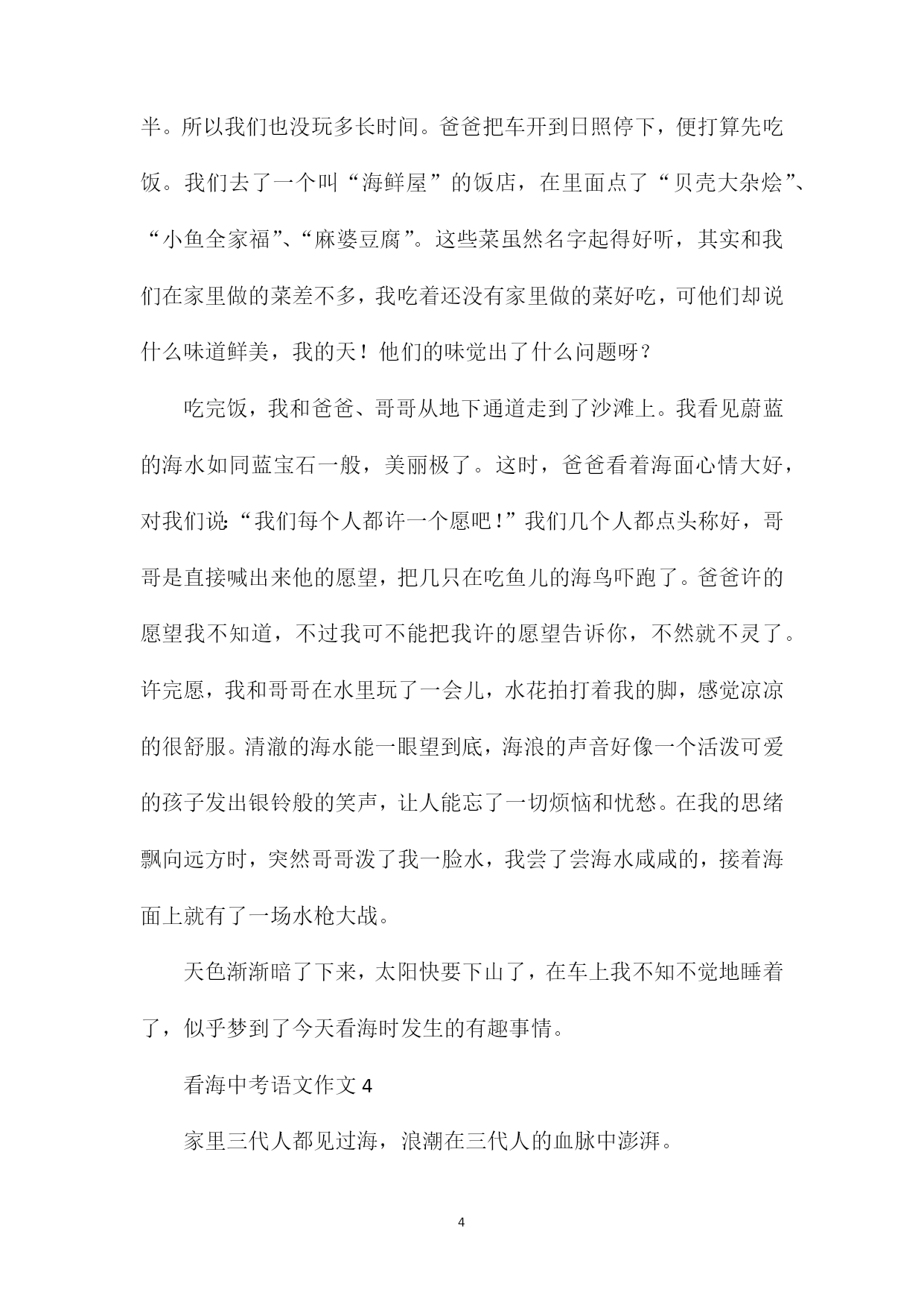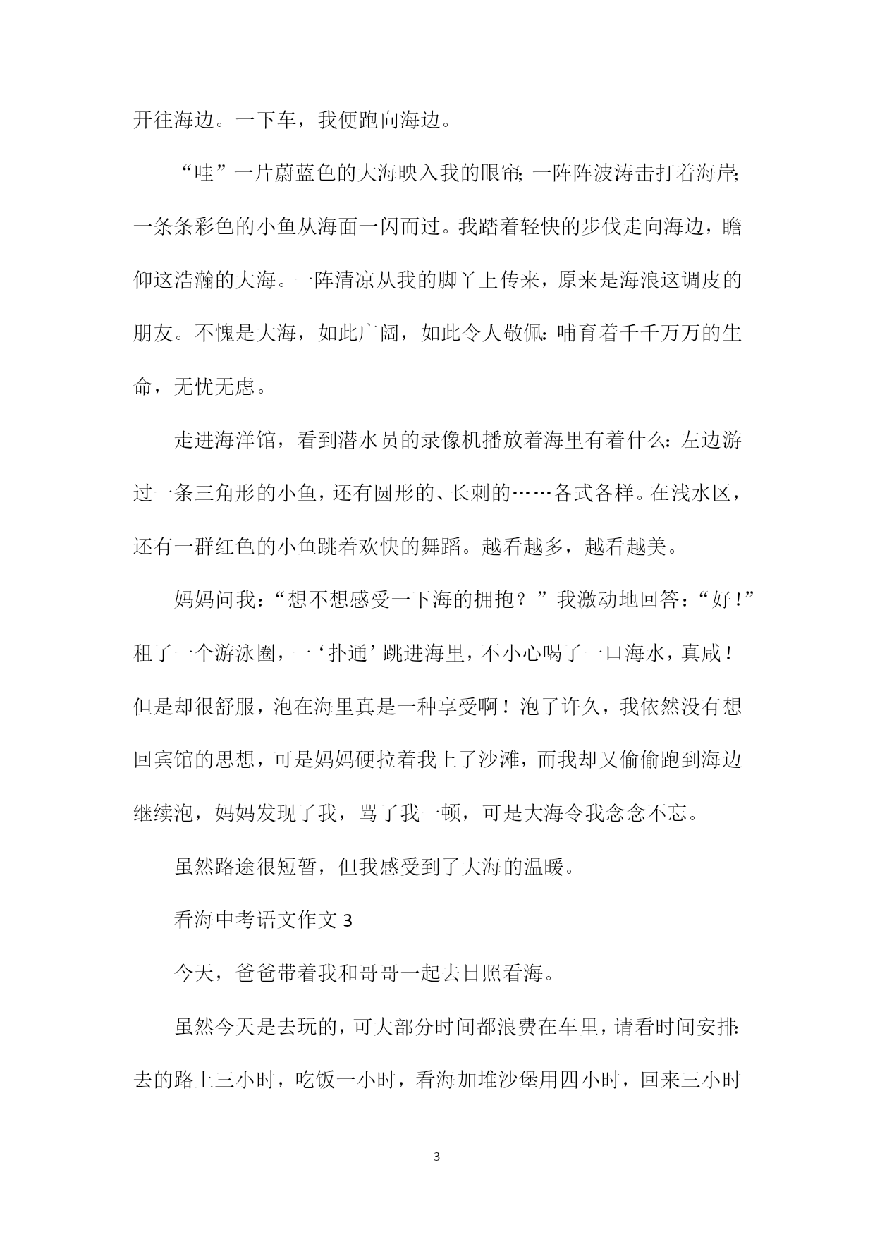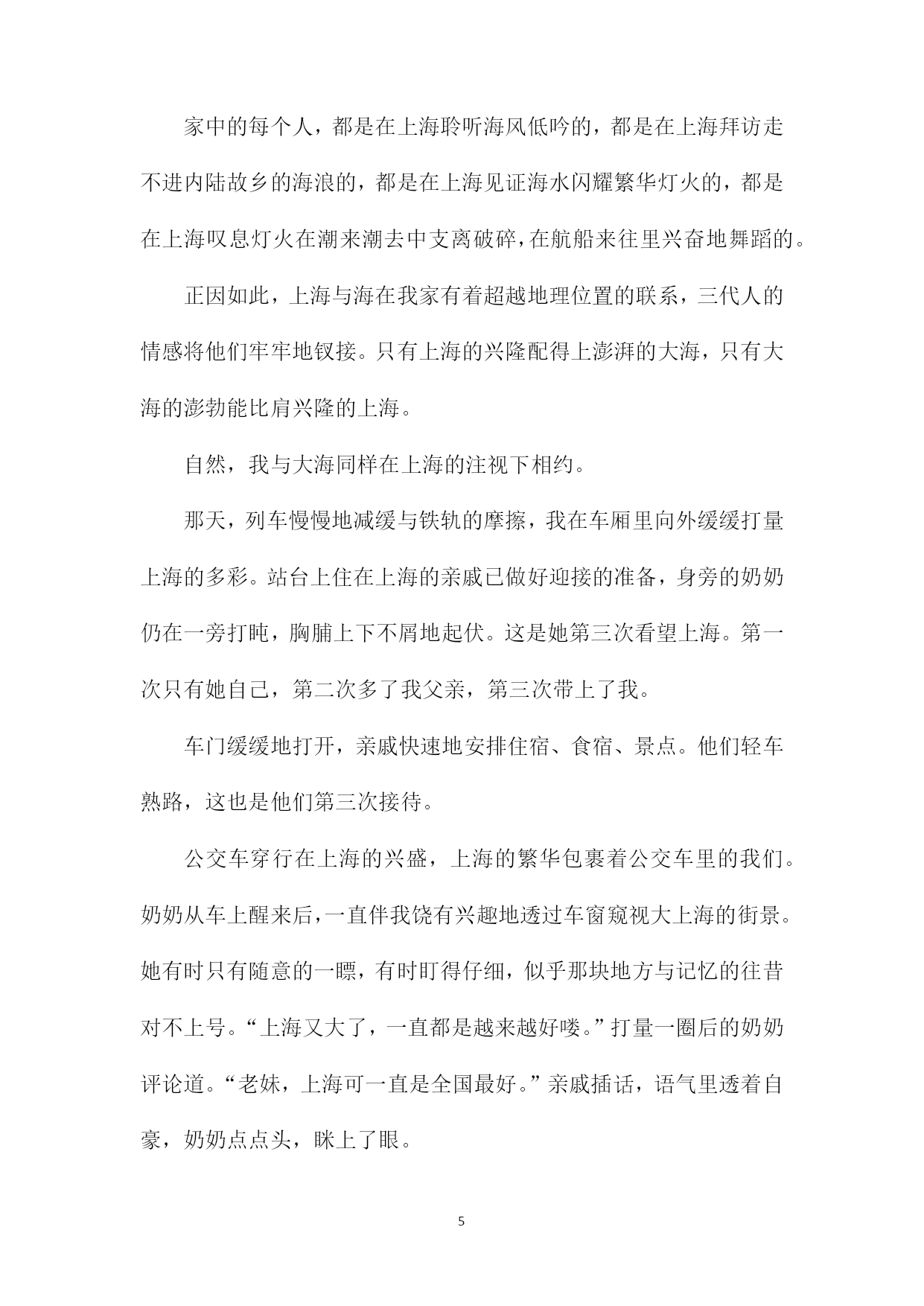 PAGEPAGE8看海中考语文作文想看海,海,它有气吞山河之势,有包容万物之量。想看海,海,它承载历史,托起巨轮,孕育生命,传承文明。想看海,海,有着梦幻般的蓝色,远远望去,海云相连。下面就是xx给大家带来的看海中考作文,希望能帮助到大家!看海中考语文作文1炎炎烈日,却阻挡不了心中的那美好的期盼——我们看海去!沙滩,椰树,海风……我想把小手安在浪花上,吮吸盐味的海水,沐浴灿烂的阳光;我想把小脚接在湿软的沙滩里,海水放肆地舔着脚丫,螃蟹在上面舞蹈;我想把眼睛装在海风上,风儿轻轻按摩着脸颊;我想把鼻子贴在山顶上,挺立的树木在尽情地歌唱;我想把嘴巴放在灿烂的阳光下,告诉人们!那景色是多么美妙!每当看到辽阔的大海,我喜欢去拥抱海风,细细地体会它的温暖,我喜欢感受海水的磅礴!一次次在礁石上有力的拍打,仿佛是在炫耀,又或者是在给予人们心灵上的慰藉与满足,我享受这种自然的声乐,只喜欢静静地听着。有时,我竟幻想我本就属于大海,可能因为老家靠海的缘故,对于海,我有一种归属感,家的感觉。尽情感受着,远离了喧闹城市,远离了繁荣富贵,只是平凡的大海,浪涛声,滚滚而来……那时的你伴着夏日的蝉鸣与我耳鬓厮磨,就算你的波涛,能把记忆涤平,却还有些贝壳与海螺撒在沙滩上,如夏夜的星,纯洁;又如夏夜的雨,繁杂。夜晚总是多愁善感的,就连立夏的夜晚也不例外。大海是宽容的,能容下世间万物,望着这海,不禁为曾经学校里的勾心斗角而感到搞笑,也许人的心胸可以像海一般宽阔,也可以像寄居蟹居住的海螺这般狭小。望着那片星辰大海,发现曾经为此流下的眼泪并不比这片星河少,想来竟觉得幼稚了。在海边的夜晚总是能让人感到舒心,我仿佛真的在一夜间长大了,海风徐徐地向我拂来,静静仰望星空,浮现曾经的纯洁与美好……看海中考语文作文2一个阳光明媚的星期六,妈妈在忙着收拾东西,我好奇地问妈妈:“我们去哪里呀?”妈妈笑着回答:“我们要去海南看海呢!”我不禁跳了起来,心想:大海究竟是怎样的呢?是不是有着许多海鱼、海龟、鲨鱼……的地方呢?我盼着去大海已经很久了,今天就能如愿以偿,我打起十二分精神,一切准备就绪。上了海南的飞机,几个小时过后,一股清香从机舱外传来,下了飞机,一眼就望见了一棵椰子树,真是高兴。妈妈带着我,坐着车,开往海边。一下车,我便跑向海边。“哇”一片蔚蓝色的大海映入我的眼帘;一阵阵波涛击打着海岸;一条条彩色的小鱼从海面一闪而过。我踏着轻快的步伐走向海边,瞻仰这浩瀚的大海。一阵清凉从我的脚丫上传来,原来是海浪这调皮的朋友。不愧是大海,如此广阔,如此令人敬佩:哺育着千千万万的生命,无忧无虑。走进海洋馆,看到潜水员的录像机播放着海里有着什么:左边游过一条三角形的小鱼,还有圆形的、长刺的……各式各样。在浅水区,还有一群红色的小鱼跳着欢快的舞蹈。越看越多,越看越美。妈妈问我:“想不想感受一下海的拥抱?”我激动地回答:“好!”租了一个游泳圈,一‘扑通’跳进海里,不小心喝了一口海水,真咸!但是却很舒服,泡在海里真是一种享受啊!泡了许久,我依然没有想回宾馆的思想,可是妈妈硬拉着我上了沙滩,而我却又偷偷跑到海边继续泡,妈妈发现了我,骂了我一顿,可是大海令我念念不忘。虽然路途很短暂,但我感受到了大海的温暖。看海中考语文作文3今天,爸爸带着我和哥哥一起去日照看海。虽然今天是去玩的,可大部分时间都浪费在车里,请看时间安排:去的路上三小时,吃饭一小时,看海加堆沙堡用四小时,回来三小时半。所以我们也没玩多长时间。爸爸把车开到日照停下,便打算先吃饭。我们去了一个叫“海鲜屋”的饭店,在里面点了“贝壳大杂烩”、“小鱼全家福”、“麻婆豆腐”。这些菜虽然名字起得好听,其实和我们在家里做的菜差不多,我吃着还没有家里做的菜好吃,可他们却说什么味道鲜美,我的天!他们的味觉出了什么问题呀?吃完饭,我和爸爸、哥哥从地下通道走到了沙滩上。我看见蔚蓝的海水如同蓝宝石一般,美丽极了。这时,爸爸看着海面心情大好,对我们说:“我们每个人都许一个愿吧!”我们几个人都点头称好,哥哥是直接喊出来他的愿望,把几只在吃鱼儿的海鸟吓跑了。爸爸许的愿望我不知道,不过我可不能把我许的愿望告诉你,不然就不灵了。许完愿,我和哥哥在水里玩了一会儿,水花拍打着我的脚,感觉凉凉的很舒服。清澈的海水能一眼望到底,海浪的声音好像一个活泼可爱的孩子发出银铃般的笑声,让人能忘了一切烦恼和忧愁。在我的思绪飘向远方时,突然哥哥泼了我一脸水,我尝了尝海水咸咸的,接着海面上就有了一场水枪大战。天色渐渐暗了下来,太阳快要下山了,在车上我不知不觉地睡着了,似乎梦到了今天看海时发生的有趣事情。看海中考语文作文4家里三代人都见过海,浪潮在三代人的血脉中澎湃。家中的每个人,都是在上海聆听海风低吟的,都是在上海拜访走不进内陆故
