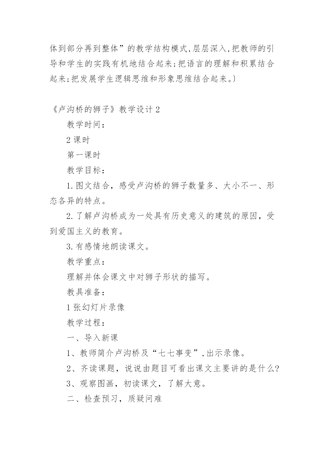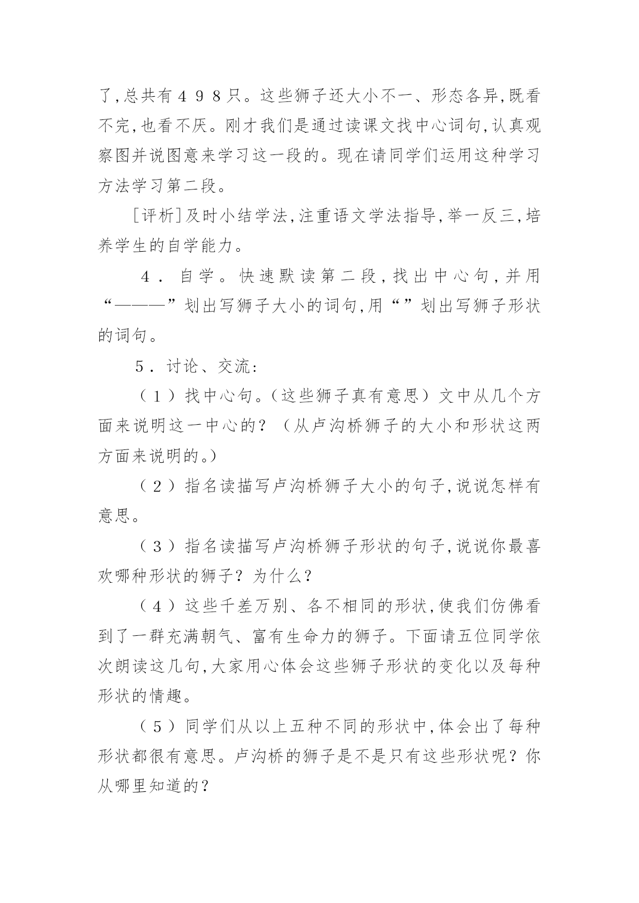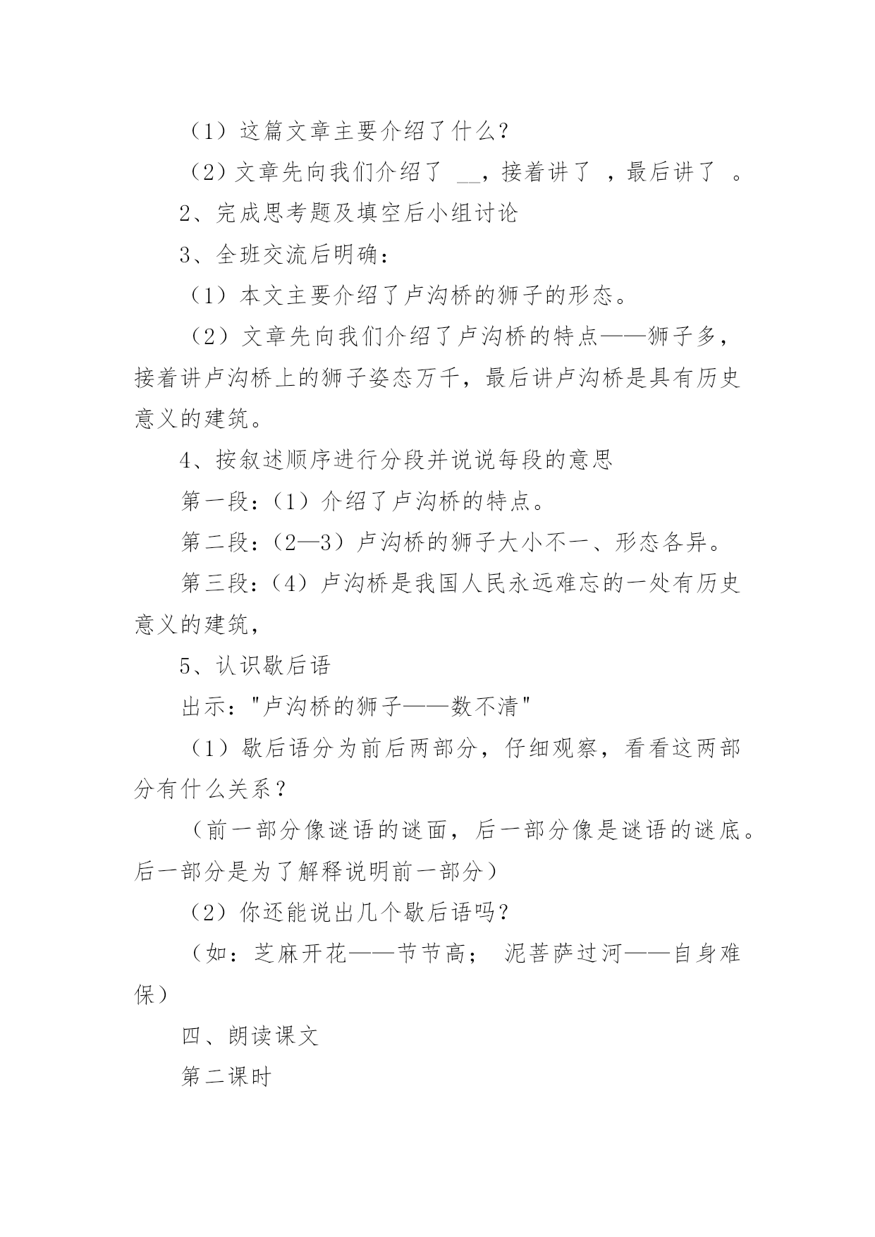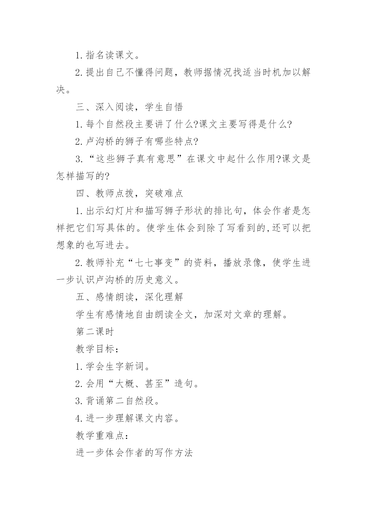《卢沟桥的狮子》教学设计作为一名教学工作者,常常需要准备教学设计,教学设计是实现教学目标的计划性和决策性活动。我们该怎么去写教学设计呢?下面是小编收集整理的《卢沟桥的狮子》教学设计,欢迎阅读与收藏。《卢沟桥的狮子》教学设计1教学任务1.激发自读意识,通过自读自悟了解卢沟桥狮子的建筑特点和历史意义,体会我国劳动人民的智慧和创造力。2.培养学生认真阅读、分析解决问题的能力。教学过程一、整体感知,理清思路1.指名读文,回顾全文内容。2.指名学生说说上节课分段情况,理清文章脉络。二、析疑定向,自读探索(一)学生自读质疑,师生归纳析疑1.学生自由读课文,结合预习提出自己不懂的问题。2.学生提出的问题,大致梳理归纳如下:(1)卢沟桥的狮子有多少?(2)为什么说卢沟桥的狮子真有意思?(3)我不理解“联拱桥”“挑衅”的意思。(4)卢沟桥为什么成了我国人民永远难忘的一处具有历史意义的建筑?[评析]虽然通过预习和第一课时的教学,学生对课文内容及层次段落已有一定的了解,但是在第二课时的一开始,让学生通读全文、回忆分段情况、理清文章脉络还是必不可少的。体现了《大纲》要求———从整体入手。(二)自读解疑1.激发自读兴趣:亲自耕耘,才能体会到收获的快乐。让我们一起来边读边思考,解开心中的疑团。2.生自读课文。想想看,卢沟桥的狮子有哪些特点?这个问题我们应该阅读哪些段落来领悟呢?(第一、二段)3.读后,学生说出卢沟桥狮子的特点:数量多、大小不一、形态各异。(三)部分深化,读中寻解1.指名读第一段,找找文中哪个词能说明卢沟桥的狮子多?(数不清)2.卢沟桥是一座怎样的桥?相机理解“联拱桥”。3.出示投影,指导看全景图。说说卢沟桥的狮子数量多。[评析]古人云:“读书无疑者,须教有疑;有疑者却要无疑,到这里方是长进。”教师鼓励学生提出问题,进而依据本课的教学目标、教学重点进行梳理归纳,既把学习的'主动权交给学生,又发挥了教师的主导作用。体现了“开放式教学”的新思想。小结:卢沟桥的狮子多得数不清,可文物工作者早就数清了,总共有498只。这些狮子还大小不一、形态各异,既看不完,也看不厌。刚才我们是通过读课文找中心词句,认真观察图并说图意来学习这一段的。现在请同学们运用这种学习方法学习第二段。[评析]及时小结学法,注重语文学法指导,举一反三,培养学生的自学能力。4.自学。快速默读第二段,找出中心句,并用“———”划出写狮子大小的词句,用“”划出写狮子形状的词句。5.讨论、交流:(1)找中心句。(这些狮子真有意思)文中从几个方面来说明这一中心的?(从卢沟桥狮子的大小和形状这两方面来说明的。)(2)指名读描写卢沟桥狮子大小的句子,说说怎样有意思。(3)指名读描写卢沟桥狮子形状的句子,说说你最喜欢哪种形状的狮子?为什么?(4)这些千差万别、各不相同的形状,使我们仿佛看到了一群充满朝气、富有生命力的狮子。下面请五位同学依次朗读这几句,大家用心体会这些狮子形状的变化以及每种形状的情趣。(5)同学们从以上五种不同的形状中,体会出了每种形状都很有意思。卢沟桥的狮子是不是只有这些形状呢?你从哪里知道的?(6)投影:卢沟桥的狮子局部图。指导看图,展开想象,说说卢沟桥的狮子还有哪些形状。[评析]这段的结构是典型的先总起再分述。根据这一特点设计自学环节,引导学生通过读书、思考、议论,理解中心句的意思和作用,并找出围绕中心句展开的两个方面的内容。学生很快就能从总体上把握了全段的内容和结构,为进一步深入探究创造了条件,起到了纲举目张的作用。6.引读。师:这些狮子真有意思———生:它们有大有小。师:大的———生:大的……小的……师:它们的形状———生:各不相同。师:有的———生:蹲坐……师:有的———生:低着……师:有的小狮子———生:偎依……师:有的小狮子———生:藏在……师:还有的小狮子———生:大概……7.小结过渡:通过读课文,大家弄明白第一个问题了吗?(明白)。卢沟桥的狮子不仅数量多、大小不一、形状各异、成为北京的一道风景线,而且这座桥还是一处具有历史意义的建筑呢!为什么呢?这是我们要解决的第二个问题。又该读哪段来领悟呢?(第三段)8.默读,自学思考:为什么说卢沟桥是具有历史意义的建筑?9.交流汇报自学情况,相机理解“挑衅”这个词。(卢沟桥是“七七事变”的发生地,抗日战争从这里正式开始。因此,卢沟桥成了我国人民永远难忘的一处具有历史意义的建筑。)10.有感情地练读这一段。指名读后评议。(要读出憎恨日军,牢记这段历史的感情。)11.全班带着这种情感齐读这一段。[评析]教师在引导学生深入探究、理解文意、学习语言的过程中,据文设问,环环相扣,层层推进,使教学活动不枝不蔓,有条不紊。以问促读,以问启思,以问导议。放手让学生从课文中找答案,不仅找出“是什么”,而且理解“为什么”,给学生以读书、思