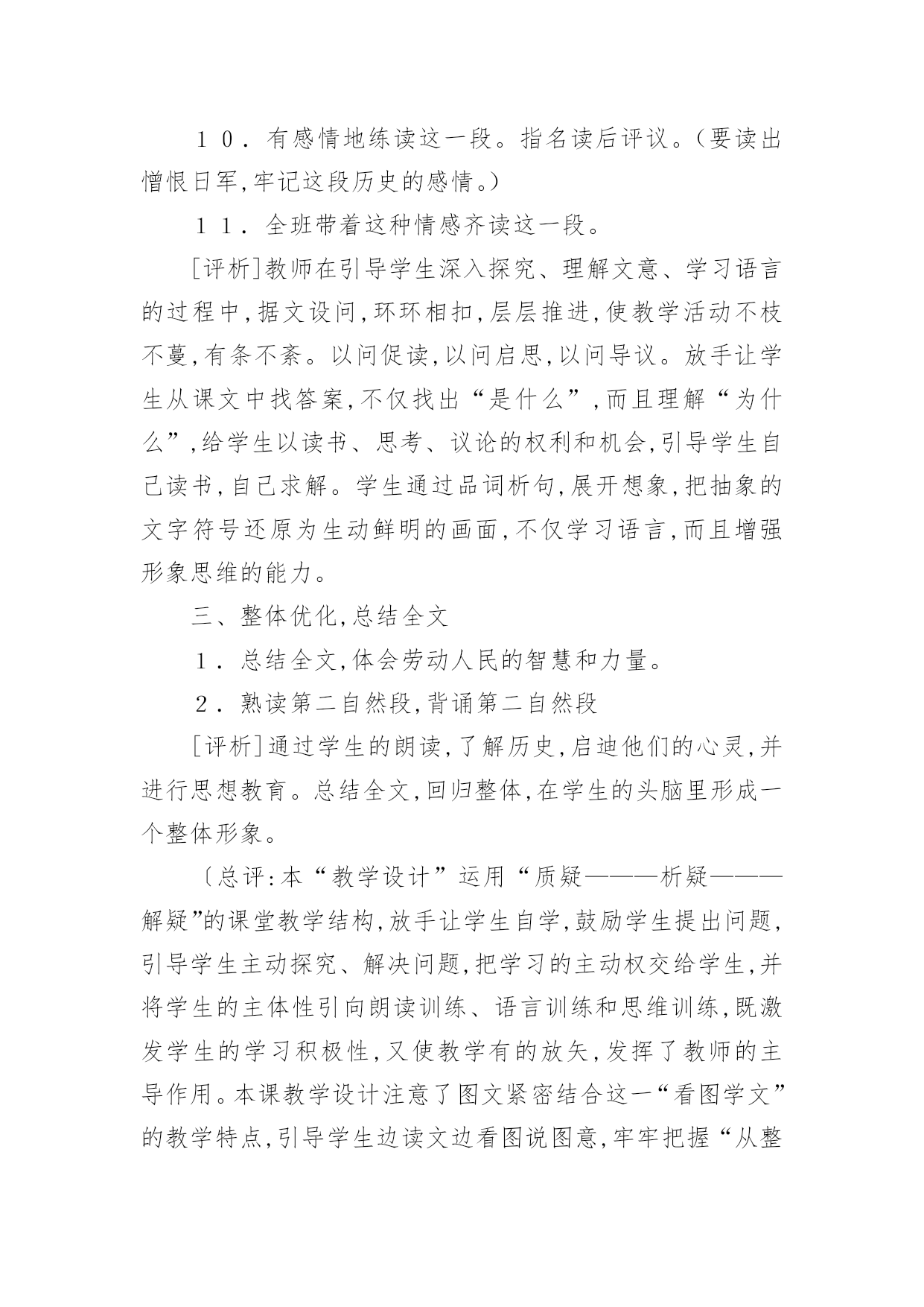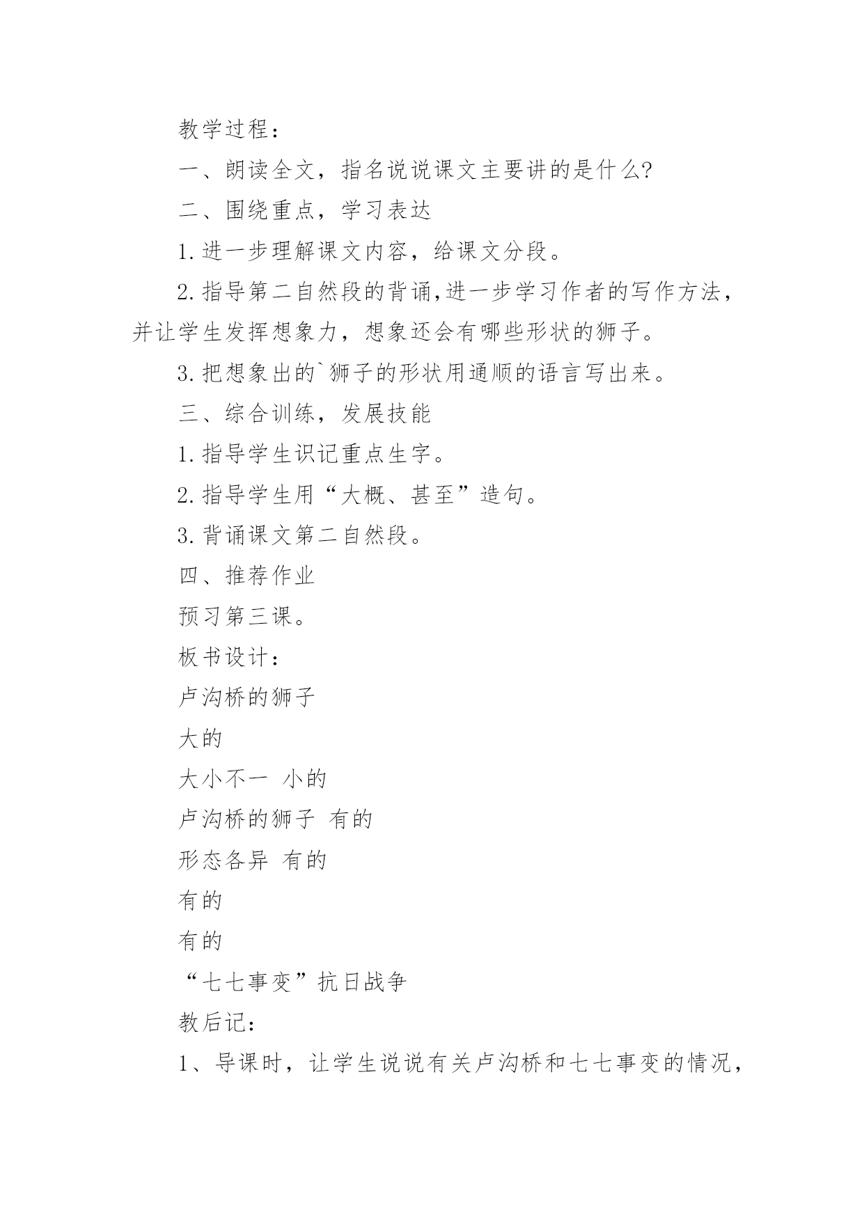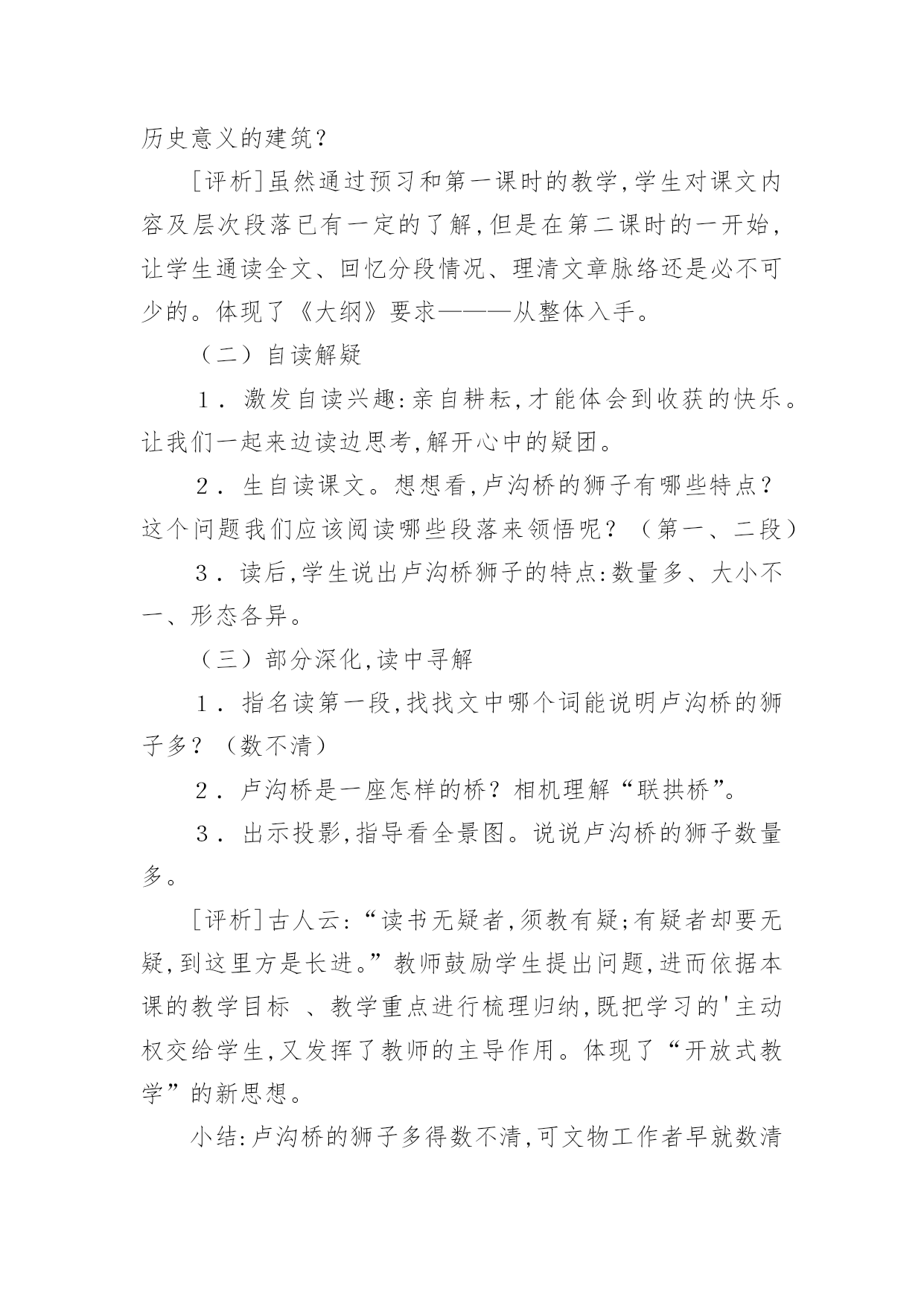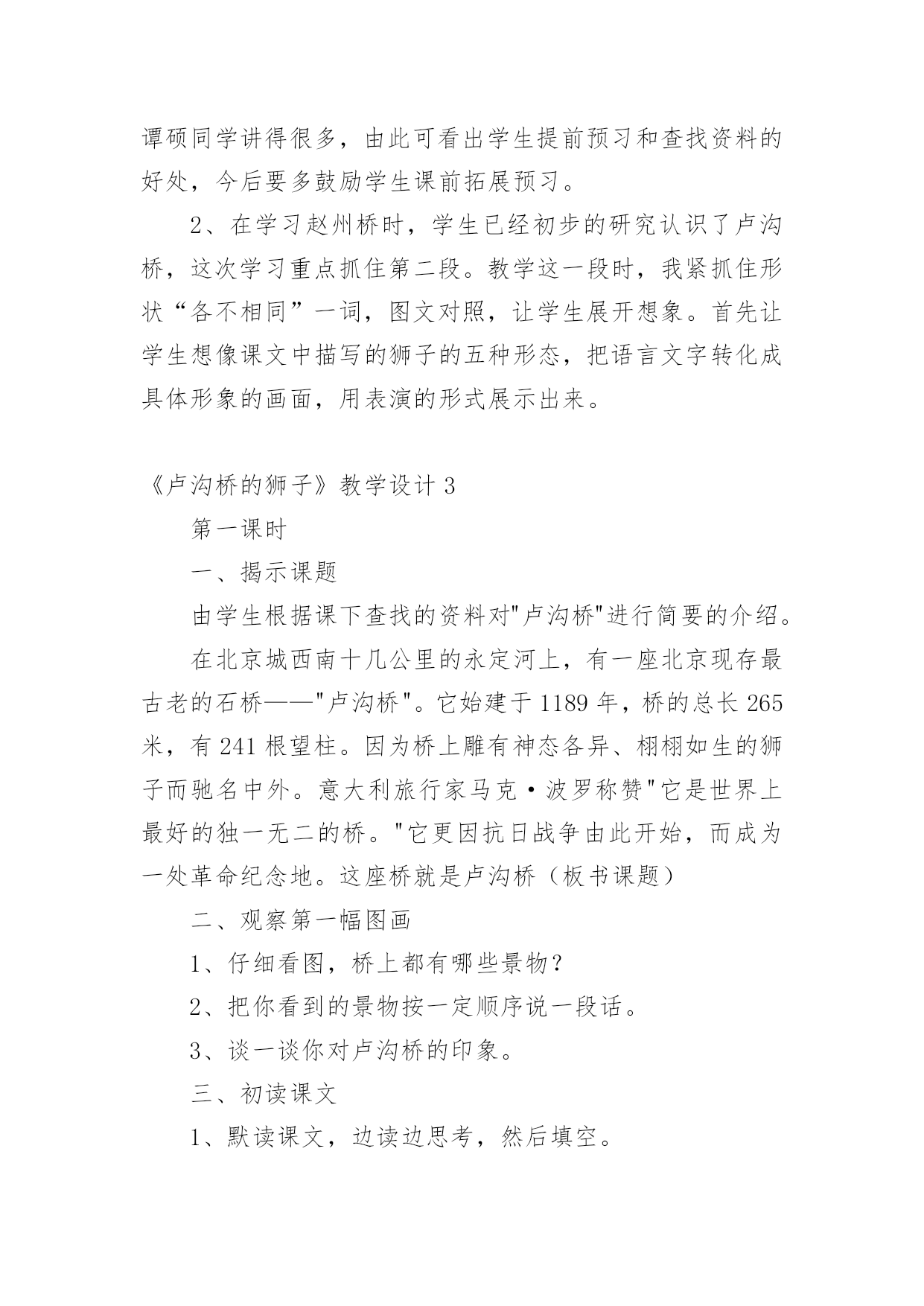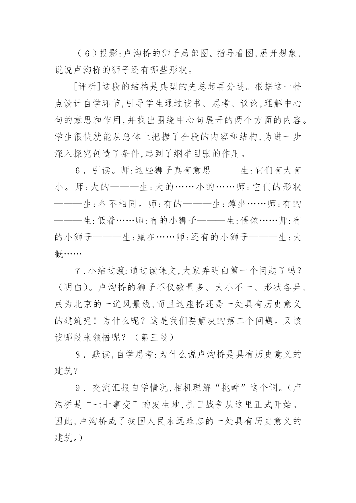 《卢沟桥的狮子》教学设计作为一名教学工作者,常常需要准备教学设计,教学设计是实现教学目标的计划性和决策性活动。我们该怎么去写教学设计呢?下面是小编收集整理的《卢沟桥的狮子》教学设计,欢迎阅读与收藏。《卢沟桥的狮子》教学设计1教学任务1.激发自读意识,通过自读自悟了解卢沟桥狮子的建筑特点和历史意义,体会我国劳动人民的智慧和创造力。2.培养学生认真阅读、分析解决问题的能力。教学过程一、整体感知,理清思路1.指名读文,回顾全文内容。2.指名学生说说上节课分段情况,理清文章脉络。二、析疑定向,自读探索(一)学生自读质疑,师生归纳析疑1.学生自由读课文,结合预习提出自己不懂的问题。2.学生提出的问题,大致梳理归纳如下:(1)卢沟桥的狮子有多少?(2)为什么说卢沟桥的狮子真有意思?(3)我不理解“联拱桥”“挑衅”的意思。(4)卢沟桥为什么成了我国人民永远难忘的一处具有历史意义的建筑?[评析]虽然通过预习和第一课时的教学,学生对课文内容及层次段落已有一定的了解,但是在第二课时的一开始,让学生通读全文、回忆分段情况、理清文章脉络还是必不可少的。体现了《大纲》要求———从整体入手。(二)自读解疑1.激发自读兴趣:亲自耕耘,才能体会到收获的快乐。让我们一起来边读边思考,解开心中的疑团。2.生自读课文。想想看,卢沟桥的狮子有哪些特点?这个问题我们应该阅读哪些段落来领悟呢?(第一、二段)3.读后,学生说出卢沟桥狮子的特点:数量多、大小不一、形态各异。(三)部分深化,读中寻解1.指名读第一段,找找文中哪个词能说明卢沟桥的狮子多?(数不清)2.卢沟桥是一座怎样的桥?相机理解“联拱桥”。3.出示投影,指导看全景图。说说卢沟桥的狮子数量多。[评析]古人云:“读书无疑者,须教有疑;有疑者却要无疑,到这里方是长进。”教师鼓励学生提出问题,进而依据本课的教学目标、教学重点进行梳理归纳,既把学习的'主动权交给学生,又发挥了教师的主导作用。体现了“开放式教学”的新思想。小结:卢沟桥的狮子多得数不清,可文物工作者早就数清了,总共有498只。这些狮子还大小不一、形态各异,既看不完,也看不厌。刚才我们是通过读课文找中心词句,认真观察图并说图意来学习这一段的。现在请同学们运用这种学习方法学习第二段。[评析]及时小结学法,注重语文学法指导,举一反三,培养学生的自学能力。4.自学。快速默读第二段,找出中心句,并用“———”划出写狮子大小的词句,用“”划出写狮子形状的词句。5.讨论、交流:(1)找中心句。(这些狮子真有意思)文中从几个方面来说明这一中心的?(从卢沟桥狮子的大小和形状这两方面来说明的。)(2)指名读描写卢沟桥狮子大小的句子,说说怎样有意思。(3)指名读描写卢沟桥狮子形状的句子,说说你最喜欢哪种形状的狮子?为什么?(4)这些千差万别、各不相同的形状,使我们仿佛看到了一群充满朝气、富有生命力的狮子。下面请五位同学依次朗读这几句,大家用心体会这些狮子形状的变化以及每种形状的情趣。(5)同学们从以上五种不同的形状中,体会出了每种形状都很有意思。卢沟桥的狮子是不是只有这些形状呢?你从哪里知道的?(6)投影:卢沟桥的狮子局部图。指导看图,展开想象,说说卢沟桥的狮子还有哪些形状。[评析]这段的结构是典型的先总起再分述。根据这一特点设计自学环节,引导学生通过读书、思考、议论,理解中心句的意思和作用,并找出围绕中心句展开的两个方面的内容。学生很快就能从总体上把握了全段的内容和结构,为进一步深入探究创造了条件,起到了纲举目张的作用。6.引读。师:这些狮子真有意思———生:它们有大有小。师:大的———生:大的……小的……师:它们的形状———生:各不相同。师:有的———生:蹲坐……师:有的———生:低着……师:有的小狮子———生:偎依……师:有的小狮子———生:藏在……师:还有的小狮子———生:大概……7.小结过渡:通过读课文,大家弄明白第一个问题了吗?(明白)。卢沟桥的狮子不仅数量多、大小不一、形状各异、成为北京的一道风景线,而且这座桥还是一处具有历史意义的建筑呢!为什么呢?这是我们要解决的第二个问题。又该读哪段来领悟呢?(第三段)8.默读,自学思考:为什么说卢沟桥是具有历史意义的建筑?9.交流汇报自学情况,相机理解“挑衅”这个词。(卢沟桥是“七七事变”的发生地,抗日战争从这里正式开始。因此,卢沟桥成了我国人民永远难忘的一处具有历史意义的建筑。)10.有感情地练读这一段。指名读后评议。(要读出憎恨日军,牢记这段历史的感情。)11.全班带着这种情感齐读这一段。[评析]教师在引导学生深入探究、理解文意、学习语言的过程中,据文设问,环环相扣,层层推进,使教学活动不枝不蔓,有条不紊。以问促读,以问启思,以问导议。放手让学生从课文中找答案,不仅找出“是什么”,而且理解“为什么”,给学生以读书、思