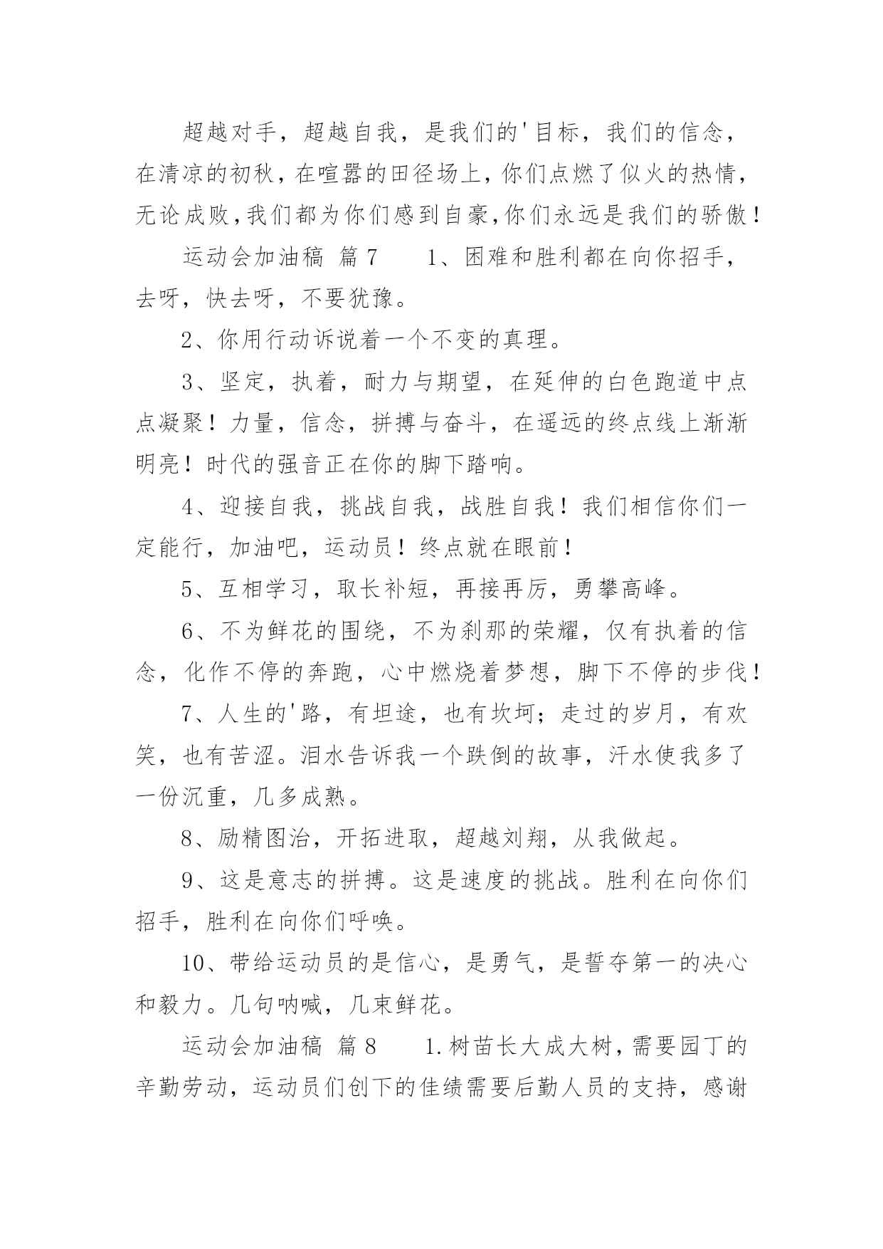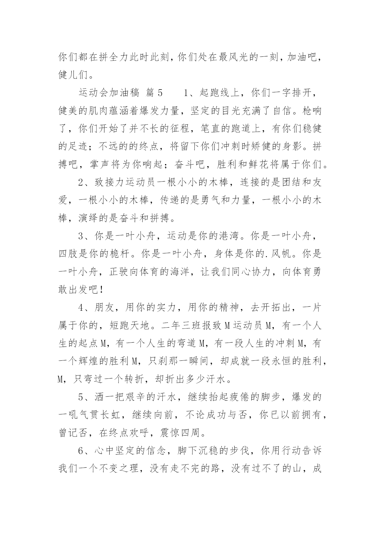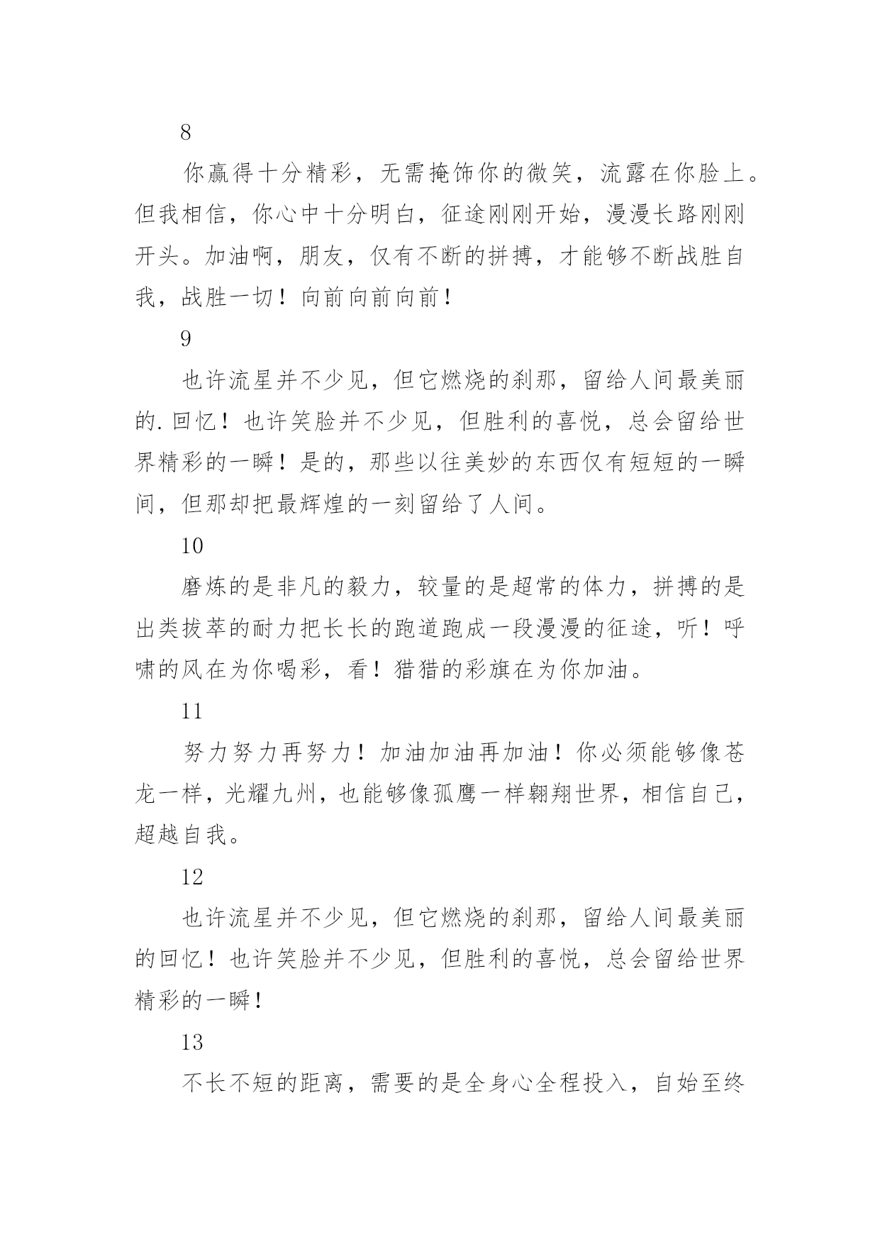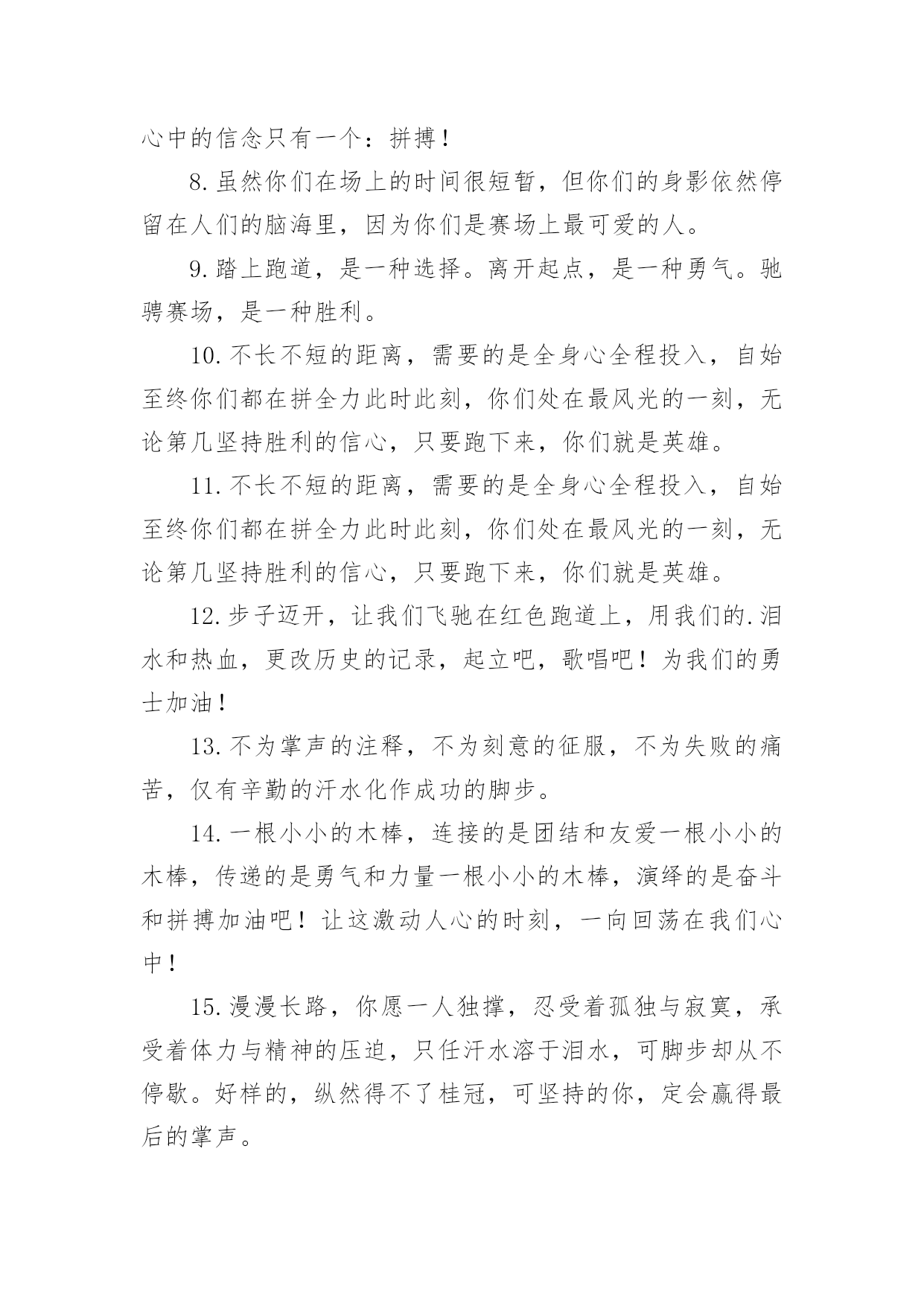 运动会加油稿运动会加油稿【汇总12篇】在不断进步的社会中,各种加油稿频频出现,加油稿可以起到鼓励场上的人、增添其信心的作用。如何写一份恰当的加油稿呢?下面是小编整理的运动会加油稿,仅供参考,希望能够帮助到大家。运动会加油稿篇1你的汗水洒在跑道,浇灌着成功的花朵开放;你的欢笑飞扬在赛场,为班争光数你最棒;跑吧,追吧,在这广阔的赛场上,你似骏马似离弦的'箭;跑吧,追吧,你比虎猛比豹强。奥林匹克精神佳,运动健将拼搏强。在运动场上的运动健儿们,发挥你们的特长,展示你们的风采,让你们的身影在运动场上留下优美的风景线,让你们的雄心壮志在运动场上发挥的淋漓尽致。望着远方红色的终点线,那是汗水铺成的路,泪水堆成的山,平时的努力与奋战,不就为这一瞬间,于是你们用尽全身力气,冲向那决定命运的红线,你胜利了,耳旁飘来了同学们的欢呼与赞叹。今日的你们英姿飒爽,今日的你们朝气蓬勃,今日的你们一马当先。相信自己,你是最棒的!不要放弃,不要气馁。成功永远属于你们。运动员!加油啊。洒一把艰辛的汗水,继续抬起疲倦的脚步,爆发的一吼气贯长虹,继续向前,不论成功与否,你已曾经拥有,曾记否,在终点欢呼,震惊四周。运动会加油稿篇2每一份辛劳都有一份收获,每一次的痛苦都是快乐的开始,每一声呐喊都是力量的呼唤。我们有着大浪拍岸的豪迈,所以你不必在乎小荷初露的恬静,我们有着春日的阳光明媚,所以不用去羡慕冬日乱玉碎琼,我们是雨天的一把伞,是寒冷冬日里的.一盆炭火,温暖的不只是你我,而是大家的心。运动场上的健儿,掌声属于你们,鲜花属于你们,成功也是属于你们!时间在流逝,赛道在延伸,成功在你面前展现,心脏在跳动,热血在沸腾,辉煌在你脚下铸就。加油吧,健儿们!英雄舍我其谁,胜利当仁不让,声声誓言浸透着健儿们的昂扬斗志。朋友们,为运动健儿们喝彩,为运动喝彩吧!场上精彩纷呈,空气里的每一个分子浸透着自信,只要大家团结一心就能取得胜利,让我们高呼一声:运动员们加油吧!运动会加油稿篇3运动员那矫健的身姿,在1500米跑道上飞翔着,加油、加油、再加油……一滴滴的汗水,一丝丝的希望,人生能有几次搏,千百双眼睛在鼓励着你们,努力拼搏吧!胜利就在眼前!运动场上有你们的飒爽英姿,运动场上有你们的拼搏身影,面对漫漫的征途,你没有畏惧和退缩,任汗水打湿脊背,任疲惫爬满全身,依然奋力追赶,只有一个目标,只有一个信念,为班级赢得荣誉,拼搏吧!为我你们呐喊!加油!是种子就该有绿色的希望,是种子就该有金色的`梦想,不要躺在封闭的暖房。怕什么秋日薄薄的风霜,既然已走上了运动场,心里就不要多想,跑道已洒满阳光,不要羞涩、不要紧张,听秋雁在空中为你歌唱,快去拾取片片金黄充满信心,就有希望。悄悄的,我退居一旁避开所有的掌声和目光,远离胜利者的灿烂和辉煌。如果说生命也是一场竞争我参与也曾把竞争的滋味品尝。那么,让我也抬起头甩掉心中的压抑,下次运动员我仍会同你较量。这里需要激情,这里需要呐喊,这里同样需要掌声。当你乘胜而归,我们为你鼓掌,为你祝贺,当你失败而来,我们同样为你鼓掌,为你骄傲。当掌声再一次想起的时候,你已经站在了起跑线上,朋友,向前冲!我们在为你鼓掌。运动会加油稿篇41今日的你们英姿飒爽,今日的你们朝气蓬勃,今日的你们一马当先。相信自己,你是最棒的!不要放弃,不要气馁。成功永远属于你们。米运动员啊!加油啊。2看!那一面面迎风飘舞的彩旗,是一朵朵盛开的鲜花;听!那一阵阵惊天动地的欢呼,是回响在耳边胜利的风声。运动场上的你们,是胜利的标志,运动场上的你们,是青春的赞叹。去吧!去迎接那伟大的挑战,去吧!去做一名追风的少年。3心中坚定的信念,脚下沉稳的步伐,你用行动告诉我们一个不变之理,没有走不完的路,没有过不了的山,成功正在终点冲着你高高的招手,用你那顽强的意志去努力,去迎接终点的鲜花与掌声,相信成功必属于你。4大海如此的浩淼,鼓声多么美妙,运动员们,你们不再像平时那样渺小,我们默默的祈祷,以你们为骄傲,我们会永远为你们叫好。5坚定,执着,耐力与期望,在延伸的白色跑道中点点凝聚!力量,信念,拼搏与奋斗,在遥远的终点线上渐渐明亮!时代的强音正在你的脚下踏响。6超越对手,更要超越自我,追求卓越是我们的目标,是我们的信念,在清爽的秋季,在喧嚣的赛场,你们点燃了似火的热情,无论成败,你们永远是我们的骄傲,我们都为你们感到自豪!7你没有忘记,把闪亮的青春飞扬,你没有忘记,把身姿驰向胜利的方向,风一样的驰骋,风一样的纵横,不要轻言放下,因为我们已为青春宣誓——风行天下!8你赢得十分精彩,无需掩饰你的微笑,流露在你脸上。但我相信,你心中十分明白,征途刚刚开始,漫漫长路刚刚开头。加油啊,朋友,仅有不断的拼搏,才能够不断战胜自我,战胜一切!向前向前向前!9也许流星并不少见,但它燃烧的刹那,留给人间最美丽的.回忆!也许笑脸并不少见,