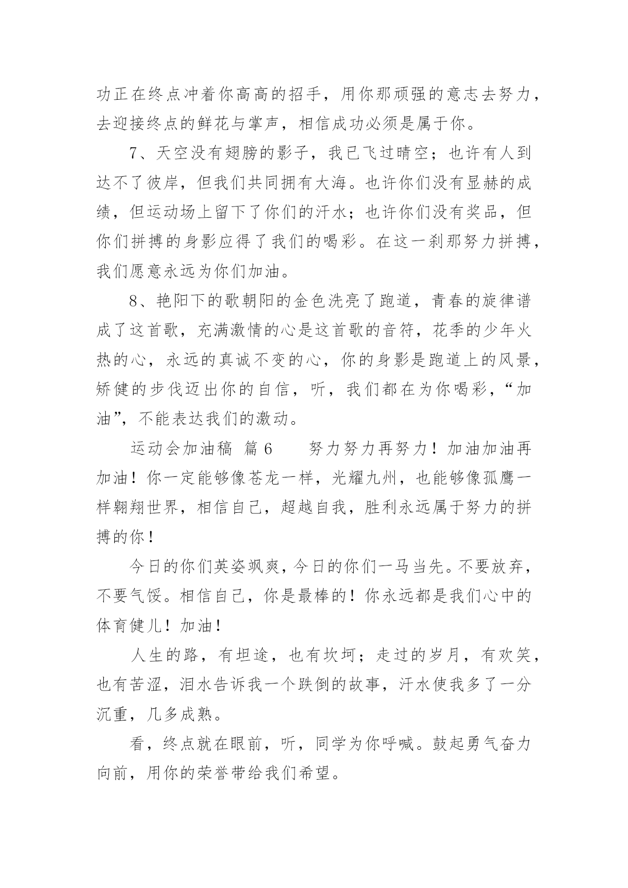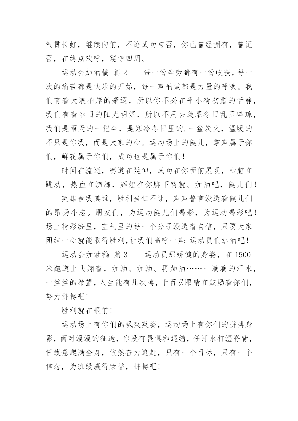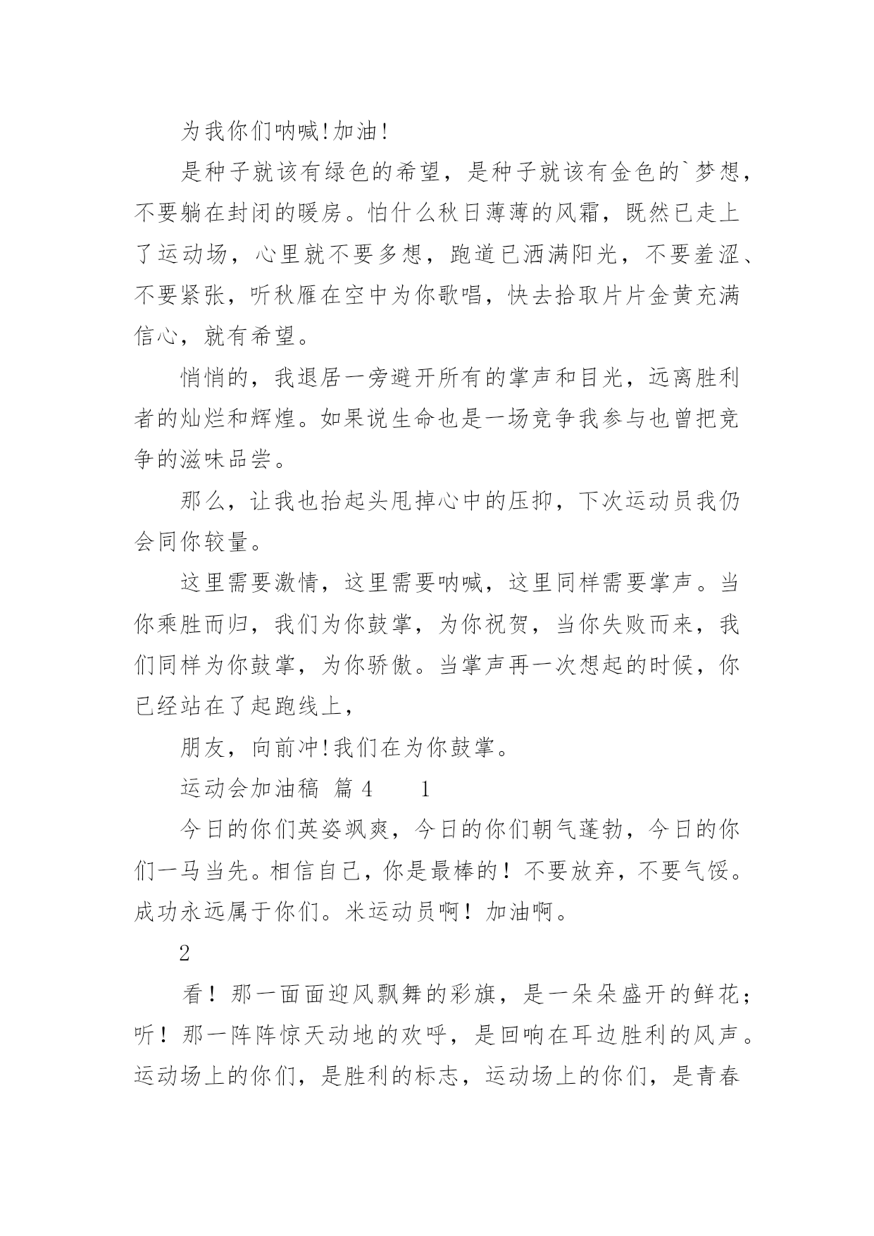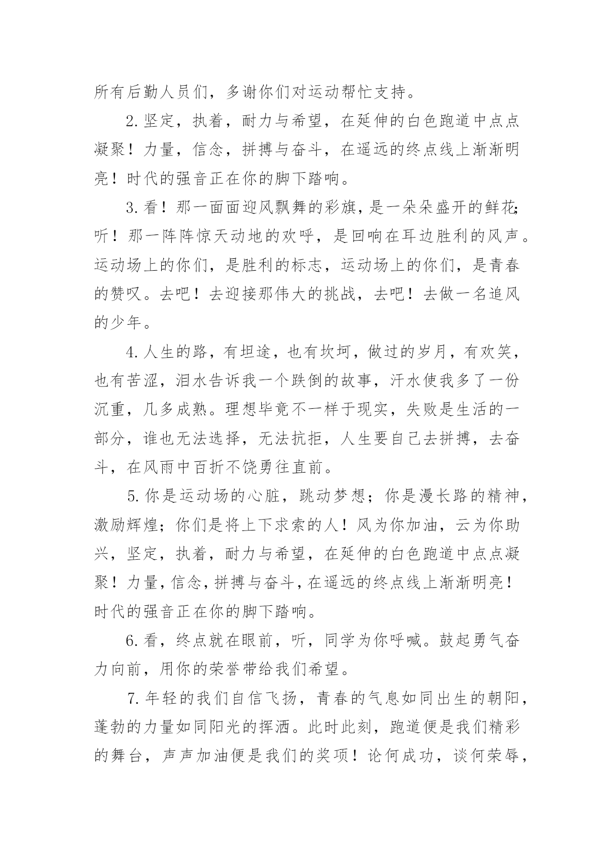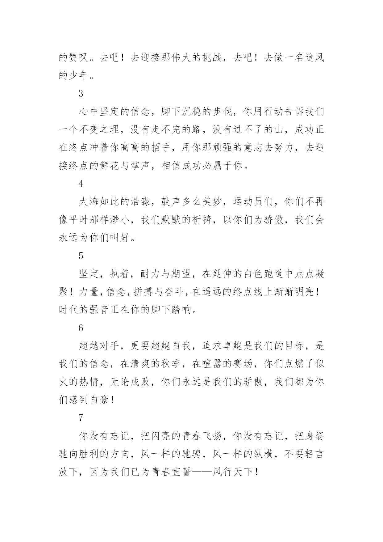 运动会加油稿运动会加油稿【汇总12篇】在不断进步的社会中,各种加油稿频频出现,加油稿可以起到鼓励场上的人、增添其信心的作用。如何写一份恰当的加油稿呢?下面是小编整理的运动会加油稿,仅供参考,希望能够帮助到大家。运动会加油稿篇1你的汗水洒在跑道,浇灌着成功的花朵开放;你的欢笑飞扬在赛场,为班争光数你最棒;跑吧,追吧,在这广阔的赛场上,你似骏马似离弦的'箭;跑吧,追吧,你比虎猛比豹强。奥林匹克精神佳,运动健将拼搏强。在运动场上的运动健儿们,发挥你们的特长,展示你们的风采,让你们的身影在运动场上留下优美的风景线,让你们的雄心壮志在运动场上发挥的淋漓尽致。望着远方红色的终点线,那是汗水铺成的路,泪水堆成的山,平时的努力与奋战,不就为这一瞬间,于是你们用尽全身力气,冲向那决定命运的红线,你胜利了,耳旁飘来了同学们的欢呼与赞叹。今日的你们英姿飒爽,今日的你们朝气蓬勃,今日的你们一马当先。相信自己,你是最棒的!不要放弃,不要气馁。成功永远属于你们。运动员!加油啊。洒一把艰辛的汗水,继续抬起疲倦的脚步,爆发的一吼气贯长虹,继续向前,不论成功与否,你已曾经拥有,曾记否,在终点欢呼,震惊四周。运动会加油稿篇2每一份辛劳都有一份收获,每一次的痛苦都是快乐的开始,每一声呐喊都是力量的呼唤。我们有着大浪拍岸的豪迈,所以你不必在乎小荷初露的恬静,我们有着春日的阳光明媚,所以不用去羡慕冬日乱玉碎琼,我们是雨天的一把伞,是寒冷冬日里的.一盆炭火,温暖的不只是你我,而是大家的心。运动场上的健儿,掌声属于你们,鲜花属于你们,成功也是属于你们!时间在流逝,赛道在延伸,成功在你面前展现,心脏在跳动,热血在沸腾,辉煌在你脚下铸就。加油吧,健儿们!英雄舍我其谁,胜利当仁不让,声声誓言浸透着健儿们的昂扬斗志。朋友们,为运动健儿们喝彩,为运动喝彩吧!场上精彩纷呈,空气里的每一个分子浸透着自信,只要大家团结一心就能取得胜利,让我们高呼一声:运动员们加油吧!运动会加油稿篇3运动员那矫健的身姿,在1500米跑道上飞翔着,加油、加油、再加油……一滴滴的汗水,一丝丝的希望,人生能有几次搏,千百双眼睛在鼓励着你们,努力拼搏吧!胜利就在眼前!运动场上有你们的飒爽英姿,运动场上有你们的拼搏身影,面对漫漫的征途,你没有畏惧和退缩,任汗水打湿脊背,任疲惫爬满全身,依然奋力追赶,只有一个目标,只有一个信念,为班级赢得荣誉,拼搏吧!为我你们呐喊!加油!是种子就该有绿色的希望,是种子就该有金色的`梦想,不要躺在封闭的暖房。怕什么秋日薄薄的风霜,既然已走上了运动场,心里就不要多想,跑道已洒满阳光,不要羞涩、不要紧张,听秋雁在空中为你歌唱,快去拾取片片金黄充满信心,就有希望。悄悄的,我退居一旁避开所有的掌声和目光,远离胜利者的灿烂和辉煌。如果说生命也是一场竞争我参与也曾把竞争的滋味品尝。那么,让我也抬起头甩掉心中的压抑,下次运动员我仍会同你较量。这里需要激情,这里需要呐喊,这里同样需要掌声。当你乘胜而归,我们为你鼓掌,为你祝贺,当你失败而来,我们同样为你鼓掌,为你骄傲。当掌声再一次想起的时候,你已经站在了起跑线上,朋友,向前冲!我们在为你鼓掌。运动会加油稿篇41今日的你们英姿飒爽,今日的你们朝气蓬勃,今日的你们一马当先。相信自己,你是最棒的!不要放弃,不要气馁。成功永远属于你们。米运动员啊!加油啊。2看!那一面面迎风飘舞的彩旗,是一朵朵盛开的鲜花;听!那一阵阵惊天动地的欢呼,是回响在耳边胜利的风声。运动场上的你们,是胜利的标志,运动场上的你们,是青春的赞叹。去吧!去迎接那伟大的挑战,去吧!去做一名追风的少年。3心中坚定的信念,脚下沉稳的步伐,你用行动告诉我们一个不变之理,没有走不完的路,没有过不了的山,成功正在终点冲着你高高的招手,用你那顽强的意志去努力,去迎接终点的鲜花与掌声,相信成功必属于你。4大海如此的浩淼,鼓声多么美妙,运动员们,你们不再像平时那样渺小,我们默默的祈祷,以你们为骄傲,我们会永远为你们叫好。5坚定,执着,耐力与期望,在延伸的白色跑道中点点凝聚!力量,信念,拼搏与奋斗,在遥远的终点线上渐渐明亮!时代的强音正在你的脚下踏响。6超越对手,更要超越自我,追求卓越是我们的目标,是我们的信念,在清爽的秋季,在喧嚣的赛场,你们点燃了似火的热情,无论成败,你们永远是我们的骄傲,我们都为你们感到自豪!7你没有忘记,把闪亮的青春飞扬,你没有忘记,把身姿驰向胜利的方向,风一样的驰骋,风一样的纵横,不要轻言放下,因为我们已为青春宣誓——风行天下!8你赢得十分精彩,无需掩饰你的微笑,流露在你脸上。但我相信,你心中十分明白,征途刚刚开始,漫漫长路刚刚开头。加油啊,朋友,仅有不断的拼搏,才能够不断战胜自我,战胜一切!向前向前向前!9也许流星并不少见,但它燃烧的刹那,留给人间最美丽的.回忆!也许笑脸并不少见,