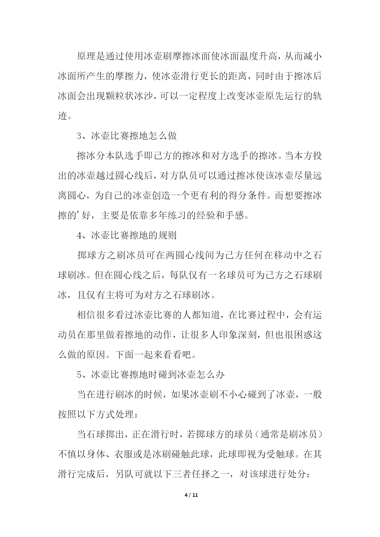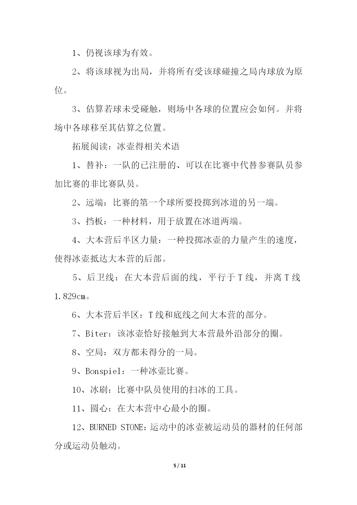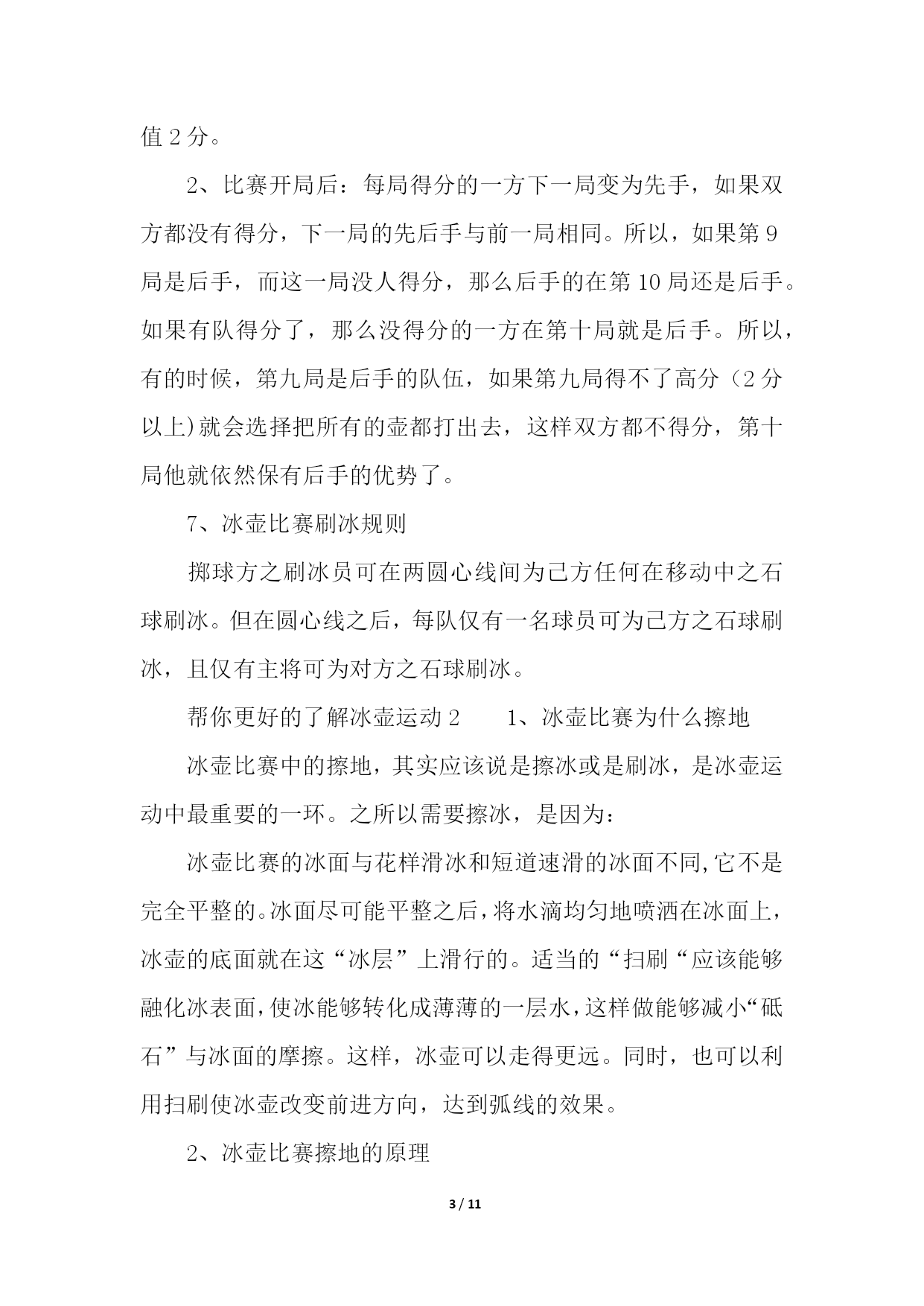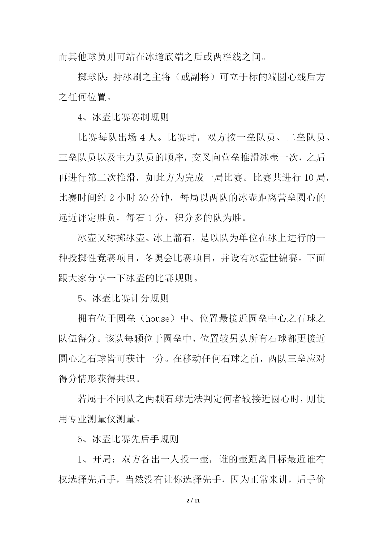 PAGE11/NUMPAGES11帮你更好的了解冰壶运动帮你更好的了解冰壶运动11、冰壶比赛场地规则1、冰上溜石所用场地是一个保持得非常平整的长44.5米、宽4.32米的冰道。2、冰道的一端画有一个直径为1.83米的圆圈作为球员的发球区,被称作本垒。3、冰道的另一端也画有一圆圈,被称为营垒,是由4个半径分别为0.15米、0.61米、1.22米和1.83米的同心圆组成。4、外面两圆之间涂为红色,在场地两端各装有一个斜面橡胶起蹬器。在冰壶场地前后两端各有一条蓝色的实线称为“前卫线”和“后卫线”。2、冰壶比赛装备规则冰上溜石的装备包括冰壶、比赛用鞋和毛刷。冰壶由苏格兰不含云母的花岗岩石凿磨制成,标准直径30厘米、高11.5厘米、重19.1公斤。参赛队员脚穿比赛专用鞋,两鞋底部质地不同,蹬冰脚的鞋底为橡胶制成,而滑行脚的鞋底为塑料制成。3、冰壶比赛球员位置规则为避免拥挤,比赛规则对于球员的位置也有所规定:非掷球队:主将及副将可站立于标的端之底线后方,主将也可立于掷球队之主将之后。下一顺位之掷球员可站在后板附近,而其他球员则可站在冰道底端之后或两栏线之间。掷球队:持冰刷之主将(或副将)可立于标的端圆心线后方之任何位置。4、冰壶比赛赛制规则比赛每队出场4人。比赛时,双方按一垒队员、二垒队员、三垒队员以及主力队员的顺序,交叉向营垒推滑冰壶一次,之后再进行第二次推滑,如此方为完成一局比赛。比赛共进行10局,比赛时间约2小时30分钟,每局以两队的冰壶距离营垒圆心的远近评定胜负,每石1分,积分多的队为胜。冰壶又称掷冰壶、冰上溜石,是以队为单位在冰上进行的一种投掷性竞赛项目,冬奥会比赛项目,并设有冰壶世锦赛。下面跟大家分享一下冰壶的比赛规则。5、冰壶比赛计分规则拥有位于圆垒(house)中、位置最接近圆垒中心之石球之队伍得分。该队每颗位于圆垒中、位置较另队所有石球都更接近圆心之石球皆可获计一分。在移动任何石球之前,两队三垒应对得分情形获得共识。若属于不同队之两颗石球无法判定何者较接近圆心时,则使用专业测量仪测量。6、冰壶比赛先后手规则1、开局:双方各出一人投一壶,谁的壶距离目标最近谁有权选择先后手,当然没有让你选择先手,因为正常来讲,后手价值2分。2、比赛开局后:每局得分的一方下一局变为先手,如果双方都没有得分,下一局的先后手与前一局相同。所以,如果第9局是后手,而这一局没人得分,那么后手的在第10局还是后手。如果有队得分了,那么没得分的一方在第十局就是后手。所以,有的时候,第九局是后手的队伍,如果第九局得不了高分(2分以上)就会选择把所有的壶都打出去,这样双方都不得分,第十局他就依然保有后手的优势了。7、冰壶比赛刷冰规则掷球方之刷冰员可在两圆心线间为己方任何在移动中之石球刷冰。但在圆心线之后,每队仅有一名球员可为己方之石球刷冰,且仅有主将可为对方之石球刷冰。帮你更好的了解冰壶运动21、冰壶比赛为什么擦地冰壶比赛中的擦地,其实应该说是擦冰或是刷冰,是冰壶运动中最重要的一环。之所以需要擦冰,是因为:冰壶比赛的冰面与花样滑冰和短道速滑的冰面不同,它不是完全平整的。冰面尽可能平整之后,将水滴均匀地喷洒在冰面上,冰壶的底面就在这“冰层”上滑行的。适当的“扫刷“应该能够融化冰表面,使冰能够转化成薄薄的一层水,这样做能够减小“砥石”与冰面的摩擦。这样,冰壶可以走得更远。同时,也可以利用扫刷使冰壶改变前进方向,达到弧线的效果。2、冰壶比赛擦地的原理原理是通过使用冰壶刷摩擦冰面使冰面温度升高,从而减小冰面所产生的摩擦力,使冰壶滑行更长的距离,同时由于擦冰后冰面会出现颗粒状冰沙,可以一定程度上改变冰壶原先运行的轨迹。3、冰壶比赛擦地怎么做擦冰分本队选手即己方的擦冰和对方选手的擦冰。当本方投出的冰壶越过圆心线后,对方队员可以通过擦冰使该冰壶尽量远离圆心,为自己的冰壶创造一个更有利的得分条件。而想要擦冰擦的'好,主要是依靠多年练习的经验和手感。4、冰壶比赛擦地的规则掷球方之刷冰员可在两圆心线间为己方任何在移动中之石球刷冰。但在圆心线之后,每队仅有一名球员可为己方之石球刷冰,且仅有主将可为对方之石球刷冰。相信很多看过冰壶比赛的人都知道,在比赛过程中,会有运动员在那里做着擦地的动作,让很多人印象深刻,但也很困惑这么做的原因。下面一起来看看吧。5、冰壶比赛擦地时碰到冰壶怎么办当在进行刷冰的时候,如果冰壶刷不小心碰到了冰壶,一般按照以下方式处理:当石球掷出,正在滑行时,若掷球方的球员(通常是刷冰员)不慎以身体、衣服或是冰刷碰触此球,此球即视为受触球。在其滑行完成后,另队可就以下三者任择之一,对该球进行处分:1、仍视该球为有效。2、将该球视为出局,并将所有受该球碰撞之局内球放为原位。3、估算若球未受碰触,则场中各球的位置应会如何。并将场中各球移至其估算之位置。