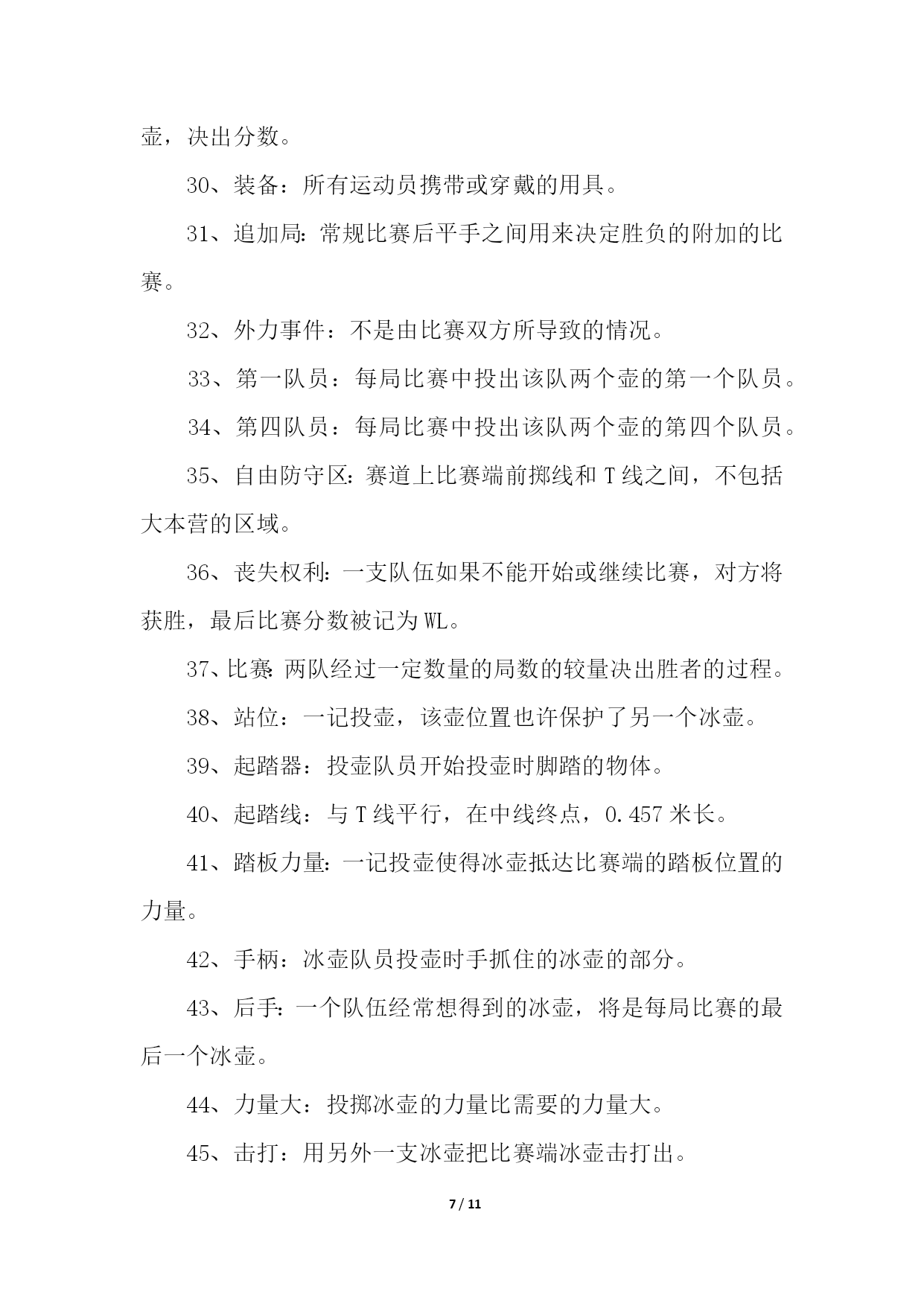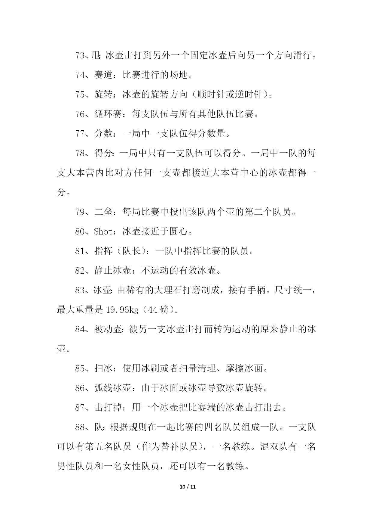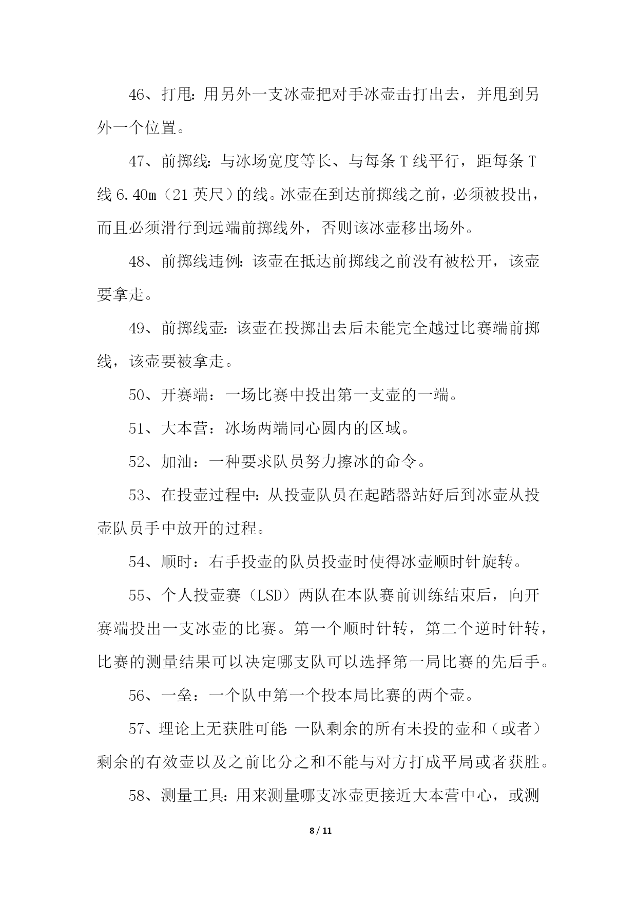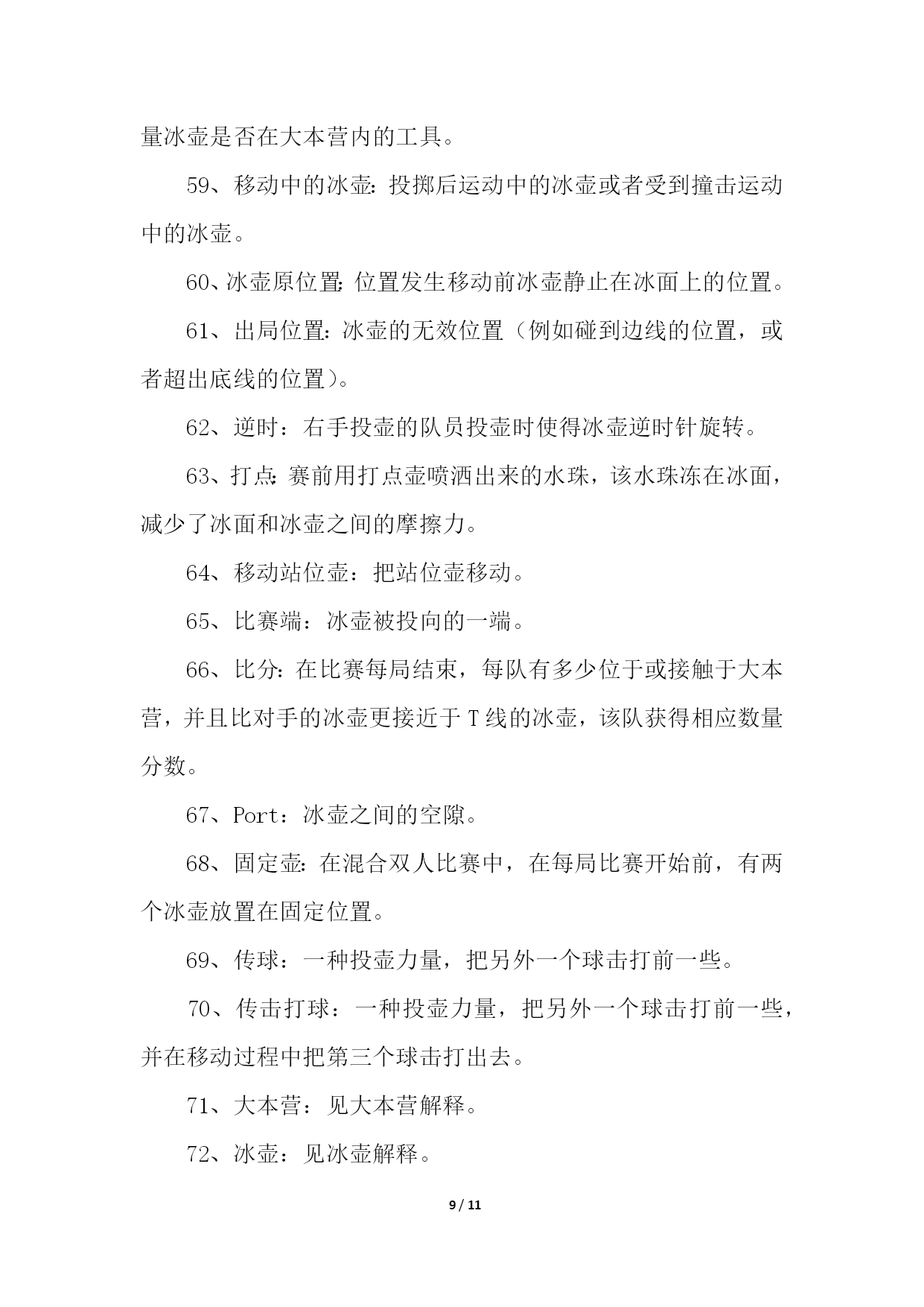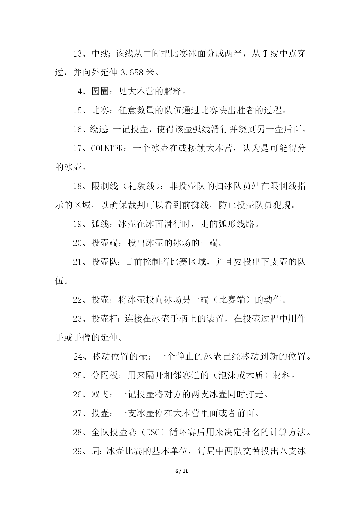 PAGE11/NUMPAGES11帮你更好的了解冰壶运动帮你更好的了解冰壶运动11、冰壶比赛场地规则1、冰上溜石所用场地是一个保持得非常平整的长44.5米、宽4.32米的冰道。2、冰道的一端画有一个直径为1.83米的圆圈作为球员的发球区,被称作本垒。3、冰道的另一端也画有一圆圈,被称为营垒,是由4个半径分别为0.15米、0.61米、1.22米和1.83米的同心圆组成。4、外面两圆之间涂为红色,在场地两端各装有一个斜面橡胶起蹬器。在冰壶场地前后两端各有一条蓝色的实线称为“前卫线”和“后卫线”。2、冰壶比赛装备规则冰上溜石的装备包括冰壶、比赛用鞋和毛刷。冰壶由苏格兰不含云母的花岗岩石凿磨制成,标准直径30厘米、高11.5厘米、重19.1公斤。参赛队员脚穿比赛专用鞋,两鞋底部质地不同,蹬冰脚的鞋底为橡胶制成,而滑行脚的鞋底为塑料制成。3、冰壶比赛球员位置规则为避免拥挤,比赛规则对于球员的位置也有所规定:非掷球队:主将及副将可站立于标的端之底线后方,主将也可立于掷球队之主将之后。下一顺位之掷球员可站在后板附近,而其他球员则可站在冰道底端之后或两栏线之间。掷球队:持冰刷之主将(或副将)可立于标的端圆心线后方之任何位置。4、冰壶比赛赛制规则比赛每队出场4人。比赛时,双方按一垒队员、二垒队员、三垒队员以及主力队员的顺序,交叉向营垒推滑冰壶一次,之后再进行第二次推滑,如此方为完成一局比赛。比赛共进行10局,比赛时间约2小时30分钟,每局以两队的冰壶距离营垒圆心的远近评定胜负,每石1分,积分多的队为胜。冰壶又称掷冰壶、冰上溜石,是以队为单位在冰上进行的一种投掷性竞赛项目,冬奥会比赛项目,并设有冰壶世锦赛。下面跟大家分享一下冰壶的比赛规则。5、冰壶比赛计分规则拥有位于圆垒(house)中、位置最接近圆垒中心之石球之队伍得分。该队每颗位于圆垒中、位置较另队所有石球都更接近圆心之石球皆可获计一分。在移动任何石球之前,两队三垒应对得分情形获得共识。若属于不同队之两颗石球无法判定何者较接近圆心时,则使用专业测量仪测量。6、冰壶比赛先后手规则1、开局:双方各出一人投一壶,谁的壶距离目标最近谁有权选择先后手,当然没有让你选择先手,因为正常来讲,后手价值2分。2、比赛开局后:每局得分的一方下一局变为先手,如果双方都没有得分,下一局的先后手与前一局相同。所以,如果第9局是后手,而这一局没人得分,那么后手的在第10局还是后手。如果有队得分了,那么没得分的一方在第十局就是后手。所以,有的时候,第九局是后手的队伍,如果第九局得不了高分(2分以上)就会选择把所有的壶都打出去,这样双方都不得分,第十局他就依然保有后手的优势了。7、冰壶比赛刷冰规则掷球方之刷冰员可在两圆心线间为己方任何在移动中之石球刷冰。但在圆心线之后,每队仅有一名球员可为己方之石球刷冰,且仅有主将可为对方之石球刷冰。帮你更好的了解冰壶运动21、冰壶比赛为什么擦地冰壶比赛中的擦地,其实应该说是擦冰或是刷冰,是冰壶运动中最重要的一环。之所以需要擦冰,是因为:冰壶比赛的冰面与花样滑冰和短道速滑的冰面不同,它不是完全平整的。冰面尽可能平整之后,将水滴均匀地喷洒在冰面上,冰壶的底面就在这“冰层”上滑行的。适当的“扫刷“应该能够融化冰表面,使冰能够转化成薄薄的一层水,这样做能够减小“砥石”与冰面的摩擦。这样,冰壶可以走得更远。同时,也可以利用扫刷使冰壶改变前进方向,达到弧线的效果。2、冰壶比赛擦地的原理原理是通过使用冰壶刷摩擦冰面使冰面温度升高,从而减小冰面所产生的摩擦力,使冰壶滑行更长的距离,同时由于擦冰后冰面会出现颗粒状冰沙,可以一定程度上改变冰壶原先运行的轨迹。3、冰壶比赛擦地怎么做擦冰分本队选手即己方的擦冰和对方选手的擦冰。当本方投出的冰壶越过圆心线后,对方队员可以通过擦冰使该冰壶尽量远离圆心,为自己的冰壶创造一个更有利的得分条件。而想要擦冰擦的'好,主要是依靠多年练习的经验和手感。4、冰壶比赛擦地的规则掷球方之刷冰员可在两圆心线间为己方任何在移动中之石球刷冰。但在圆心线之后,每队仅有一名球员可为己方之石球刷冰,且仅有主将可为对方之石球刷冰。相信很多看过冰壶比赛的人都知道,在比赛过程中,会有运动员在那里做着擦地的动作,让很多人印象深刻,但也很困惑这么做的原因。下面一起来看看吧。5、冰壶比赛擦地时碰到冰壶怎么办当在进行刷冰的时候,如果冰壶刷不小心碰到了冰壶,一般按照以下方式处理:当石球掷出,正在滑行时,若掷球方的球员(通常是刷冰员)不慎以身体、衣服或是冰刷碰触此球,此球即视为受触球。在其滑行完成后,另队可就以下三者任择之一,对该球进行处分:1、仍视该球为有效。2、将该球视为出局,并将所有受该球碰撞之局内球放为原位。3、估算若球未受碰触,则场中各球的位置应会如何。并将场中各球移至其估算之位置。