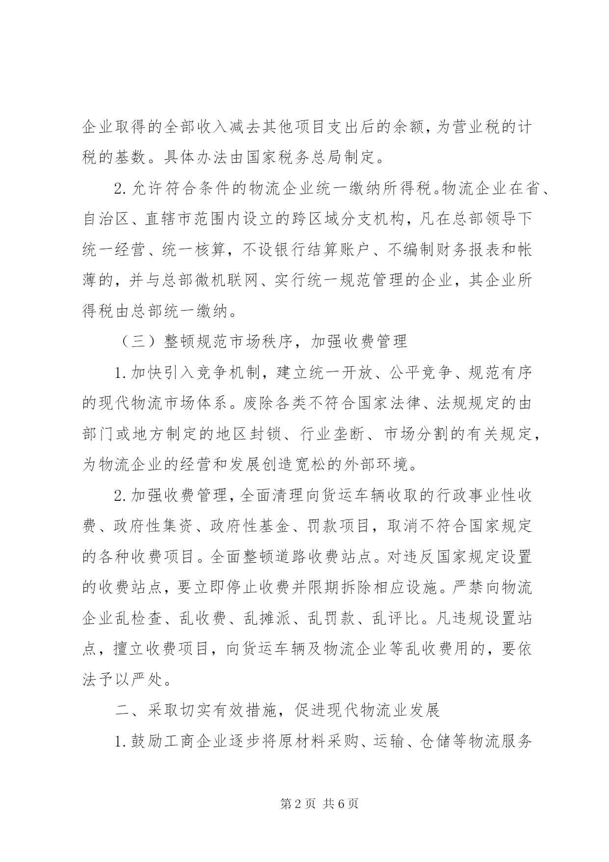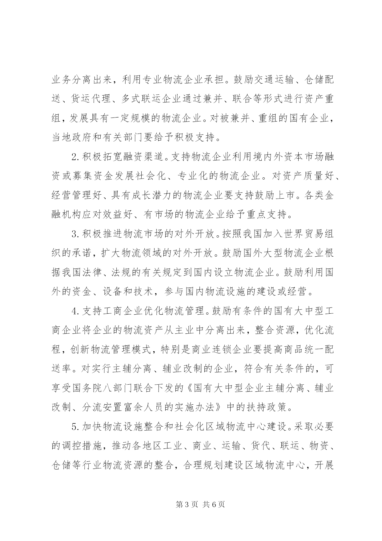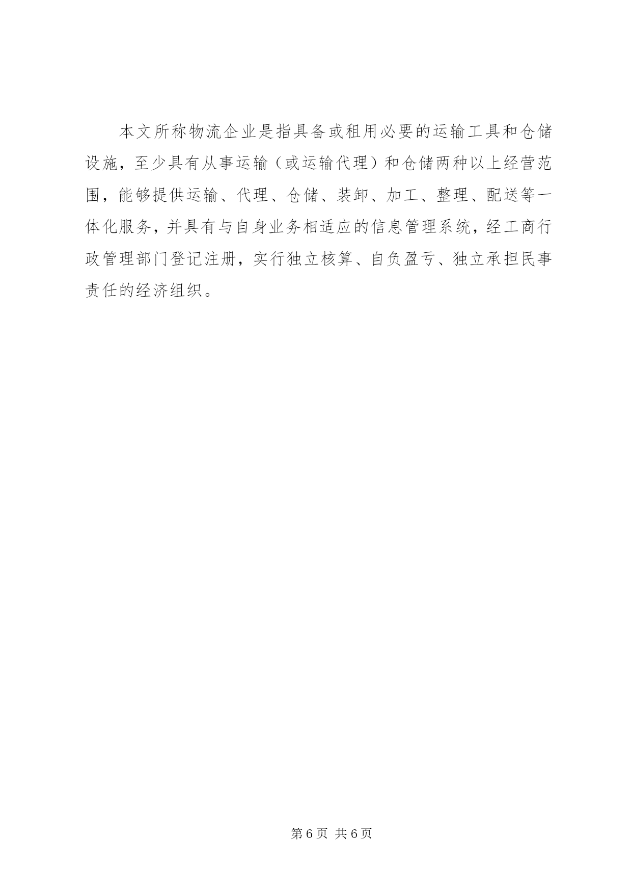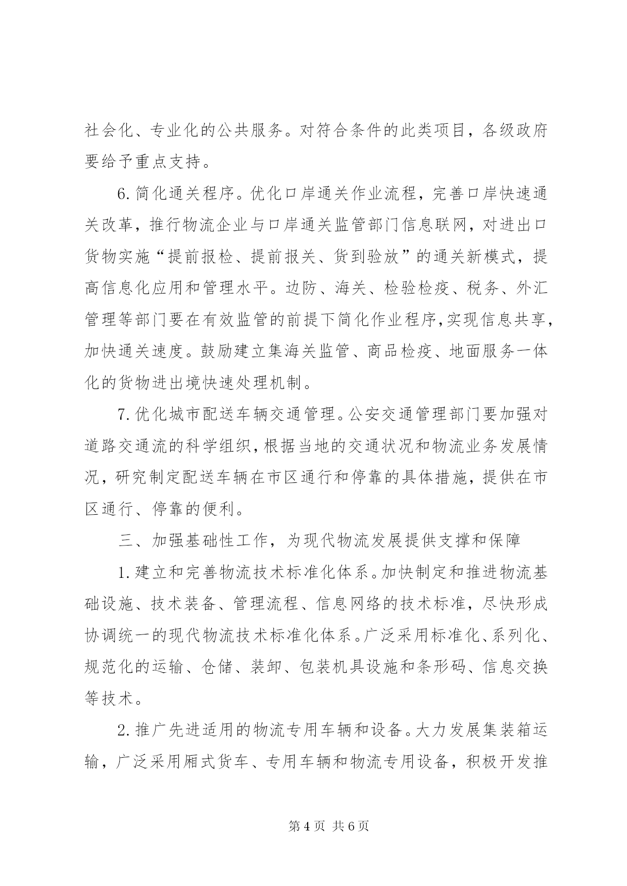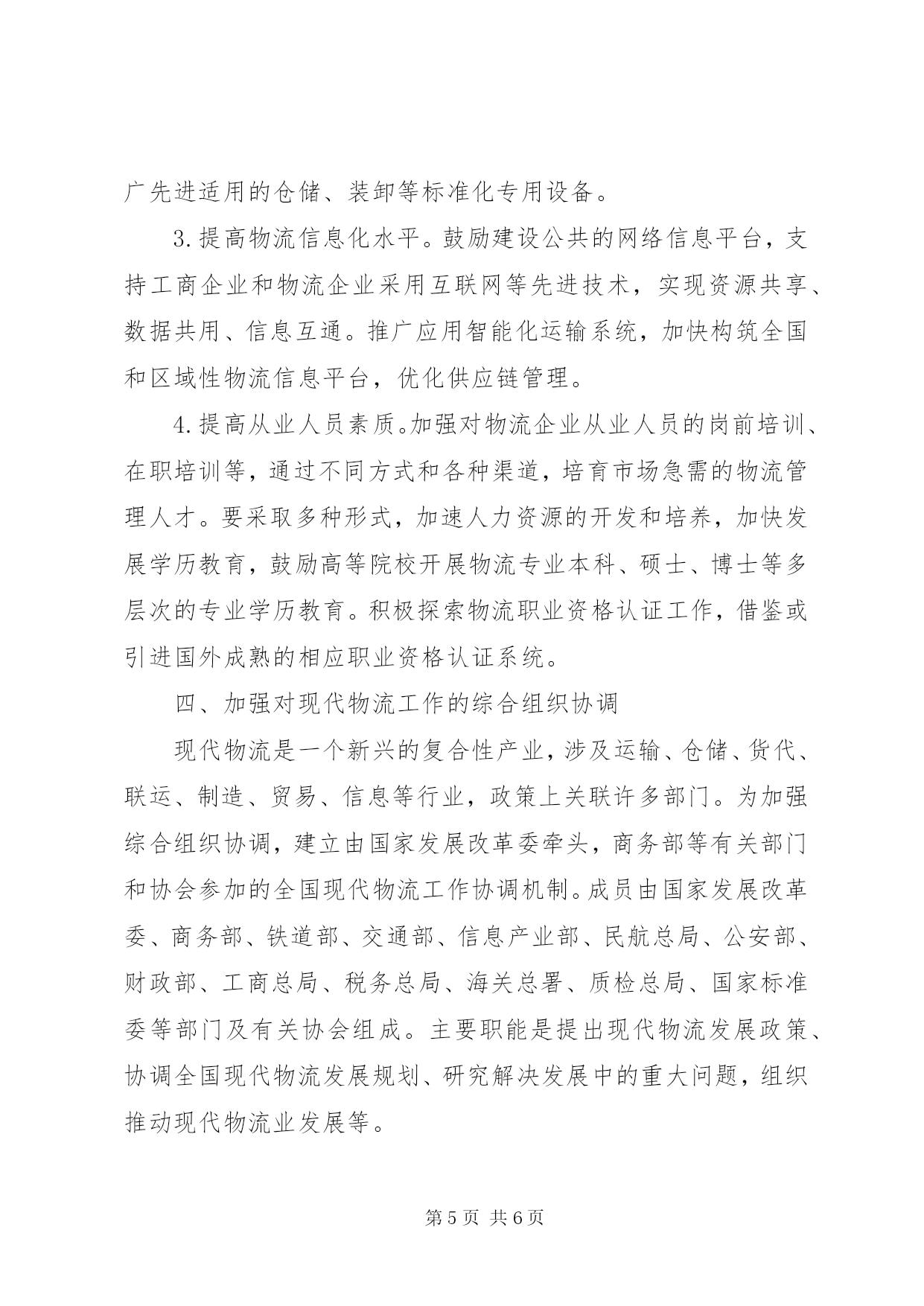第PAGE\*Arabic\*MERGEFORMAT6页共NUMPAGES\*MERGEFORMAT6页现代物流业发展的意见加快发展现代物流业,是我国应对经济全球化和加入世界贸易组织的迫切需要,对于提高我国经济运行质量和效益,优化资源配置,改善投资环境,增强综合国力和企业竞争力具有重要意义。为进一步推进我国现代物流业的发展,在全国范围内尽快形成物畅其流、快捷准时、经济合理、用户满意的社会化、专业化的现代物流服务体系,特提出以下意见。一、营造有利于现代物流业发展的良好环境(一)调整现行行政管理方式1.规范企业登记注册前置性审批。工商行政管理部门在为物流企业办理登记注册时,除国家法律、行政法规和国务院发布决定规定外,其他前置性审批事项一律取消。2.改革货运代理行政性管理。取消经营国内铁路货运代理、水路货运代理和联运代理的行政性审批,加强对货运代理经营资质和经营行为的监督检查。取消国际货运代理企业经营资格审批,加强后续监督和管理。改革民航货运销售代理审批制度,由民航总局会同有关部门制定新的民航货运代理管理办法。对危险品等特种货物的运输代理严格按照国家有关规定办理。(二)完善物流企业税收管理1.合理确定物流企业营业税计征基数。物流企业将承揽的运输、仓储等业务分包给其他单位并由其统一收取价款的,应以该企业取得的全部收入减去其他项目支出后的余额,为营业税的计税的基数。具体办法由国家税务总局制定。2.允许符合条件的物流企业统一缴纳所得税。物流企业在省、自治区、直辖市范围内设立的跨区域分支机构,凡在总部领导下统一经营、统一核算,不设银行结算账户、不编制财务报表和帐薄的,并与总部微机联网、实行统一规范管理的企业,其企业所得税由总部统一缴纳。(三)整顿规范市场秩序,加强收费管理1.加快引入竞争机制,建立统一开放、公平竞争、规范有序的现代物流市场体系。废除各类不符合国家法律、法规规定的由部门或地方制定的地区封锁、行业垄断、市场分割的有关规定,为物流企业的经营和发展创造宽松的外部环境。2.加强收费管理,全面清理向货运车辆收取的行政事业性收费、政府性集资、政府性基金、罚款项目,取消不符合国家规定的各种收费项目。全面整顿道路收费站点。对违反国家规定设置的收费站点,要立即停止收费并限期拆除相应设施。严禁向物流企业乱检查、乱收费、乱摊派、乱罚款、乱评比。凡违规设置站点,擅立收费项目,向货运车辆及物流企业等乱收费用的,要依法予以严处。二、采取切实有效措施,促进现代物流业发展1.鼓励工商企业逐步将原材料采购、运输、仓储等物流服务业务分离出来,利用专业物流企业承担。鼓励交通运输、仓储配送、货运代理、多式联运企业通过兼并、联合等形式进行资产重组,发展具有一定规模的物流企业。对被兼并、重组的国有企业,当地政府和有关部门要给予积极支持。2.积极拓宽融资渠道。支持物流企业利用境内外资本市场融资或募集资金发展社会化、专业化的物流企业。对资产质量好、经营管理好、具有成长潜力的物流企业要支持鼓励上市。各类金融机构应对效益好、有市场的物流企业给予重点支持。3.积极推进物流市场的对外开放。按照我国加入世界贸易组织的承诺,扩大物流领域的对外开放。鼓励国外大型物流企业根据我国法律、法规的有关规定到国内设立物流企业。鼓励利用国外的资金、设备和技术,参与国内物流设施的建设或经营。4.支持工商企业优化物流管理。鼓励有条件的国有大中型工商企业将企业的物流资产从主业中分离出来,整合资源,优化流程,创新物流管理模式,特别是商业连锁企业要提高商品统一配送率。对实行主辅分离、辅业改制的企业,符合有关条件的,可享受国务院八部门联合下发的《国有大中型企业主辅分离、辅业改制、分流安置富余人员的实施办法》中的扶持政策。5.加快物流设施整合和社会化区域物流中心建设。采取必要的调控措施,推动各地区工业、商业、运输、货代、联运、物资、仓储等行业物流资源的整合,合理规划建设区域物流中心,开展社会化、专业化的公共服务。对符合条件的此类项目,各级政府要给予重点支持。6.简化通关程序。优化口岸通关作业流程,完善口岸快速通关改革,推行物流企业与口岸通关监管部门信息联网,对进出口货物实施“提前报检、提前报关、货到验放”的通关新模式,提高信息化应用和管理水平。边防、海关、检验检疫、税务、外汇管理等部门要在有效监管的前提下简化作业程序,实现信息共享,加快通关速度。鼓励建立集海关监管、商品检疫、地面服务一体化的货物进出境快速处理机制。7.优化城市配送车辆交通管理。公安交通管理部门要加强对道路交通流的科学组织,根据当地的交通状况和物流业务发展情况,研究制定配送车辆在市区通行和停靠的具体措施,提供在市区通行、停靠的便利。三、加强基础性工作,为现代物流发展提供支撑和保障1.建立和完善物流技术标准化体系。加快制定和