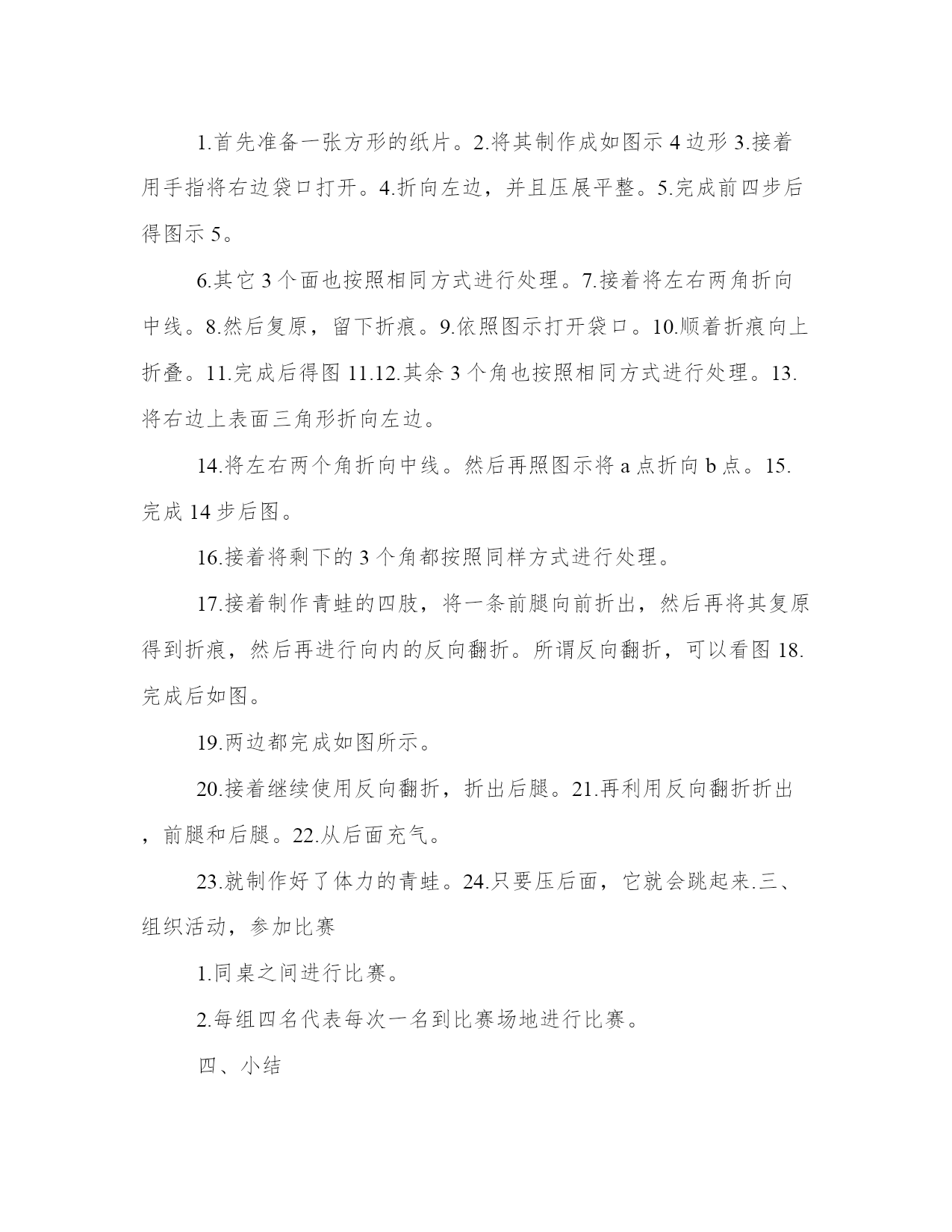 最新纸鹤的折纸教程(四篇)人的记忆力会随着岁月的流逝而衰退,写作可以弥补记忆的不足,将曾经的人生经历和感悟记录下来,也便于保存一份美好的回忆。范文书写有哪些要求呢?我们怎样才能写好一篇范文呢?以下是我为大家搜集的优质范文,仅供参考,一起来看看吧纸鹤的折纸教程篇一教学目的:、掌握折纸的基本方法。、能基本运用剪、撕、贴,画等方法进行完善,利用多种材料进行添加。教学重点:、让学生基本了解动物的外形特点和比例关系。2、学会利用多种材料和方法进行制作和添加。教学用具:动物娃娃、范画、课件、折纸作品、各色蜡光纸、音乐带、水彩笔、、双面胶,若干树叶和花布头等。教学过程:一、导入:、老师手拿一只纸折的千纸鹤入场。引出一个小故事.2、老师提问:“动物王国中发生了什么事?”3、老师提问:“图中是什么动物?有什么不同的特点?身体各个部分互相有什么比例特点?”二、新授:、展示:出示不同颜色、形状和种类的纸折小动物。2、这些小动物有什么样的特点,身体比例关系怎么样?3、开始引导比赛:(学生准备动手制作折纸小动物)。4、按学生意愿,将学生分为三个小组。、老师讲解折剪小动物的三大要领:(1)要按照折纸的规律来折。(2)可以在折纸的基础上,用撕、剪、贴等方法进行完善作品。(3)用画笔添加小动物的各个部分。三、练习:、老师坐在地上和学生一起动手折纸.四、评议:、老师请五、小结折纸教案教学目标:1.掌握折纸的基本方法,并能运用此方法制作出鱼的形象。2.能运用画的方法进行完善,利用水彩笔添加色彩。3.培养学生合作精神;培养学生保护动物的意识和热情。重难点:1.让学生基本了解鱼的外形特点和比例关系。2.学会利用水彩笔等材料进行完善。教学准备:1.彩色正方形纸2.彩笔教学过程:一、出示范例,创设情境1.出示范例师:“小朋友,今天老师给小朋友们带来了一位小客人,小朋友想不想知道它是谁?”(教师出示范例小鱼)2.贴图画图师:“小朋友,看,她是谁?”(小鱼)“对!小鱼。这条小鱼它叫莎莎,生活在无边的大海里。3.说感受4.导入课题二、探索实践,鱼儿找伴1.再示范例“小朋友刚才想的办法太好了,小鱼听了非常高兴,老师帮它又找来一位朋友,小朋友想帮忙吗?我们一起来试一试!”2.师生同折鱼(1)折小鱼用的是什么形状的纸?(正方形)(2)师折一步,学生跟着折(3)小鱼折好后还需要做什么?(引导说出怎样装饰小鱼)(4)用水彩笔画出鱼鳞和鱼眼3.教师巡视,指导个别没有做好的学生。三、展示作品,组织评价1.帮助学生将折好的小鱼粘在黑板上。2.引导学生进行评价交流。3.编编小故事4.与小鱼说再见,结束。折纸——青蛙教学目标:1.通过教学使学生掌握纸青蛙的折法,并对其进行装饰美化。2.培养学生耐心细致的学习态度及对青蛙的保护意识。重难点:折叠造型步骤、方法的掌握运用。教学准备:正方形彩纸,水彩笔教学过程:一、谈话导入课题1.今天老师给同学们带来了一只小玩具,看看是什么?2.我们现在就一起来学习折纸——青蛙。(板书课题)二、师生同折1.首先准备一张方形的纸片。2.将其制作成如图示4边形3.接着用手指将右边袋口打开。4.折向左边,并且压展平整。5.完成前四步后得图示5。6.其它3个面也按照相同方式进行处理。7.接着将左右两角折向中线。8.然后复原,留下折痕。9.依照图示打开袋口。10.顺着折痕向上折叠。11.完成后得图11.12.其余3个角也按照相同方式进行处理。13.将右边上表面三角形折向左边。14.将左右两个角折向中线。然后再照图示将a点折向b点。15.完成14步后图。16.接着将剩下的3个角都按照同样方式进行处理。17.接着制作青蛙的四肢,将一条前腿向前折出,然后再将其复原得到折痕,然后再进行向内的反向翻折。所谓反向翻折,可以看图18.完成后如图。19.两边都完成如图所示。20.接着继续使用反向翻折,折出后腿。21.再利用反向翻折折出,前腿和后腿。22.从后面充气。23.就制作好了体力的青蛙。24.只要压后面,它就会跳起来.三、组织活动,参加比赛1.同桌之间进行比赛。2.每组四名代表每次一名到比赛场地进行比赛。四、小结卷纸画“花”的教学过程一、教学目标1、了解平面绘画立体造型的不同。2、通过卷纸的设计与制作,发展孩子的立体造型能力。3、体验卷纸造型的乐趣,提供对花卉的观察力。重难点:把零散的卷纸拼贴、组合成自己喜欢的花卉。二、教学准备人手一份底色纸,硬板纸、剪刀、浆糊、抹布三、教学过程讲解示范1、以较慢的速度边讲解边示范:先把硬板纸剪成细条。做花蕊的,要在硬纸条两头粘上浆糊。花瓣可以是椭圆形,圆形。做花瓣在硬纸条两端粘上浆糊,面对面粘,这样较好看。2、边做边提问,你想做什么样的花蕾。