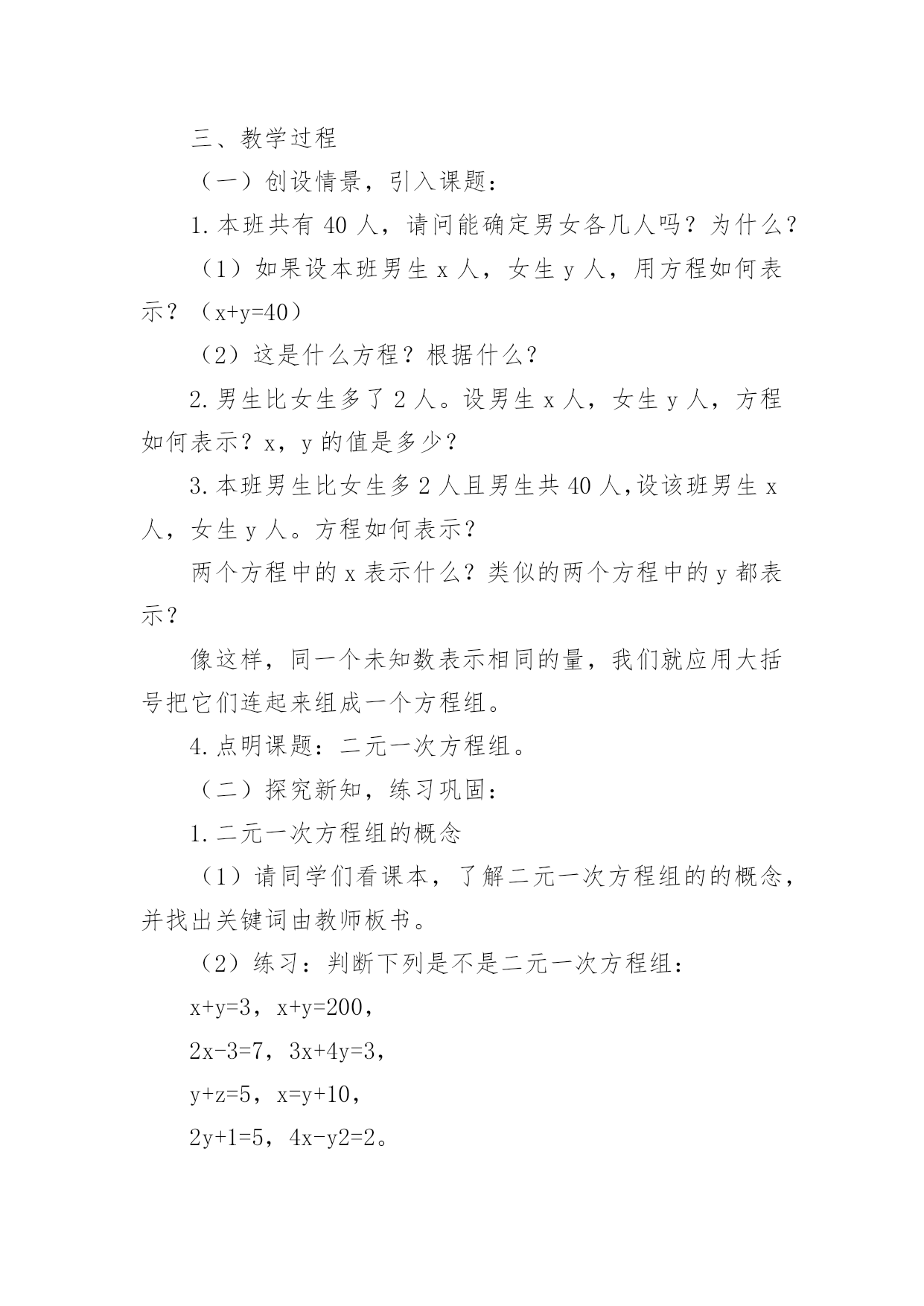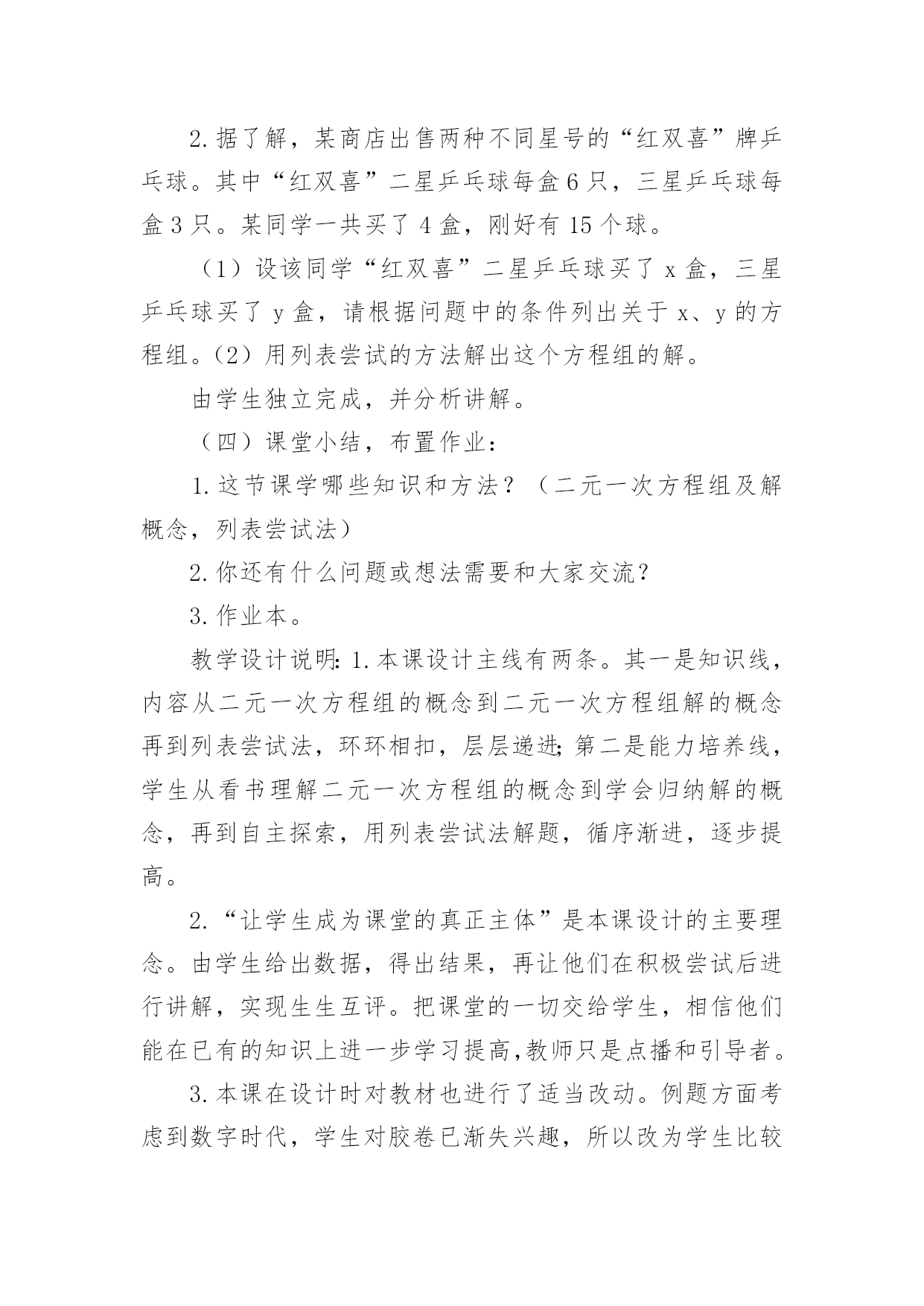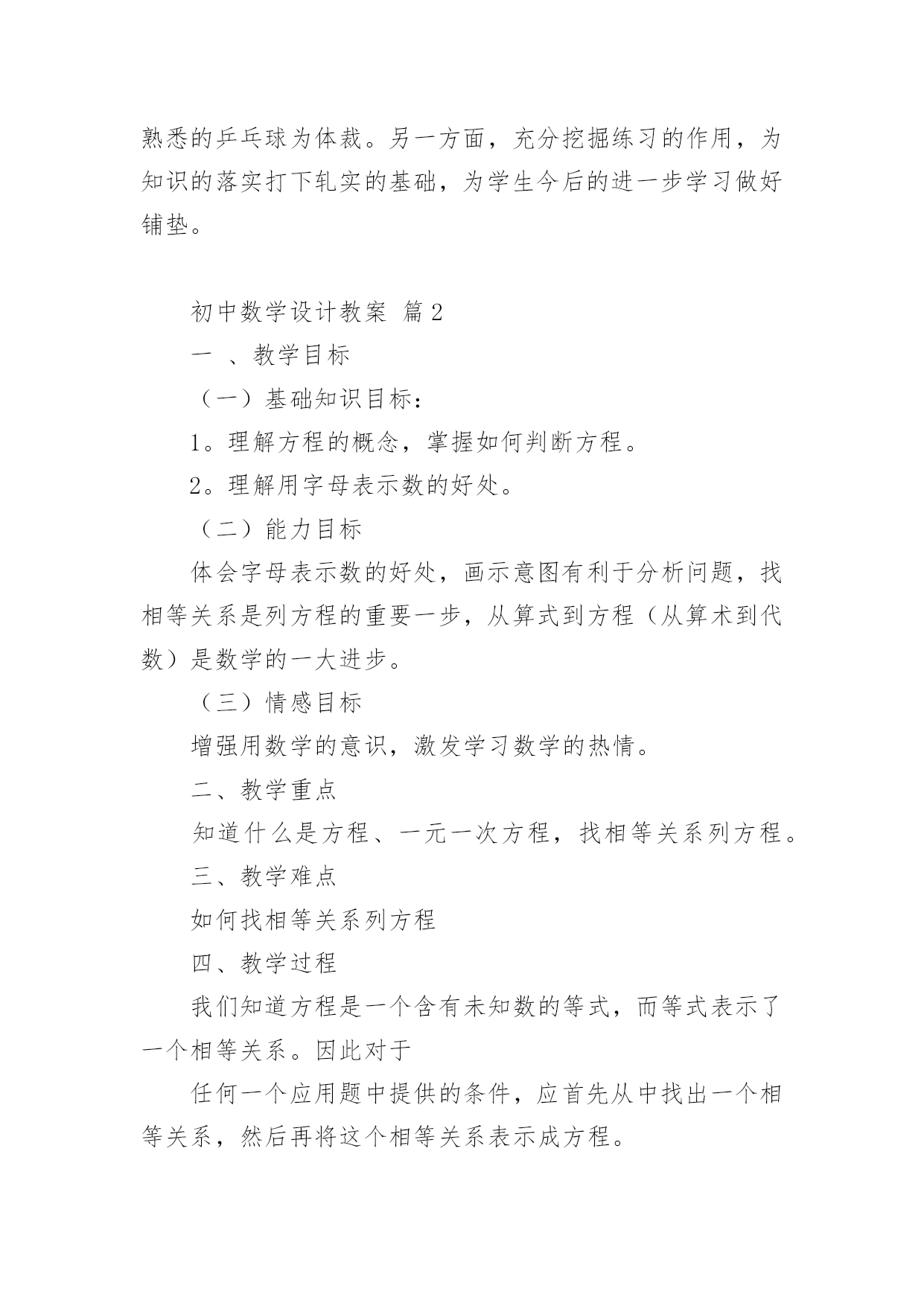 初中数学设计教案初中数学设计教案(15篇)作为一名优秀的教育工作者,有必要进行细致的教案准备工作,编写教案有利于我们准确把握教材的重点与难点,进而选择恰当的教学方法。如何把教案做到重点突出呢?下面是小编为大家收集的初中数学设计教案,欢迎阅读,希望大家能够喜欢。初中数学设计教案篇1一、教学目标(一)认知目标:1.了解二元一次方程组的概念。2.理解二元一次方程组的解的概念。3.会用列表尝试的方法找二元一次方程组的解。(二)能力目标:1.渗透把实际问题抽象成数学模型的思想。2.通过尝试求解,培养学生的探索能力。(三)情感目标:1.培养学生细致,认真的学习习惯。2.在积极的教学评价中,促进师生的情感交流。二、教学1.二元一次方程组及其解的概念。2.用列表尝试的方法求出方程组的解。三、教学过程(一)创设情景,引入课题:1.本班共有40人,请问能确定男女各几人吗?为什么?(1)如果设本班男生x人,女生y人,用方程如何表示?(x+y=40)(2)这是什么方程?根据什么?2.男生比女生多了2人。设男生x人,女生y人,方程如何表示?x,y的值是多少?3.本班男生比女生多2人且男生共40人,设该班男生x人,女生y人。方程如何表示?两个方程中的x表示什么?类似的两个方程中的y都表示?像这样,同一个未知数表示相同的量,我们就应用大括号把它们连起来组成一个方程组。4.点明课题:二元一次方程组。(二)探究新知,练习巩固:1.二元一次方程组的概念(1)请同学们看课本,了解二元一次方程组的的概念,并找出关键词由教师板书。(2)练习:判断下列是不是二元一次方程组:x+y=3,x+y=200,2x-3=7,3x+4y=3,y+z=5,x=y+10,2y+1=5,4x-y2=2。学生作出判断并要说明理由。2.二元一次方程组的解的概念(1)由学生给出引例的答案,教师指出这就是此方程组的解。(2)练习:把下列各组数的题序填入图中适当的位置:x=1;x=-2;x=;-x=?y=0;y=2;y=1;y=?方程x+y=0的解,方程2x+3y=2的解,方程组x+y=0的解。2x+3y=2。(3)既满足第一个方程也满足第二个方程的解叫作二元一次方程组的.解。(4)练习:已知x=0是方程组x-b=y的解,求a,b的值。y=0.55x+2a=2y。(三)合作探索,尝试求解:现在我们一起来探索如何寻找方程组的解呢?1.已知两个整数x,y,试找出方程组3x+y=8的解。2x+3y=10。学生两人一小组合作探索。并让已经找出方程组解的学生利用实物投影,讲明自己的解题思路。提炼方法:列表尝试法。一般思路:由一个方程取适当的xy的值,代到另一个方程尝试。2.据了解,某商店出售两种不同星号的“红双喜”牌乒乓球。其中“红双喜”二星乒乓球每盒6只,三星乒乓球每盒3只。某同学一共买了4盒,刚好有15个球。(1)设该同学“红双喜”二星乒乓球买了x盒,三星乒乓球买了y盒,请根据问题中的条件列出关于x、y的方程组。(2)用列表尝试的方法解出这个方程组的解。由学生独立完成,并分析讲解。(四)课堂小结,布置作业:1.这节课学哪些知识和方法?(二元一次方程组及解概念,列表尝试法)2.你还有什么问题或想法需要和大家交流?3.作业本。教学设计说明:1.本课设计主线有两条。其一是知识线,内容从二元一次方程组的概念到二元一次方程组解的概念再到列表尝试法,环环相扣,层层递进;第二是能力培养线,学生从看书理解二元一次方程组的概念到学会归纳解的概念,再到自主探索,用列表尝试法解题,循序渐进,逐步提高。2.“让学生成为课堂的真正主体”是本课设计的主要理念。由学生给出数据,得出结果,再让他们在积极尝试后进行讲解,实现生生互评。把课堂的一切交给学生,相信他们能在已有的知识上进一步学习提高,教师只是点播和引导者。3.本课在设计时对教材也进行了适当改动。例题方面考虑到数字时代,学生对胶卷已渐失兴趣,所以改为学生比较熟悉的乒乓球为体裁。另一方面,充分挖掘练习的作用,为知识的落实打下轧实的基础,为学生今后的进一步学习做好铺垫。初中数学设计教案篇2一、教学目标(一)基础知识目标:1。理解方程的概念,掌握如何判断方程。2。理解用字母表示数的好处。(二)能力目标体会字母表示数的好处,画示意图有利于分析问题,找相等关系是列方程的重要一步,从算式到方程(从算术到代数)是数学的一大进步。(三)情感目标增强用数学的意识,激发学习数学的热情。二、教学重点知道什么是方程、一元一次方程,找相等关系列方程。三、教学难点如何找相等关系列方程四、教学过程我们知道方程是一个含有未知数的等式,而等式表示了一个相等关系。因此对于任何一个应用题中提供的条件,应首先从中找出一个相等关系,然后再将这个相等关系表示成方程。本节课,我们就通过实例来说明怎样寻找一个相等的关系和