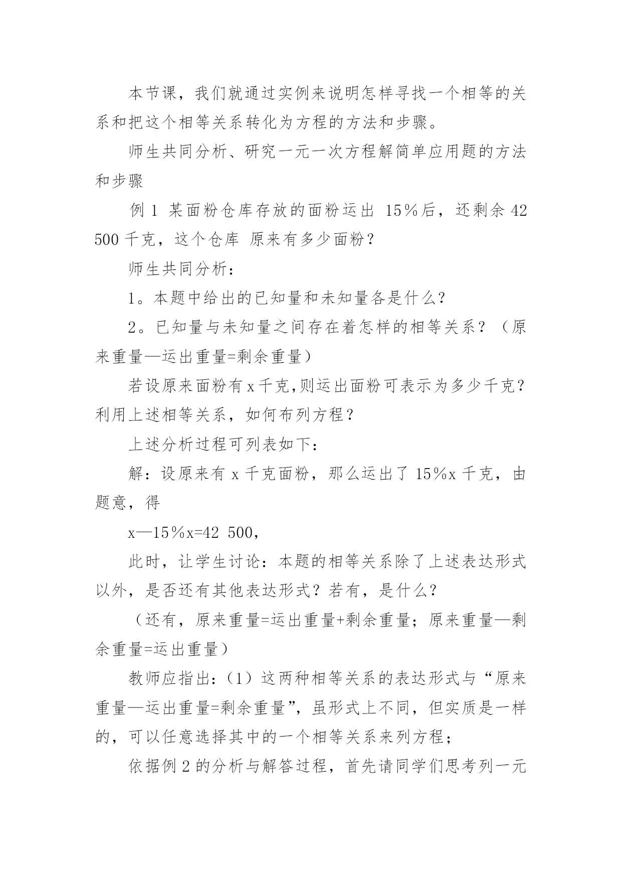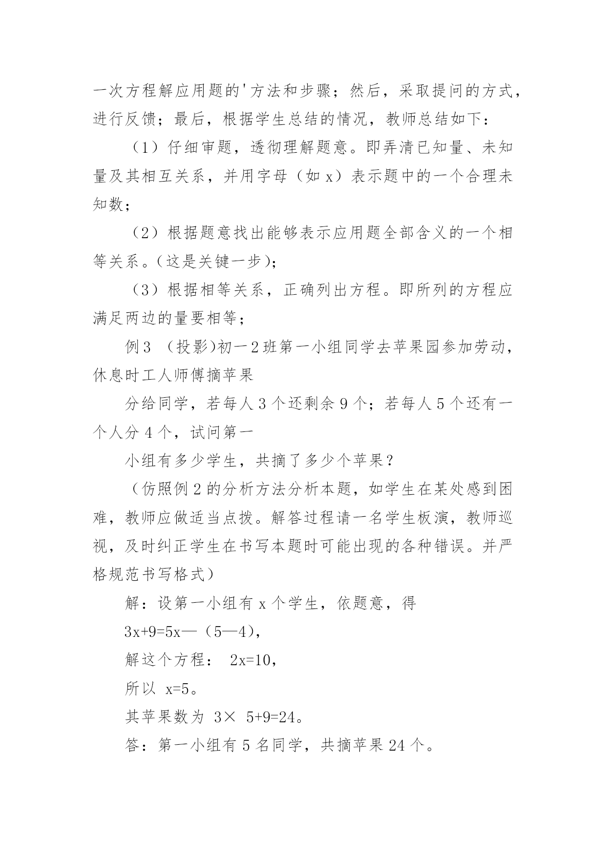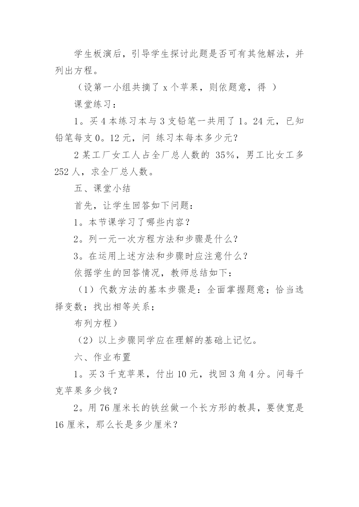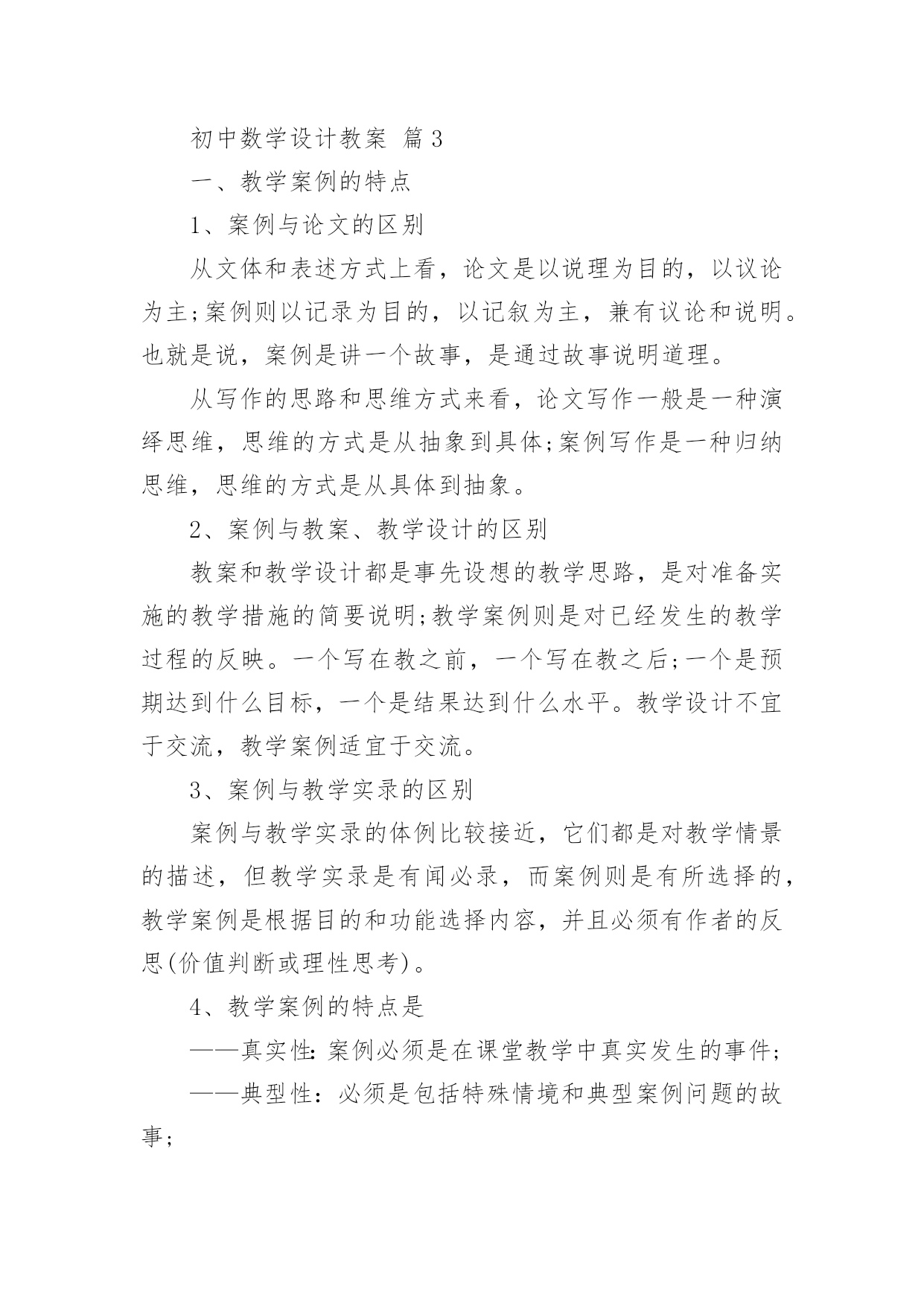 初中数学设计教案初中数学设计教案(15篇)作为一名优秀的教育工作者,有必要进行细致的教案准备工作,编写教案有利于我们准确把握教材的重点与难点,进而选择恰当的教学方法。如何把教案做到重点突出呢?下面是小编为大家收集的初中数学设计教案,欢迎阅读,希望大家能够喜欢。初中数学设计教案篇1一、教学目标(一)认知目标:1.了解二元一次方程组的概念。2.理解二元一次方程组的解的概念。3.会用列表尝试的方法找二元一次方程组的解。(二)能力目标:1.渗透把实际问题抽象成数学模型的思想。2.通过尝试求解,培养学生的探索能力。(三)情感目标:1.培养学生细致,认真的学习习惯。2.在积极的教学评价中,促进师生的情感交流。二、教学1.二元一次方程组及其解的概念。2.用列表尝试的方法求出方程组的解。三、教学过程(一)创设情景,引入课题:1.本班共有40人,请问能确定男女各几人吗?为什么?(1)如果设本班男生x人,女生y人,用方程如何表示?(x+y=40)(2)这是什么方程?根据什么?2.男生比女生多了2人。设男生x人,女生y人,方程如何表示?x,y的值是多少?3.本班男生比女生多2人且男生共40人,设该班男生x人,女生y人。方程如何表示?两个方程中的x表示什么?类似的两个方程中的y都表示?像这样,同一个未知数表示相同的量,我们就应用大括号把它们连起来组成一个方程组。4.点明课题:二元一次方程组。(二)探究新知,练习巩固:1.二元一次方程组的概念(1)请同学们看课本,了解二元一次方程组的的概念,并找出关键词由教师板书。(2)练习:判断下列是不是二元一次方程组:x+y=3,x+y=200,2x-3=7,3x+4y=3,y+z=5,x=y+10,2y+1=5,4x-y2=2。学生作出判断并要说明理由。2.二元一次方程组的解的概念(1)由学生给出引例的答案,教师指出这就是此方程组的解。(2)练习:把下列各组数的题序填入图中适当的位置:x=1;x=-2;x=;-x=?y=0;y=2;y=1;y=?方程x+y=0的解,方程2x+3y=2的解,方程组x+y=0的解。2x+3y=2。(3)既满足第一个方程也满足第二个方程的解叫作二元一次方程组的.解。(4)练习:已知x=0是方程组x-b=y的解,求a,b的值。y=0.55x+2a=2y。(三)合作探索,尝试求解:现在我们一起来探索如何寻找方程组的解呢?1.已知两个整数x,y,试找出方程组3x+y=8的解。2x+3y=10。学生两人一小组合作探索。并让已经找出方程组解的学生利用实物投影,讲明自己的解题思路。提炼方法:列表尝试法。一般思路:由一个方程取适当的xy的值,代到另一个方程尝试。2.据了解,某商店出售两种不同星号的“红双喜”牌乒乓球。其中“红双喜”二星乒乓球每盒6只,三星乒乓球每盒3只。某同学一共买了4盒,刚好有15个球。(1)设该同学“红双喜”二星乒乓球买了x盒,三星乒乓球买了y盒,请根据问题中的条件列出关于x、y的方程组。(2)用列表尝试的方法解出这个方程组的解。由学生独立完成,并分析讲解。(四)课堂小结,布置作业:1.这节课学哪些知识和方法?(二元一次方程组及解概念,列表尝试法)2.你还有什么问题或想法需要和大家交流?3.作业本。教学设计说明:1.本课设计主线有两条。其一是知识线,内容从二元一次方程组的概念到二元一次方程组解的概念再到列表尝试法,环环相扣,层层递进;第二是能力培养线,学生从看书理解二元一次方程组的概念到学会归纳解的概念,再到自主探索,用列表尝试法解题,循序渐进,逐步提高。2.“让学生成为课堂的真正主体”是本课设计的主要理念。由学生给出数据,得出结果,再让他们在积极尝试后进行讲解,实现生生互评。把课堂的一切交给学生,相信他们能在已有的知识上进一步学习提高,教师只是点播和引导者。3.本课在设计时对教材也进行了适当改动。例题方面考虑到数字时代,学生对胶卷已渐失兴趣,所以改为学生比较熟悉的乒乓球为体裁。另一方面,充分挖掘练习的作用,为知识的落实打下轧实的基础,为学生今后的进一步学习做好铺垫。初中数学设计教案篇2一、教学目标(一)基础知识目标:1。理解方程的概念,掌握如何判断方程。2。理解用字母表示数的好处。(二)能力目标体会字母表示数的好处,画示意图有利于分析问题,找相等关系是列方程的重要一步,从算式到方程(从算术到代数)是数学的一大进步。(三)情感目标增强用数学的意识,激发学习数学的热情。二、教学重点知道什么是方程、一元一次方程,找相等关系列方程。三、教学难点如何找相等关系列方程四、教学过程我们知道方程是一个含有未知数的等式,而等式表示了一个相等关系。因此对于任何一个应用题中提供的条件,应首先从中找出一个相等关系,然后再将这个相等关系表示成方程。本节课,我们就通过实例来说明怎样寻找一个相等的关系和