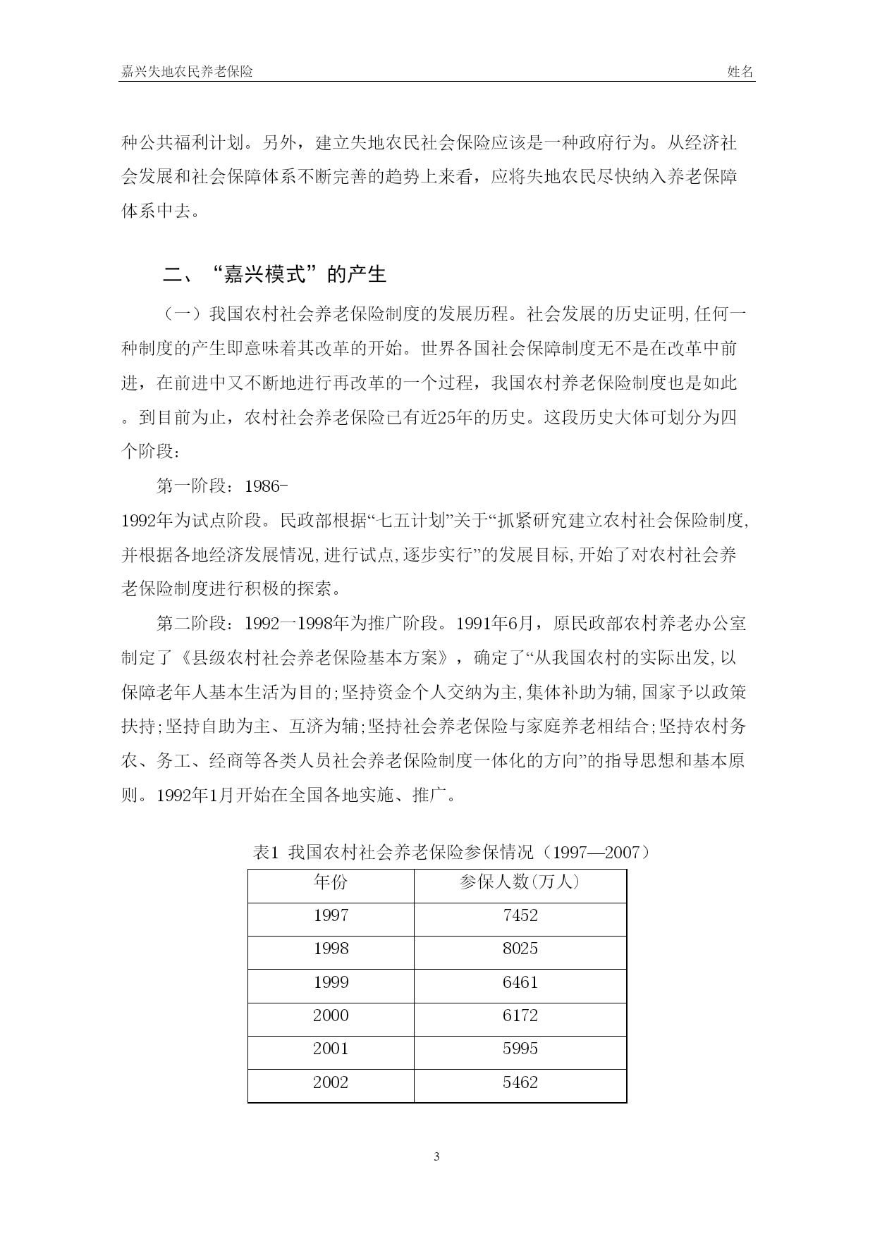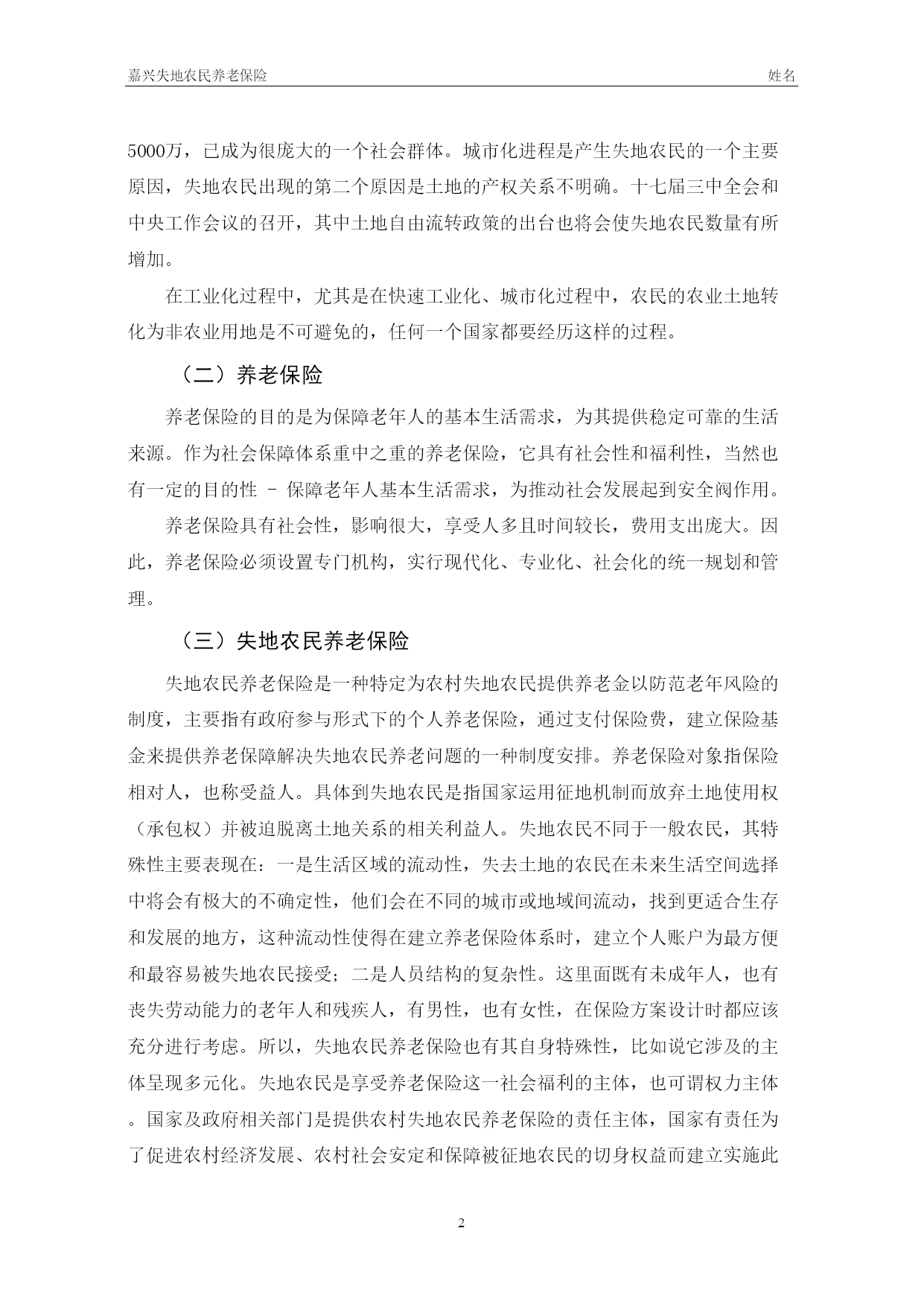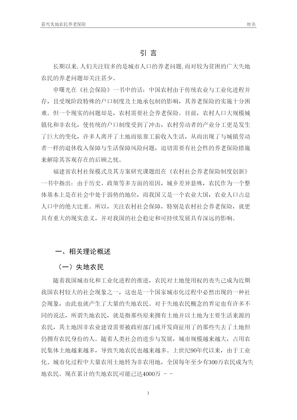 本科生毕业论文(设计)题目:系别:专业:学生姓名:学号:指导教师:(职称)二〇年月学术诚信声明本人所呈交的毕业论文,是在导师的指导下,独立进行研究工作所取得的成果,所有数据、图片资料均真实可靠。除文中已经注明引用的内容外,本论文不包含任何其他人或集体已经发表或撰写过的作品或成果。对本论文的研究作出重要贡献的个人和集体,均已在文中以明确的方式标明。本毕业论文的知识产权归属于培养单位。本人完全意识到本声明的法律结果由本人承担。本人签名:日期:浅谈嘉兴农村失地农民养老保险的问题和策略[论文摘要]党的“十七大”报告特别明确地提出:“探索建立农村养老保险制度。”这就告诉我们,在广大农民群众中建立社会养老保险制度,已经成为我国农村改革和发展所面临的重大任务。按照全面建设小康社会目标的新要求,完善社会主义市场经济体制,加快以改善民生为重点的社会建设,形成城乡经济社会发展一体化的新格局,都离不开建立覆盖城乡居民的社会保障体系。目前,城市居民社会保障体系已经基本建立,农村居民社会保障体系正在建设之中,而农民社会养老保险制度才刚刚起步。可见,加快建立农村社会养老保险制度,对于我国改革发展全局和小康社会建设,乃至应对国际金融危机和扩大国内消费需求,都具有非常重要的意义。由于近年来我国城镇化速度的加快,大量农民失去了原有的土地,导致农民的养老保险问题日益突出。本文基于对嘉兴市开展失地农民养老保险的调查,了解其现状,通过对其存在问题的原因分析,最终提出完善农村社会失地农民养老保障体系的对策思路。[关键词]失地农民养老保险现状问题[Abstract]"theparty"thereportclearlypointedout:"toexploretheestablishmentofruralendowmentinsurancesystem."Thistellsus,inthebroadmassesofpeasantsintheestablishmentofsocialendowmentinsurancesystem,hasbecomeChina'sruralreformanddevelopmentfaceamajortask.Accordingtothegoalofbuildingawell-offsocietyofthenewrequirements,perfectsystemofsocialistmarketeconomy,acceleratewiththefocusonimprovingpeople'slivelihoodandsocialconstruction,theformationofurbanandruraleconomicandsocialdevelopmentintegrationofthenewpattern,isinseparablefromtheestablishmentofthesocialsecuritysystemcoveringbothurbanandruralresidents.Atpresent,thecityresidents'socialsecuritysystemhasbeenbasicallyestablished,theruralresidents'socialsecuritysystemisunderconstruction,andtheruralsocialpensioninsurancesystemhasjuststarted.Visible,tospeeduptheestablishmentofruralsocialendowmentinsurancesystemforChina'sreform,developmentandconstructionofcomparativelywell-offsociety,andcopingwiththeinternationalfinancialcrisisandexpandingdomesticconsumptiondemand,hasveryimportantsignificance.InChinainrecentyearsduetothefasterpaceofurbanization,alargenumberoffarmerslostland,causefarmerold-ageinsurancequestionisoutstandingdaybyday.ThisarticleisbasedontheJiaxingcitytocarryouttheendowmentinsuranceoflostterritoryfarmerinvestigation,understa