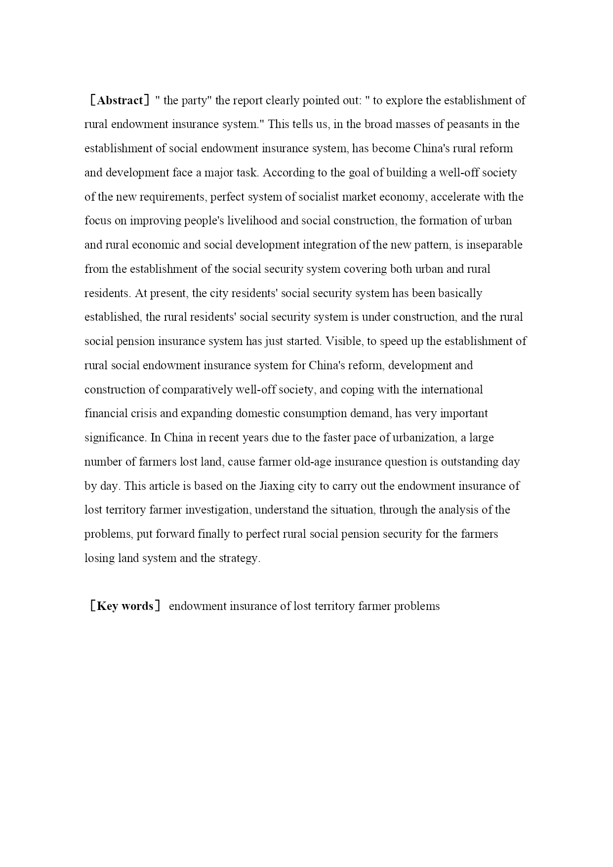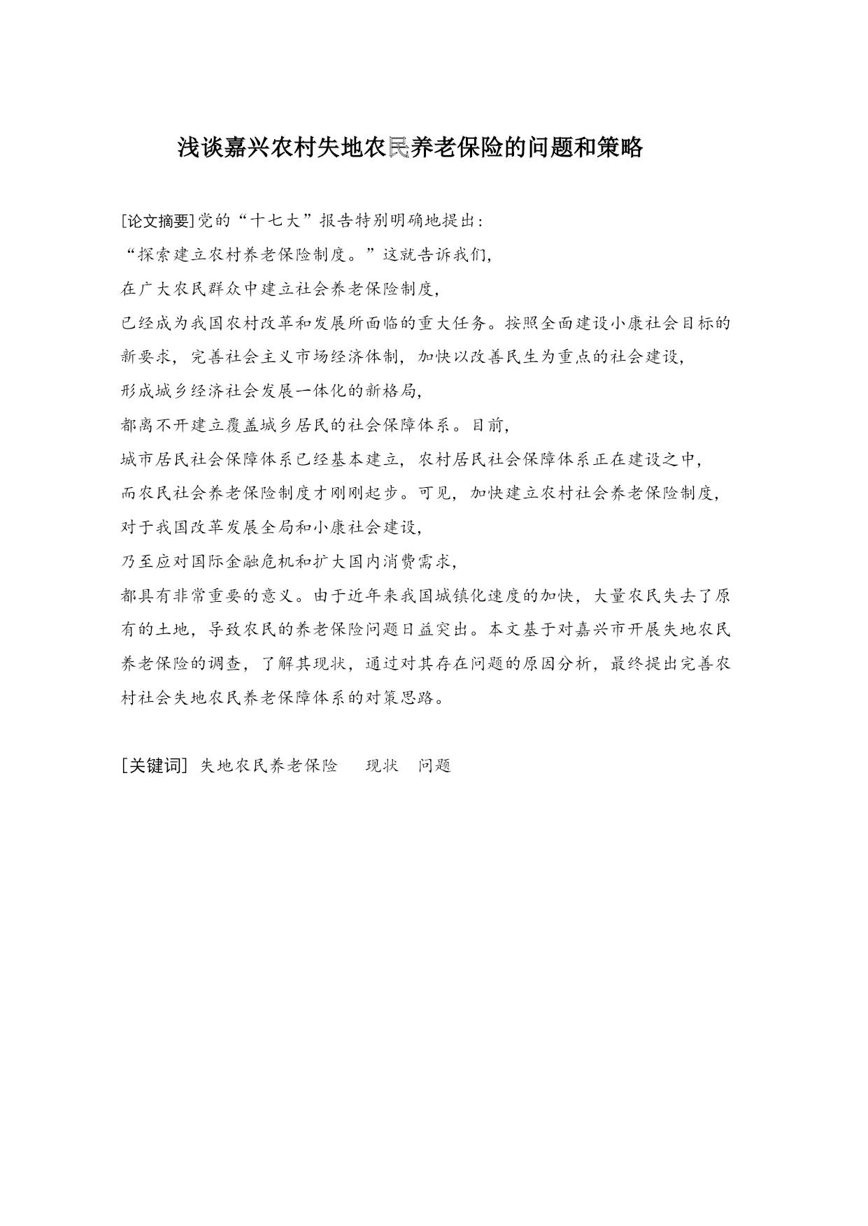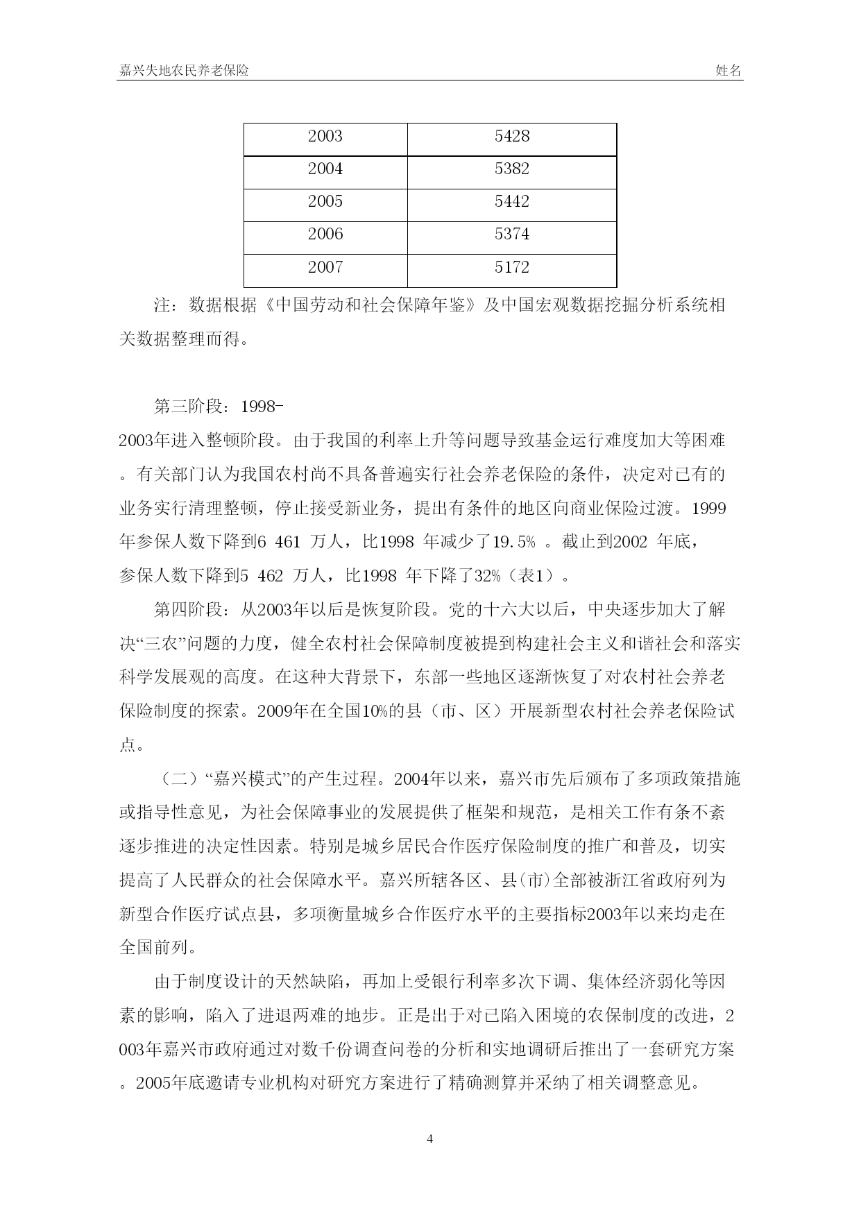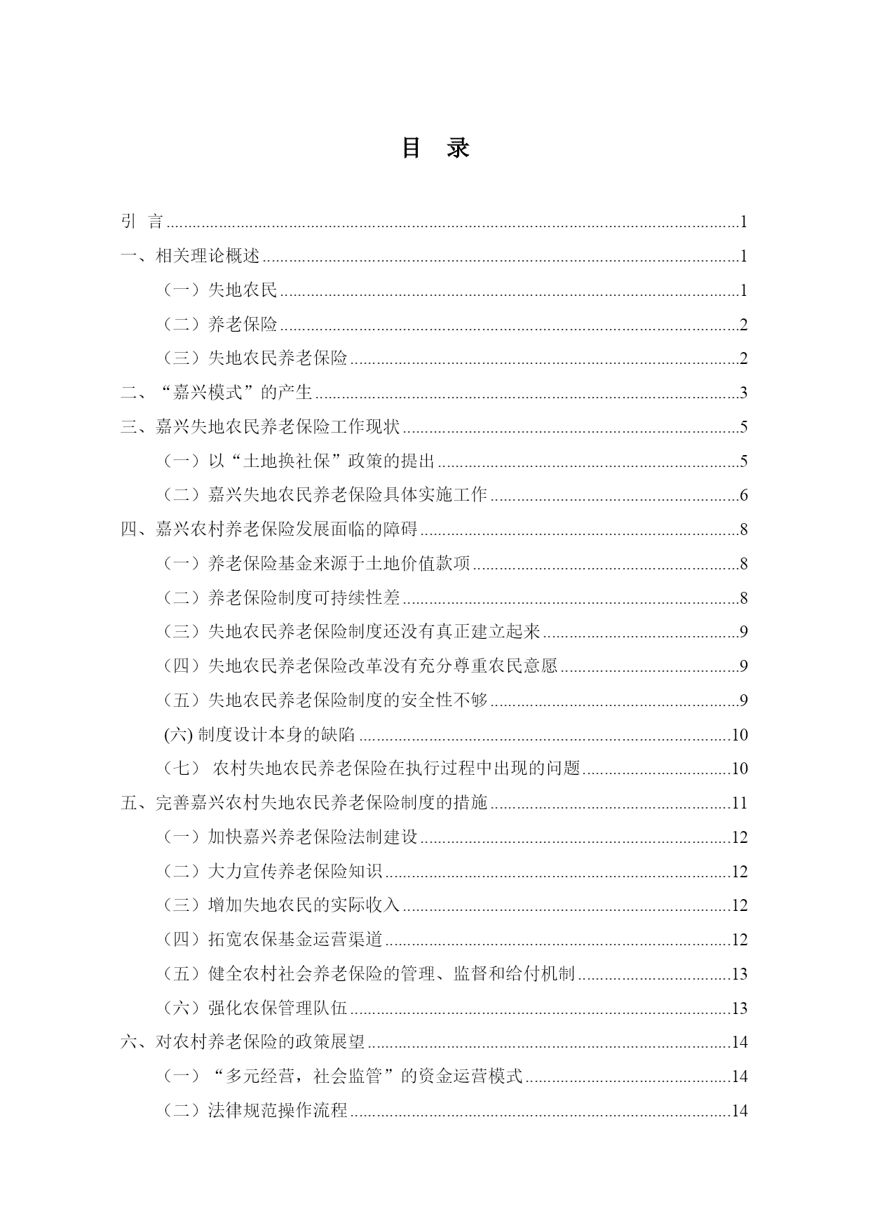 本科生毕业论文(设计)题目:系别:专业:学生姓名:学号:指导教师:(职称)二〇年月学术诚信声明本人所呈交的毕业论文,是在导师的指导下,独立进行研究工作所取得的成果,所有数据、图片资料均真实可靠。除文中已经注明引用的内容外,本论文不包含任何其他人或集体已经发表或撰写过的作品或成果。对本论文的研究作出重要贡献的个人和集体,均已在文中以明确的方式标明。本毕业论文的知识产权归属于培养单位。本人完全意识到本声明的法律结果由本人承担。本人签名:日期:浅谈嘉兴农村失地农民养老保险的问题和策略[论文摘要]党的“十七大”报告特别明确地提出:“探索建立农村养老保险制度。”这就告诉我们,在广大农民群众中建立社会养老保险制度,已经成为我国农村改革和发展所面临的重大任务。按照全面建设小康社会目标的新要求,完善社会主义市场经济体制,加快以改善民生为重点的社会建设,形成城乡经济社会发展一体化的新格局,都离不开建立覆盖城乡居民的社会保障体系。目前,城市居民社会保障体系已经基本建立,农村居民社会保障体系正在建设之中,而农民社会养老保险制度才刚刚起步。可见,加快建立农村社会养老保险制度,对于我国改革发展全局和小康社会建设,乃至应对国际金融危机和扩大国内消费需求,都具有非常重要的意义。由于近年来我国城镇化速度的加快,大量农民失去了原有的土地,导致农民的养老保险问题日益突出。本文基于对嘉兴市开展失地农民养老保险的调查,了解其现状,通过对其存在问题的原因分析,最终提出完善农村社会失地农民养老保障体系的对策思路。[关键词]失地农民养老保险现状问题[Abstract]"theparty"thereportclearlypointedout:"toexploretheestablishmentofruralendowmentinsurancesystem."Thistellsus,inthebroadmassesofpeasantsintheestablishmentofsocialendowmentinsurancesystem,hasbecomeChina'sruralreformanddevelopmentfaceamajortask.Accordingtothegoalofbuildingawell-offsocietyofthenewrequirements,perfectsystemofsocialistmarketeconomy,acceleratewiththefocusonimprovingpeople'slivelihoodandsocialconstruction,theformationofurbanandruraleconomicandsocialdevelopmentintegrationofthenewpattern,isinseparablefromtheestablishmentofthesocialsecuritysystemcoveringbothurbanandruralresidents.Atpresent,thecityresidents'socialsecuritysystemhasbeenbasicallyestablished,theruralresidents'socialsecuritysystemisunderconstruction,andtheruralsocialpensioninsurancesystemhasjuststarted.Visible,tospeeduptheestablishmentofruralsocialendowmentinsurancesystemforChina'sreform,developmentandconstructionofcomparativelywell-offsociety,andcopingwiththeinternationalfinancialcrisisandexpandingdomesticconsumptiondemand,hasveryimportantsignificance.InChinainrecentyearsduetothefasterpaceofurbanization,alargenumberoffarmerslostland,causefarmerold-ageinsurancequestionisoutstandingdaybyday.ThisarticleisbasedontheJiaxingcitytocarryouttheendowmentinsuranceoflostterritoryfarmerinvestigation,understa