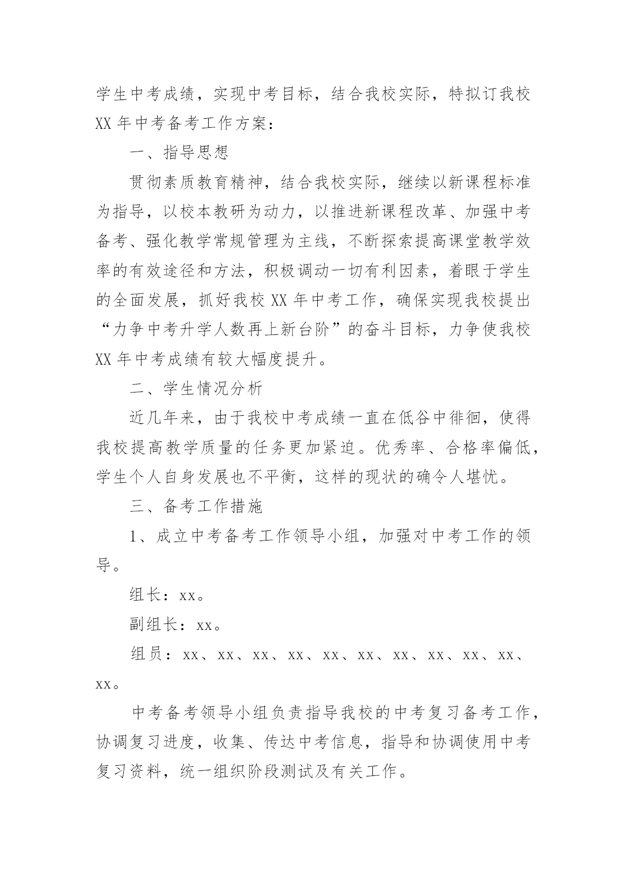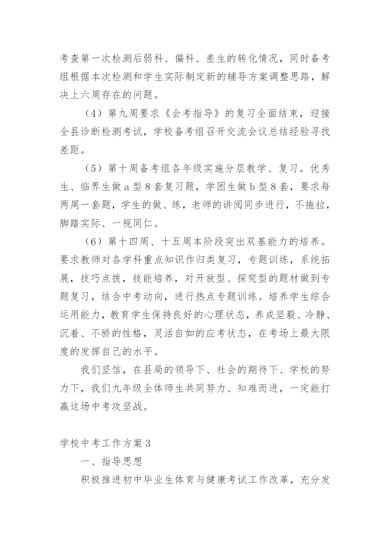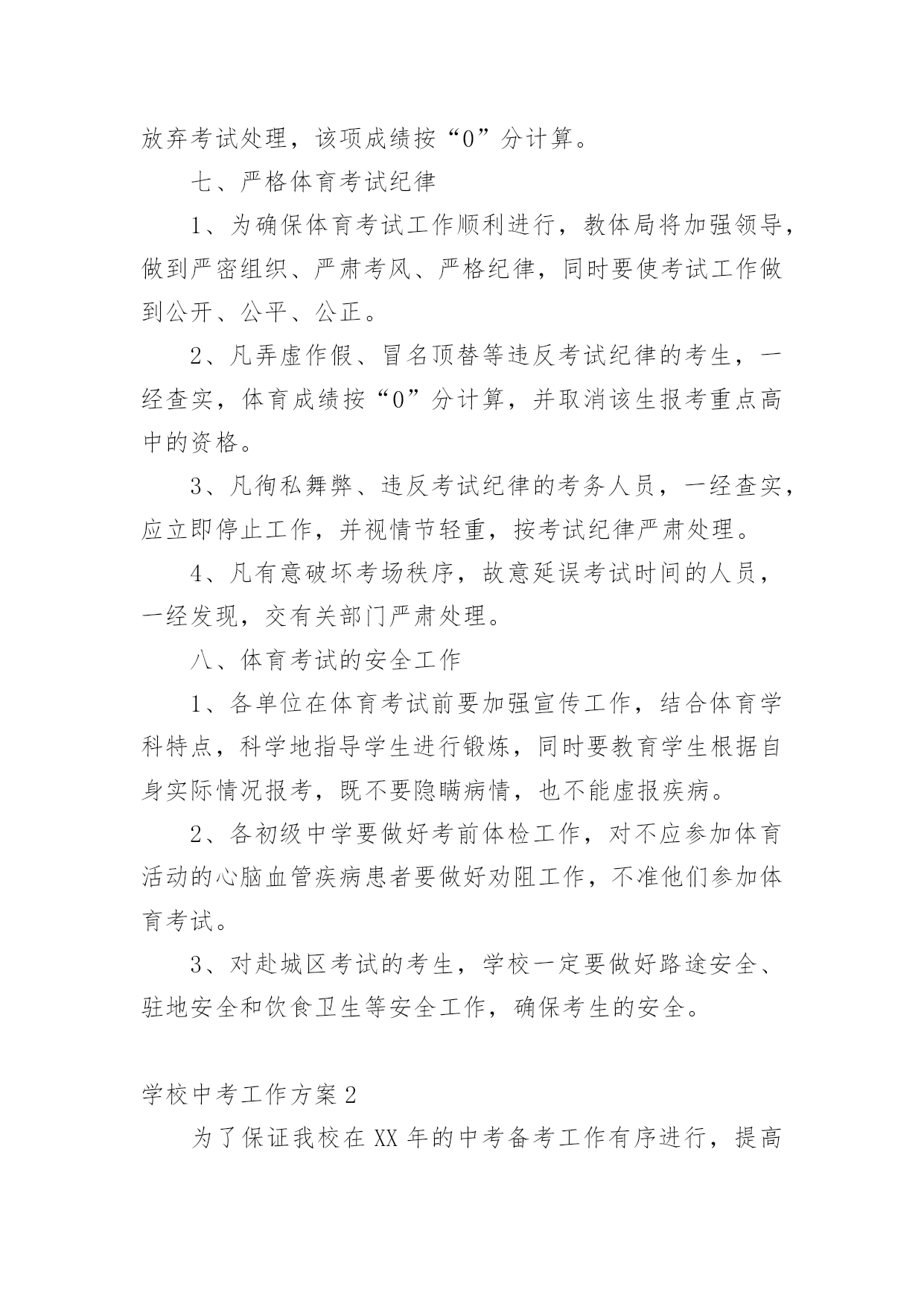 学校中考工作方案为了确保事情或工作有序有力开展,常常需要提前进行细致的方案准备工作,方案是在案前得出的方法计划。方案应该怎么制定呢?下面是小编帮大家整理的学校中考工作方案,仅供参考,大家一起来看看吧。学校中考工作方案1邓州市初中毕业升学体育考试工作由邓州市初中毕业升学体育考试领导小组统一组织领导。考试结果是学生毕业和升学的重要依据,是对各学校平时开展《国家学生体质健康标准》锻炼和测验工作的真实检验,也是学生综合素质评定的重要参考。一、考试对象考试对象为20xx年参加高中阶段招生考试的初中毕业生。二、考试项目及计分办法1、考试项目:立定跳远、坐位体前屈、800米跑(女)或1000米跑(男)。2、计分按《国家学生体质健康标准》单项计分办法计算,折算后,考试成绩以满分为70分计入中招成绩总分。三、考试的时间和形式1、体育考试时间:4月中旬,具体时间另行通知。2、每位考生只能在统一安排的时间内参加一次体育考试,并将考试成绩计入该生升学考试总分,且不得因任何理由进行补考。四、考场及考试器材1、有确保各项目顺利进行,免受外界干扰的全封闭条件;2、具有保障体育考试所需要的设施、器材和其它有关条件。3、我市中招体育考试考场全部使用智能化测试仪器,以实现考试手段的现代化、科学化。五、考试办法1、考试采取全封闭方式进行。考试期间监考人员(初中学校的体育教师应予以回避)应与外界隔离,不得以任何理由外出或与外界人员接触。为了便于统一标准,监考人员必须保持稳定,考试期间不得更换。2、考生报名及考试顺序编排采用微机管理办法。考生准考证内容及照片由市教体局统一按中招序号由微机编号打印。3、每个单元时间内测试完毕后的原始记录必须加封,并由两名机要员直接送往微机室。六、考试规则1、考生参加体育考试,要身着运动服装或轻便服装,穿运动鞋或平底轻便鞋。2、体育项目考试按照先进行柔韧性项目和力量性项目,最后进行耐力性项目的.顺序。3、每位考生三项考试应在一个单元时间内完成。如因天气变化考生不能在一个单元时间内考完三项,可延长至当天完成。当天不能够完成三项考试的考生,已考项目成绩无效,另行安排时间重新进行考试。4、立定跳远受试者两脚自然分开站立,站在起跳线后,脚尖不得踩线。两脚原地同时起跳,不得有垫步或连跳动作。每人连续试跳三次,测试仪自动记录其中成绩最好的一次。以“米”为单位,保留两位小数。5、坐位体前屈受试者赤足,两腿伸直,两脚平蹬测试纵板坐在平地上,两脚分开约10—15厘米,上体前屈,两臂向前伸直,用两手中指尖轻轻地逐渐向前推动游标,直到不能前移为止。每人连续测试两次,测试仪自动取最好成绩。以“厘米”为单位记录成绩,保留一位小数。测试时,不得有两腿弯曲或两臂突然发力动作,否则视为犯规,成绩无效。6、800米跑(女)或1000米跑(男)受测者10—20人一组进行测试,站立式起跑。受试者在监考人员的指导下佩戴终点信息接收器,当听到“跑”的口令后开始起跑。计时员看到旗动开始计时。当受试者的躯干部到达终点线垂直面时仪器自动录入该生成绩。以“分、秒”为单位记录成绩。7、考生每考完一项,考生可当场知悉本人的考试成绩。8、考生参加各项目考试,每项目点名三次不到者,按放弃考试处理,该项成绩按“0”分计算。七、严格体育考试纪律1、为确保体育考试工作顺利进行,教体局将加强领导,做到严密组织、严肃考风、严格纪律,同时要使考试工作做到公开、公平、公正。2、凡弄虚作假、冒名顶替等违反考试纪律的考生,一经查实,体育成绩按“0”分计算,并取消该生报考重点高中的资格。3、凡徇私舞弊、违反考试纪律的考务人员,一经查实,应立即停止工作,并视情节轻重,按考试纪律严肃处理。4、凡有意破坏考场秩序,故意延误考试时间的人员,一经发现,交有关部门严肃处理。八、体育考试的安全工作1、各单位在体育考试前要加强宣传工作,结合体育学科特点,科学地指导学生进行锻炼,同时要教育学生根据自身实际情况报考,既不要隐瞒病情,也不能虚报疾病。2、各初级中学要做好考前体检工作,对不应参加体育活动的心脑血管疾病患者要做好劝阻工作,不准他们参加体育考试。3、对赴城区考试的考生,学校一定要做好路途安全、驻地安全和饮食卫生等安全工作,确保考生的安全。学校中考工作方案2为了保证我校在XX年的中考备考工作有序进行,提高学生中考成绩,实现中考目标,结合我校实际,特拟订我校XX年中考备考工作方案:一、指导思想贯彻素质教育精神,结合我校实际,继续以新课程标准为指导,以校本教研为动力,以推进新课程改革、加强中考备考、强化教学常规管理为主线,不断探索提高课堂教学效率的有效途径和方法,积极调动一切有利因素,着眼于学生的全面发展,抓好我校XX年中考工作,确保实现我校提出“力争中考升学人数再上新台阶”的奋斗目标,力争使我校XX年中考成绩有较大幅度提升。二