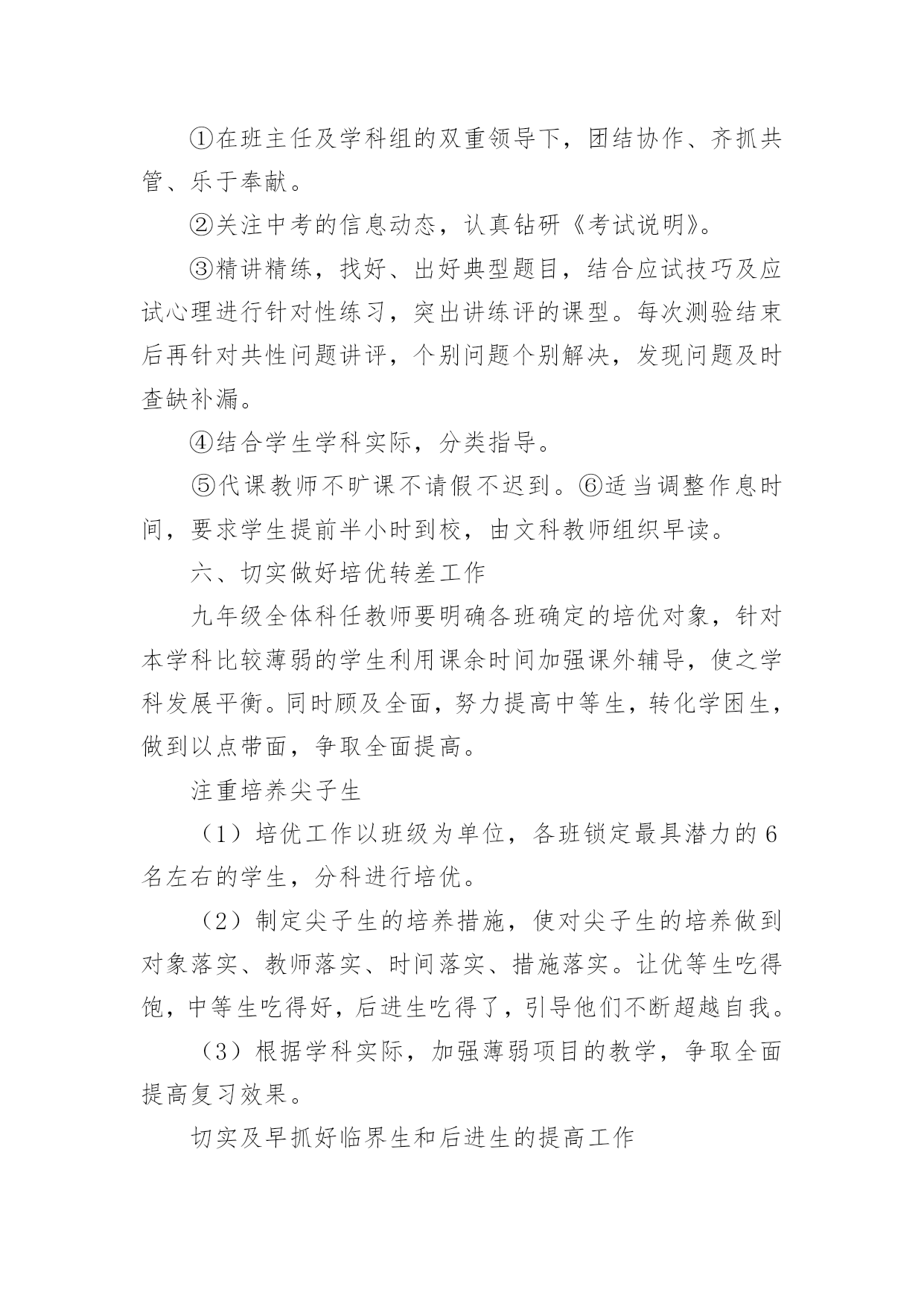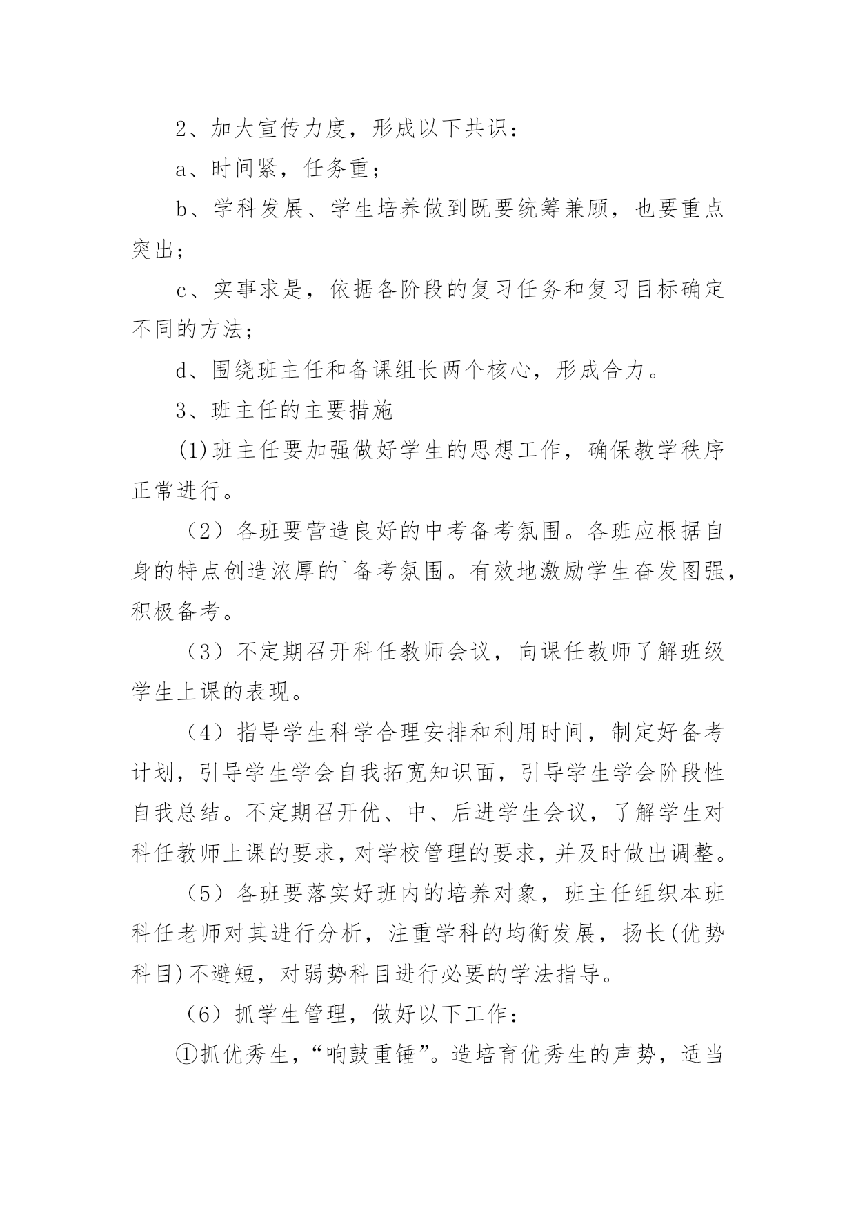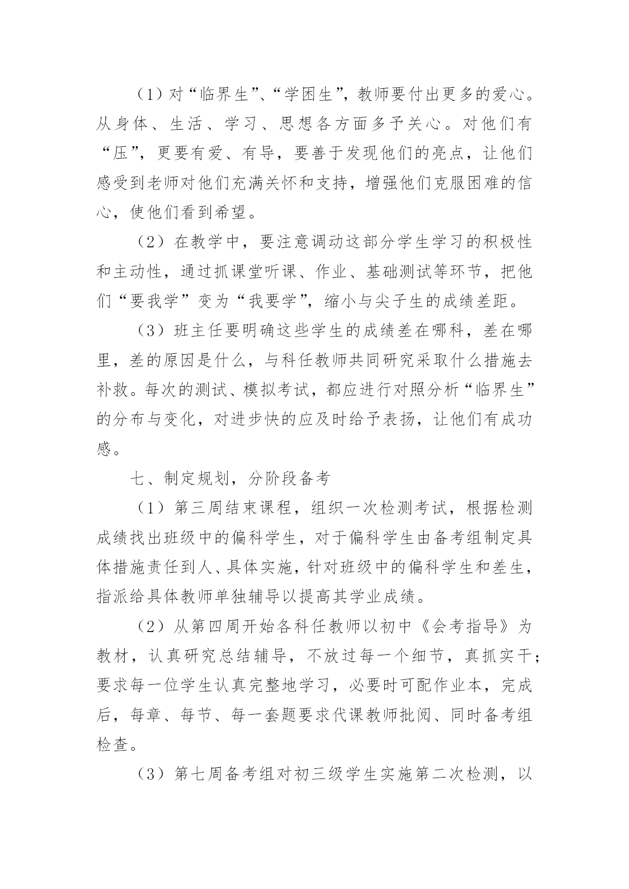 学校中考工作方案为了确保事情或工作有序有力开展,常常需要提前进行细致的方案准备工作,方案是在案前得出的方法计划。方案应该怎么制定呢?下面是小编帮大家整理的学校中考工作方案,仅供参考,大家一起来看看吧。学校中考工作方案1邓州市初中毕业升学体育考试工作由邓州市初中毕业升学体育考试领导小组统一组织领导。考试结果是学生毕业和升学的重要依据,是对各学校平时开展《国家学生体质健康标准》锻炼和测验工作的真实检验,也是学生综合素质评定的重要参考。一、考试对象考试对象为20xx年参加高中阶段招生考试的初中毕业生。二、考试项目及计分办法1、考试项目:立定跳远、坐位体前屈、800米跑(女)或1000米跑(男)。2、计分按《国家学生体质健康标准》单项计分办法计算,折算后,考试成绩以满分为70分计入中招成绩总分。三、考试的时间和形式1、体育考试时间:4月中旬,具体时间另行通知。2、每位考生只能在统一安排的时间内参加一次体育考试,并将考试成绩计入该生升学考试总分,且不得因任何理由进行补考。四、考场及考试器材1、有确保各项目顺利进行,免受外界干扰的全封闭条件;2、具有保障体育考试所需要的设施、器材和其它有关条件。3、我市中招体育考试考场全部使用智能化测试仪器,以实现考试手段的现代化、科学化。五、考试办法1、考试采取全封闭方式进行。考试期间监考人员(初中学校的体育教师应予以回避)应与外界隔离,不得以任何理由外出或与外界人员接触。为了便于统一标准,监考人员必须保持稳定,考试期间不得更换。2、考生报名及考试顺序编排采用微机管理办法。考生准考证内容及照片由市教体局统一按中招序号由微机编号打印。3、每个单元时间内测试完毕后的原始记录必须加封,并由两名机要员直接送往微机室。六、考试规则1、考生参加体育考试,要身着运动服装或轻便服装,穿运动鞋或平底轻便鞋。2、体育项目考试按照先进行柔韧性项目和力量性项目,最后进行耐力性项目的.顺序。3、每位考生三项考试应在一个单元时间内完成。如因天气变化考生不能在一个单元时间内考完三项,可延长至当天完成。当天不能够完成三项考试的考生,已考项目成绩无效,另行安排时间重新进行考试。4、立定跳远受试者两脚自然分开站立,站在起跳线后,脚尖不得踩线。两脚原地同时起跳,不得有垫步或连跳动作。每人连续试跳三次,测试仪自动记录其中成绩最好的一次。以“米”为单位,保留两位小数。5、坐位体前屈受试者赤足,两腿伸直,两脚平蹬测试纵板坐在平地上,两脚分开约10—15厘米,上体前屈,两臂向前伸直,用两手中指尖轻轻地逐渐向前推动游标,直到不能前移为止。每人连续测试两次,测试仪自动取最好成绩。以“厘米”为单位记录成绩,保留一位小数。测试时,不得有两腿弯曲或两臂突然发力动作,否则视为犯规,成绩无效。6、800米跑(女)或1000米跑(男)受测者10—20人一组进行测试,站立式起跑。受试者在监考人员的指导下佩戴终点信息接收器,当听到“跑”的口令后开始起跑。计时员看到旗动开始计时。当受试者的躯干部到达终点线垂直面时仪器自动录入该生成绩。以“分、秒”为单位记录成绩。7、考生每考完一项,考生可当场知悉本人的考试成绩。8、考生参加各项目考试,每项目点名三次不到者,按放弃考试处理,该项成绩按“0”分计算。七、严格体育考试纪律1、为确保体育考试工作顺利进行,教体局将加强领导,做到严密组织、严肃考风、严格纪律,同时要使考试工作做到公开、公平、公正。2、凡弄虚作假、冒名顶替等违反考试纪律的考生,一经查实,体育成绩按“0”分计算,并取消该生报考重点高中的资格。3、凡徇私舞弊、违反考试纪律的考务人员,一经查实,应立即停止工作,并视情节轻重,按考试纪律严肃处理。4、凡有意破坏考场秩序,故意延误考试时间的人员,一经发现,交有关部门严肃处理。八、体育考试的安全工作1、各单位在体育考试前要加强宣传工作,结合体育学科特点,科学地指导学生进行锻炼,同时要教育学生根据自身实际情况报考,既不要隐瞒病情,也不能虚报疾病。2、各初级中学要做好考前体检工作,对不应参加体育活动的心脑血管疾病患者要做好劝阻工作,不准他们参加体育考试。3、对赴城区考试的考生,学校一定要做好路途安全、驻地安全和饮食卫生等安全工作,确保考生的安全。学校中考工作方案2为了保证我校在XX年的中考备考工作有序进行,提高学生中考成绩,实现中考目标,结合我校实际,特拟订我校XX年中考备考工作方案:一、指导思想贯彻素质教育精神,结合我校实际,继续以新课程标准为指导,以校本教研为动力,以推进新课程改革、加强中考备考、强化教学常规管理为主线,不断探索提高课堂教学效率的有效途径和方法,积极调动一切有利因素,着眼于学生的全面发展,抓好我校XX年中考工作,确保实现我校提出“力争中考升学人数再上新台阶”的奋斗目标,力争使我校XX年中考成绩有较大幅度提升。二